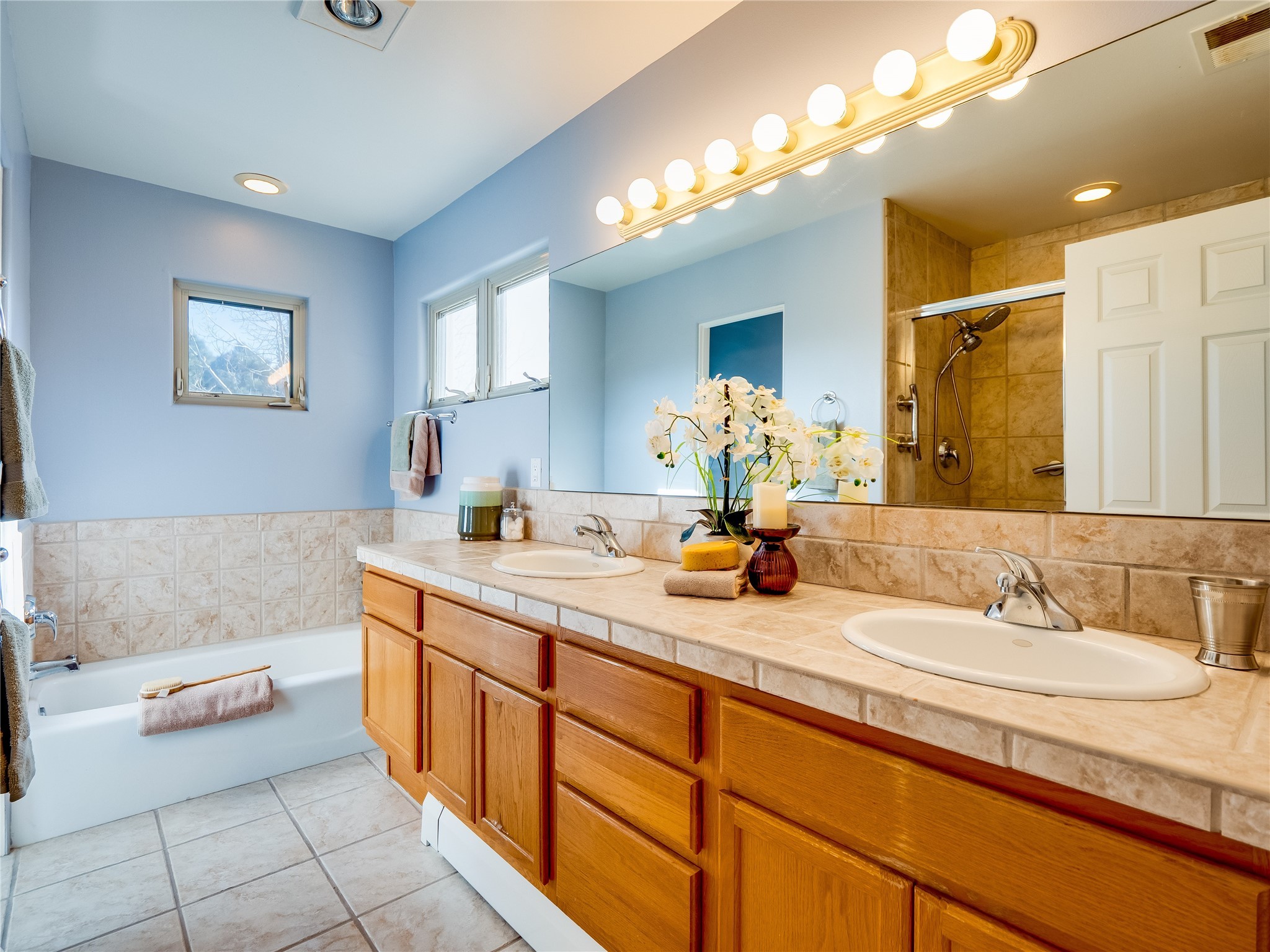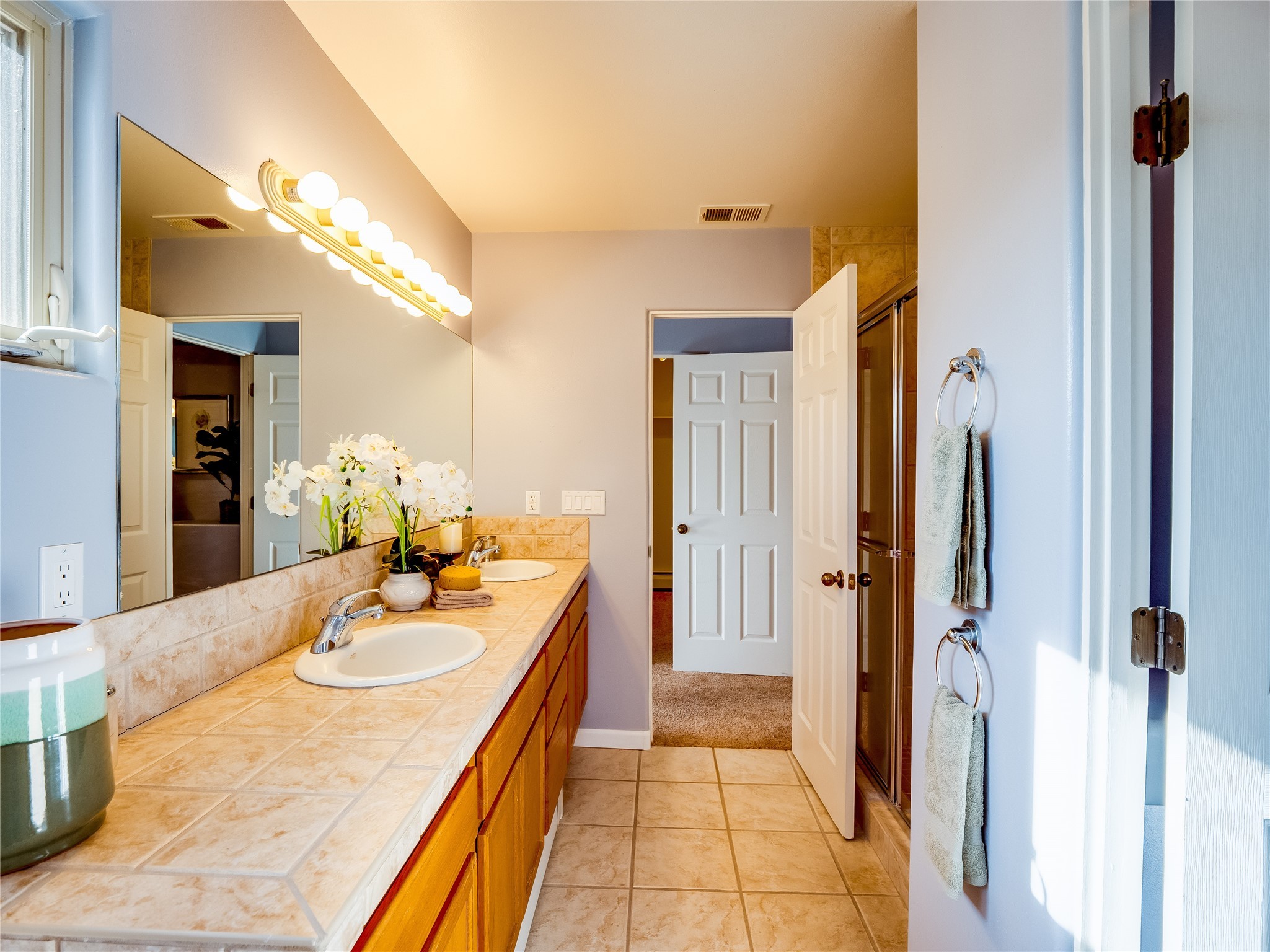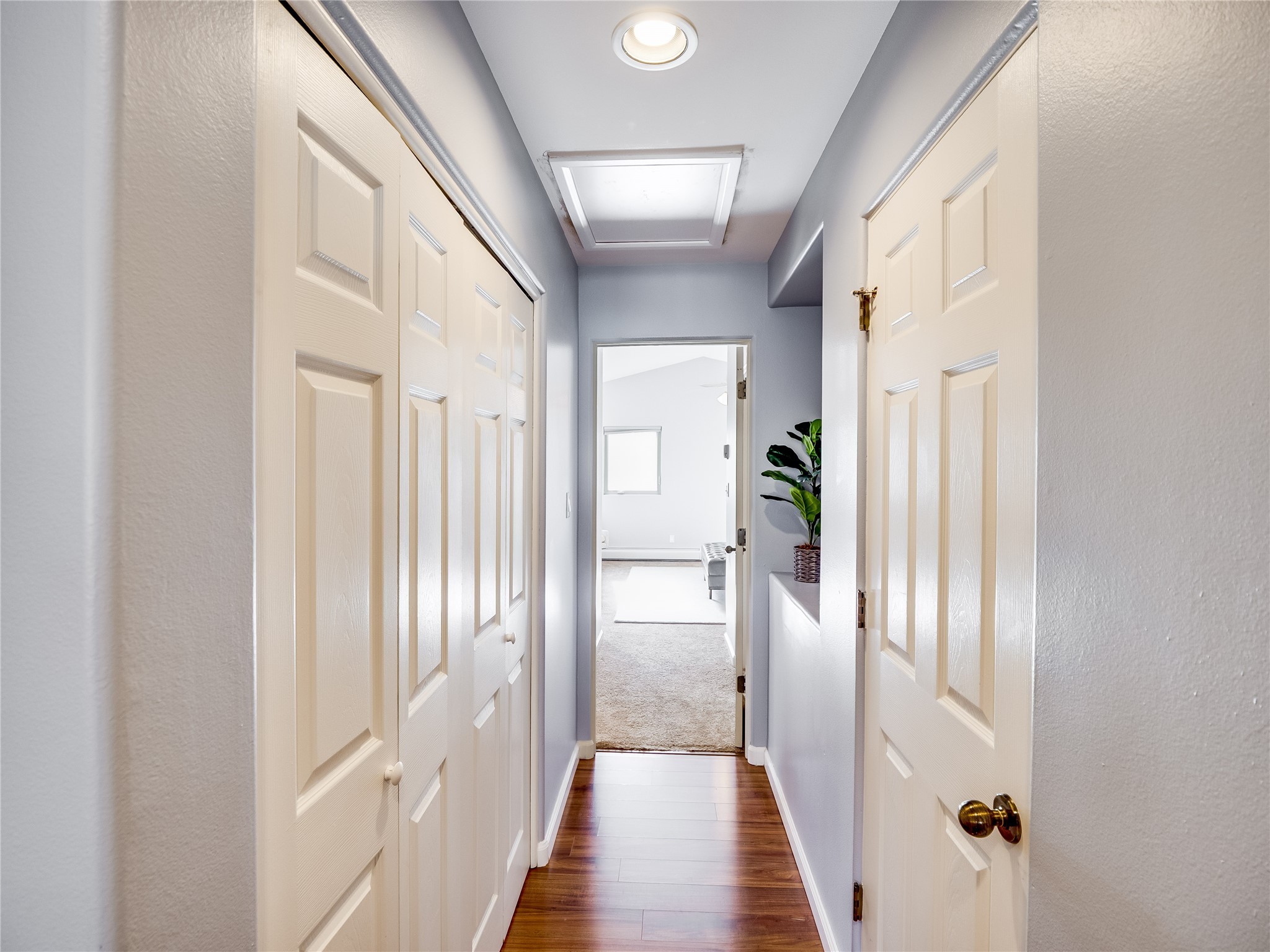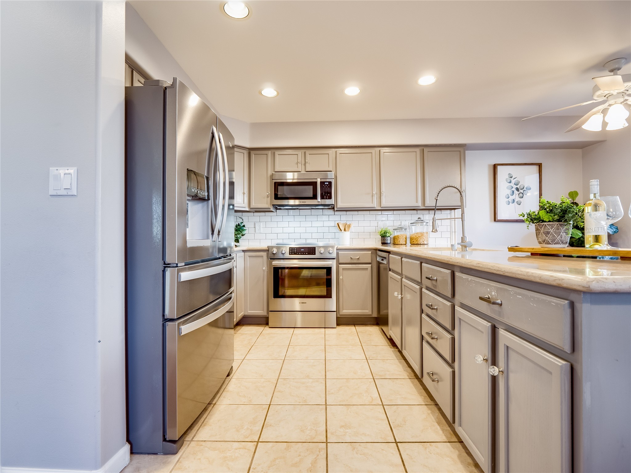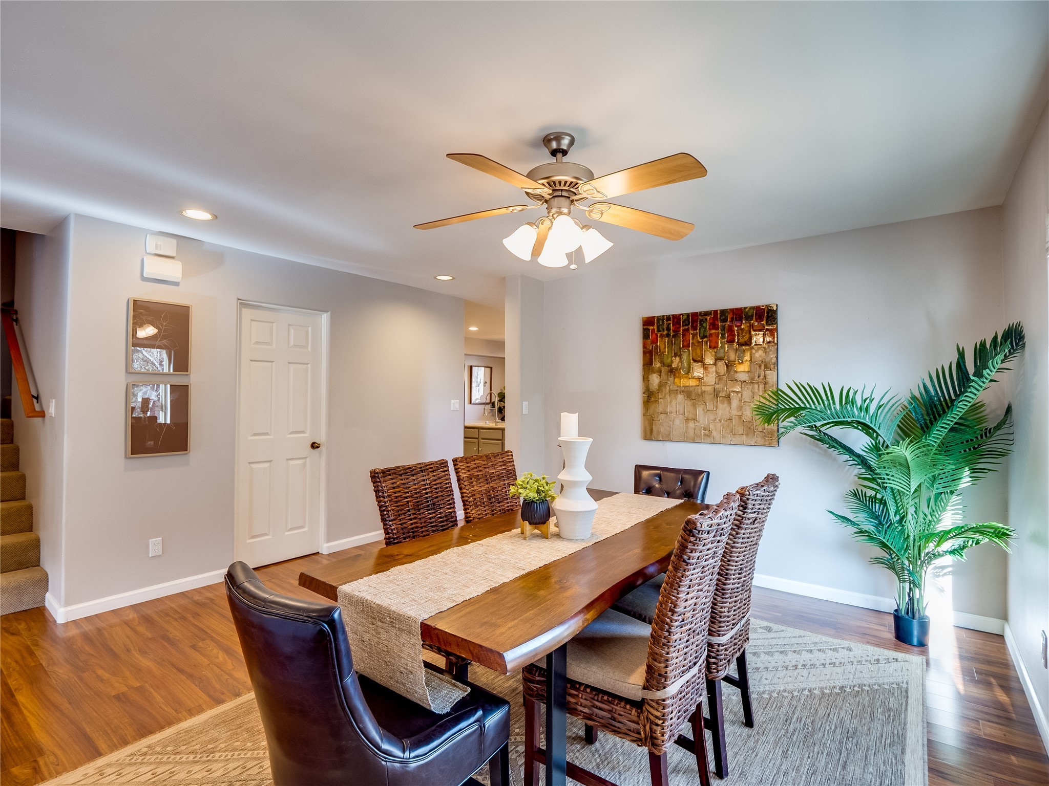 Set in the desirable Quemazon community, this modern two-story townhome offers canyon-edge living surrounded by natural beauty. The mature front yard welcomes you with tall aspens, soft landscaping, and a covered patio leading to the main entrance. Step inside to a large foyer that opens into a bright, living room featuring rich laminate flooring throughout the main living areas. A wood-burning fireplace anchors the living room, framed by windows that capture views of the surrounding forested terrain. Sliding glass doors extend the space onto the front patio for seamless indoor-outdoor living. Just a short set of stairs up, the dining room awaits, complete with a spacious walk-in pantry and storage closet, plus a convenient powder room on the same level. Toward the back of the home, the kitchen blends modern style and function with granite countertops, painted gray cabinetry, and durable tile flooring. Stainless steel appliances, a peninsula island with bar seating, and flexible layout options, including room for a sit-down dining table or casual breakfast area. Step out to the private back courtyard patio, finished with pavers, planter beds, and space for outdoor dining or gardening. Stairs lead directly to the attached two-car garage for everyday convenience. Upstairs, two well-sized guest bedrooms include carpet flooring, walk-in closets, and generous natural light. A full guest bathroom features a double-sink vanity and tiled shower and tub surround. The hallway also includes a dedicated laundry closet for easy access. The primary en-suite offers a peaceful retreat with vaulted ceilings, plush carpet flooring, a large walk-in closet, and a spa-inspired bathroom. Relax in the separate tiled soaking tub or unwind in the oversized walk-in tiled shower. A double-sink vanity completes the space with elevated style and functionality. Move-in ready and thoughtfully designed, this home enjoys an exceptional location close to trails, and parks. Book your showing today!