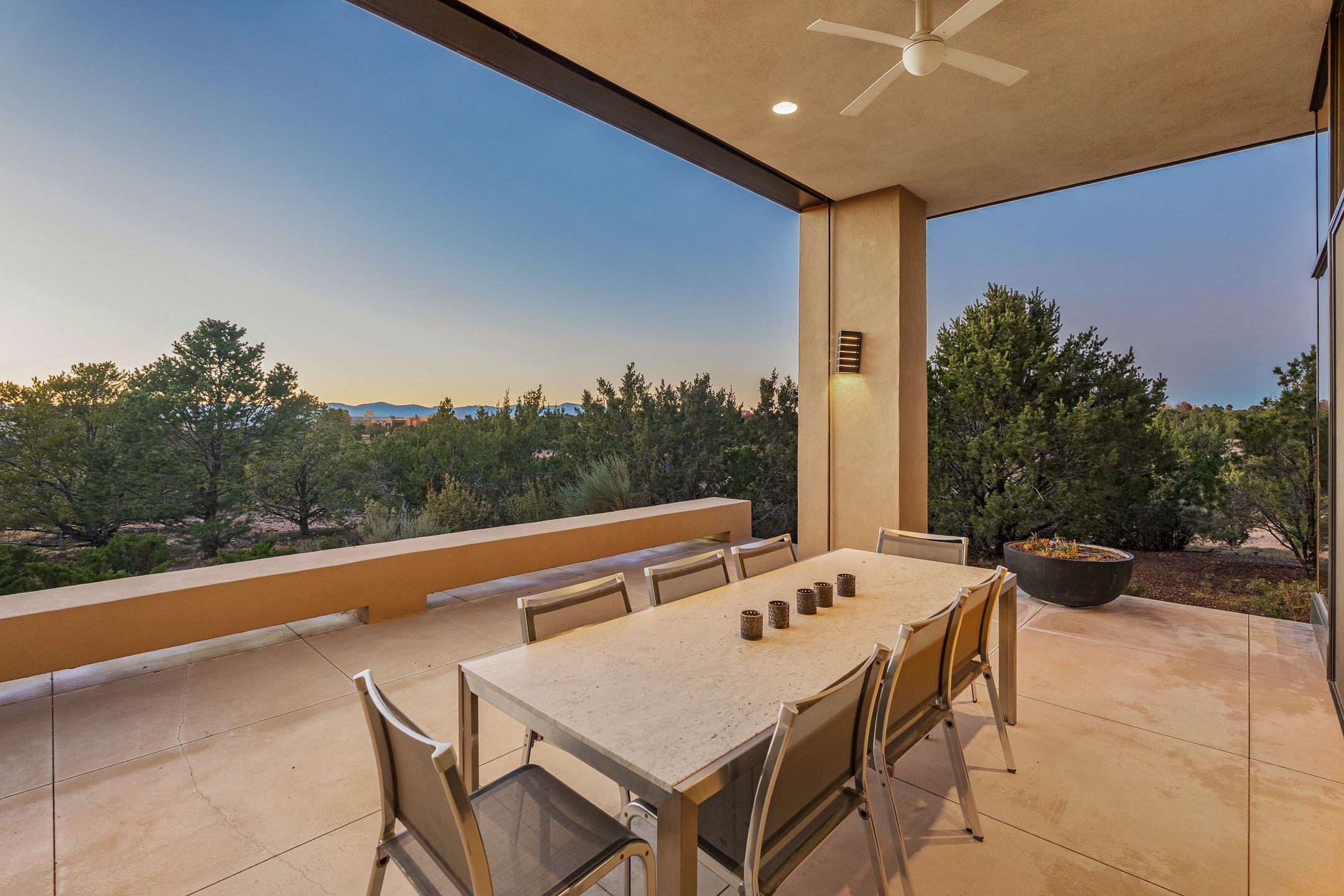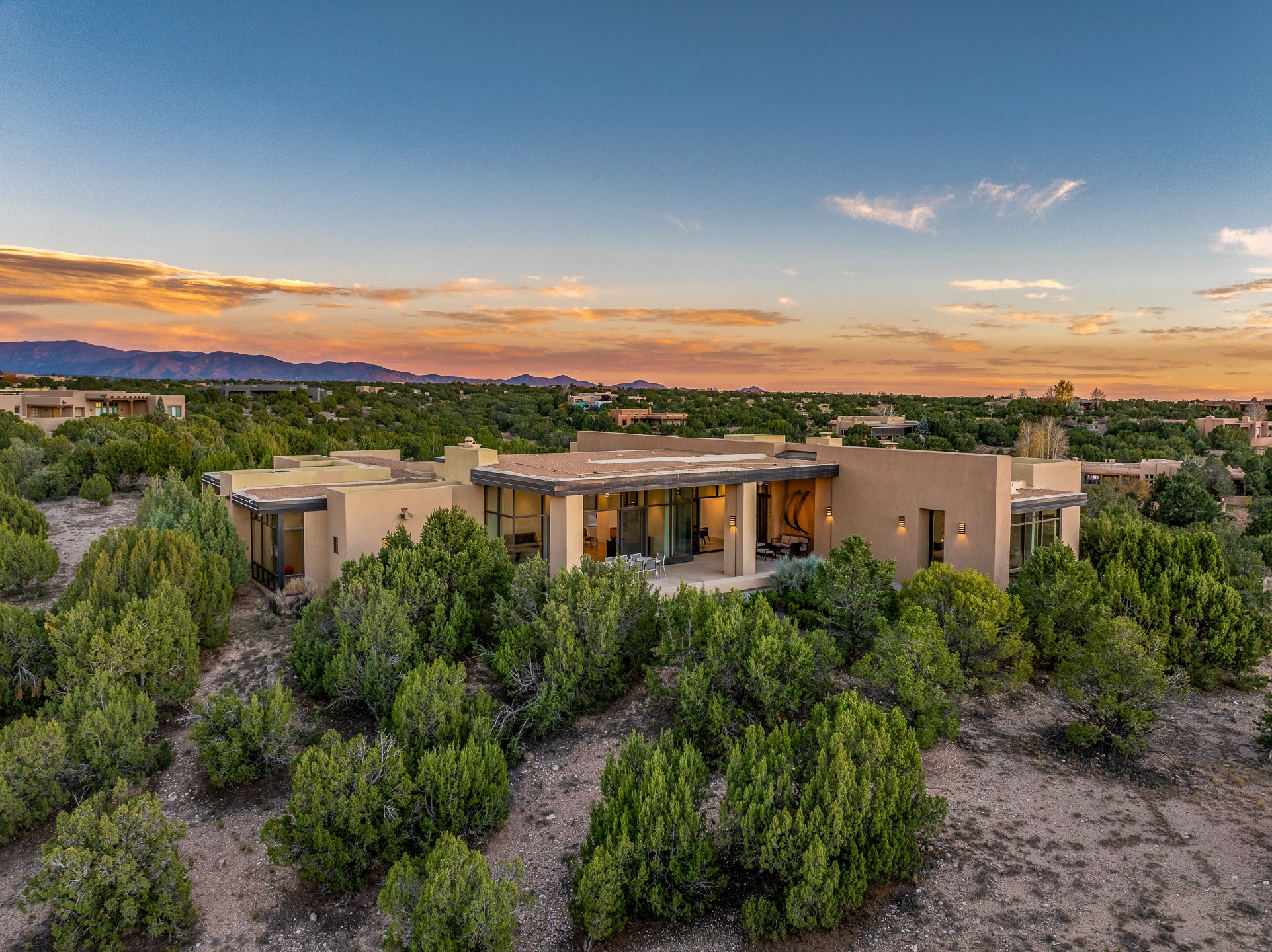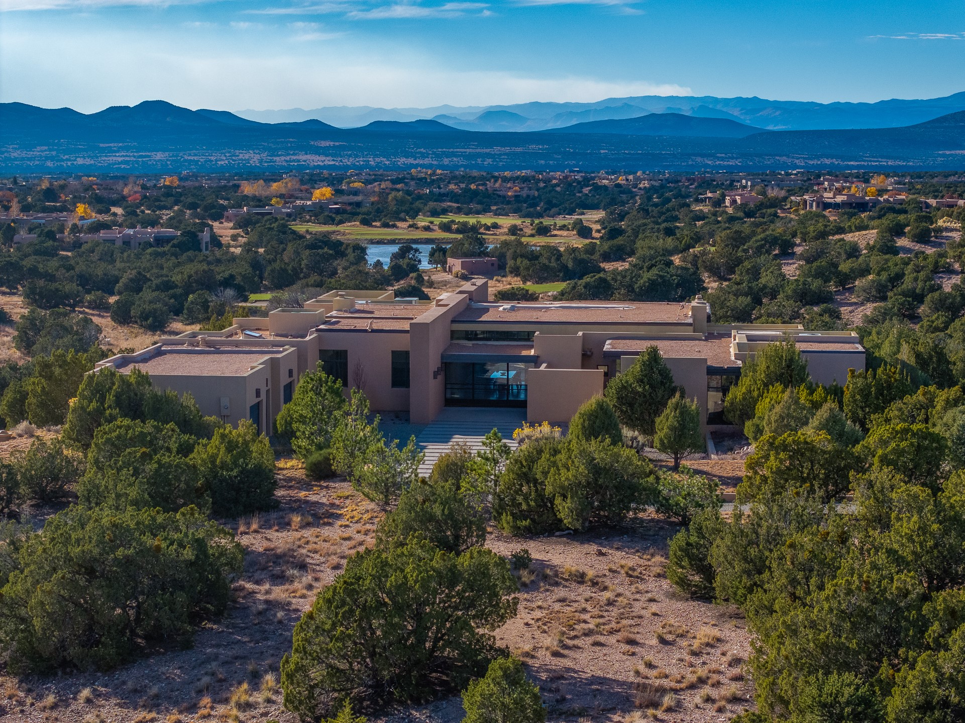 Striking modern architecture in Las Campanas! 26 Bishop's Dome was designed by Craig Hoopes and built by Chuck Apple to capture light, views, and refined Santa Fe living. The home offers 5 bedrooms and 7 bathrooms, including two powder rooms, with a thoughtfully designed floor plan featuring two living rooms and two portals, ideal for both elegant entertaining and relaxed daily living. Walls of glass frame extraordinary east-facing views of the snow-capped Sangre de Cristo Mountains and west-facing Jemez Mountain vistas, delivering exquisite sunset views. The portals extend the living spaces outdoors, creating seamless indoor-outdoor living for gatherings or quiet enjoyment of the surrounding landscape.Private bedroom suites provide comfort and flexibility, while a generous 3-car garage adds convenience and functionality. A rare opportunity to own a true architectural home where modern design, exceptional construction, and breathtaking mountain views converge.