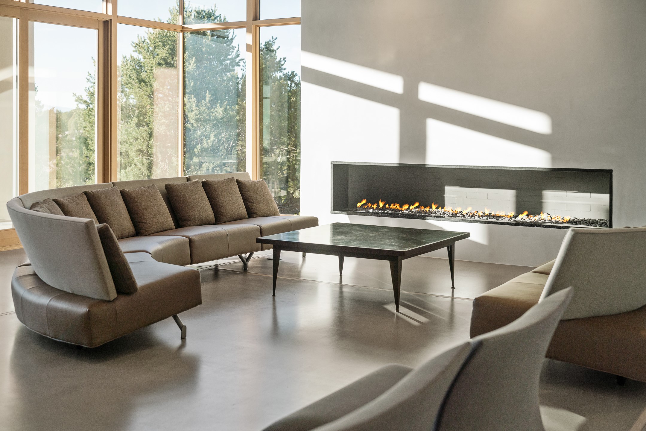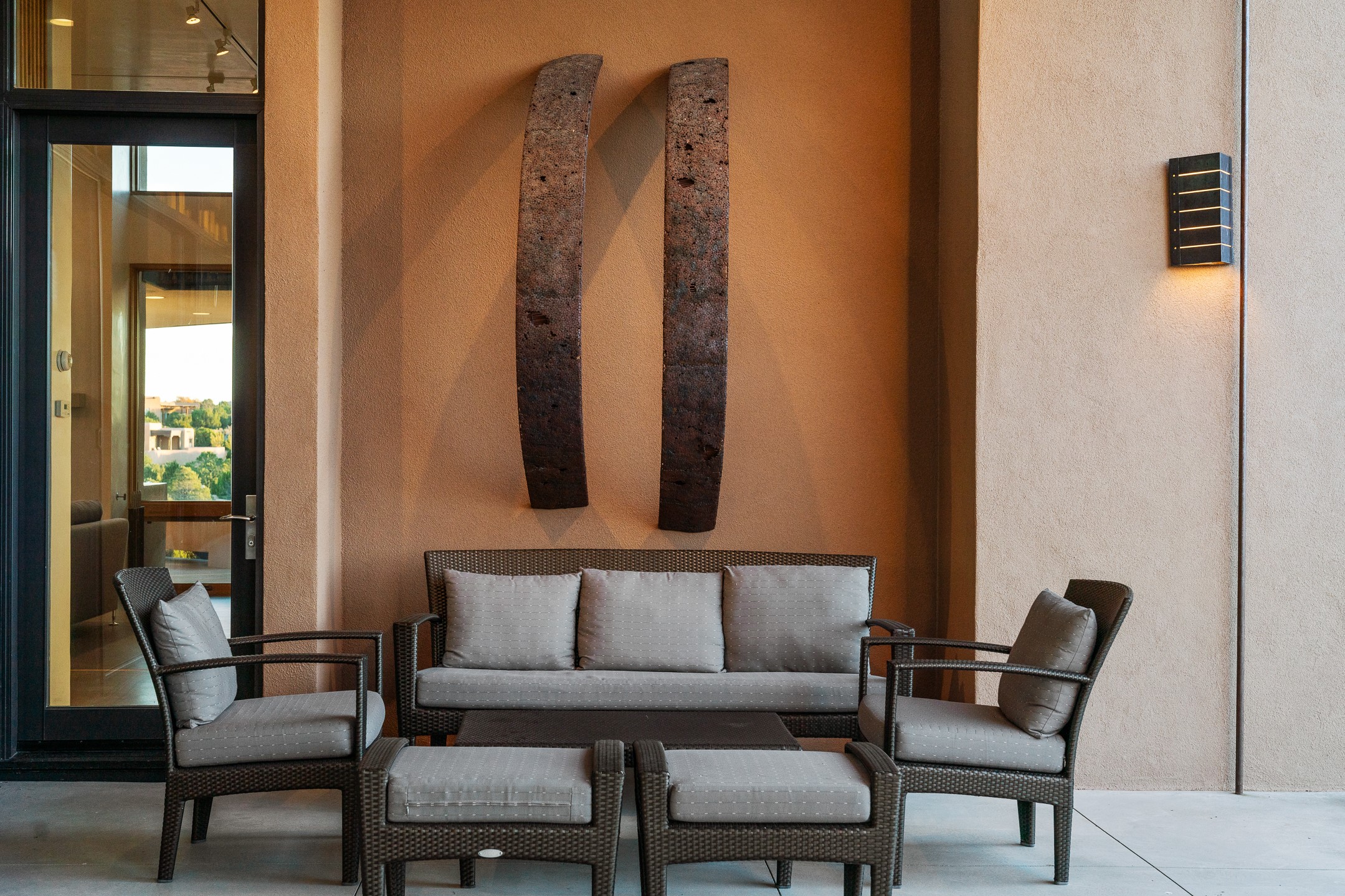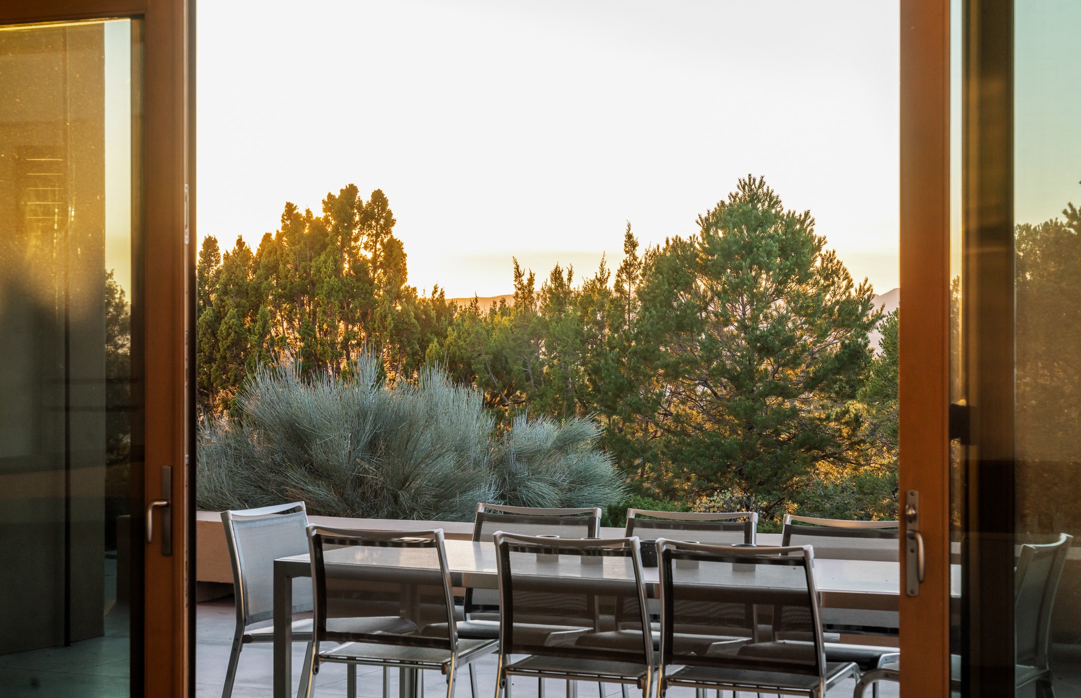Striking modern architecture in Las Campanas! 26 Bishop's Dome was designed by Craig Hoopes and built by Chuck Apple to capture light, views, and refined Santa Fe living. The home offers 5 bedrooms and 7 bathrooms, including two powder rooms, with a thoughtfully designed floor plan featuring two living rooms and two portals, ideal for both elegant entertaining and relaxed daily living. Walls of glass frame extraordinary east-facing views of the snow-capped Sangre de Cristo Mountains and west-facing Jemez Mountain vistas, delivering exquisite sunset views. The portals extend the living spaces outdoors, creating seamless indoor-outdoor living for gatherings or quiet enjoyment of the surrounding landscape.Private bedroom suites provide comfort and flexibility, while a generous 3-car garage adds convenience and functionality. A rare opportunity to own a true architectural home where modern design, exceptional construction, and breathtaking mountain views converge.