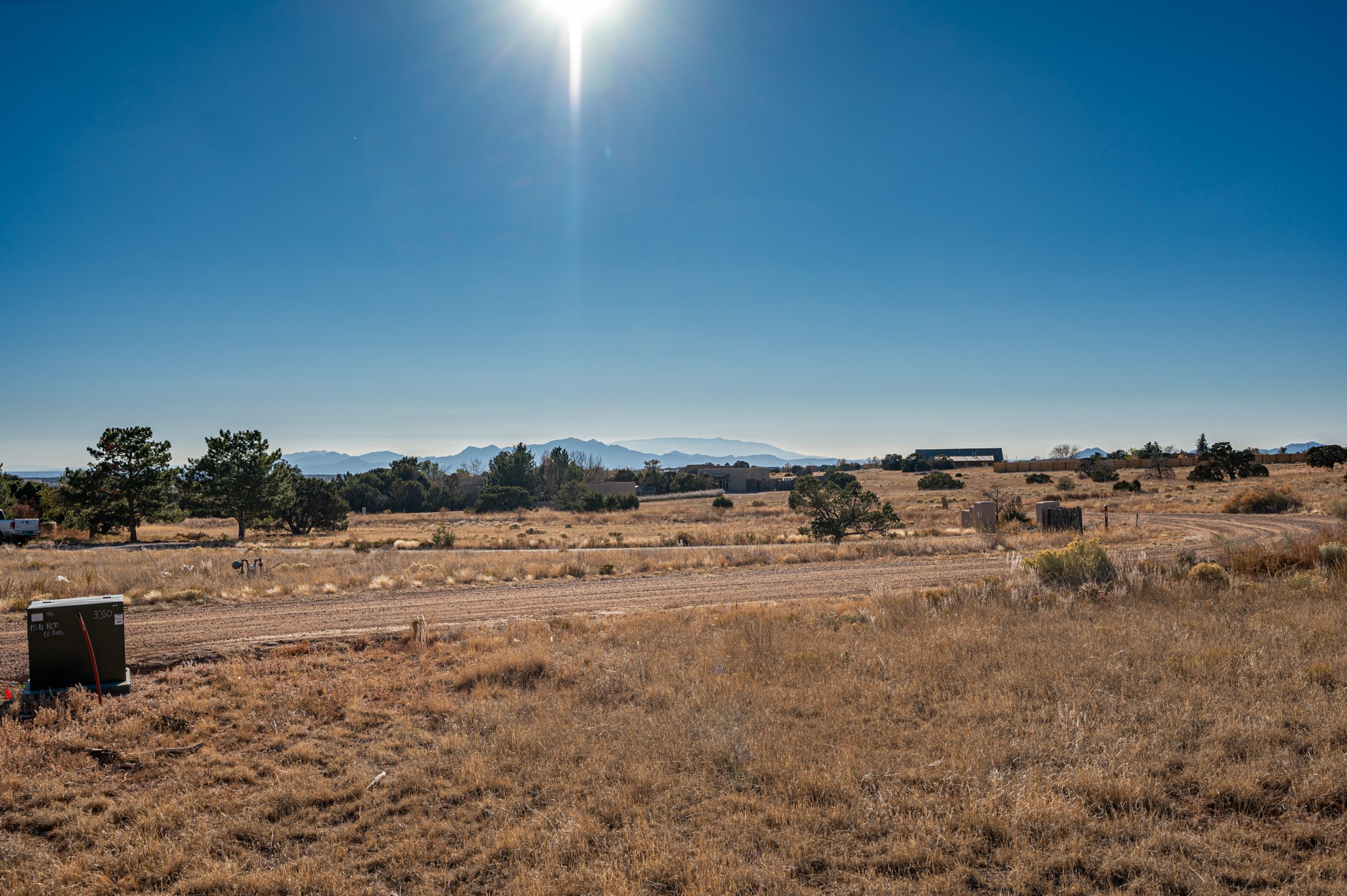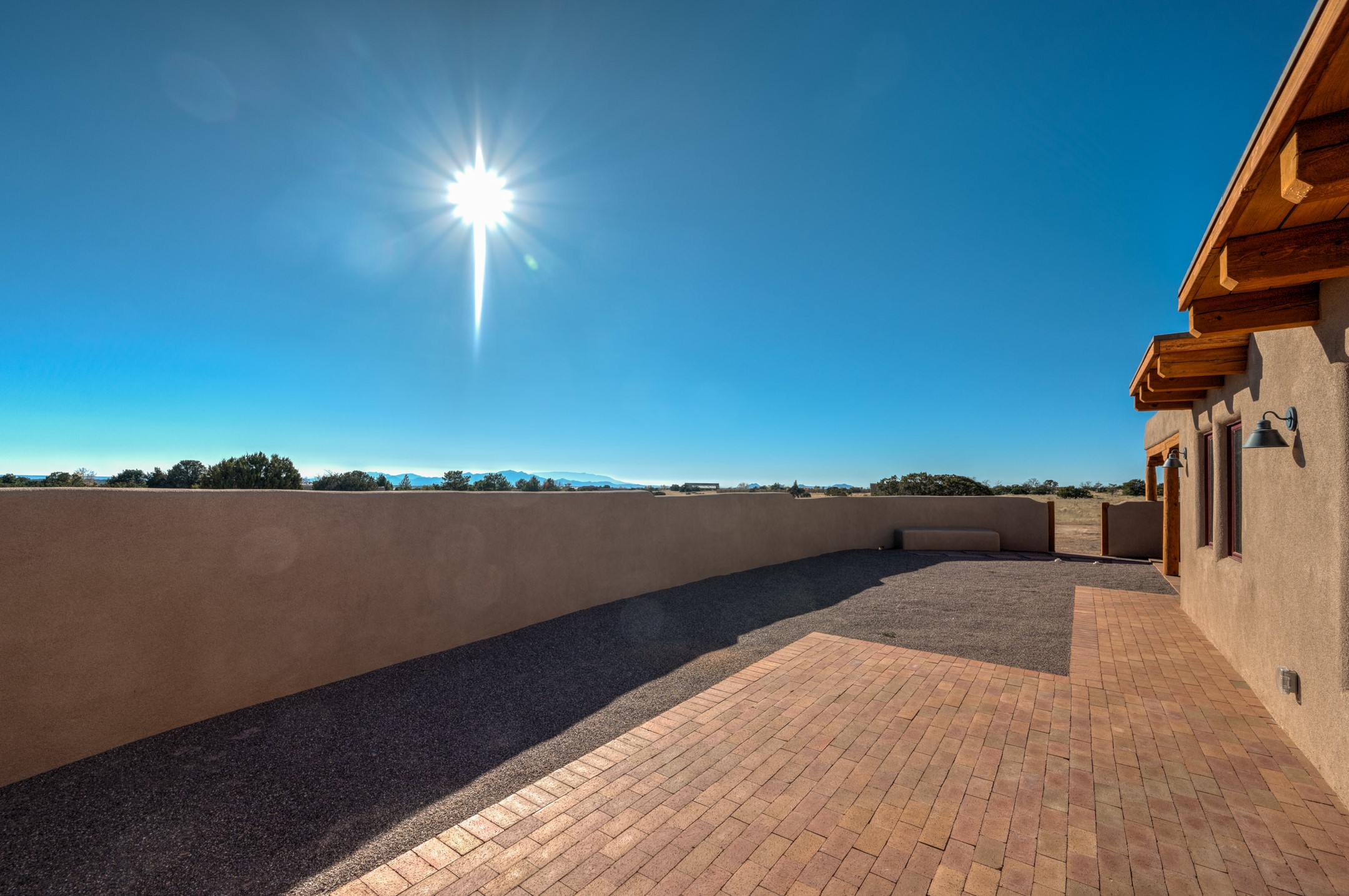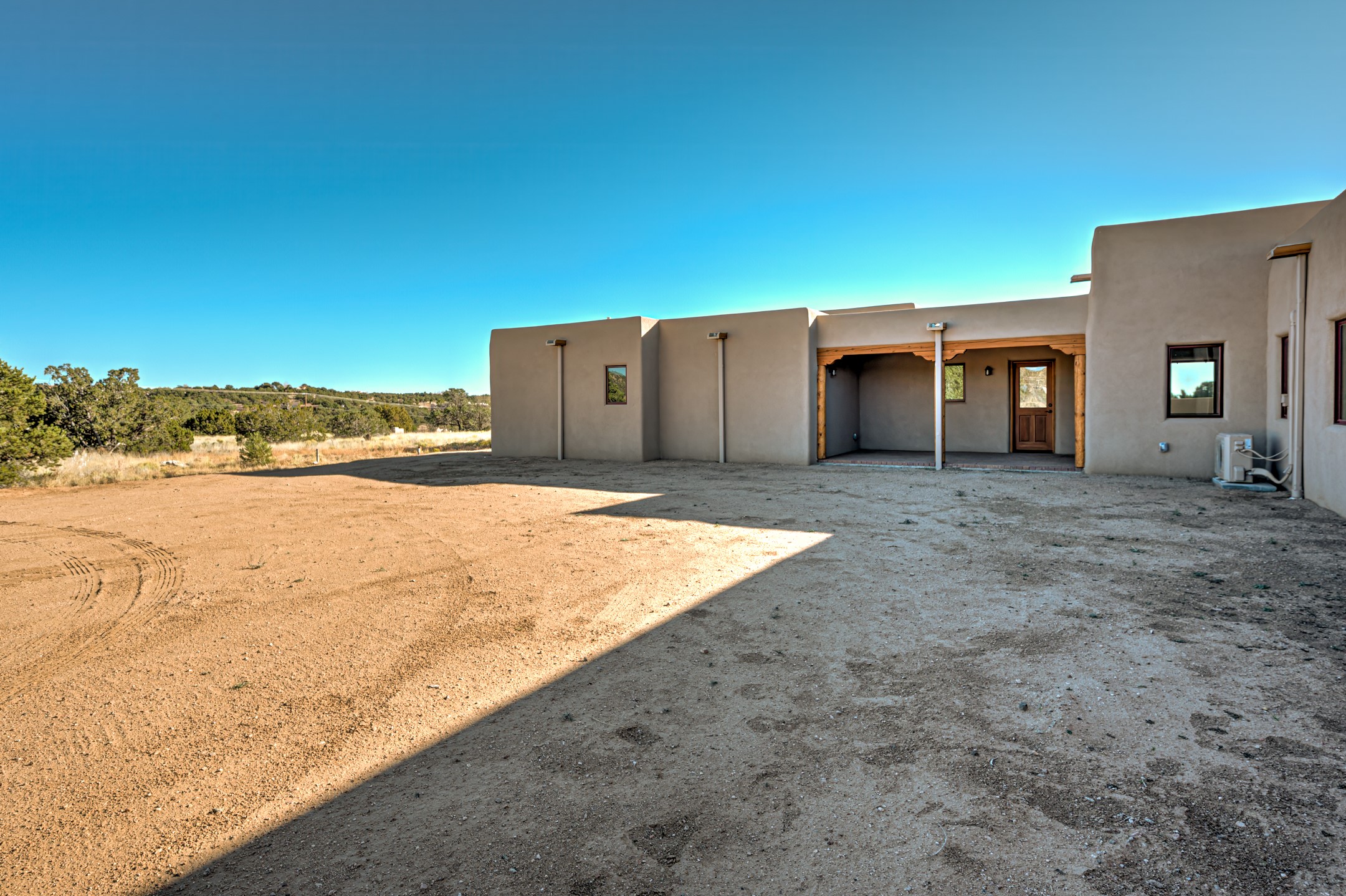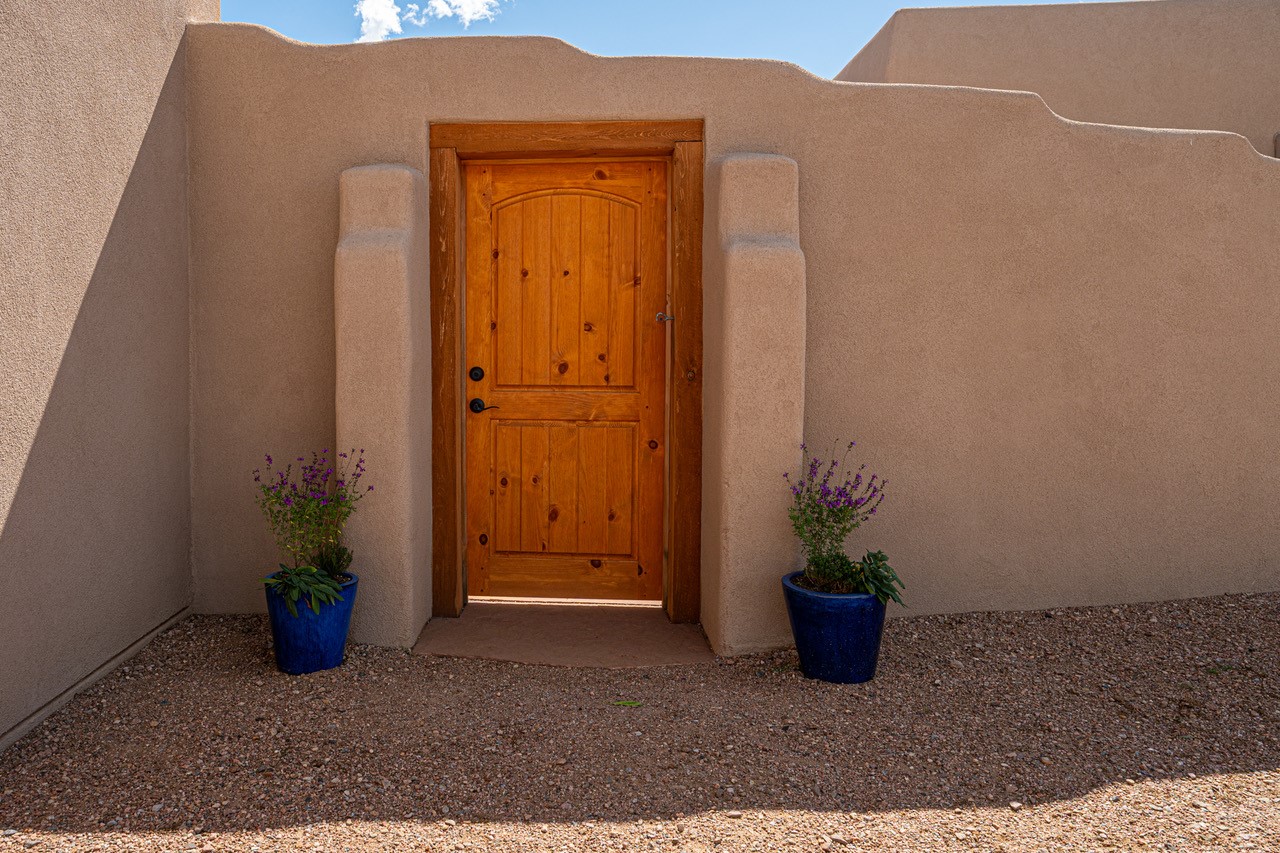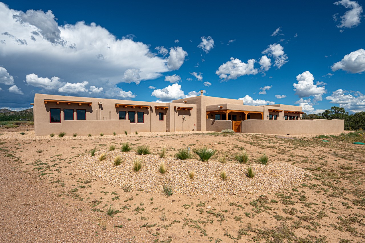 Outstanding quality in this Adobe contemporary pueblo masterpiece built by one of Santa Fe's premier adobe builders, Jeff Fagley of Shaylube Construction. This home has never been lived in, is waiting for the first owner to enjoy. Open plan design with dramatic corbelled beam ceiling and Kiva fireplace in great room, tiled floors and gleaming thick smooth plastered walls throughout complement the classic elements of Santa Fe style. Spacious bright and light feel with high ceilings throughout. Large owners suite with walk in closet, separate office/den and private walled portal. The separate guest guest suite includes a large den which accesses to the portalled private courtyard. Natural gas radiant heat plus 5 mini splits for heating and cooling complement the radiant in floor heating and passive solar design. A sunny chefs kitchen with butlers pantry and large central island, a large formal dining area opens to the wrap-around portal for private outside dining and entertainment. The walled courtyard entry also provides access to both main home and guest quarters. There is a second privacy walled south courtyard with bricked portals accessed from living room and master suite also excellent for sunset mountain viewing. Roof drainage to 2 cisterns already installed underground which catches the rainfall for landscaping. A large 3 car garage for lots of toys or hobbies, plenty of guest parking and lovely views with 7+acres to enjoy. Horses allowed. Enjoy access to local Eldorado area shopping, schools, senior center and library plus only minutes into Santa Fe.