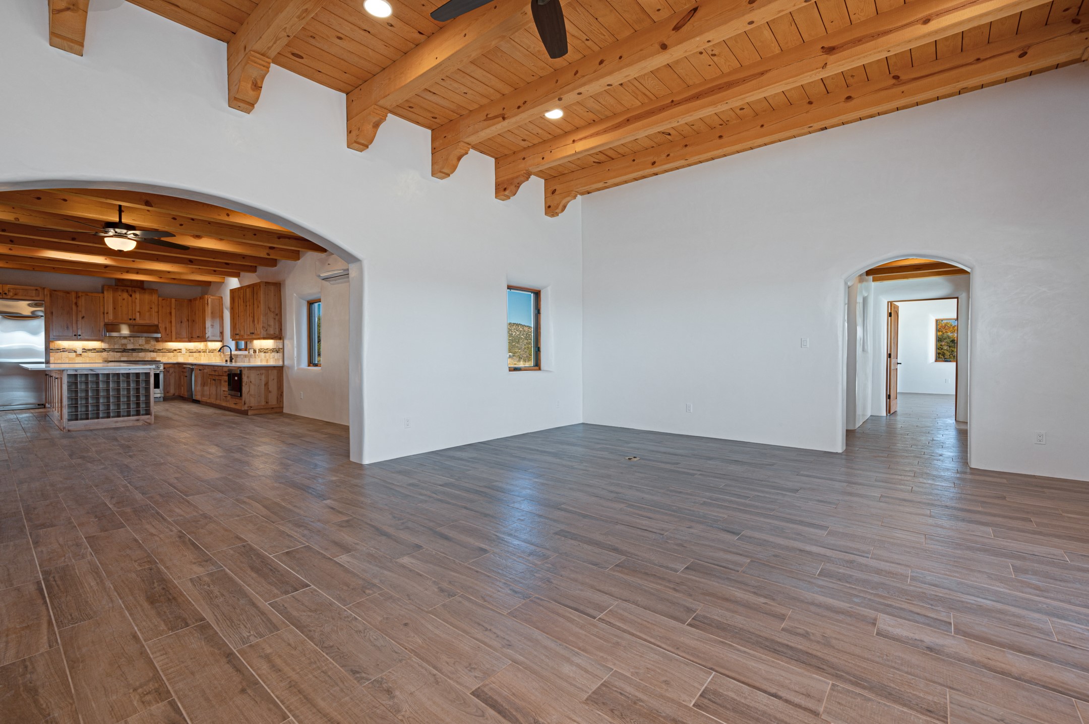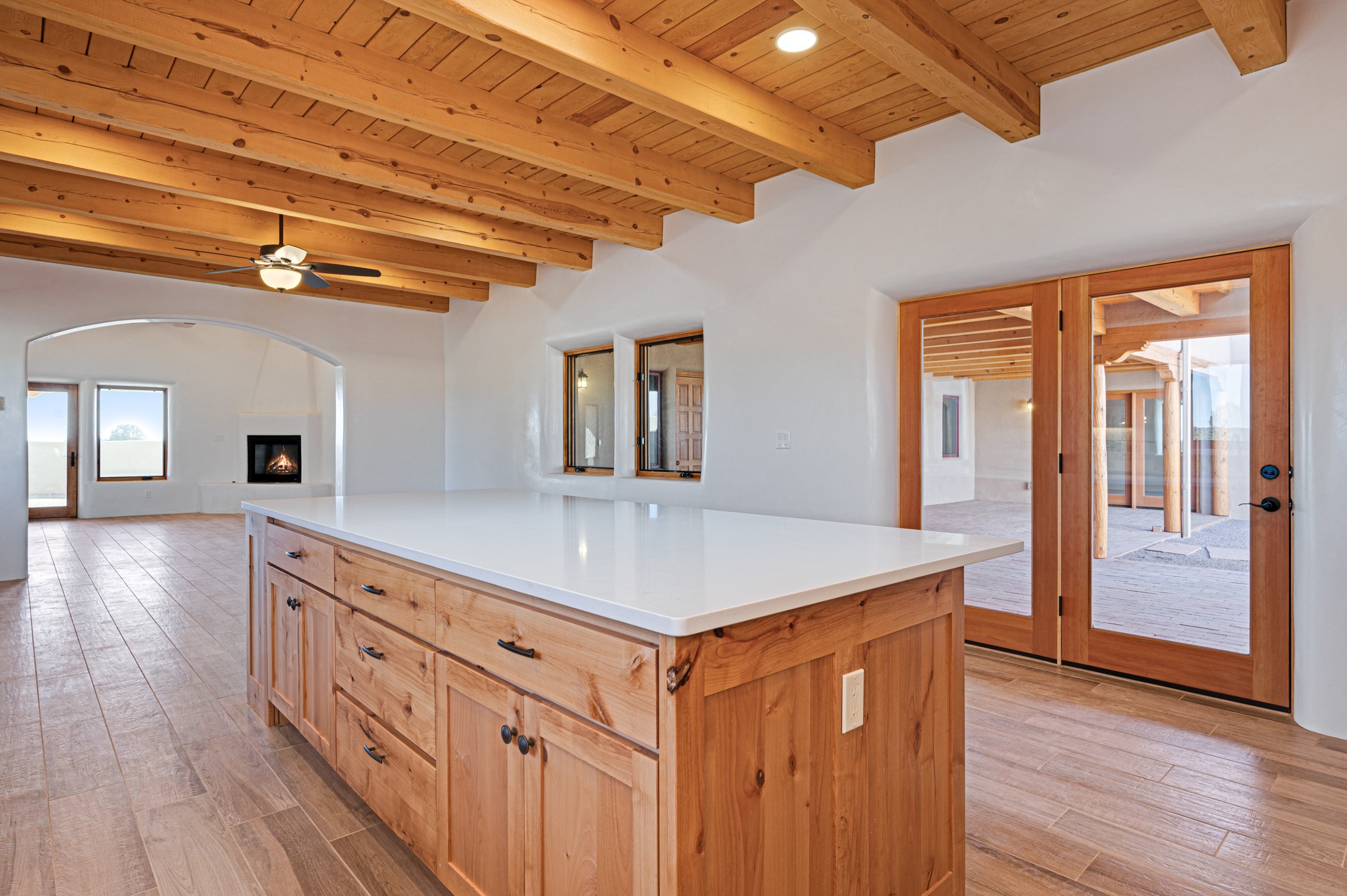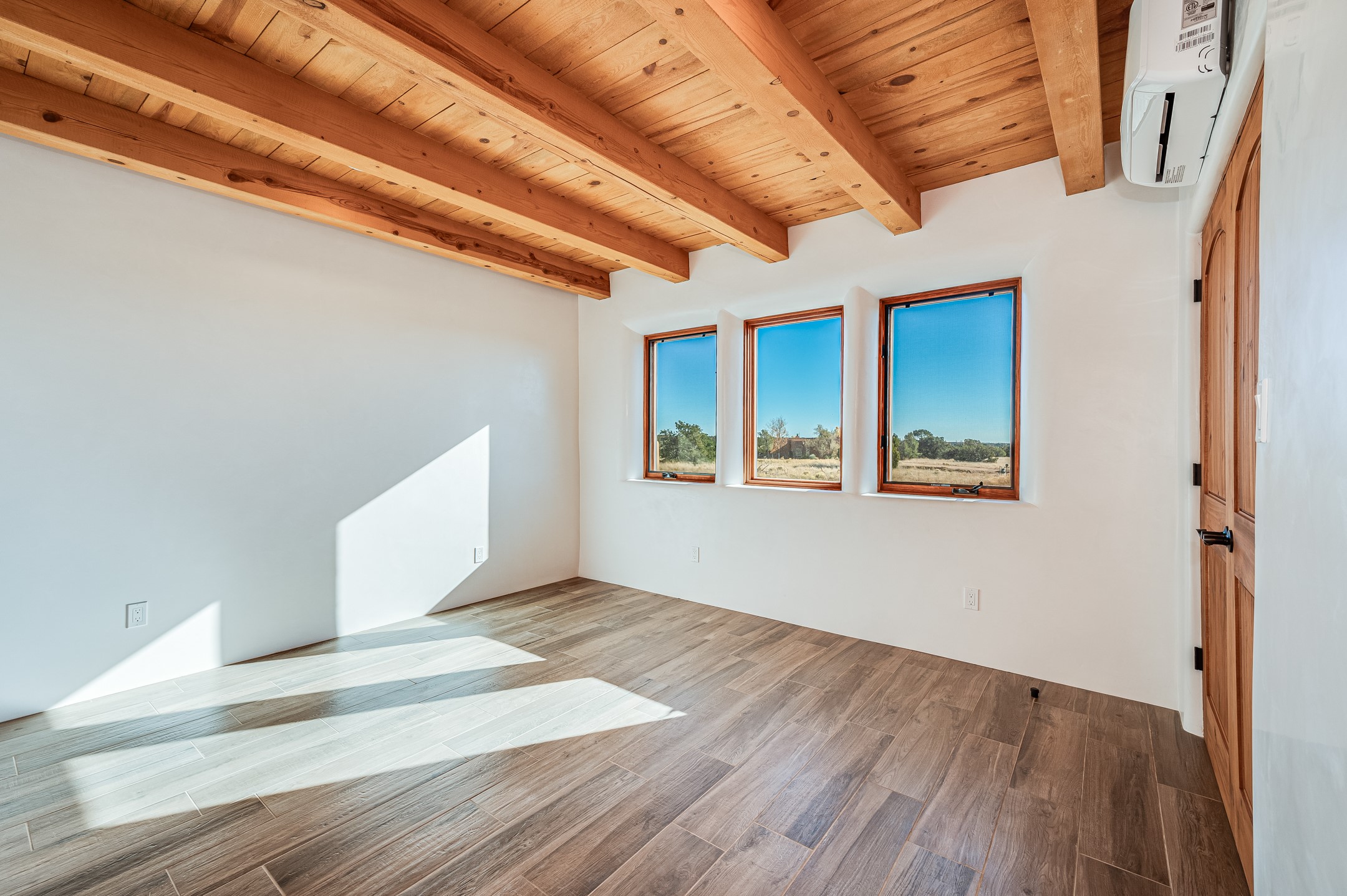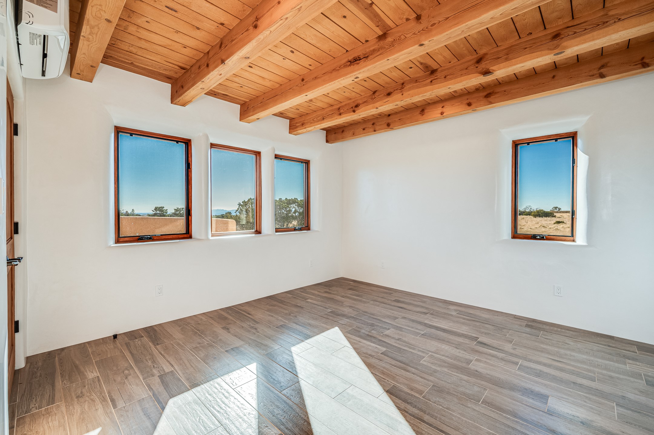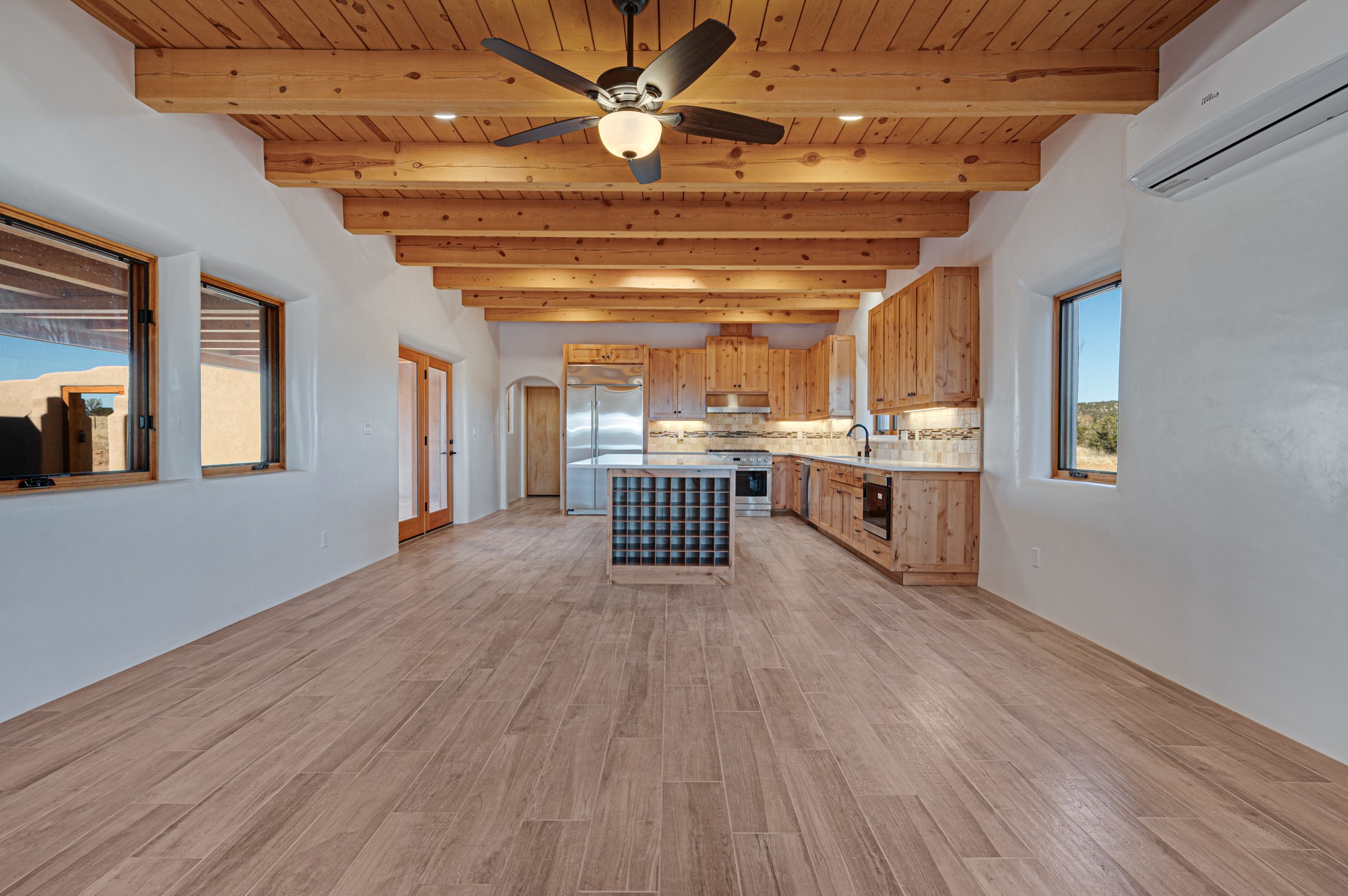 Outstanding quality in this Adobe contemporary pueblo masterpiece built by one of Santa Fe's premier adobe builders, Jeff Fagley of Shaylube Construction. This home has never been lived in, is waiting for the first owner to enjoy. Open plan design with dramatic corbelled beam ceiling and Kiva fireplace in great room, tiled floors and gleaming thick smooth plastered walls throughout complement the classic elements of Santa Fe style. Spacious bright and light feel with high ceilings throughout. Large owners suite with walk in closet, separate office/den and private walled portal. The separate guest guest suite includes a large den which accesses to the portalled private courtyard. Natural gas radiant heat plus 5 mini splits for heating and cooling complement the radiant in floor heating and passive solar design. A sunny chefs kitchen with butlers pantry and large central island, a large formal dining area opens to the wrap-around portal for private outside dining and entertainment. The walled courtyard entry also provides access to both main home and guest quarters. There is a second privacy walled south courtyard with bricked portals accessed from living room and master suite also excellent for sunset mountain viewing. Roof drainage to 2 cisterns already installed underground which catches the rainfall for landscaping. A large 3 car garage for lots of toys or hobbies, plenty of guest parking and lovely views with 7+acres to enjoy. Horses allowed. Enjoy access to local Eldorado area shopping, schools, senior center and library plus only minutes into Santa Fe.