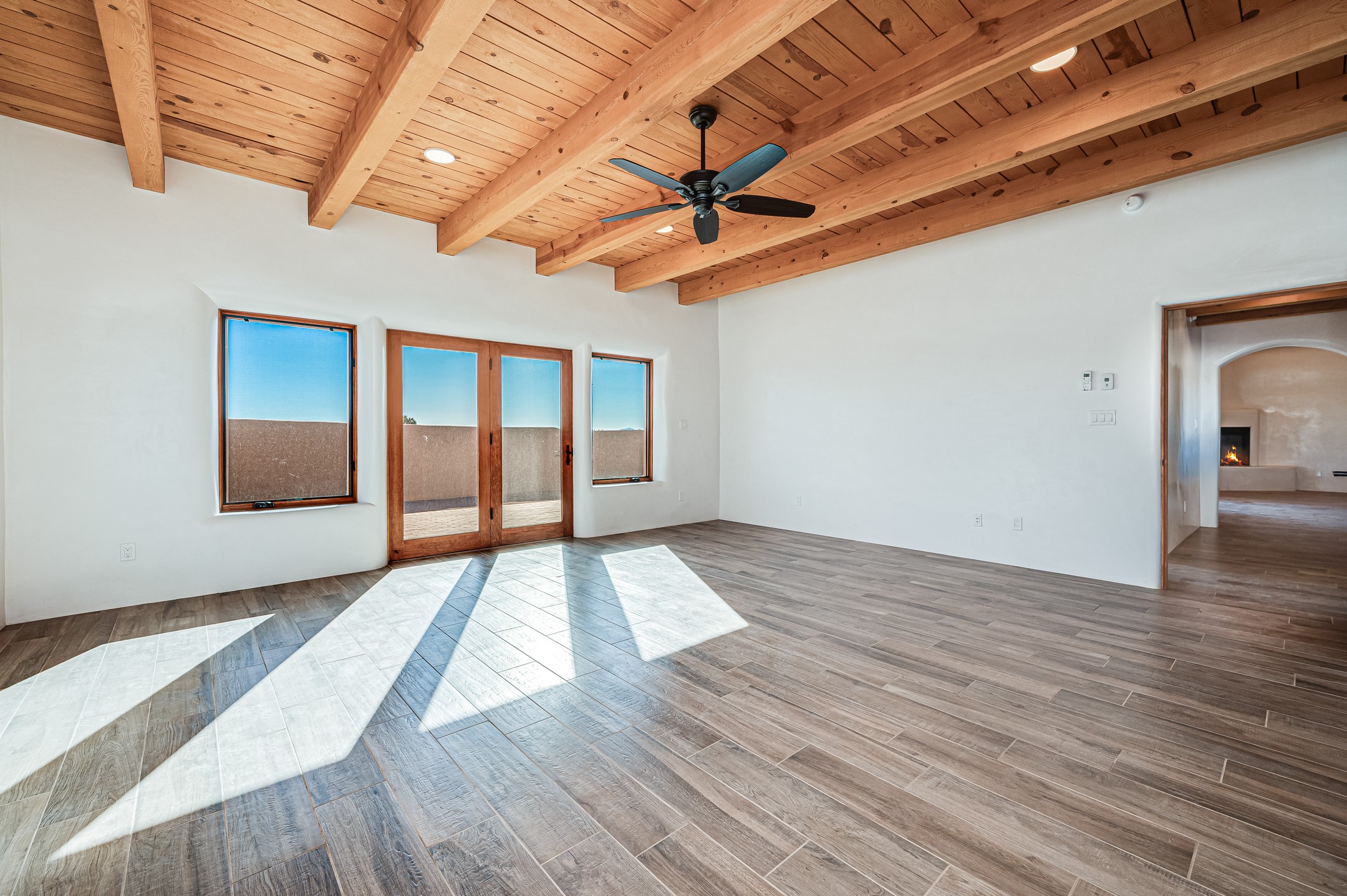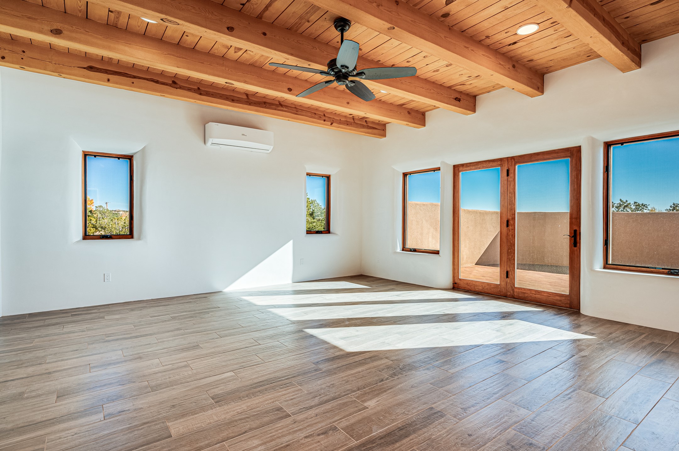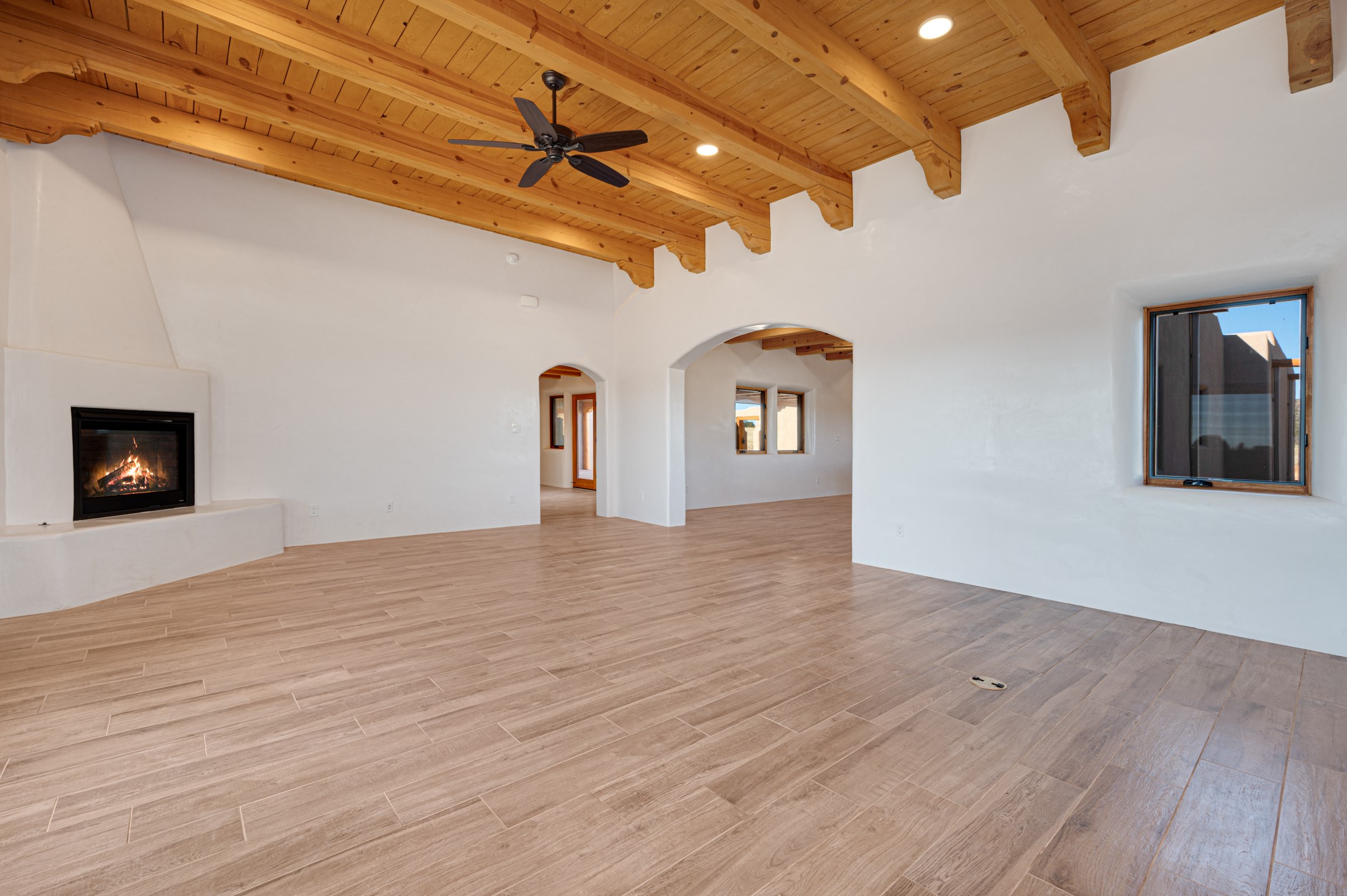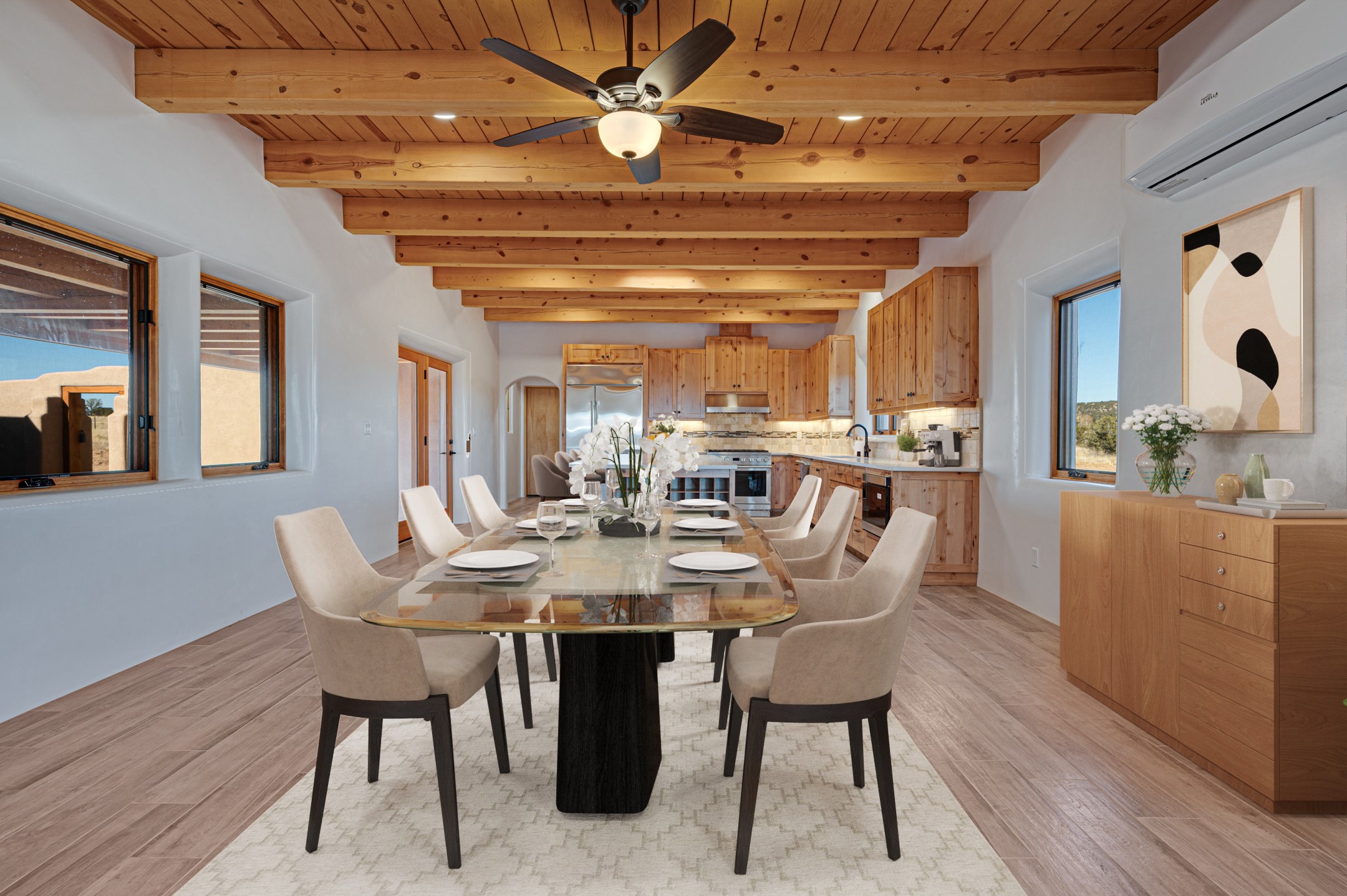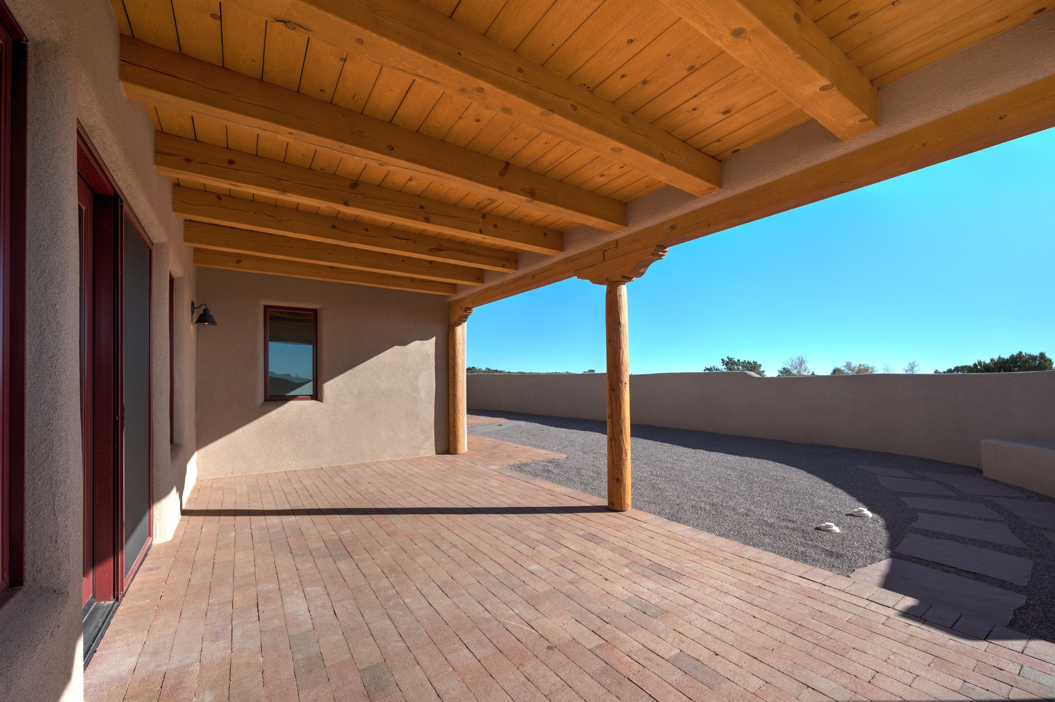 Outstanding quality in this Adobe contemporary pueblo masterpiece built by one of Santa Fe's premier adobe builders, Jeff Fagley of Shaylube Construction. This home has never been lived in, is waiting for the first owner to enjoy. Open plan design with dramatic corbelled beam ceiling and Kiva fireplace in great room, tiled floors and gleaming thick smooth plastered walls throughout complement the classic elements of Santa Fe style. Spacious bright and light feel with high ceilings throughout. Large owners suite with walk in closet, separate office/den and private walled portal. The separate guest guest suite includes a large den which accesses to the portalled private courtyard. Natural gas radiant heat plus 5 mini splits for heating and cooling complement the radiant in floor heating and passive solar design. A sunny chefs kitchen with butlers pantry and large central island, a large formal dining area opens to the wrap-around portal for private outside dining and entertainment. The walled courtyard entry also provides access to both main home and guest quarters. There is a second privacy walled south courtyard with bricked portals accessed from living room and master suite also excellent for sunset mountain viewing. Roof drainage to 2 cisterns already installed underground which catches the rainfall for landscaping. A large 3 car garage for lots of toys or hobbies, plenty of guest parking and lovely views with 7+acres to enjoy. Horses allowed. Enjoy access to local Eldorado area shopping, schools, senior center and library plus only minutes into Santa Fe.