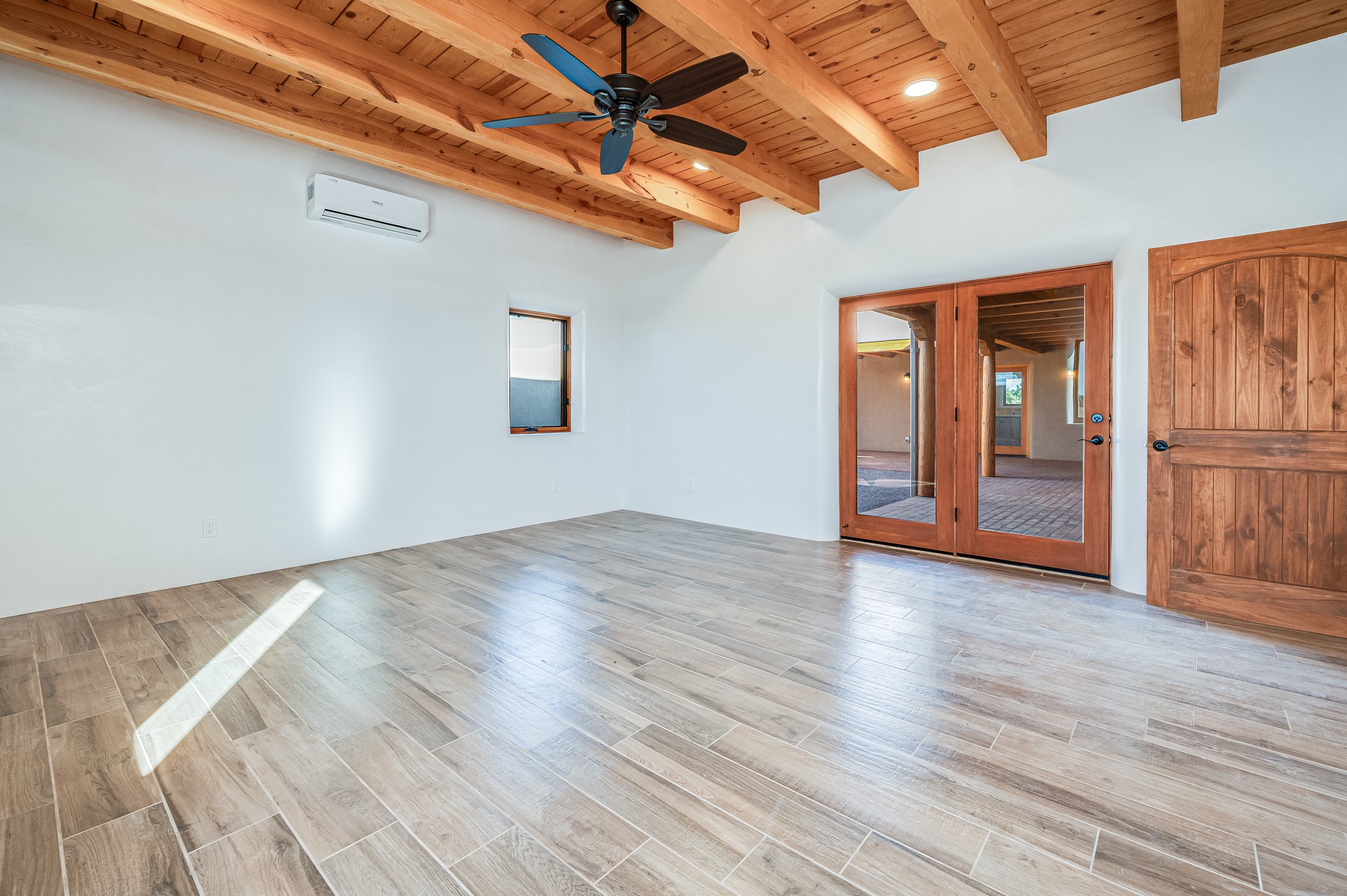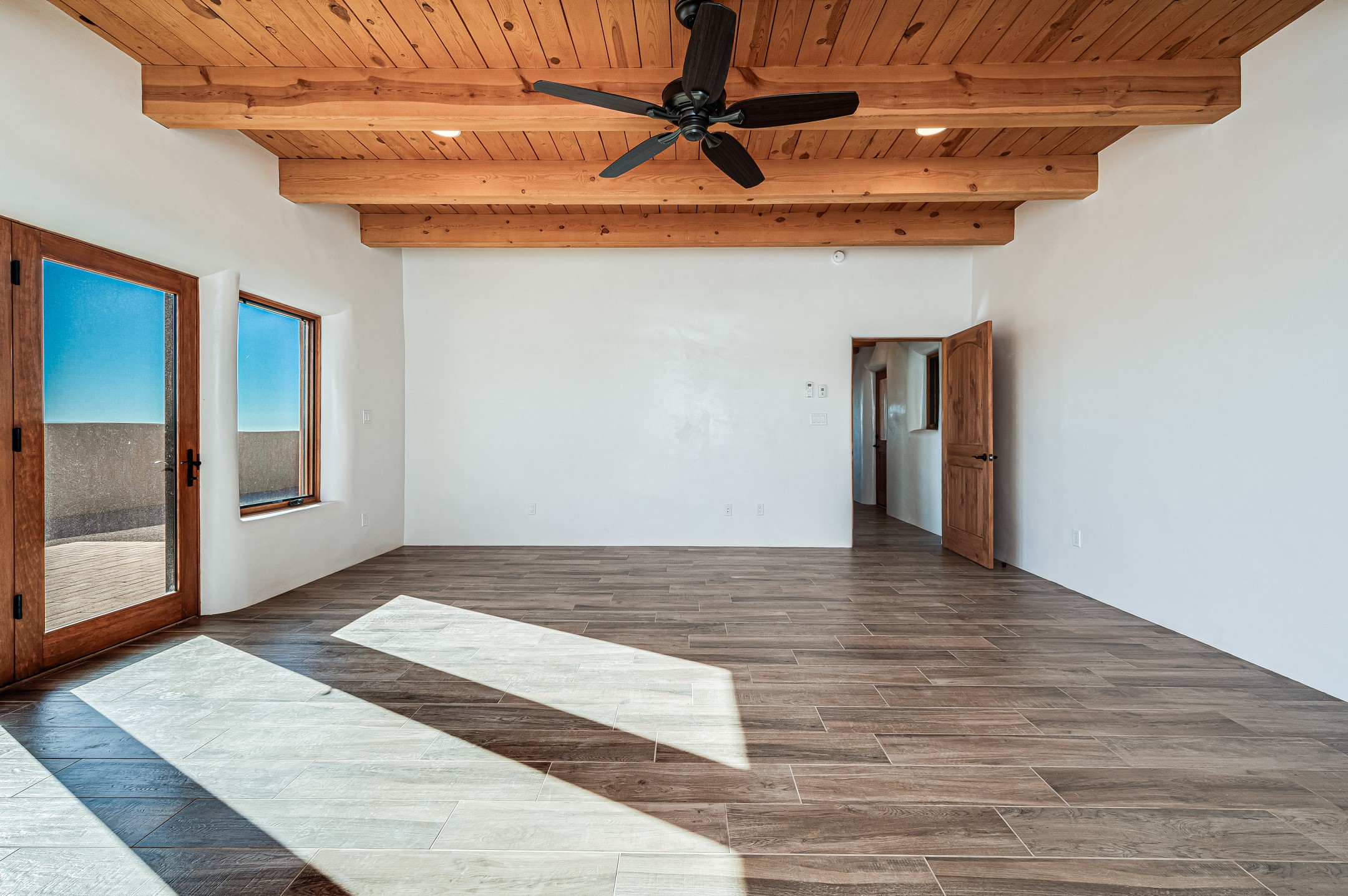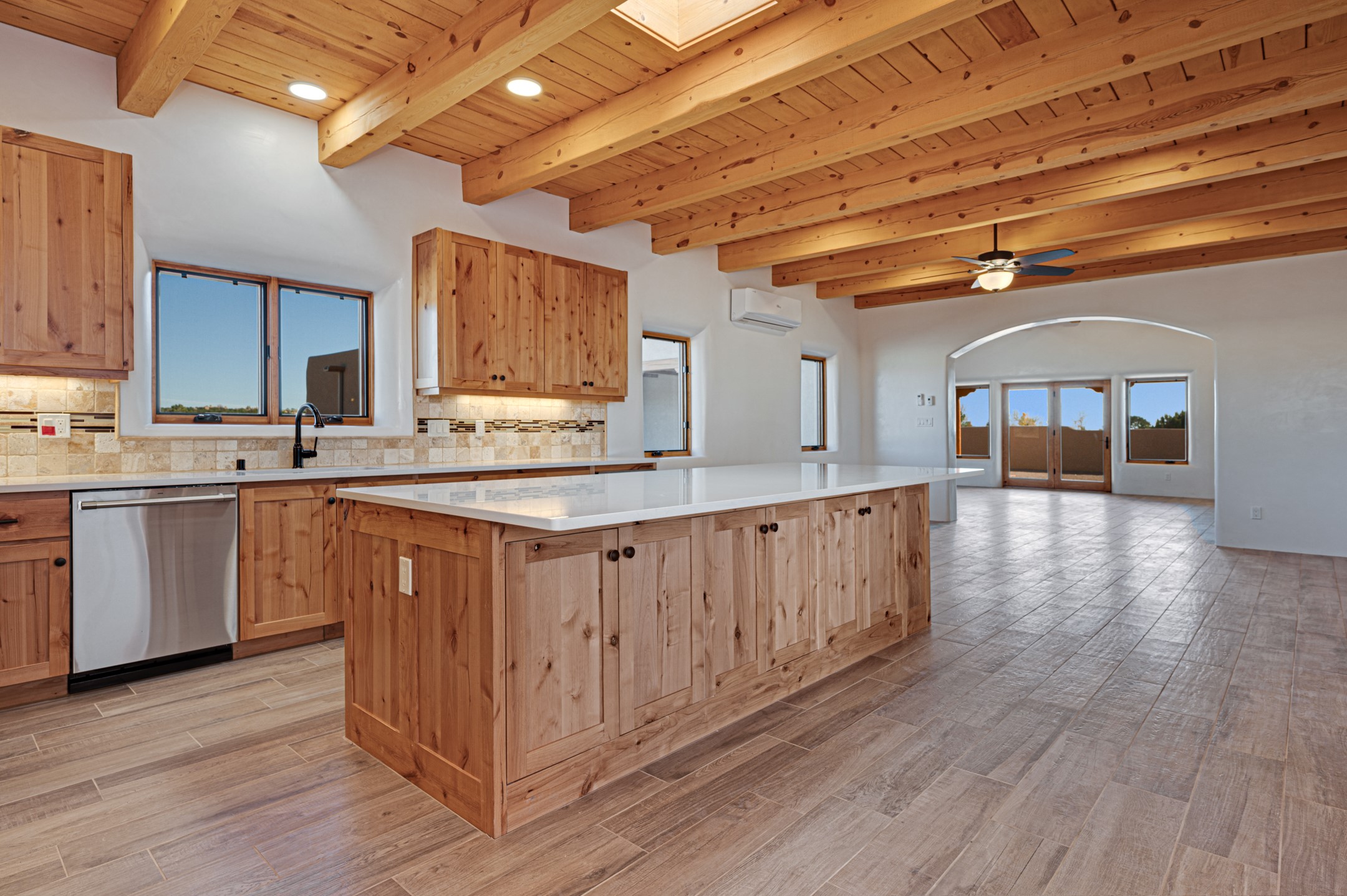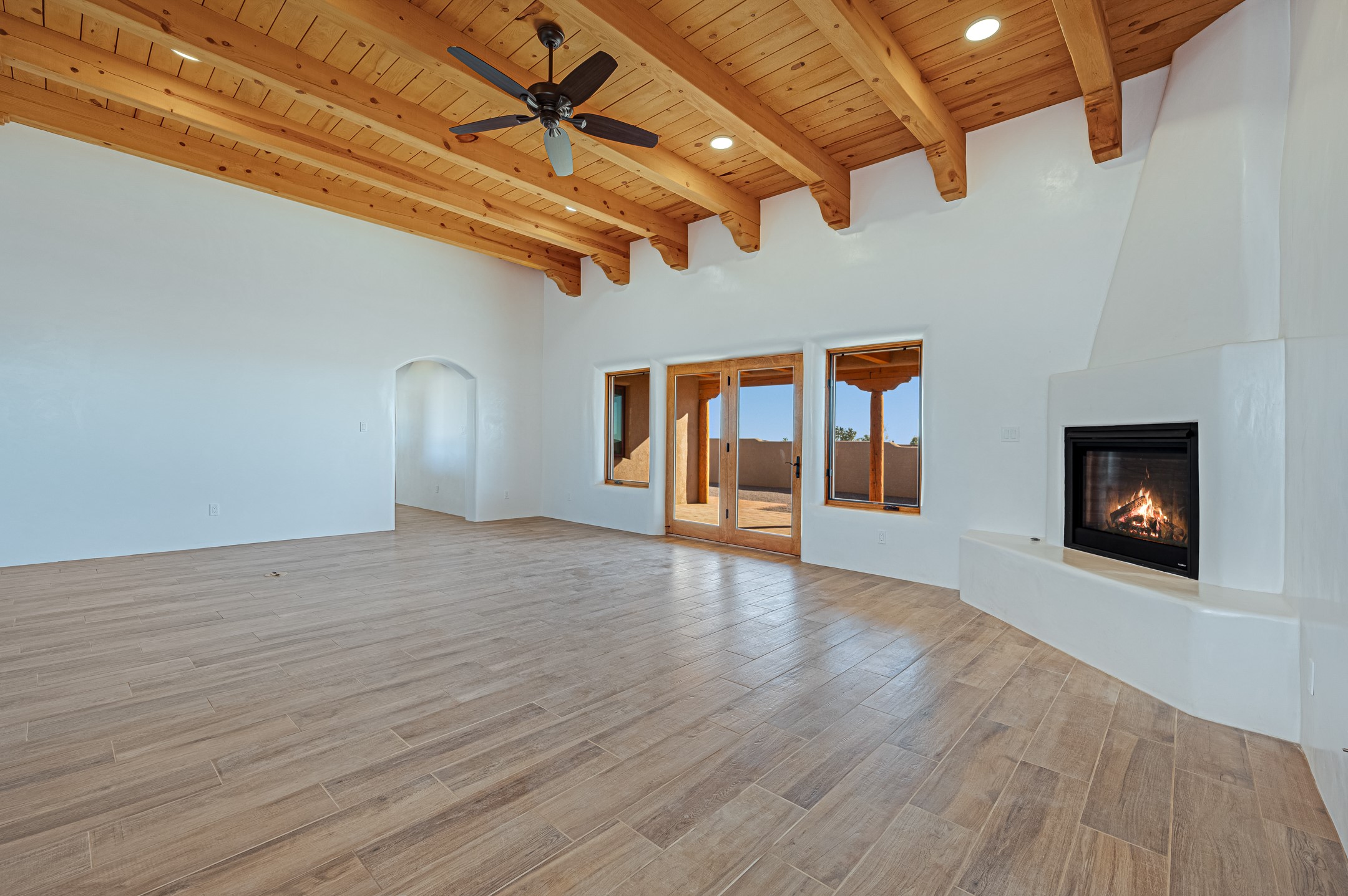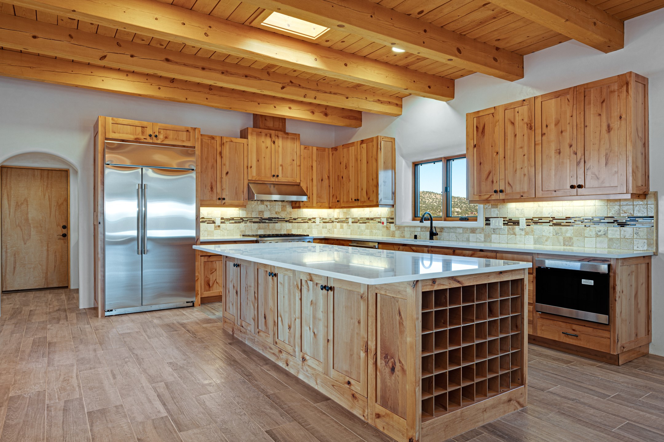 Outstanding quality in this Adobe contemporary pueblo masterpiece built by one of Santa Fe's premier adobe builders, Jeff Fagley of Shaylube Construction. This home has never been lived in, is waiting for the first owner to enjoy. Open plan design with dramatic corbelled beam ceiling and Kiva fireplace in great room, tiled floors and gleaming thick smooth plastered walls throughout complement the classic elements of Santa Fe style. Spacious bright and light feel with high ceilings throughout. Large owners suite with walk in closet, separate office/den and private walled portal. The separate guest guest suite includes a large den which accesses to the portalled private courtyard. Natural gas radiant heat plus 5 mini splits for heating and cooling complement the radiant in floor heating and passive solar design. A sunny chefs kitchen with butlers pantry and large central island, a large formal dining area opens to the wrap-around portal for private outside dining and entertainment. The walled courtyard entry also provides access to both main home and guest quarters. There is a second privacy walled south courtyard with bricked portals accessed from living room and master suite also excellent for sunset mountain viewing. Roof drainage to 2 cisterns already installed underground which catches the rainfall for landscaping. A large 3 car garage for lots of toys or hobbies, plenty of guest parking and lovely views with 7+acres to enjoy. Horses allowed. Enjoy access to local Eldorado area shopping, schools, senior center and library plus only minutes into Santa Fe.