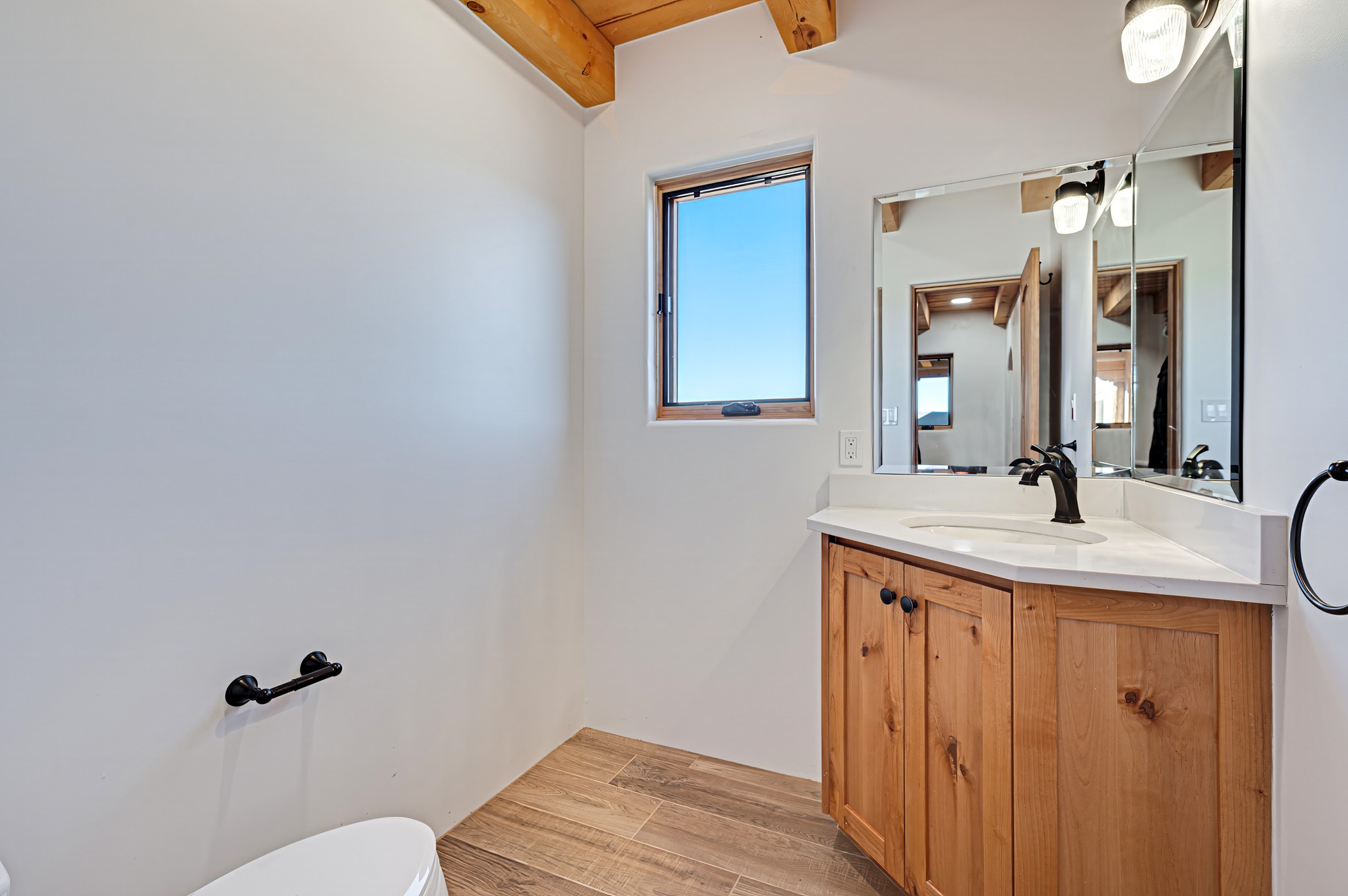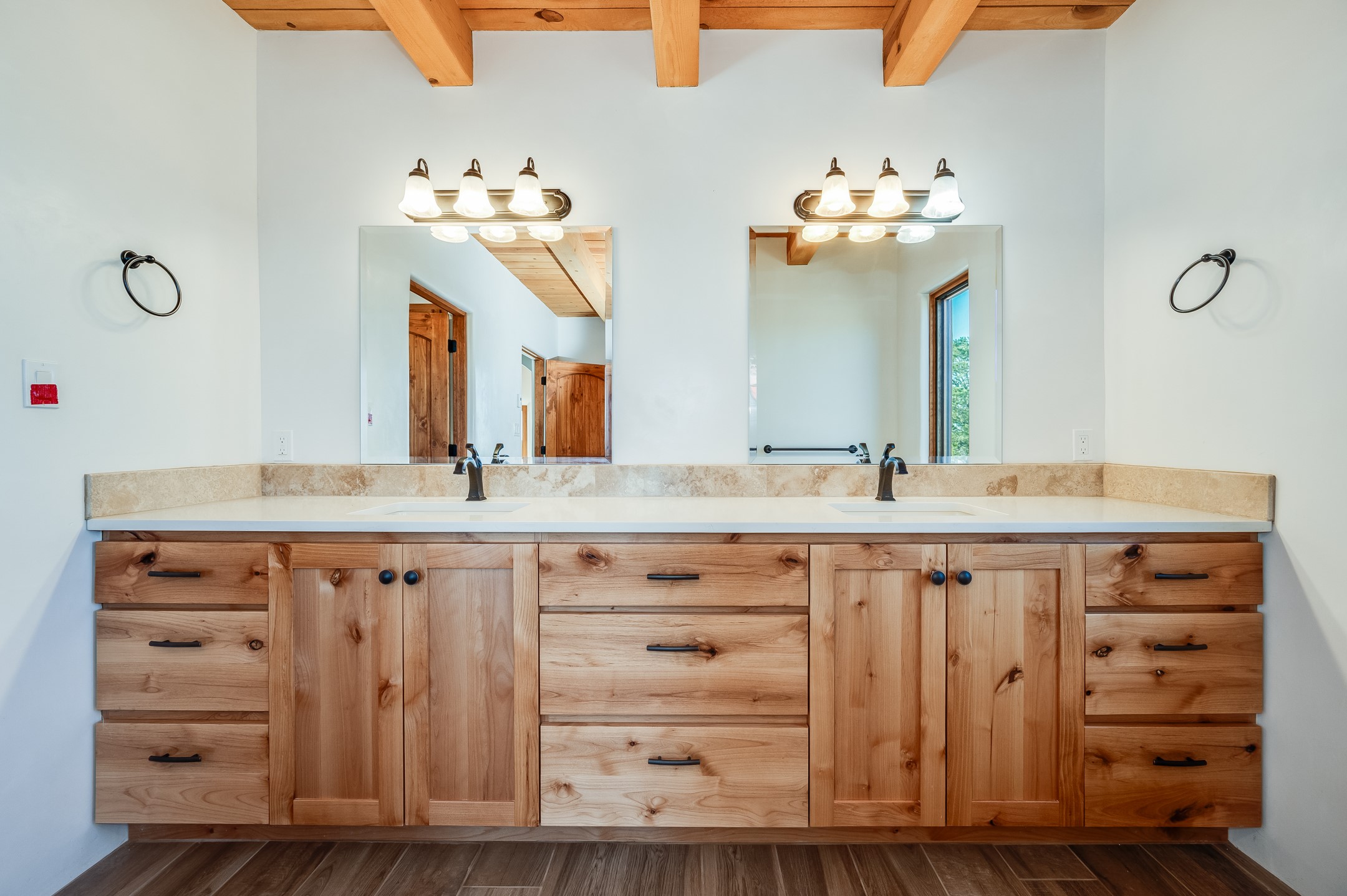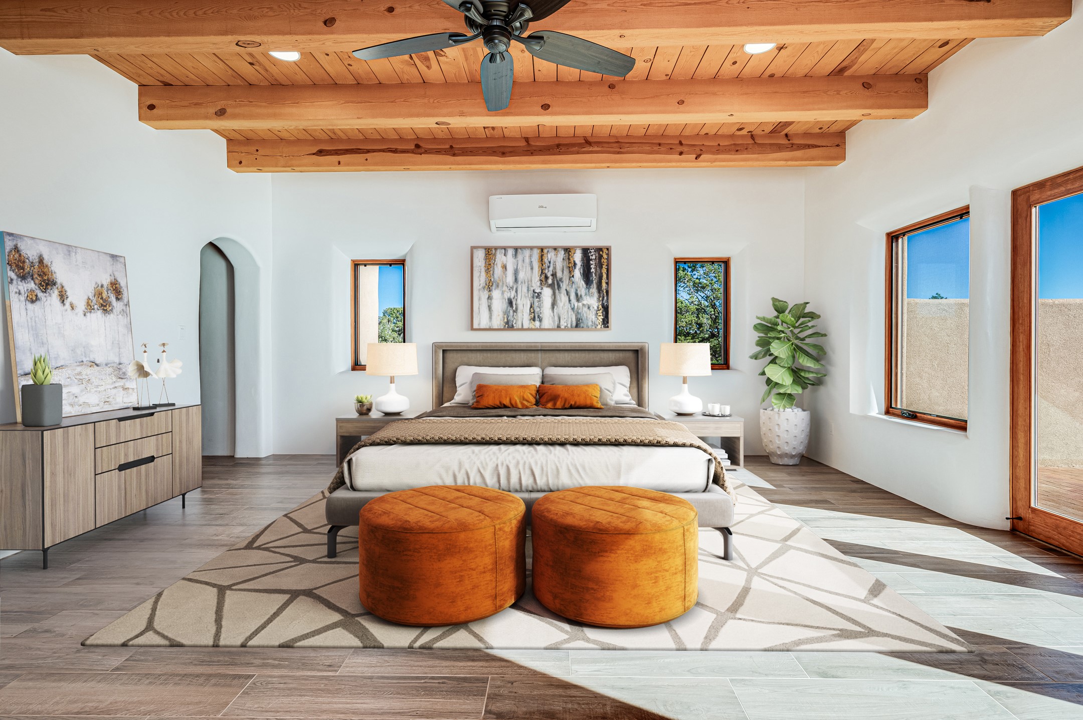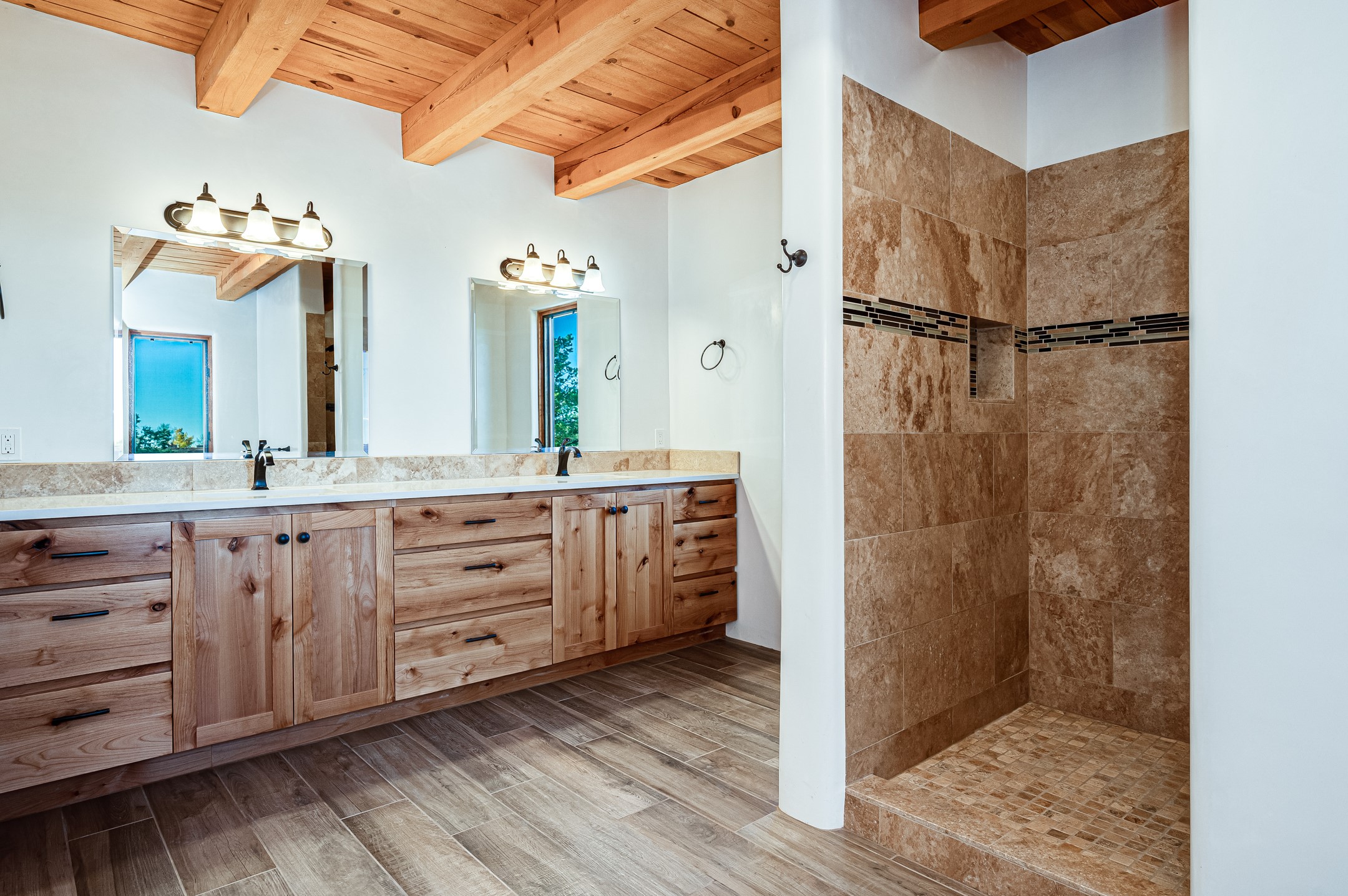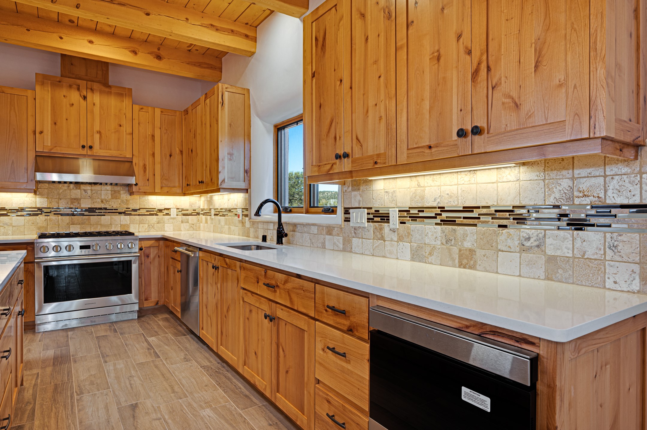 Outstanding quality in this Adobe contemporary pueblo masterpiece built by one of Santa Fe's premier adobe builders, Jeff Fagley of Shaylube Construction. This home has never been lived in, is waiting for the first owner to enjoy. Open plan design with dramatic corbelled beam ceiling and Kiva fireplace in great room, tiled floors and gleaming thick smooth plastered walls throughout complement the classic elements of Santa Fe style. Spacious bright and light feel with high ceilings throughout. Large owners suite with walk in closet, separate office/den and private walled portal. The separate guest guest suite includes a large den which accesses to the portalled private courtyard. Natural gas radiant heat plus 5 mini splits for heating and cooling complement the radiant in floor heating and passive solar design. A sunny chefs kitchen with butlers pantry and large central island, a large formal dining area opens to the wrap-around portal for private outside dining and entertainment. The walled courtyard entry also provides access to both main home and guest quarters. There is a second privacy walled south courtyard with bricked portals accessed from living room and master suite also excellent for sunset mountain viewing. Roof drainage to 2 cisterns already installed underground which catches the rainfall for landscaping. A large 3 car garage for lots of toys or hobbies, plenty of guest parking and lovely views with 7+acres to enjoy. Horses allowed. Enjoy access to local Eldorado area shopping, schools, senior center and library plus only minutes into Santa Fe.