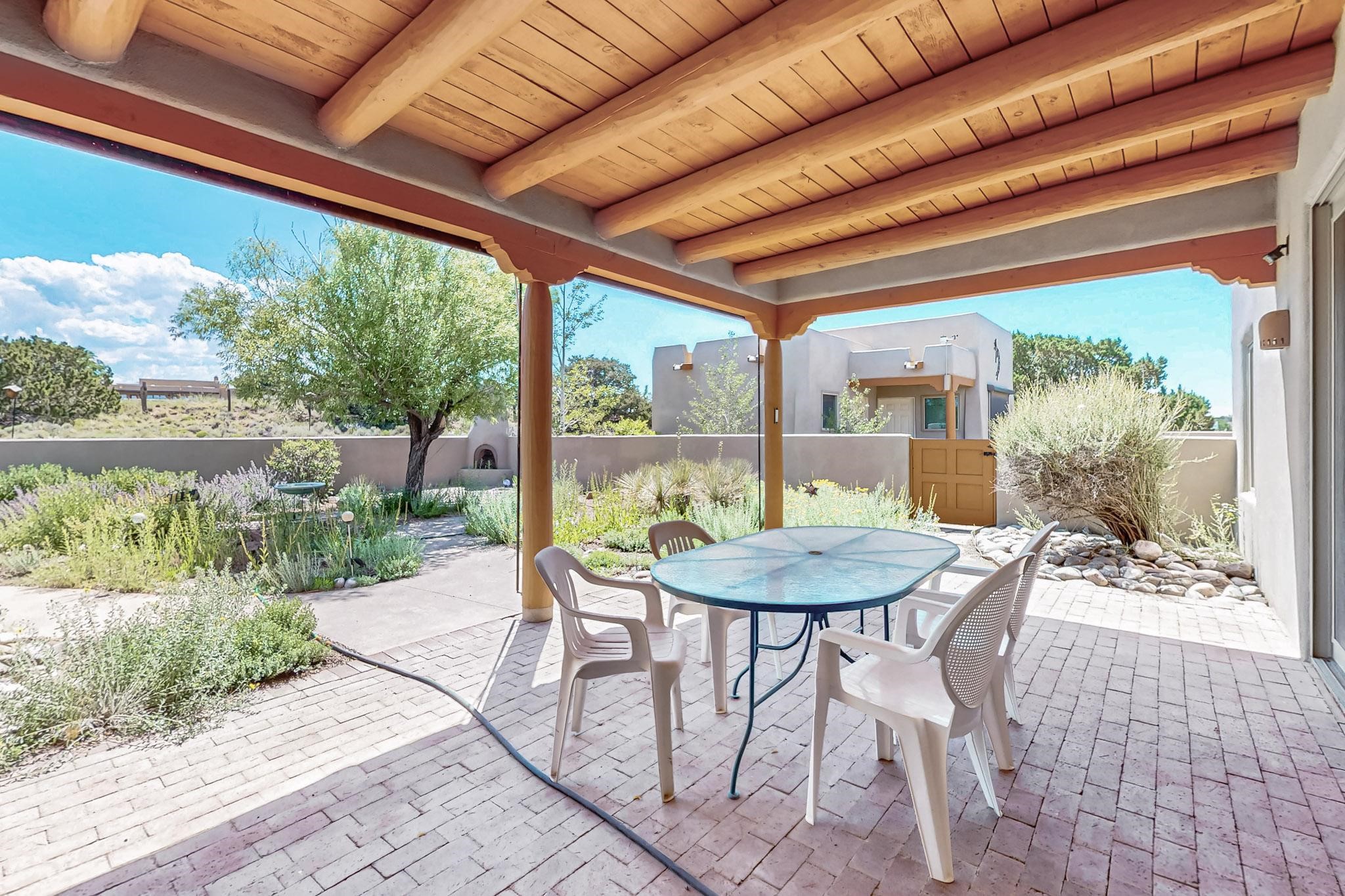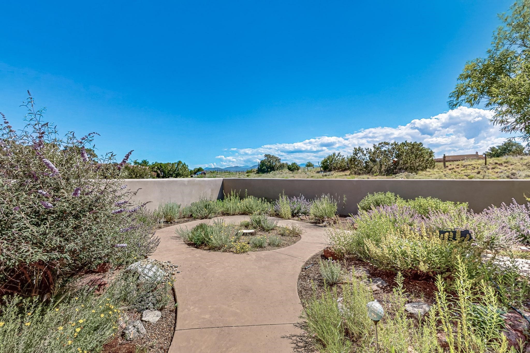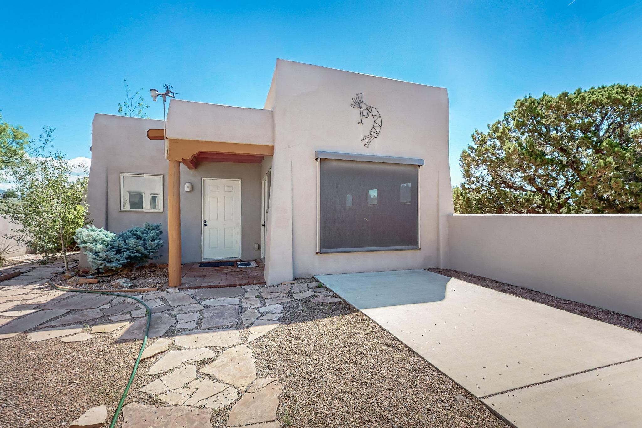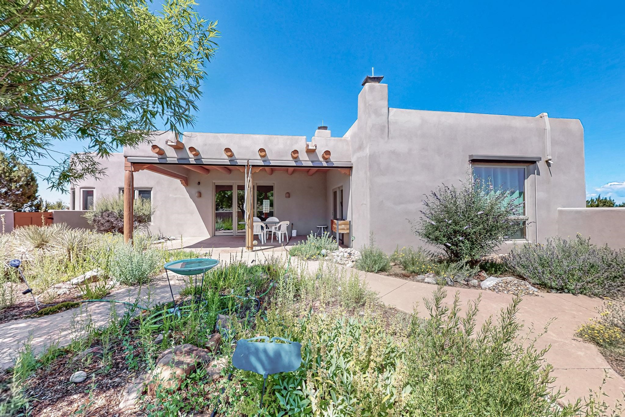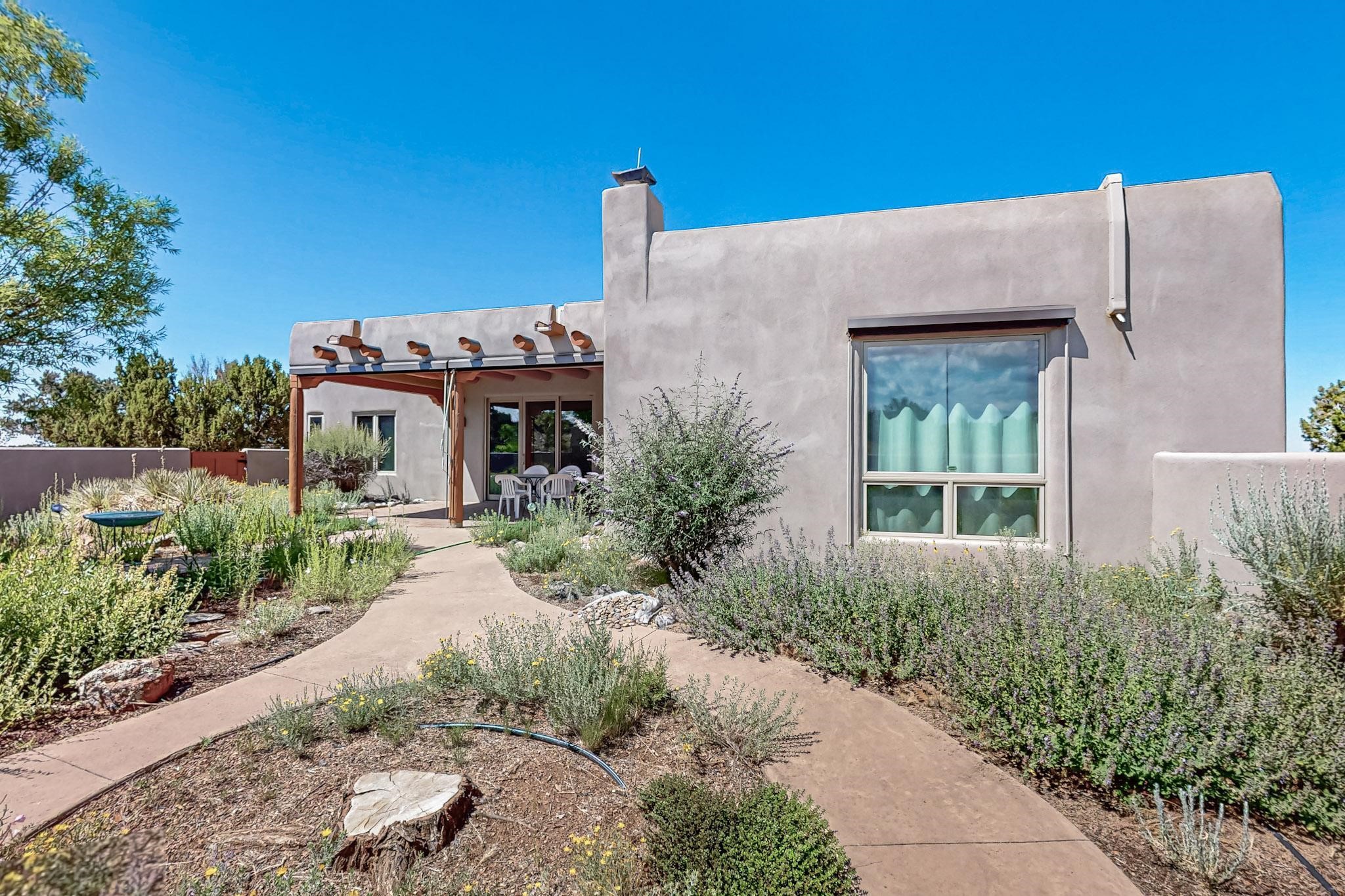 Priced to Sell! Potential multigenerational living. Expansive contemporary pueblo, split bedroom open plan design with high ceilings throughout. The main home includes a formal dining area, spacious great room with kiva fireplace, a large primary suite with kiva fireplace, large walk in closet and spa-like bathroom. Excellent separation from the two guest bedrooms and bath, plus a den/study. The kitchen has been remodeled including an induction range top, custom lighted cabinetry and 2 pantries. The radiant heating is supplemented by 5 mini splits to keep a comfortable temperature summer and winter. There is a large heated storage room/workroom for hobbies and toys plus an oversized 2 car garage with extra storage. Behind the home sits a detached 478 sq.ft. heated 2 room studio/guest with a 3/4 bathroom for extra guests/office or studio with a separate septic system. A lovely walled garden with a 3rd kiva fireplace for enjoyment plus a large portal for morning or evening outside entertainment. Enjoy the historic railway and rail trail bordering the back of your land. Plenty of guest parking with a paved driveway and easy access to Eldorado amenities, local shopping only minutes into Santa Fe.