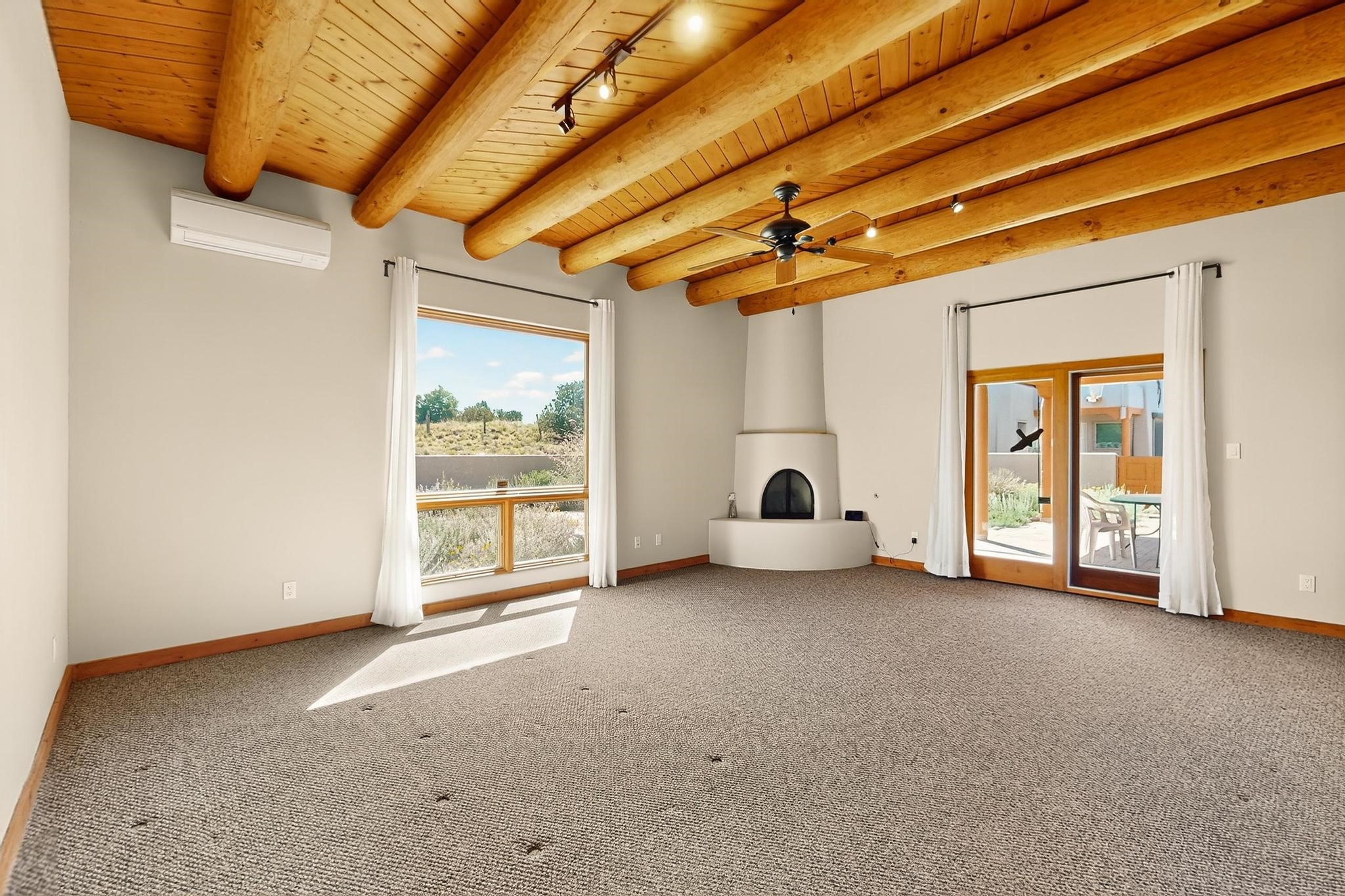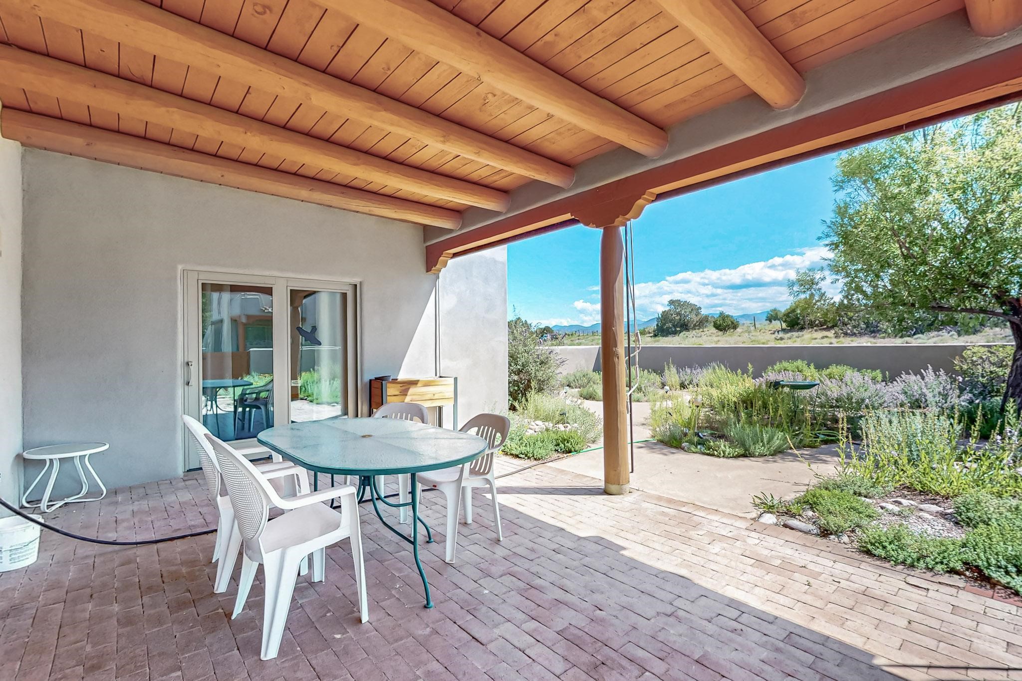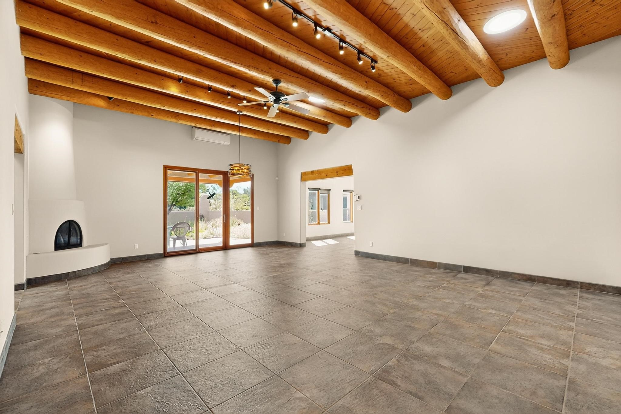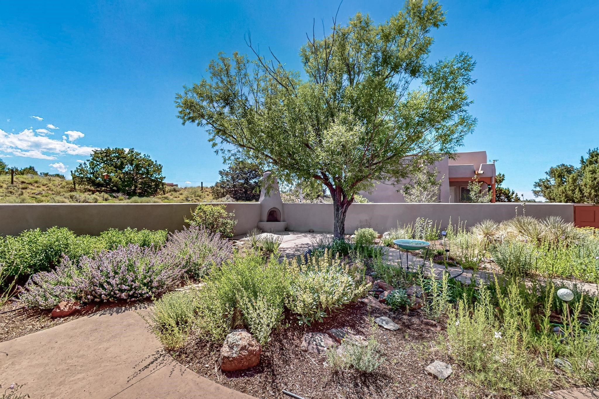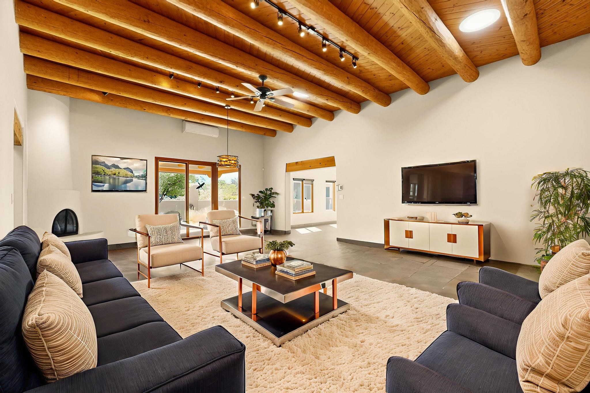 Priced to Sell! Potential multigenerational living. Expansive contemporary pueblo, split bedroom open plan design with high ceilings throughout. The main home includes a formal dining area, spacious great room with kiva fireplace, a large primary suite with kiva fireplace, large walk in closet and spa-like bathroom. Excellent separation from the two guest bedrooms and bath, plus a den/study. The kitchen has been remodeled including an induction range top, custom lighted cabinetry and 2 pantries. The radiant heating is supplemented by 5 mini splits to keep a comfortable temperature summer and winter. There is a large heated storage room/workroom for hobbies and toys plus an oversized 2 car garage with extra storage. Behind the home sits a detached 478 sq.ft. heated 2 room studio/guest with a 3/4 bathroom for extra guests/office or studio with a separate septic system. A lovely walled garden with a 3rd kiva fireplace for enjoyment plus a large portal for morning or evening outside entertainment. Enjoy the historic railway and rail trail bordering the back of your land. Plenty of guest parking with a paved driveway and easy access to Eldorado amenities, local shopping only minutes into Santa Fe.