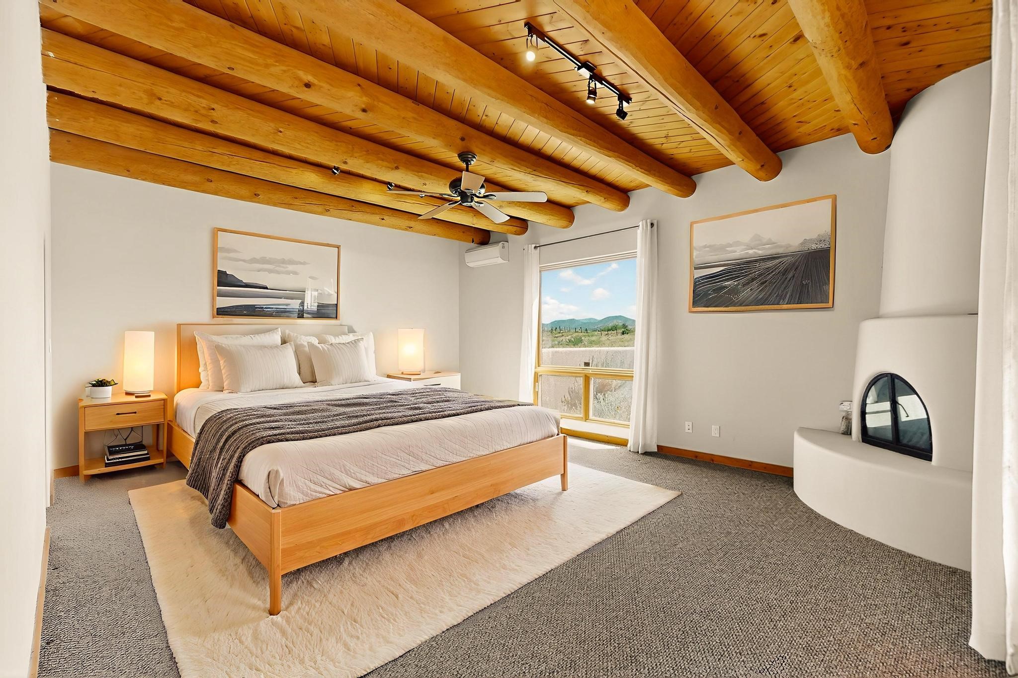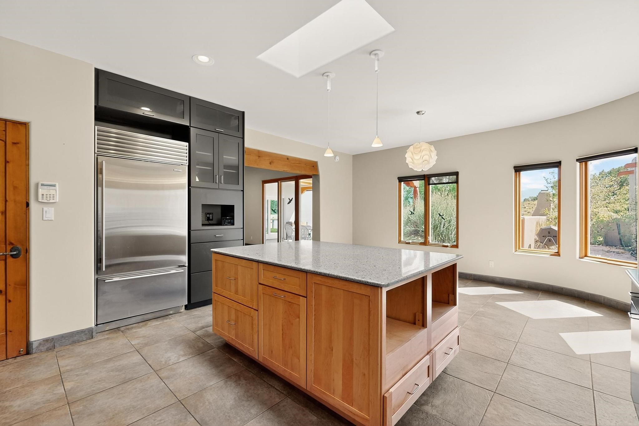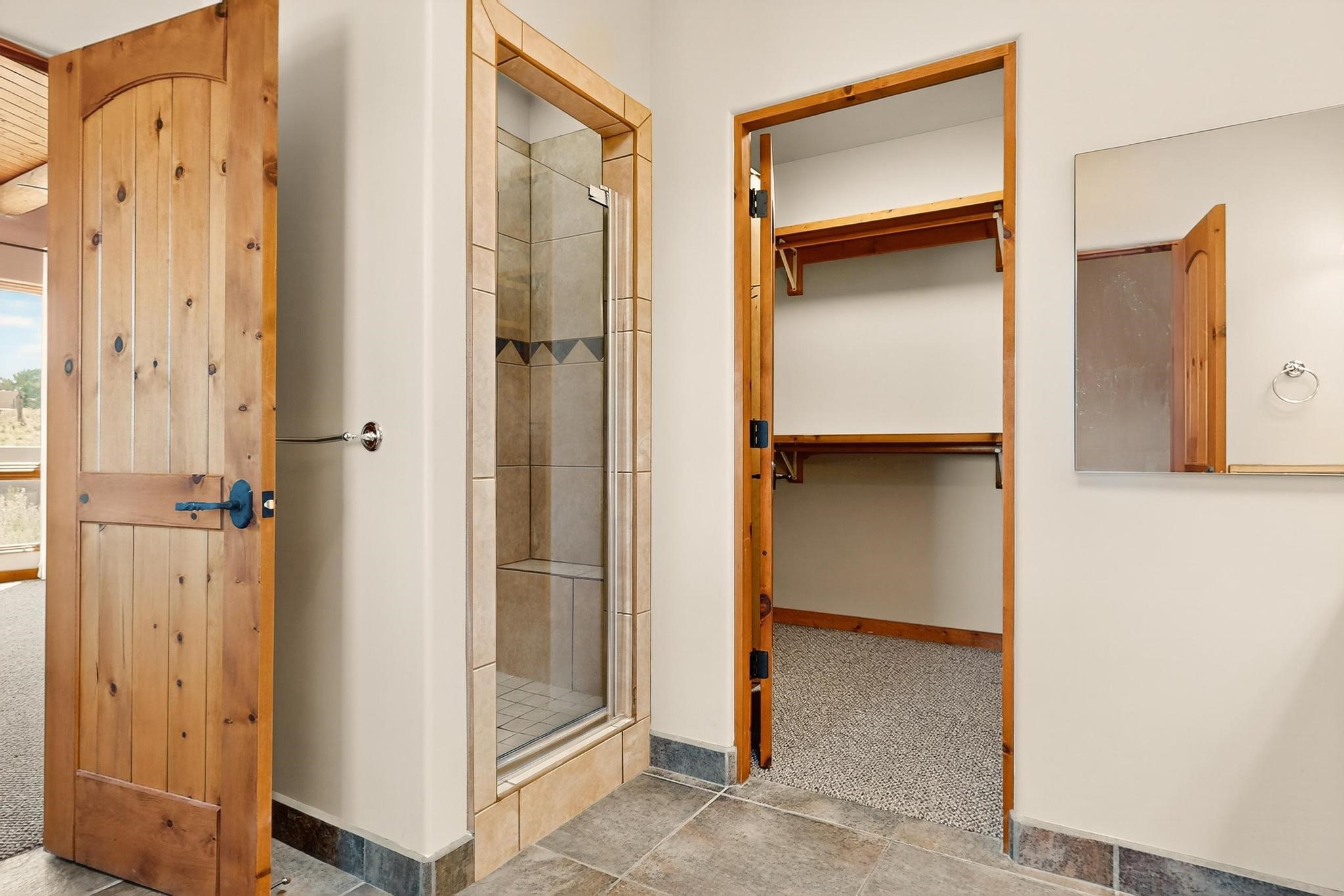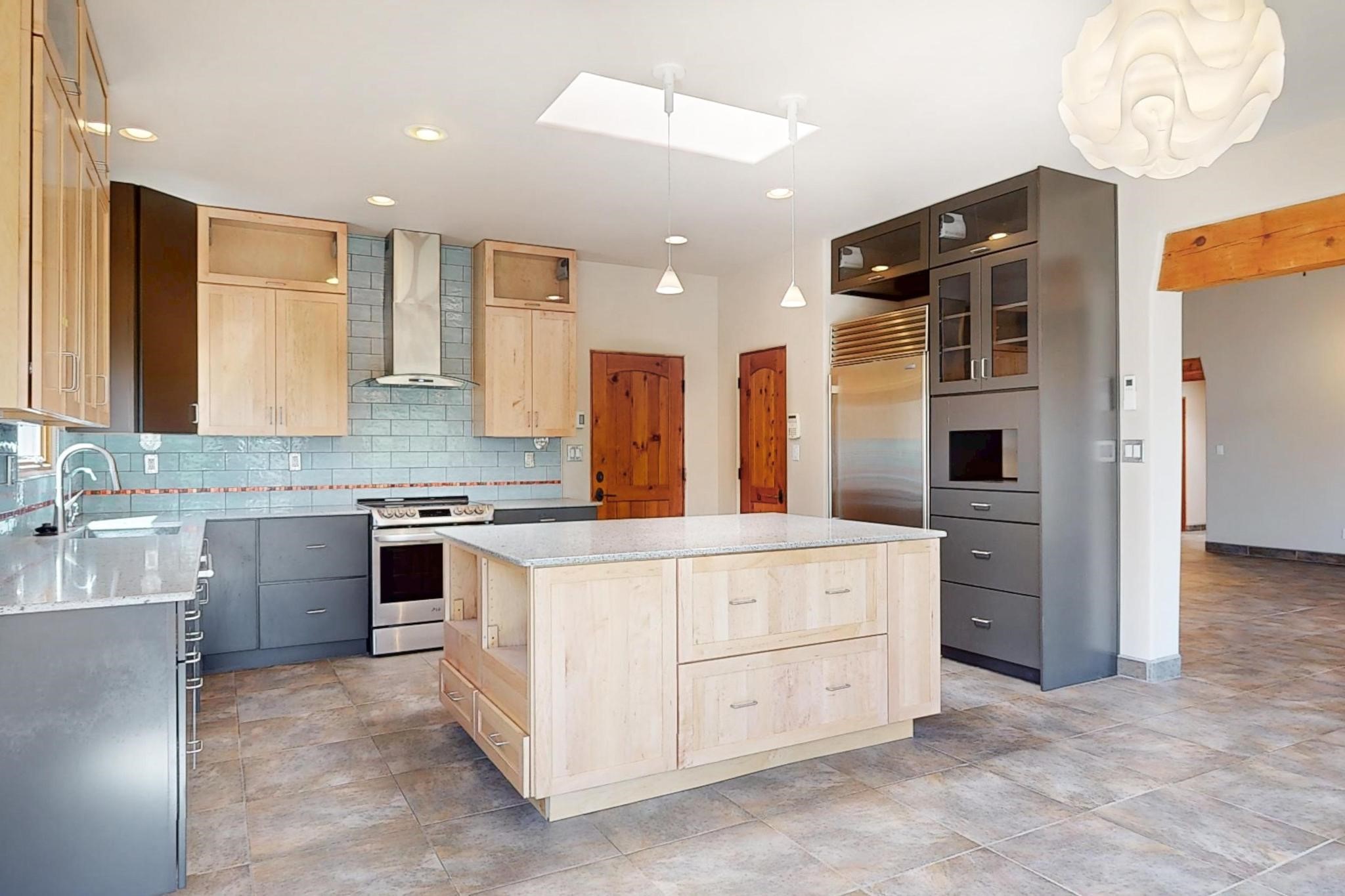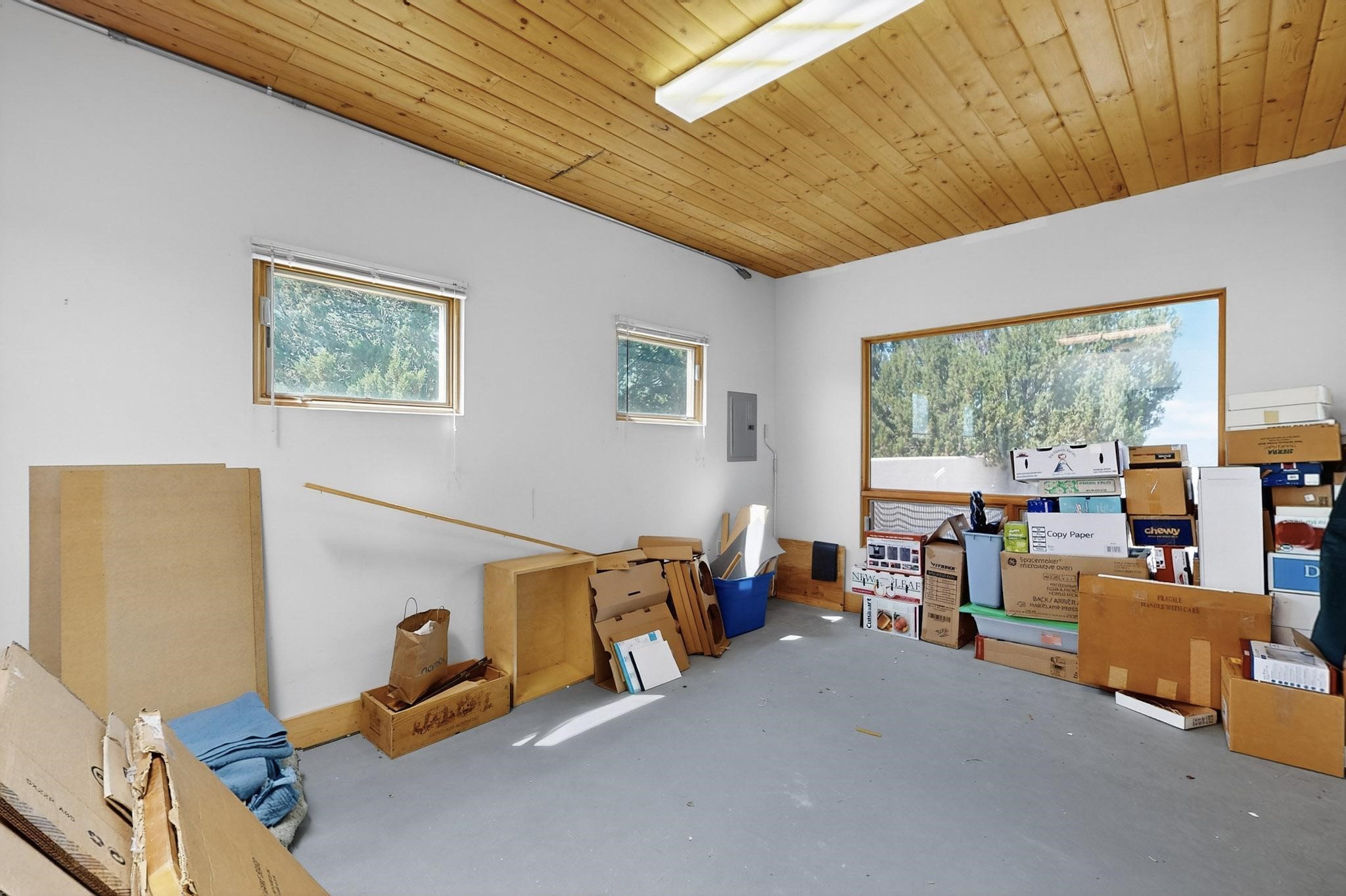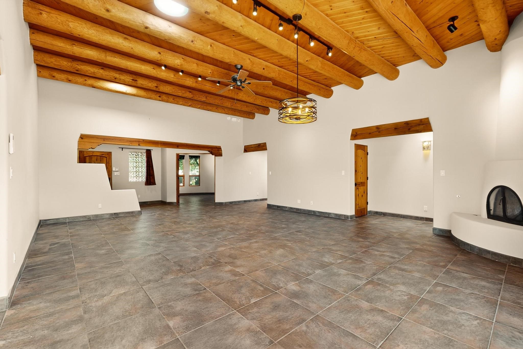 Priced to Sell! Potential multigenerational living. Expansive contemporary pueblo, split bedroom open plan design with high ceilings throughout. The main home includes a formal dining area, spacious great room with kiva fireplace, a large primary suite with kiva fireplace, large walk in closet and spa-like bathroom. Excellent separation from the two guest bedrooms and bath, plus a den/study. The kitchen has been remodeled including an induction range top, custom lighted cabinetry and 2 pantries. The radiant heating is supplemented by 5 mini splits to keep a comfortable temperature summer and winter. There is a large heated storage room/workroom for hobbies and toys plus an oversized 2 car garage with extra storage. Behind the home sits a detached 478 sq.ft. heated 2 room studio/guest with a 3/4 bathroom for extra guests/office or studio with a separate septic system. A lovely walled garden with a 3rd kiva fireplace for enjoyment plus a large portal for morning or evening outside entertainment. Enjoy the historic railway and rail trail bordering the back of your land. Plenty of guest parking with a paved driveway and easy access to Eldorado amenities, local shopping only minutes into Santa Fe.