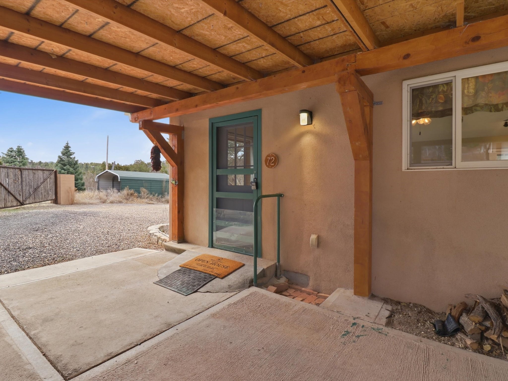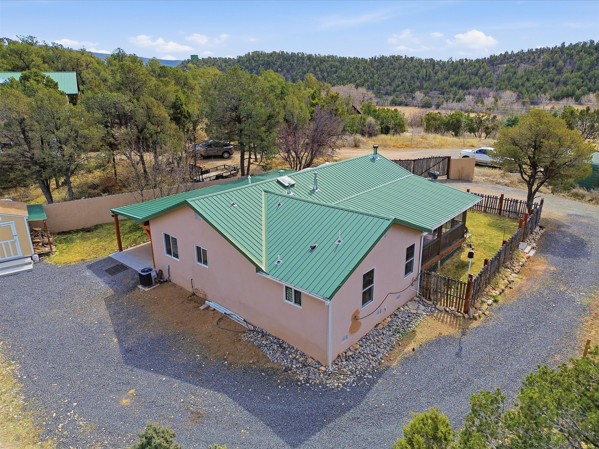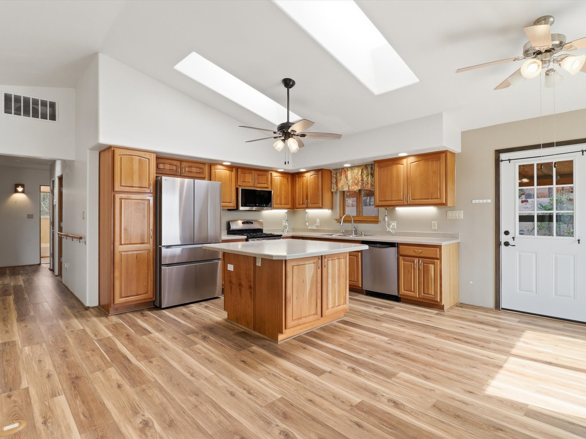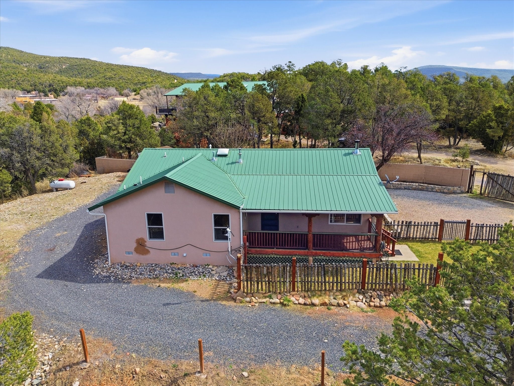 Step into this charming 3-bedroom, 2-bath single-level home, built in 2006, perfectly designed for comfort, style, and ease of living. From the moment you arrive, the spacious facade with a covered portal welcomes you inside.Enjoy the open-concept living area, where the vaulted ceiling, skylights, and abundant windows fill the space with natural light. The living room features a wood stove and flows seamlessly into the kitchen with ample cabinets, island breakfast counter, and all stainless-steel appliances.Step through the living area exit door to the covered patio, which overlooks the side yard, providing a relaxing outdoor space. A short walk leads to the Pecos River, whose soothing sounds can be enjoyed from the home. Additional features include laminate flooring, exterior storage, and a Propanel roof. The primary suite offers a spacious walk-in closet and an ensuite bath with his & her sinks and a glass-enclosed shower. With bright, inviting interiors and all living spaces on one level, this home offers comfort, convenience, and a touch of Santa Fe charm. A must-see at this price and condition!