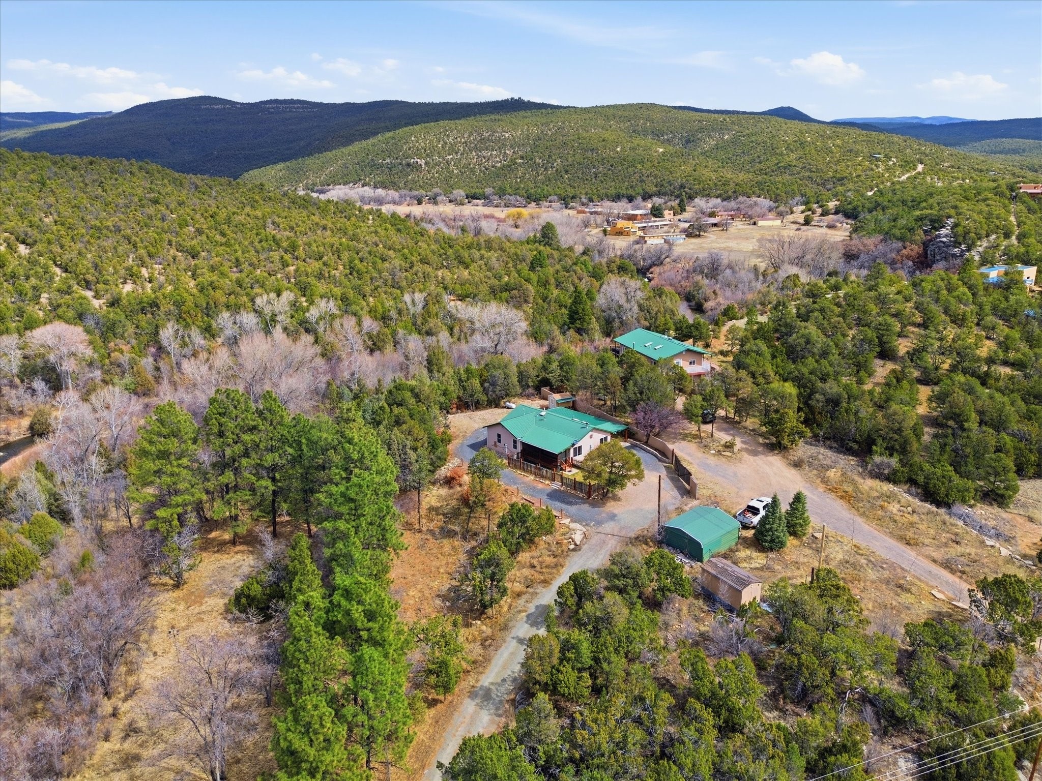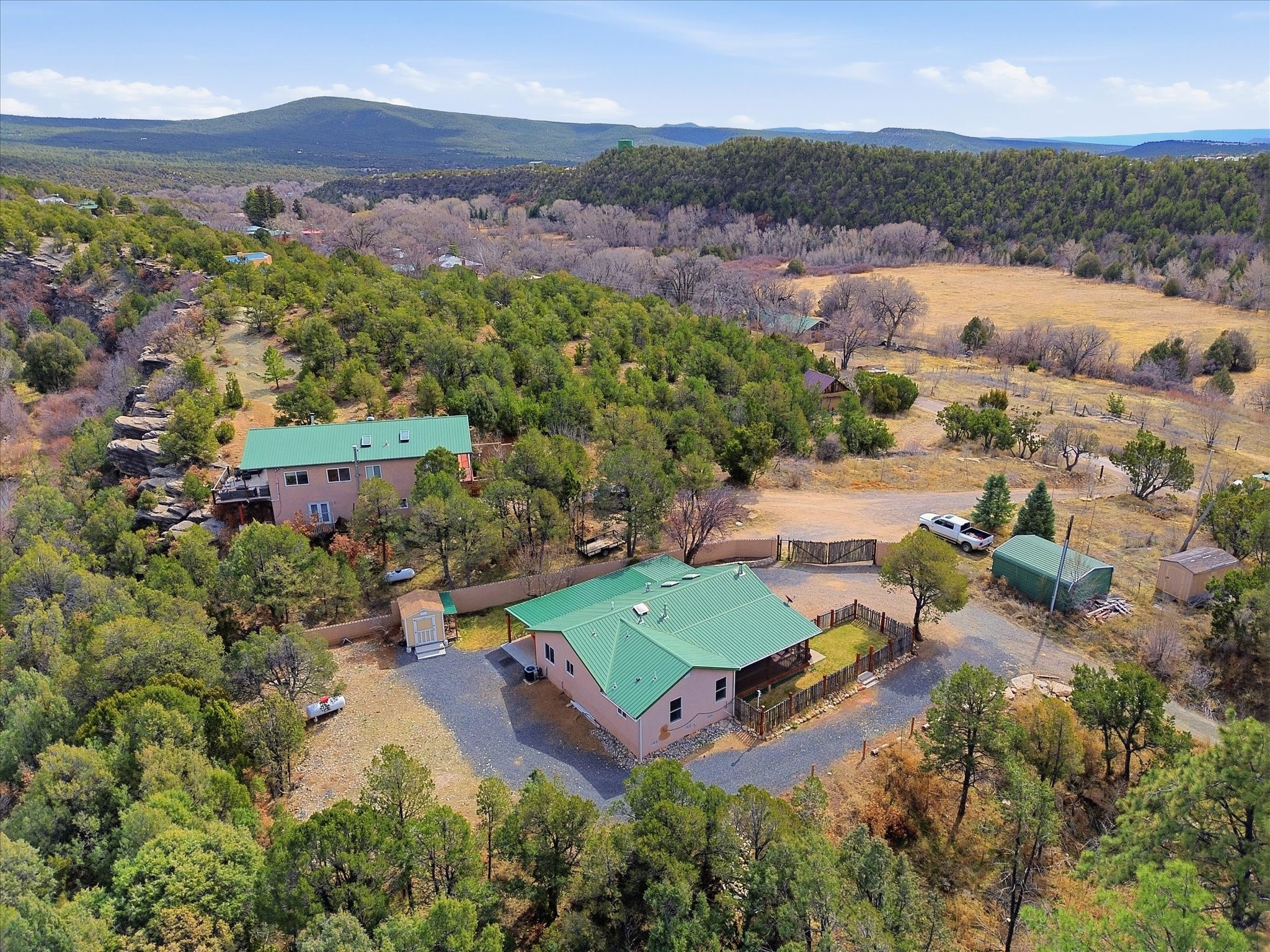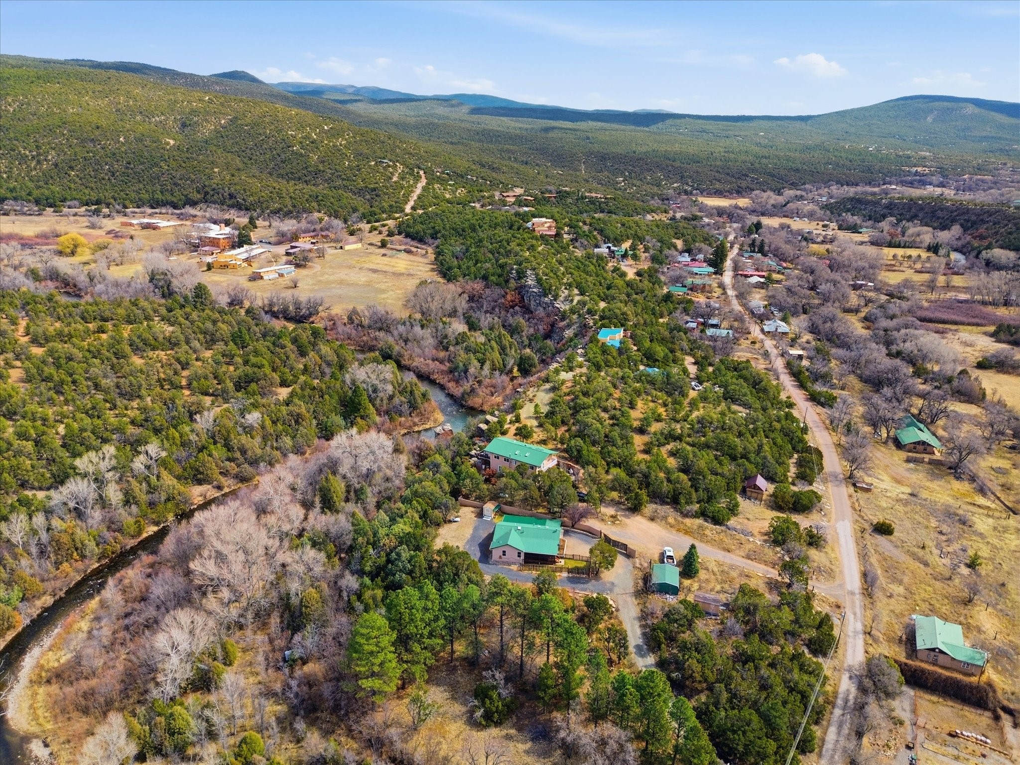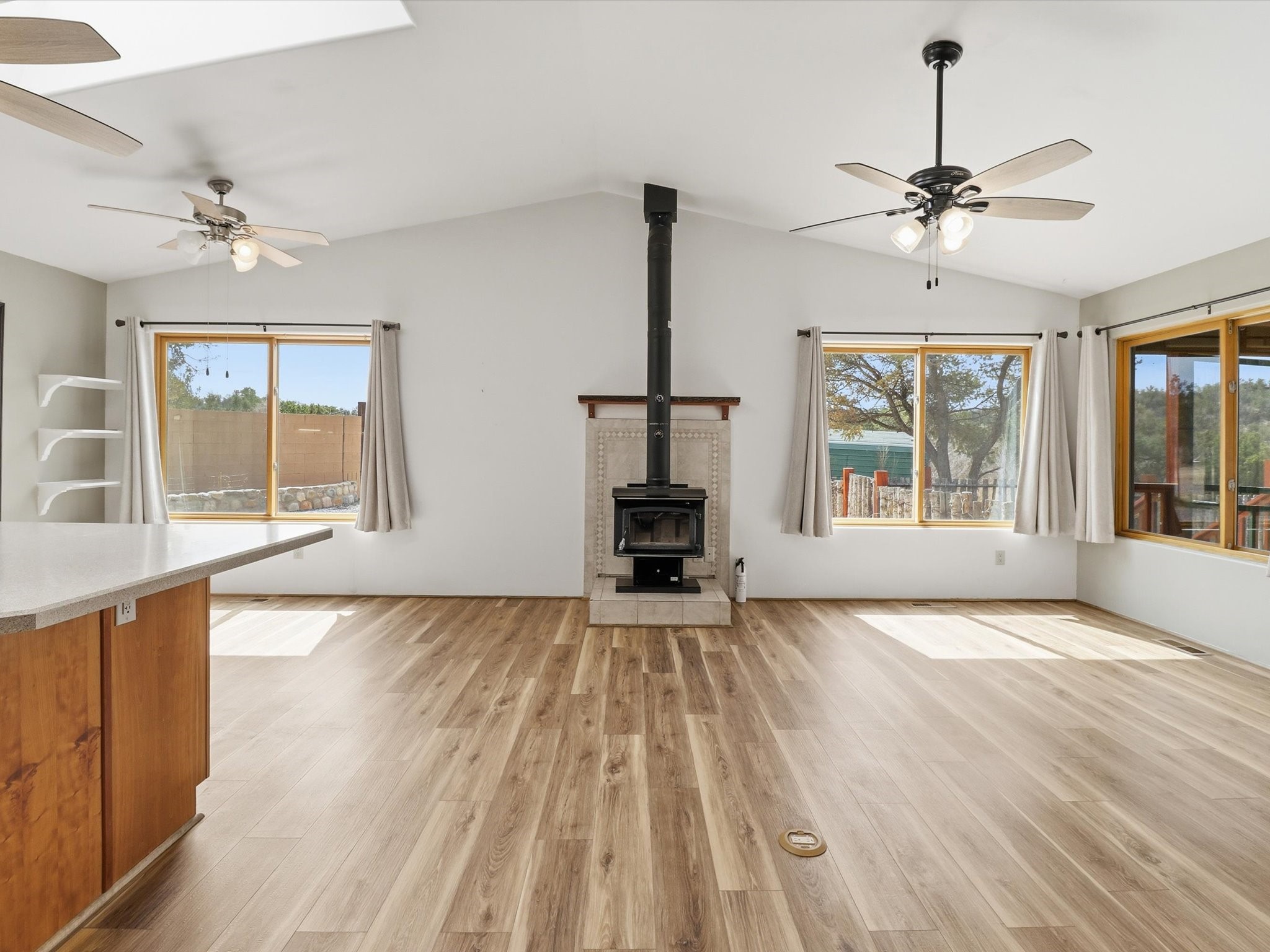 Step into this charming 3-bedroom, 2-bath single-level home, built in 2006, perfectly designed for comfort, style, and ease of living. From the moment you arrive, the spacious facade with a covered portal welcomes you inside.Enjoy the open-concept living area, where the vaulted ceiling, skylights, and abundant windows fill the space with natural light. The living room features a wood stove and flows seamlessly into the kitchen with ample cabinets, island breakfast counter, and all stainless-steel appliances.Step through the living area exit door to the covered patio, which overlooks the side yard, providing a relaxing outdoor space. A short walk leads to the Pecos River, whose soothing sounds can be enjoyed from the home. Additional features include laminate flooring, exterior storage, and a Propanel roof. The primary suite offers a spacious walk-in closet and an ensuite bath with his & her sinks and a glass-enclosed shower. With bright, inviting interiors and all living spaces on one level, this home offers comfort, convenience, and a touch of Santa Fe charm. A must-see at this price and condition!