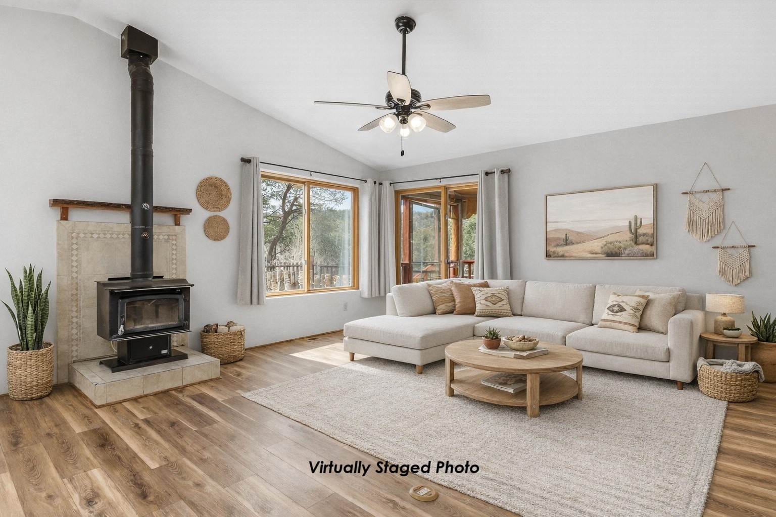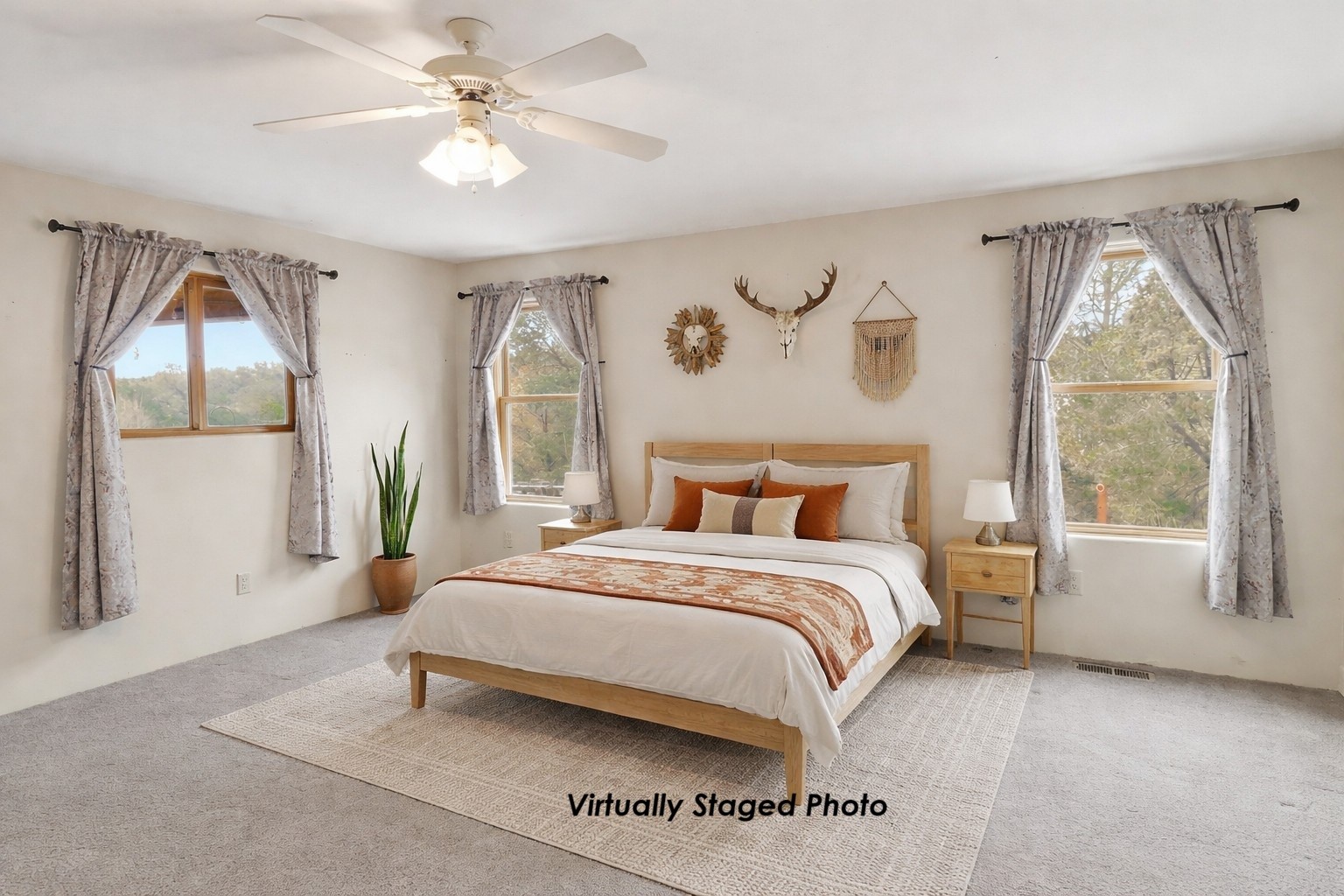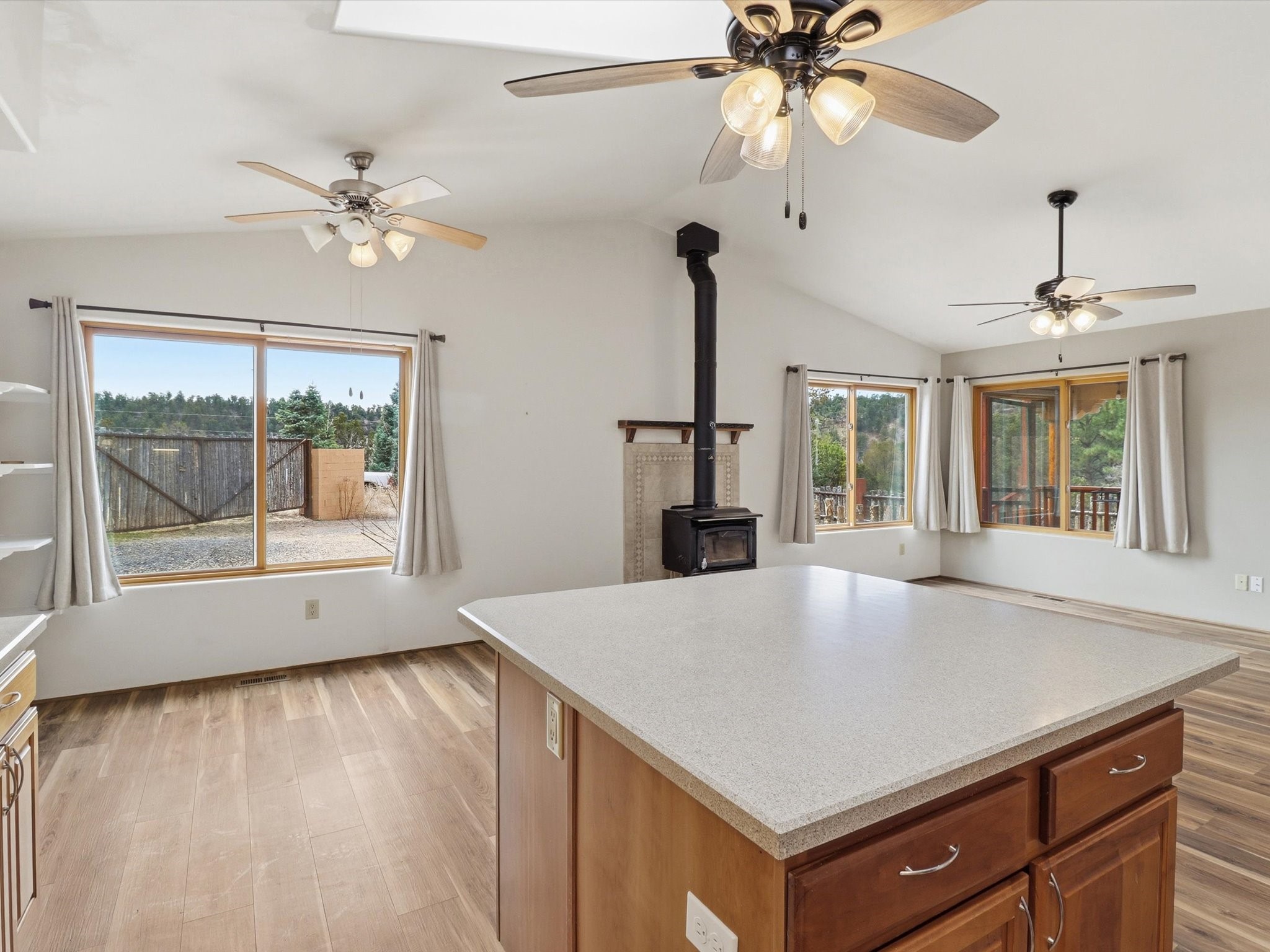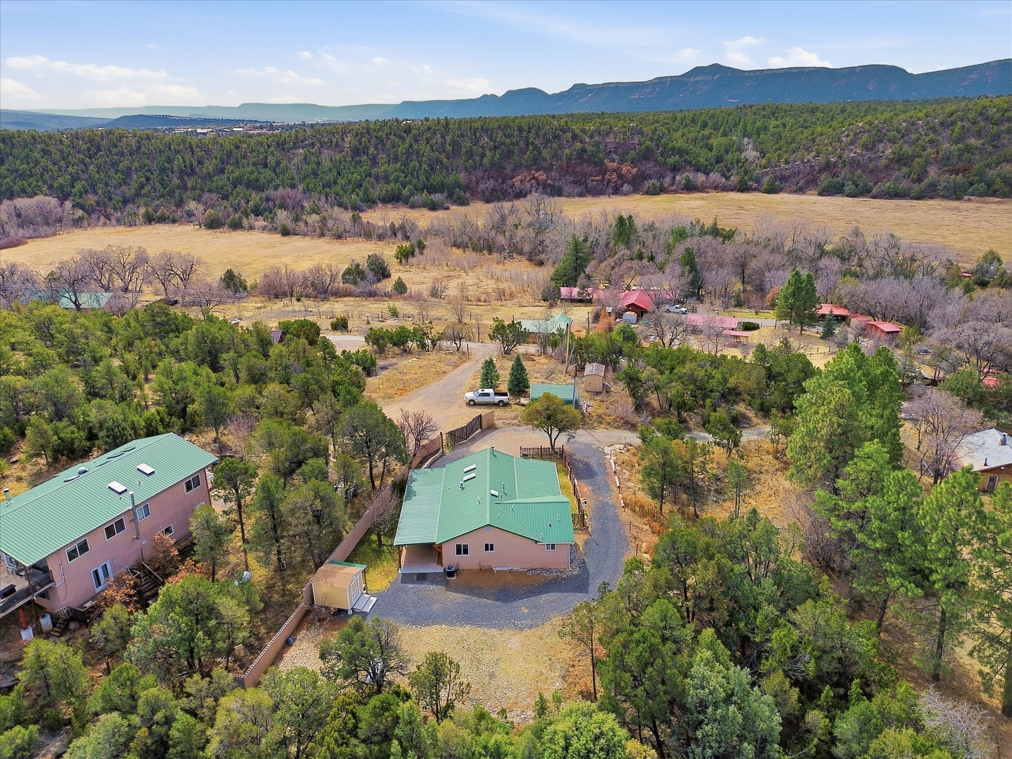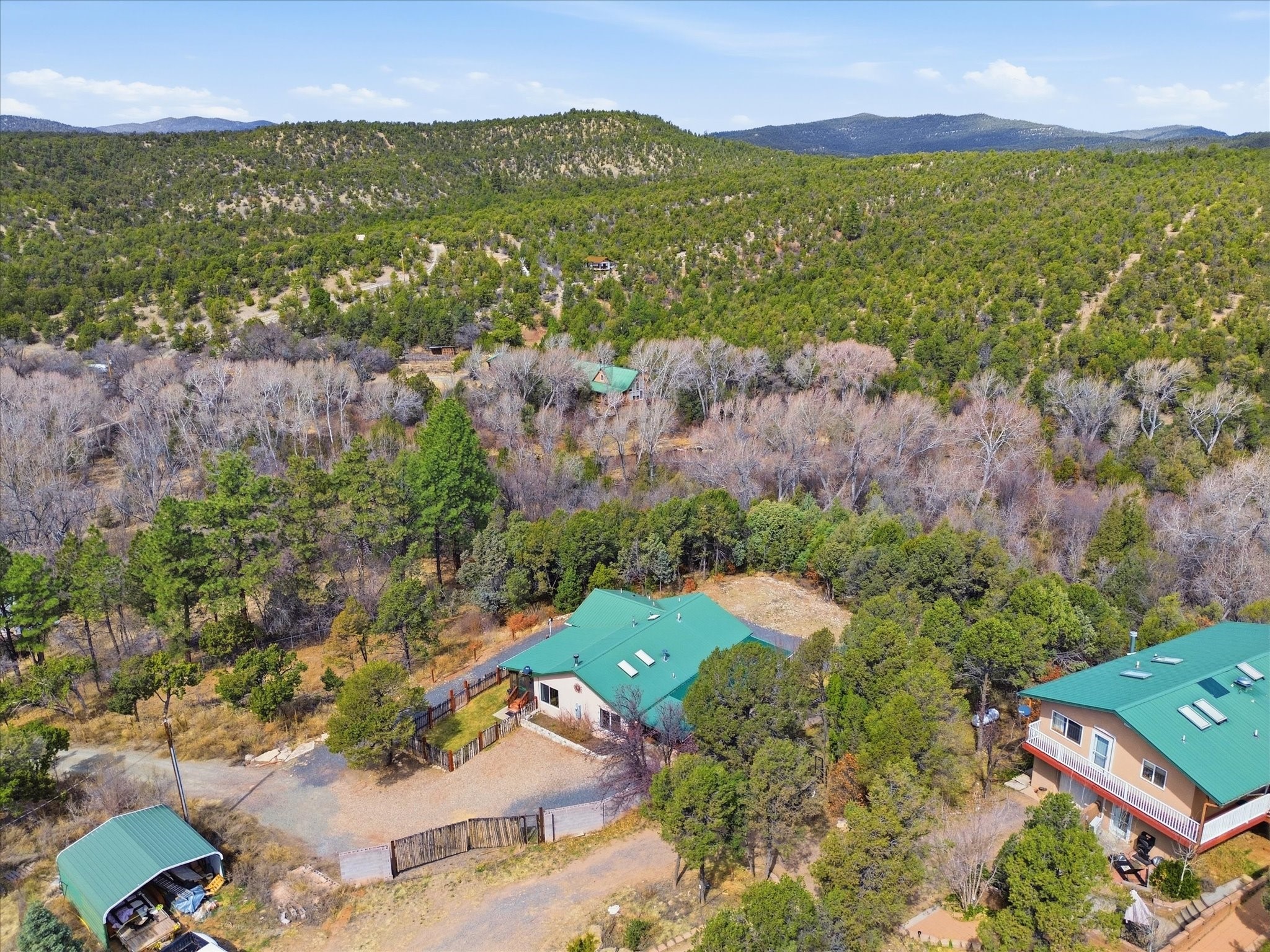 Step into this charming 3-bedroom, 2-bath single-level home, built in 2006, perfectly designed for comfort, style, and ease of living. From the moment you arrive, the spacious facade with a covered portal welcomes you inside.Enjoy the open-concept living area, where the vaulted ceiling, skylights, and abundant windows fill the space with natural light. The living room features a wood stove and flows seamlessly into the kitchen with ample cabinets, island breakfast counter, and all stainless-steel appliances.Step through the living area exit door to the covered patio, which overlooks the side yard, providing a relaxing outdoor space. A short walk leads to the Pecos River, whose soothing sounds can be enjoyed from the home. Additional features include laminate flooring, exterior storage, and a Propanel roof. The primary suite offers a spacious walk-in closet and an ensuite bath with his & her sinks and a glass-enclosed shower. With bright, inviting interiors and all living spaces on one level, this home offers comfort, convenience, and a touch of Santa Fe charm. A must-see at this price and condition!