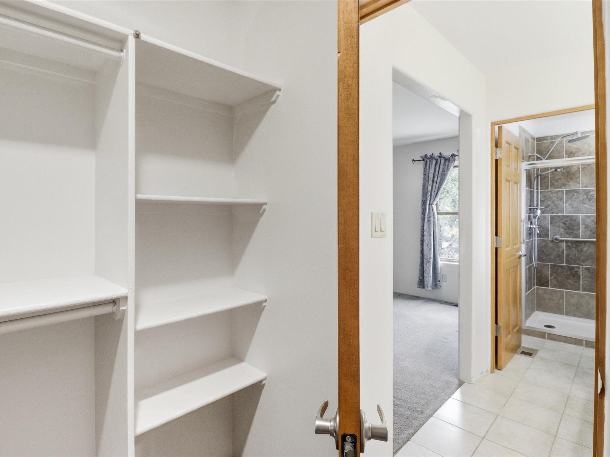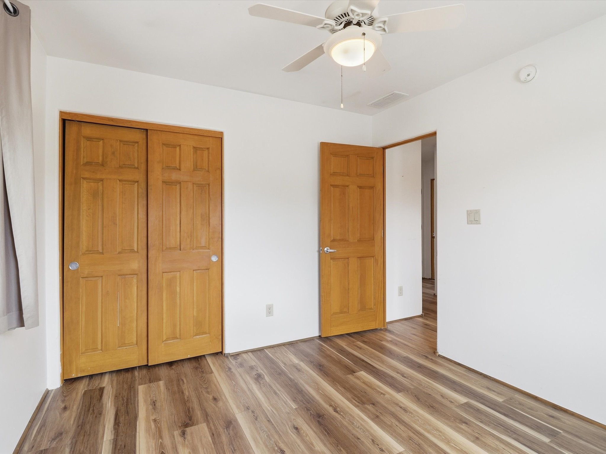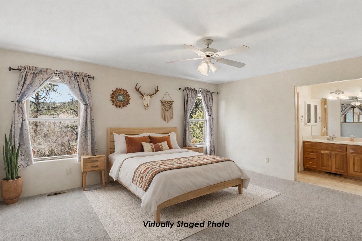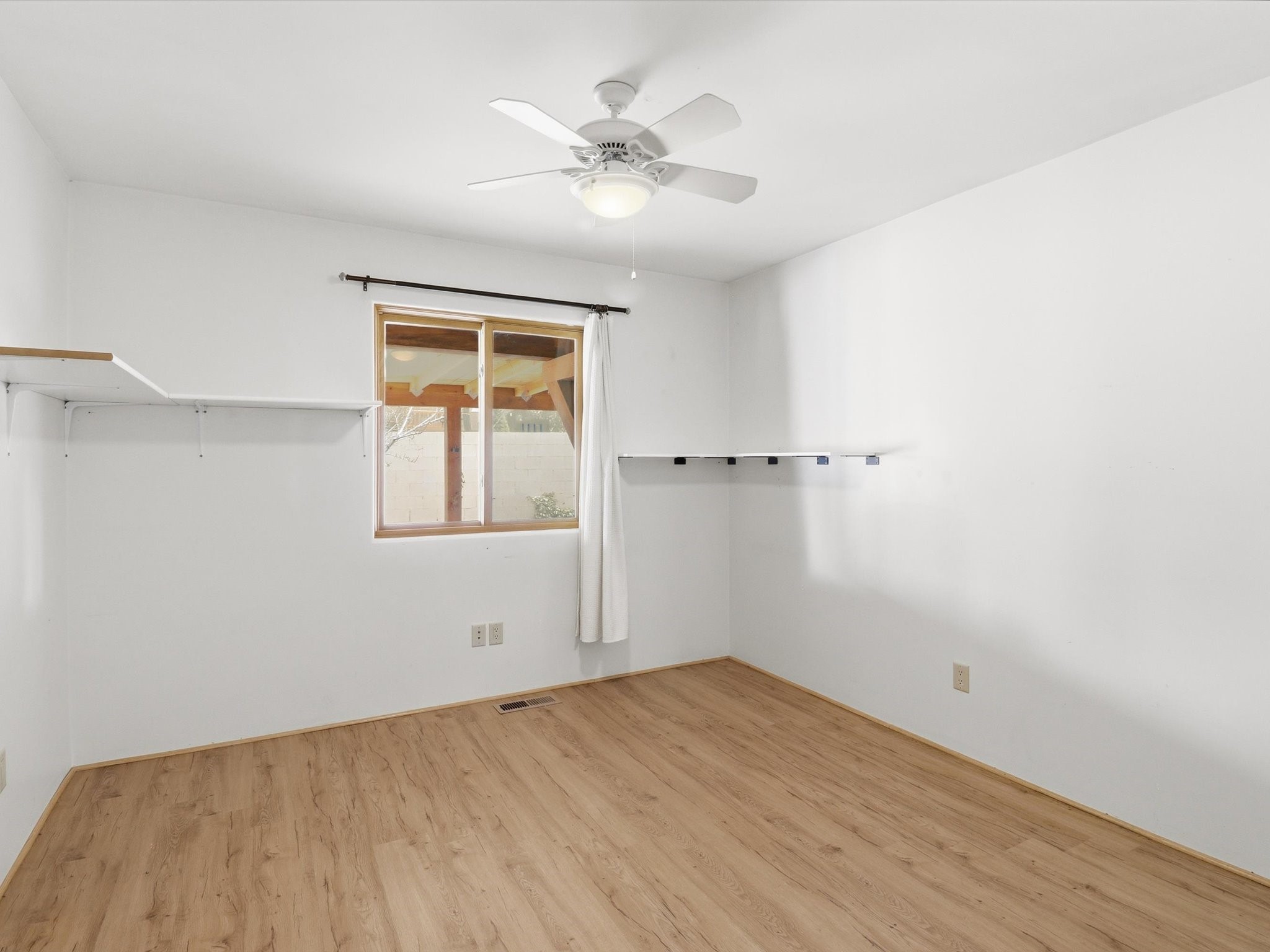 Step into this charming 3-bedroom, 2-bath single-level home, built in 2006, perfectly designed for comfort, style, and ease of living. From the moment you arrive, the spacious facade with a covered portal welcomes you inside.Enjoy the open-concept living area, where the vaulted ceiling, skylights, and abundant windows fill the space with natural light. The living room features a wood stove and flows seamlessly into the kitchen with ample cabinets, island breakfast counter, and all stainless-steel appliances.Step through the living area exit door to the covered patio, which overlooks the side yard, providing a relaxing outdoor space. A short walk leads to the Pecos River, whose soothing sounds can be enjoyed from the home. Additional features include laminate flooring, exterior storage, and a Propanel roof. The primary suite offers a spacious walk-in closet and an ensuite bath with his & her sinks and a glass-enclosed shower. With bright, inviting interiors and all living spaces on one level, this home offers comfort, convenience, and a touch of Santa Fe charm. A must-see at this price and condition!