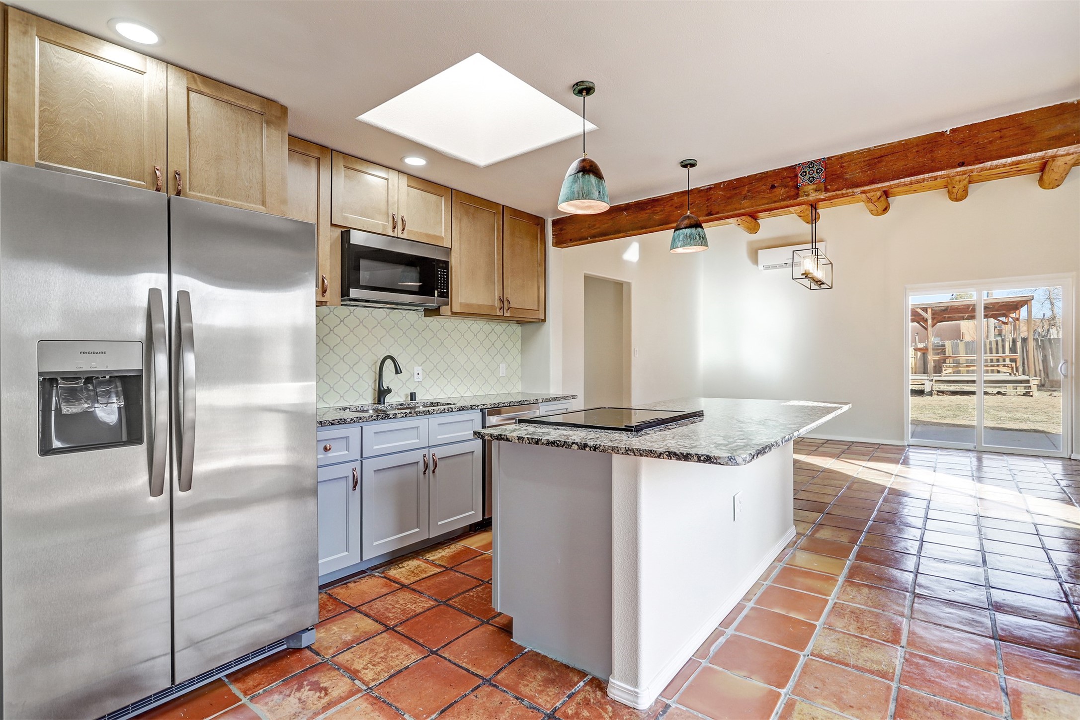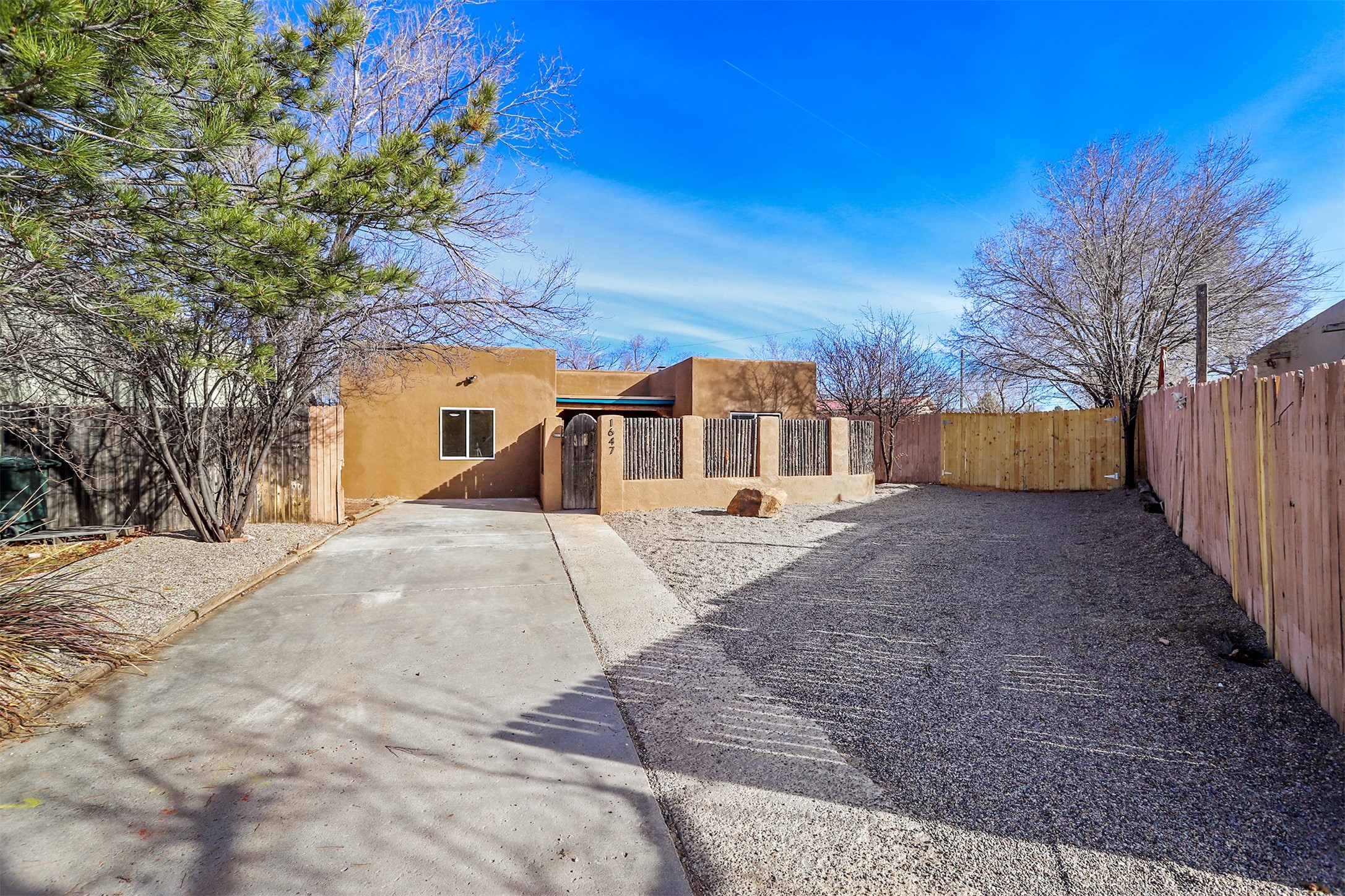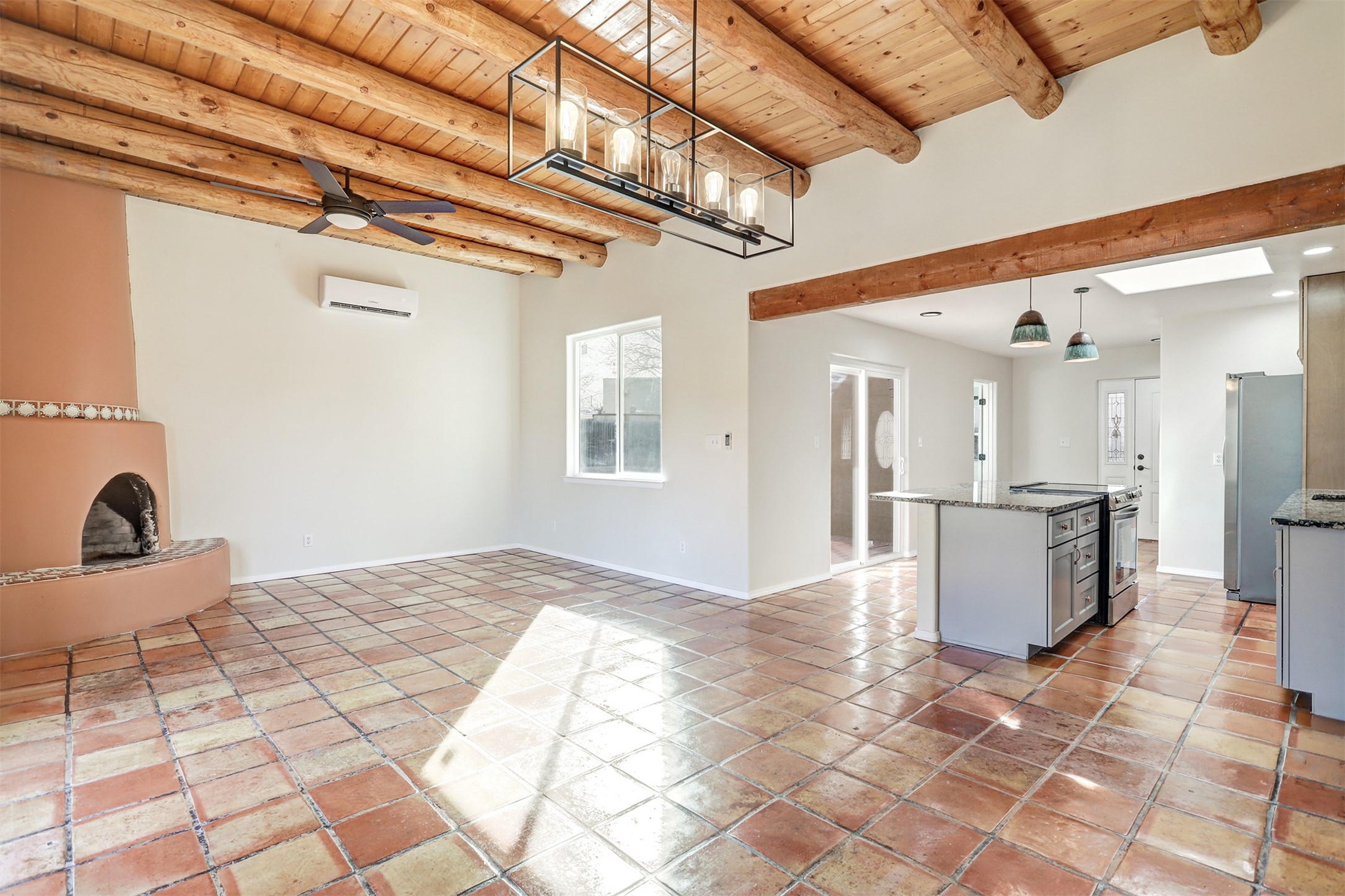 Welcome to this beautifully updated Santa Fe home, where classic Southwestern charm meets modern comfort. Perfectly situated in a central and well-connected area, this property offers easy access to shopping, dining, trails, and everyday amenities while maintaining a peaceful residential feel. A nearby park makes this an ideal setting for evening walks, outdoor enjoyment, and taking in Santa Fe's stunning sunsets. Inside, the thoughtfully designed layout features four spacious bedrooms and inviting living areas ideal for both entertaining and everyday living. The stunning kiva fireplace serves as a warm focal point, adding authentic character and cozy ambiance during cooler months. Saltillo tile flooring in select areas, combined with fresh interior and exterior paint, creates a bright, refreshed atmosphere with timeless Southwestern appeal. The updated kitchen is ready for all your culinary adventures, featuring new countertops, new cabinetry, and new stainless steel appliances. Remodeled bathrooms, updated light fixtures, and new carpet in the bedrooms enhance comfort and livability throughout the home. A new mini-split heating and cooling system installed on 11/2025 provides efficient, year-round climate control, and the home features a newer modified bitumen roof. Set on a generously sized lot, the expansive backyard offers convenient backyard access and excellent flexibility--perfect for outdoor entertaining, gardening, additional parking, or creating your own private retreat. With its thoughtful updates, abundant outdoor space, and desirable location near parks and amenities, this move-in-ready Santa Fe home is a wonderful opportunity to enjoy comfort, character, and convenience all in one.
