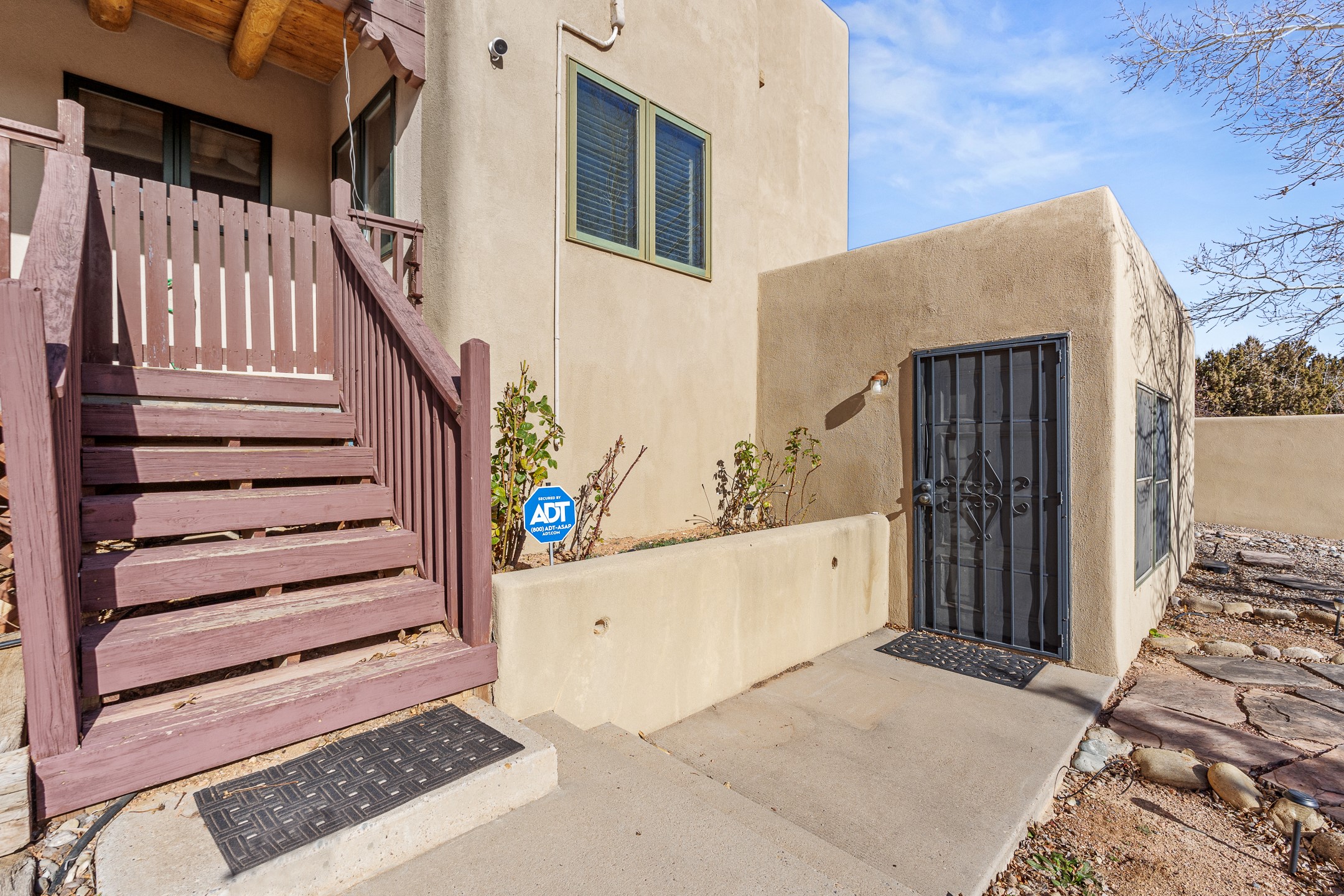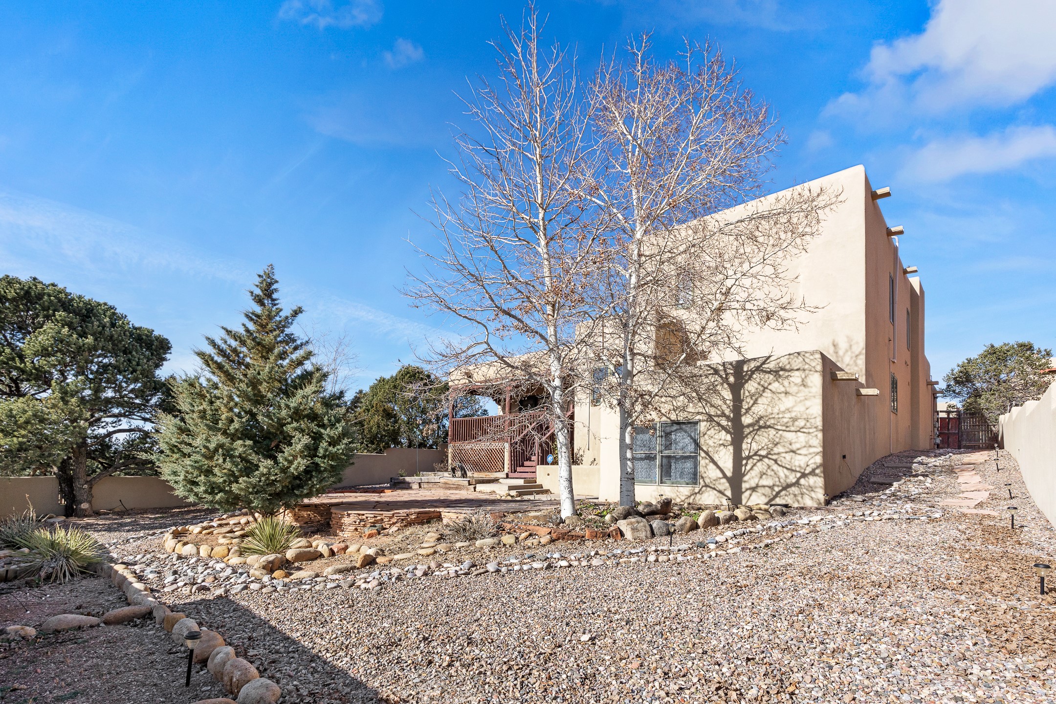 Custom home located in the sought-after Pueblos de Sol subdivision, offering comfortable living and sweeping sunrise andsunset views. Situated on a nicely sized corner lot, this home features a covered portal and rear deck--perfect for relaxingand enjoying the scenery. The kitchen showcases newer cabinetry, stainless steel appliances, granite countertops, and acoordinating backsplash. A formal dining room and a separate breakfast nook provide flexible dining options. ClassicSouthwestern details shine throughout, including tongue-and-groove ceilings with vigas and a Kiva fireplace. The oversized primary bedroom offers a true retreat, complete with a spa-like en suite bathroom featuring a standalone soaking tub, separate shower, and access to a private deck. Recent upgrades include a TPO roof installed in 2022 and a new boiler for radiant heating installed in 2024. Year-round comfort is ensured with five mini-split systems. Outdoor spaces include a charming landscaped courtyard with flagstone, mature trees, drip irrigation, and a pet-friendly layout. The rear deck is ideal for outdoor entertaining. The property backs to a walking trail, with a community park conveniently located across the street. A separate-entry studio/guesthouse with a full bath completes this exceptional offering--perfect for guests or rental income potential.