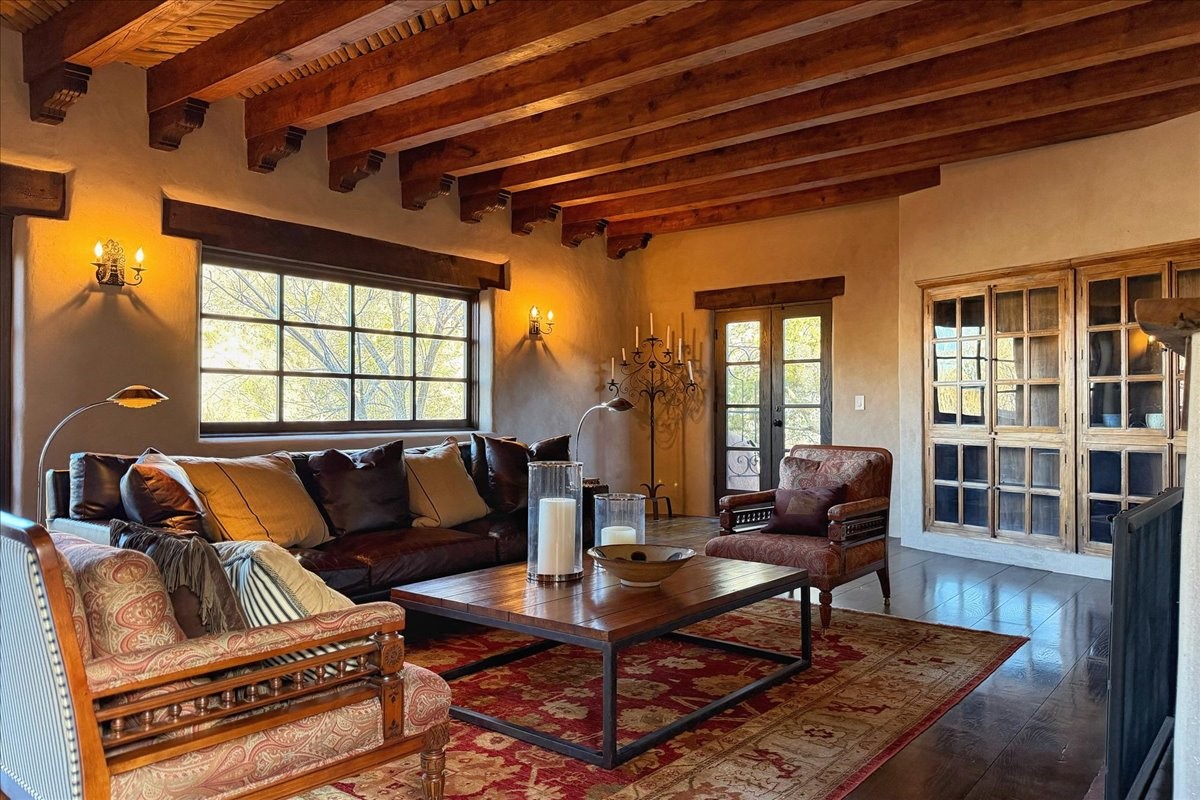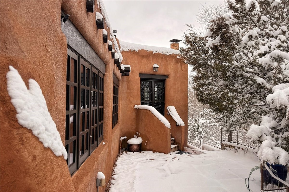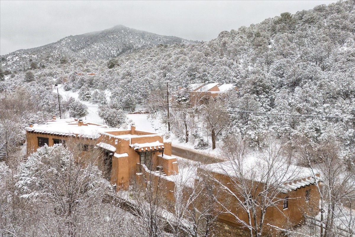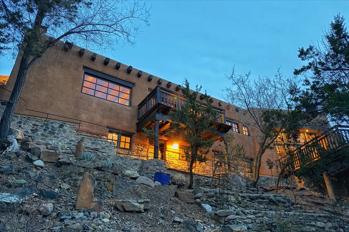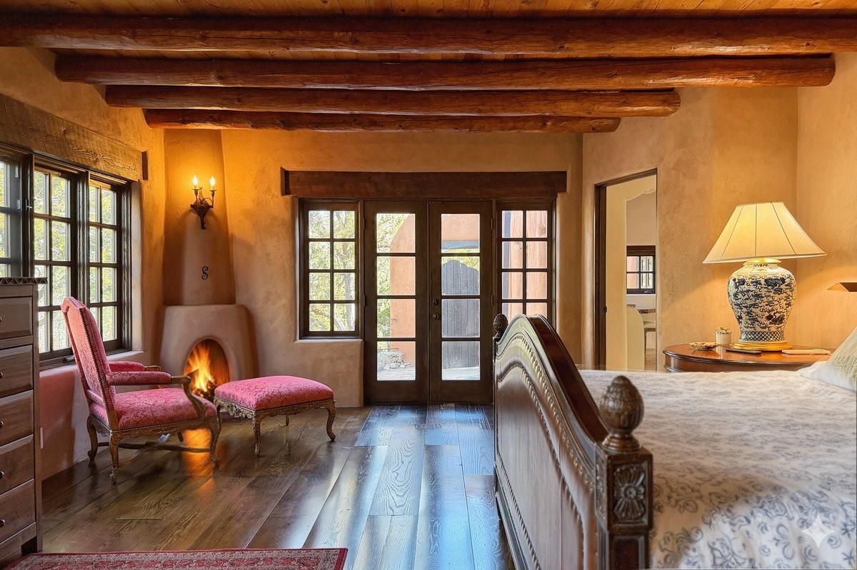 Discover Las Crucitas, a fully restored 1950s Santa Fe adobe blending timeless Southwestern charm with modern luxury, ideally located on coveted Upper Canyon Road in the Historic East Side. This remarkable property offers four bedrooms and four bathrooms (two full, one three-quarter, and one half) within 4,258 square feet of refined living space. A 492-square-foot attached casita, detached two-car garage, and over 200 linear feet of Santa Fe River frontage creates a rare and private setting. The upper level features a beautifully appointed chef's kitchen with top-of-the-line appliances, custom hood, two dishwashers, quartz countertops, custom Ernest Thompson cabinetry, and travertine floors. A spacious great room showcases classic Santa Fe details including columns, vigas with corbels, latillas, and wide-plank oak floors, American clay and plaster walls. Three sets of French doors open to a serene interior courtyard, while an additional set leads to a balcony ideal for sunset views. Also on the upper level are a guest suite with a three-quarter bath and an elegant owner's suite featuring two corner kiva wood-burning fireplaces, a luxurious en-suite full bath with mosaic tile shower and travertine floors, a walk-in closet with custom built-ins, and French doors opening to the outdoor area. The lower level offers a media area with custom Ernest Thompson cabinetry, a study nook, an additional guest bedroom with exposed rock walls, a powder room, and a three-quarter bath. The attached casita includes a wood-burning kiva fireplace, kitchenette, and full bath ideal for guests. Outdoor spaces include a back deck, a floating terrace with sunset views, and a flagstone path with direct river access. Additional features include in-floor radiant heat, 6 fireplaces, a rock garden, and a dog run with room to expand. Las Crucitas is a rare opportunity to own a property that seldom changes hands--just minutes from Canyon Road's galleries and restaurants and the Santa Fe Plaza.