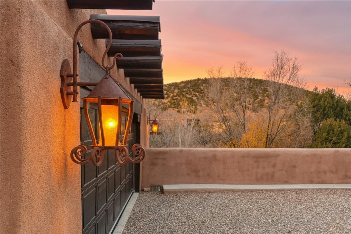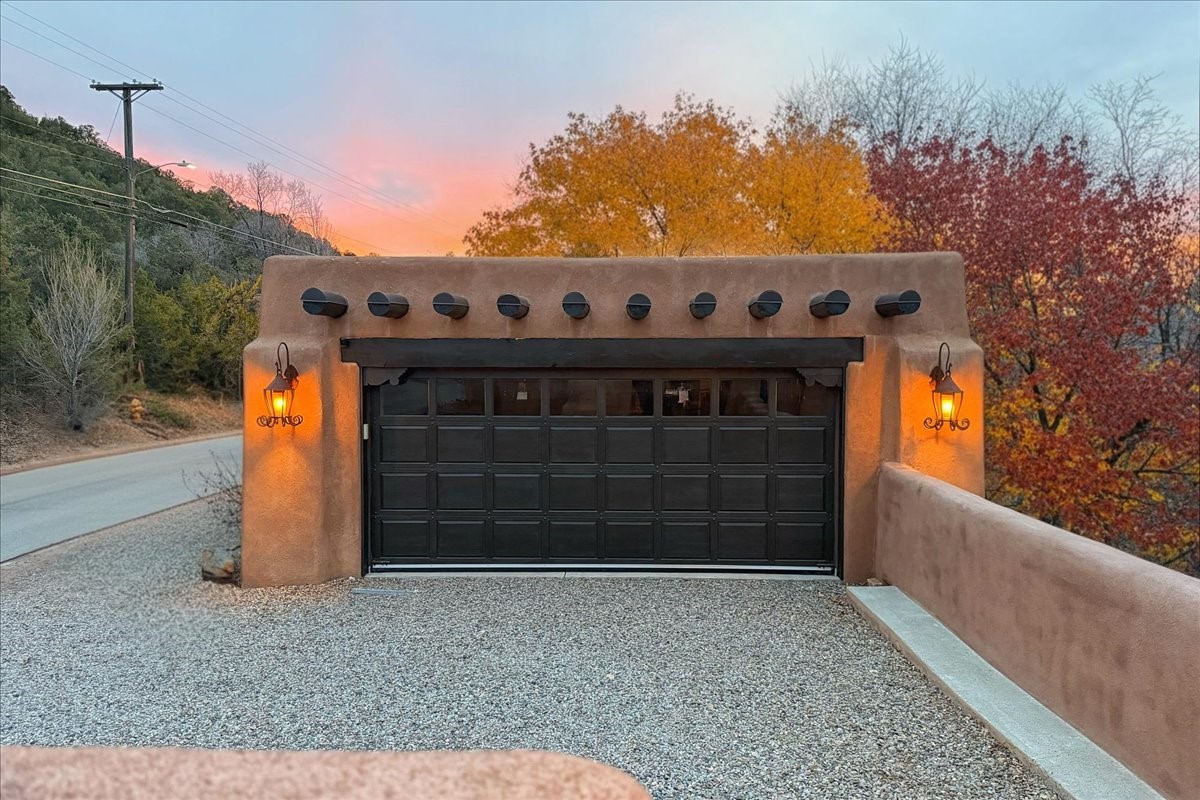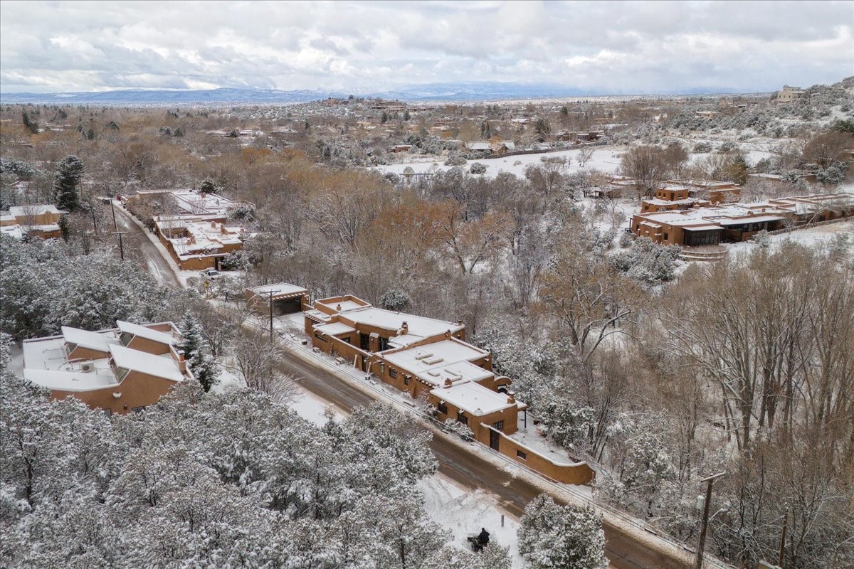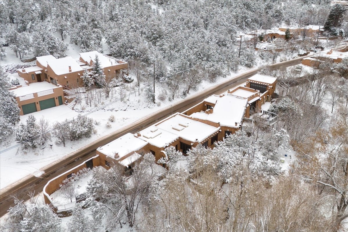 Discover Las Crucitas, a fully restored 1950s Santa Fe adobe blending timeless Southwestern charm with modern luxury, ideally located on coveted Upper Canyon Road in the Historic East Side. This remarkable property offers four bedrooms and four bathrooms (two full, one three-quarter, and one half) within 4,258 square feet of refined living space. A 492-square-foot attached casita, detached two-car garage, and over 200 linear feet of Santa Fe River frontage creates a rare and private setting. The upper level features a beautifully appointed chef's kitchen with top-of-the-line appliances, custom hood, two dishwashers, quartz countertops, custom Ernest Thompson cabinetry, and travertine floors. A spacious great room showcases classic Santa Fe details including columns, vigas with corbels, latillas, and wide-plank oak floors, American clay and plaster walls. Three sets of French doors open to a serene interior courtyard, while an additional set leads to a balcony ideal for sunset views. Also on the upper level are a guest suite with a three-quarter bath and an elegant owner's suite featuring two corner kiva wood-burning fireplaces, a luxurious en-suite full bath with mosaic tile shower and travertine floors, a walk-in closet with custom built-ins, and French doors opening to the outdoor area. The lower level offers a media area with custom Ernest Thompson cabinetry, a study nook, an additional guest bedroom with exposed rock walls, a powder room, and a three-quarter bath. The attached casita includes a wood-burning kiva fireplace, kitchenette, and full bath ideal for guests. Outdoor spaces include a back deck, a floating terrace with sunset views, and a flagstone path with direct river access. Additional features include in-floor radiant heat, 6 fireplaces, a rock garden, and a dog run with room to expand. Las Crucitas is a rare opportunity to own a property that seldom changes hands--just minutes from Canyon Road's galleries and restaurants and the Santa Fe Plaza.