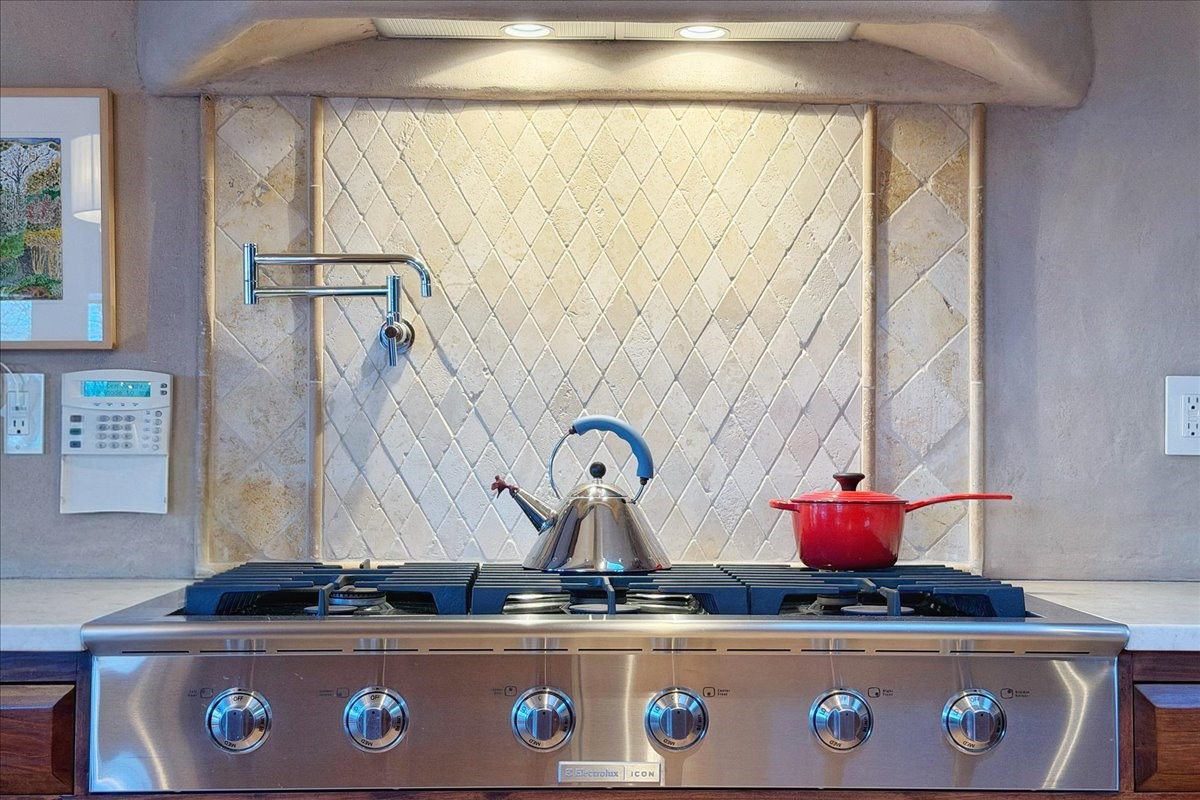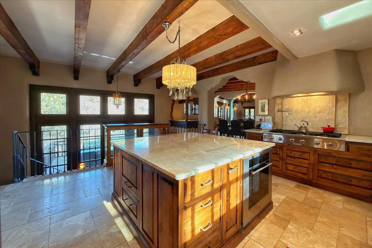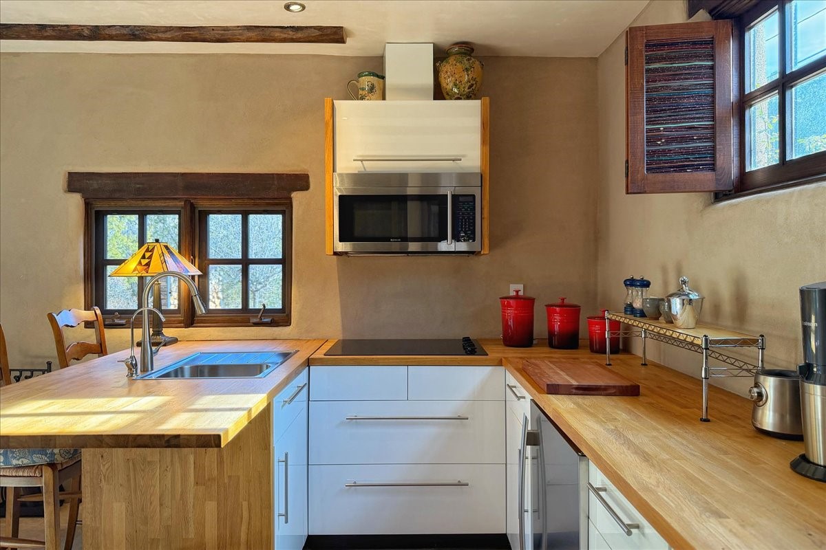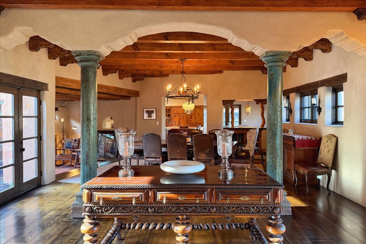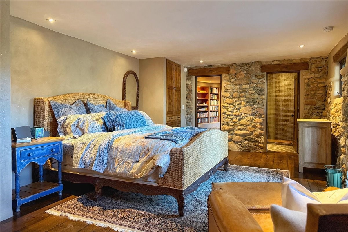 Discover Las Crucitas, a fully restored 1950s Santa Fe adobe blending timeless Southwestern charm with modern luxury, ideally located on coveted Upper Canyon Road in the Historic East Side. This remarkable property offers four bedrooms and four bathrooms (two full, one three-quarter, and one half) within 4,258 square feet of refined living space. A 492-square-foot attached casita, detached two-car garage, and over 200 linear feet of Santa Fe River frontage creates a rare and private setting. The upper level features a beautifully appointed chef's kitchen with top-of-the-line appliances, custom hood, two dishwashers, quartz countertops, custom Ernest Thompson cabinetry, and travertine floors. A spacious great room showcases classic Santa Fe details including columns, vigas with corbels, latillas, and wide-plank oak floors, American clay and plaster walls. Three sets of French doors open to a serene interior courtyard, while an additional set leads to a balcony ideal for sunset views. Also on the upper level are a guest suite with a three-quarter bath and an elegant owner's suite featuring two corner kiva wood-burning fireplaces, a luxurious en-suite full bath with mosaic tile shower and travertine floors, a walk-in closet with custom built-ins, and French doors opening to the outdoor area. The lower level offers a media area with custom Ernest Thompson cabinetry, a study nook, an additional guest bedroom with exposed rock walls, a powder room, and a three-quarter bath. The attached casita includes a wood-burning kiva fireplace, kitchenette, and full bath ideal for guests. Outdoor spaces include a back deck, a floating terrace with sunset views, and a flagstone path with direct river access. Additional features include in-floor radiant heat, 6 fireplaces, a rock garden, and a dog run with room to expand. Las Crucitas is a rare opportunity to own a property that seldom changes hands--just minutes from Canyon Road's galleries and restaurants and the Santa Fe Plaza.