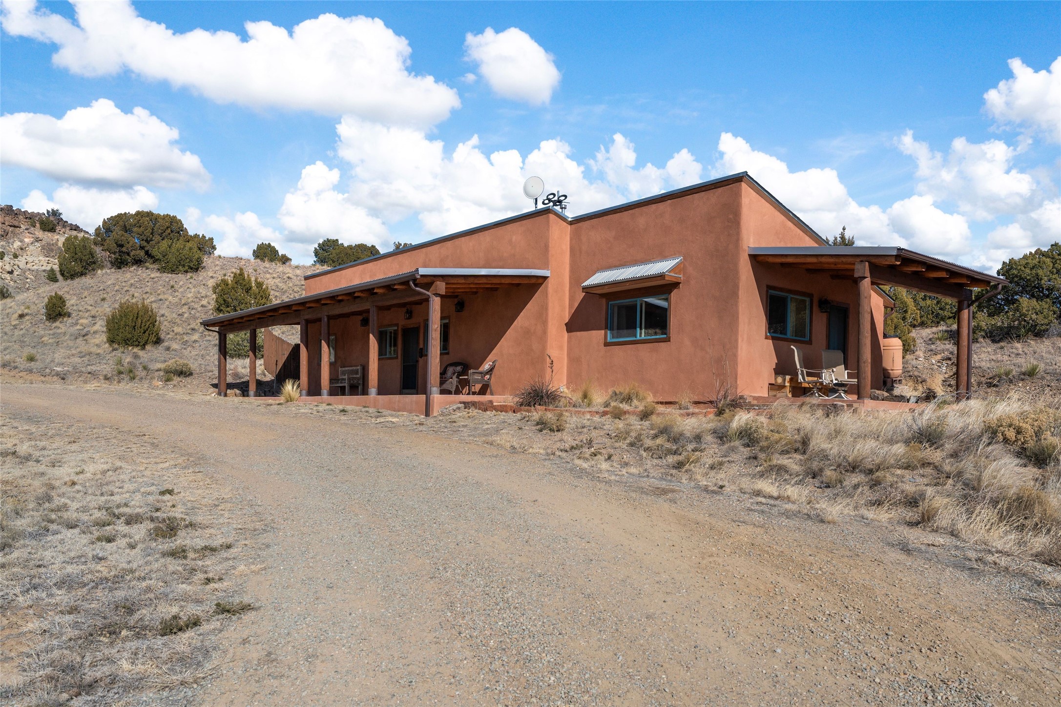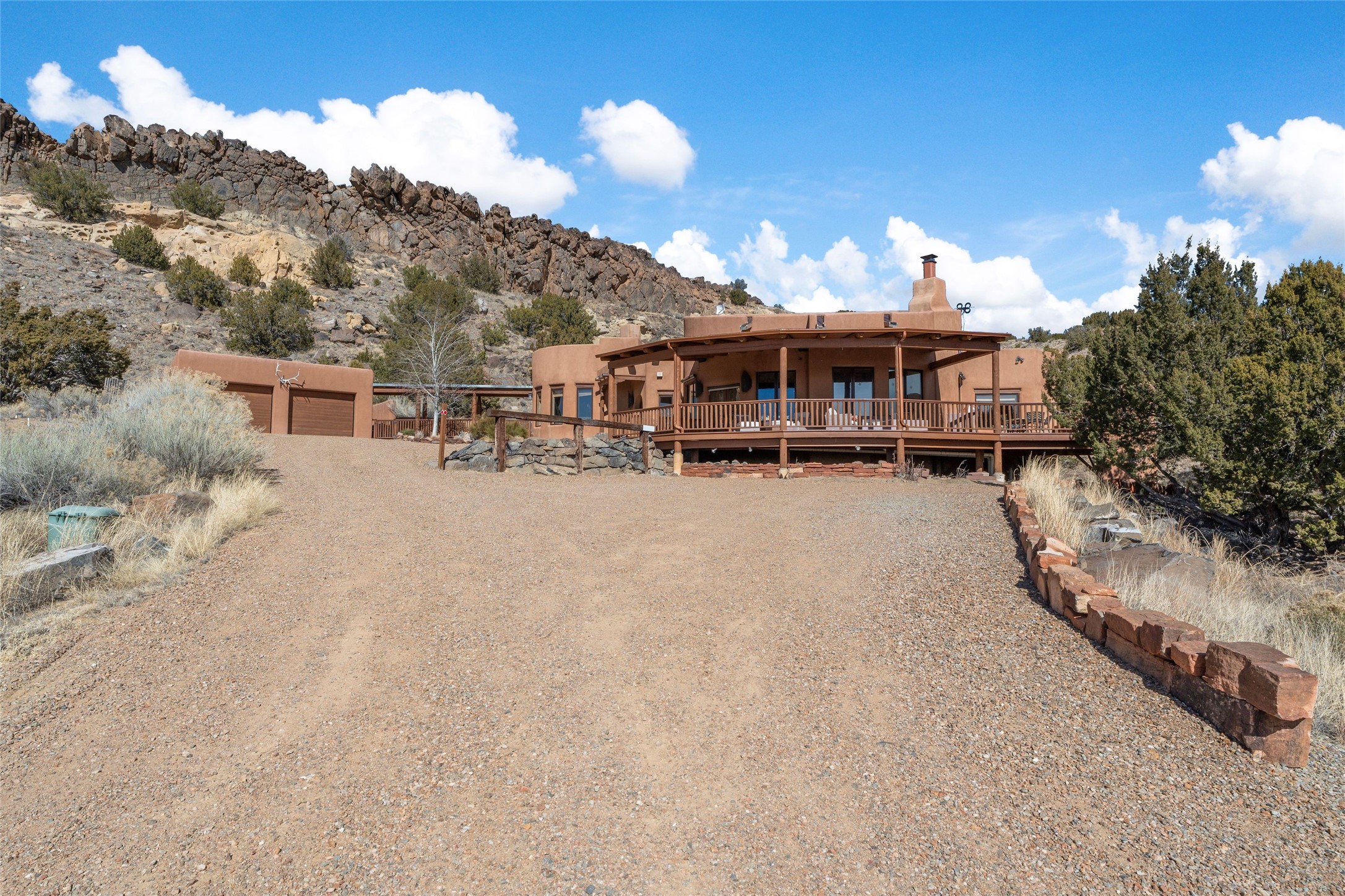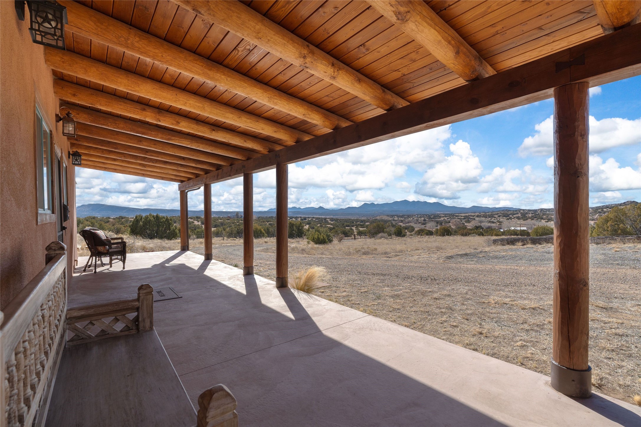 Beautiful home and guest house on eleven acres in the Galisteo basin offers panoramic views of the Ortiz mountains and the Cerro Pelon. The residence features a large living room with tall ceilings of vigas and herring-bone cedar latillas, plaster walls, wood floors, and lots of window looking out to the picturesque scenery. It's built in open concept with the dining area and kitchen, and it has access to a big portal and deck with a fireplace, creating enjoyable outdoor living space with great views. The floorplan also consists of three bedrooms, three bathrooms, and an office or den. There's a 200 square foot workshop/studio or storage room attached to the finished two-car garage. A separate and lovely two-bedroom guest house is fully functional and has a sizeable portal in front and another portal off one of the bedrooms, both with wonderful vistas. The acreage consists of three deeded lots. All just a short drive to shopping and services in the Eldorado area and not much further to Santa Fe. Fabulous northern New Mexico country living!