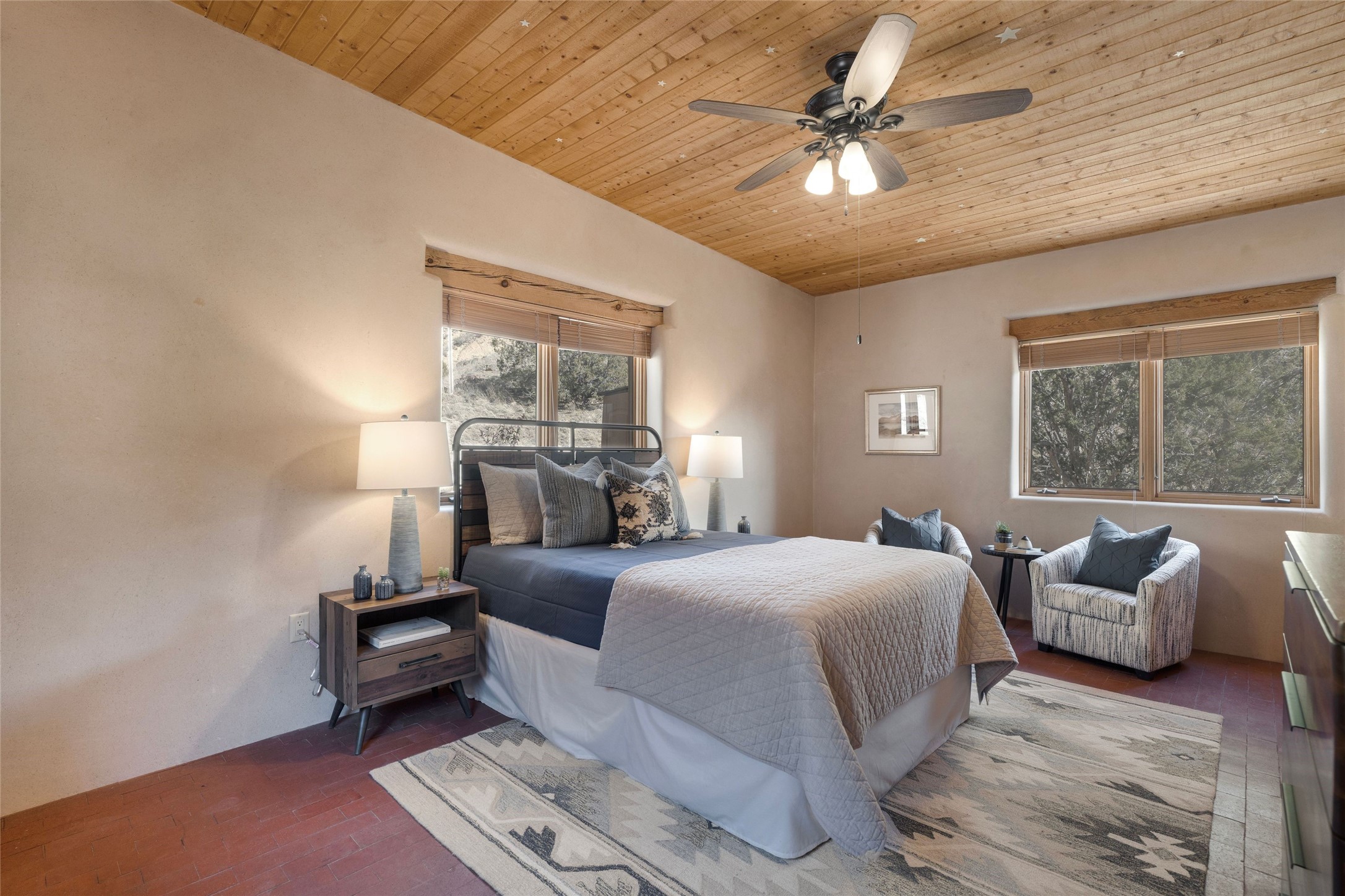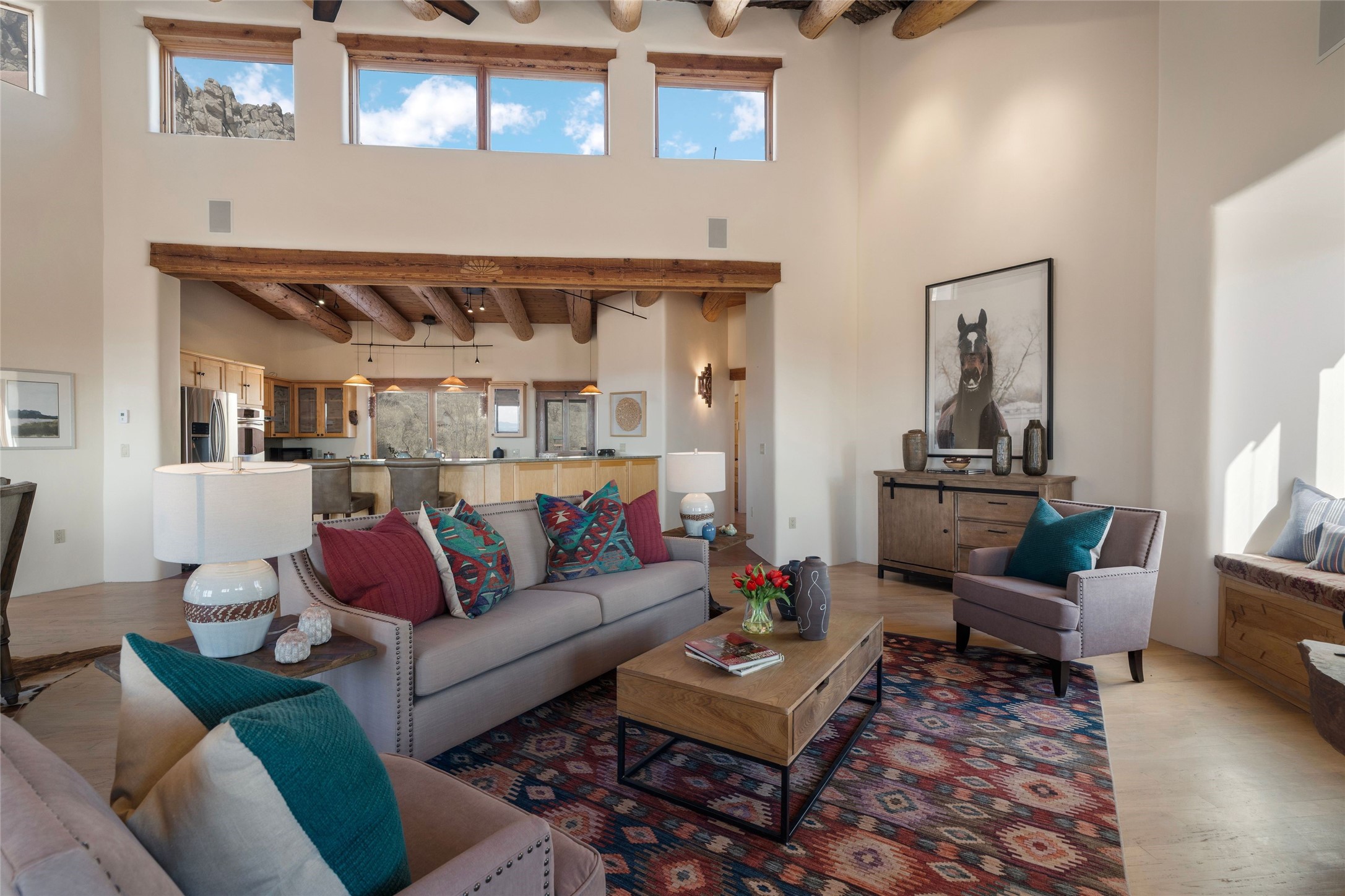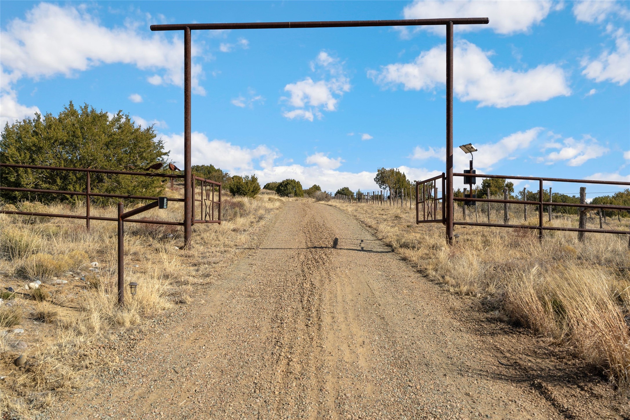 Beautiful home and guest house on eleven acres in the Galisteo basin offers panoramic views of the Ortiz mountains and the Cerro Pelon. The residence features a large living room with tall ceilings of vigas and herring-bone cedar latillas, plaster walls, wood floors, and lots of window looking out to the picturesque scenery. It's built in open concept with the dining area and kitchen, and it has access to a big portal and deck with a fireplace, creating enjoyable outdoor living space with great views. The floorplan also consists of three bedrooms, three bathrooms, and an office or den. There's a 200 square foot workshop/studio or storage room attached to the finished two-car garage. A separate and lovely two-bedroom guest house is fully functional and has a sizeable portal in front and another portal off one of the bedrooms, both with wonderful vistas. The acreage consists of three deeded lots. All just a short drive to shopping and services in the Eldorado area and not much further to Santa Fe. Fabulous northern New Mexico country living!