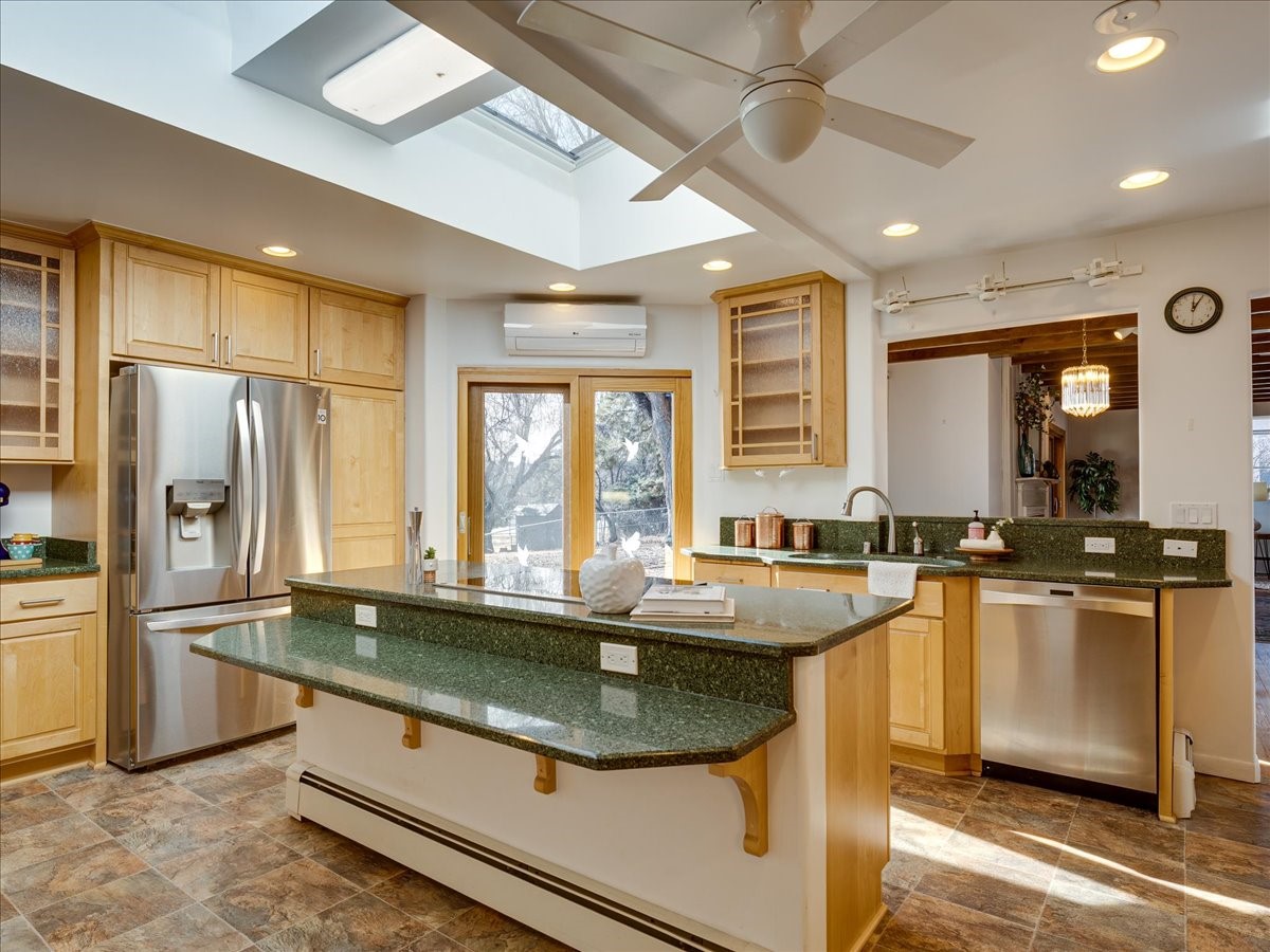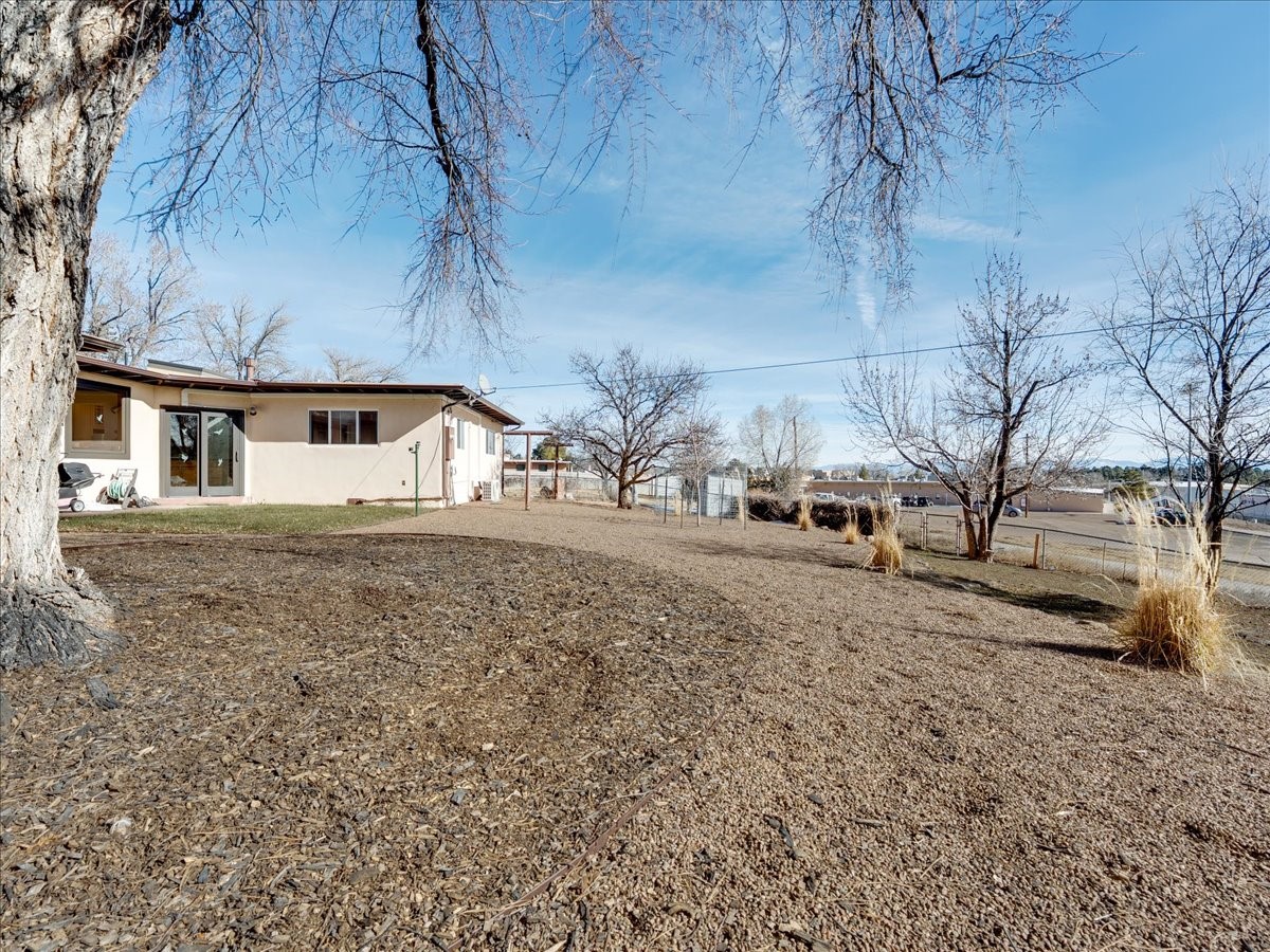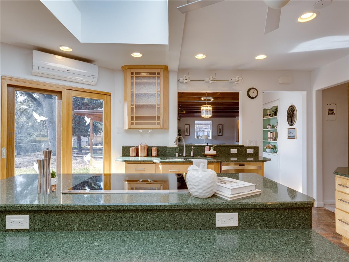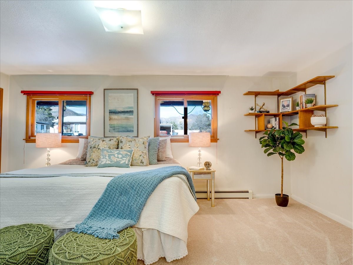 This charming Western Area home offers convenient access to bus stops, downtown, and the high school. While it retains the classic charm of Western Area homes, it has been thoughtfully updated to meet modern living needs. The original floor plan featured three bedrooms and one bathroom, but it has been reconfigured to create two spacious bedrooms, including a generous primary suite with a luxurious, updated bathroom. This area has new carpeting. In 2012, the kitchen underwent a major remodel and is truly a chef's delight, featuring an island with an induction cooktop, double ovens, and cabinetry equipped with pull-out organization drawers. Two built-in pantries provide exceptional storage, while two large skylights fill the space with natural light. The kitchen also offers direct access to the beautiful backyard, making it ideal for both everyday living and entertaining. The Zia Addition on the south side of the home added two additional bedrooms and a bathroom, providing flexible space for guests, family, or a home office. The backyard backs to Sullivan Field, allowing you to enjoy Friday Night Lights football, soccer games, or band performances from the comfort of your own yard. This will be great for entertaining friends and family. The landscaping has been professionally maintained by Los Alamos Landscaping for several years. The home features multiple LG mini-split units providing both air conditioning and heat with independent temperature controls for each room. The oversized garage includes an outlet for electric vehicle charging and features a full wall of storage cabinets for excellent organization. A French drain in the driveway outside the garage captures runoff from snow and rain, adding both function and peace of mind. This well-maintained home combines location, charm, and modern upgrades in a truly special setting. Schedule a private showing today!