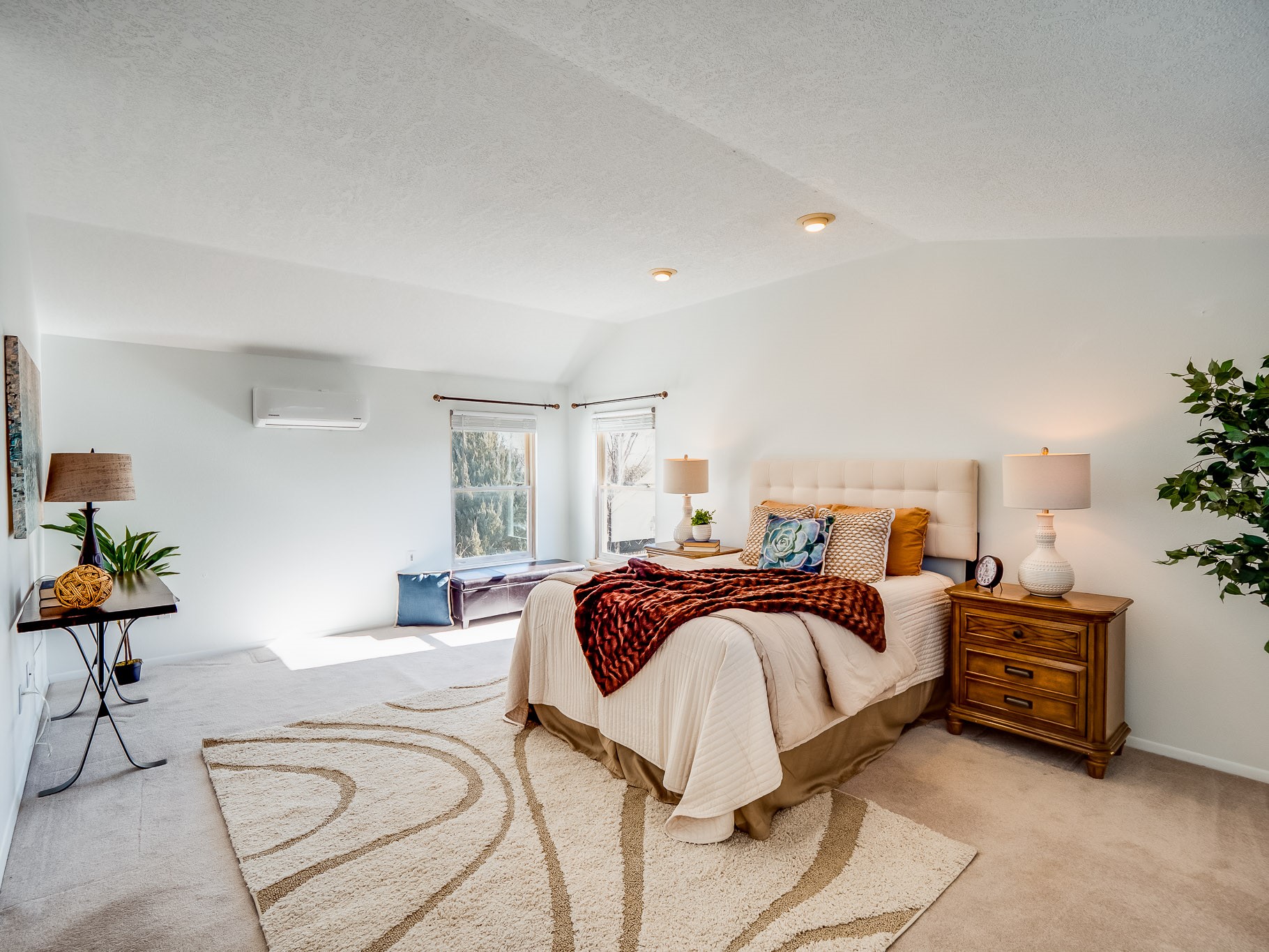 Situated on a desirable corner lot in North Mesa, this beautiful two-story home offers exceptional curb appeal with a large grassy front yard and mature trees lining the welcoming front entrance, providing shade as well as privacy. Step inside the foyer and descend a few steps into the bright, open living room, where rich engineered wood floors extend throughout the main living spaces. Vaulted ceilings enhance the sense of space and light, creating an inviting atmosphere ideal for both everyday living and entertaining. The living room flows seamlessly into the dining area, thoughtfully divided from the kitchen by open glass shelving that adds architectural interest while maintaining an open-concept feel. The kitchen has light colored cabinetry and abundant quartz counter space, including a peninsula island with bar seating. Stainless steel refrigerator and a gas oven/range, and there is convenient access to the oversized two-car garage. Adjacent to the kitchen, the family room features vaulted ceilings and a dramatic floor to ceiling stone wood burning fireplace, serving as a warm and striking focal point. From here, step outside to the covered deck overlooking the fully fenced backyard with mature trees, and ample space for gardening and outdoor dining. The main level also includes three nicely sized carpeted guest bedrooms, a guest bathroom with a walk-in tiled shower featuring a luxurious shower panel and single-sink vanity, along with a dedicated laundry room and additional storage closet. Upstairs, the home is fully carpeted and features a cozy loft perfect for relaxing or reading, as well as a versatile bonus room that could serve as a hobby space, office, or additional bedroom. Spacious primary en-suite bedroom with a large walk-in closet and a spa-like bathroom complete with a double-sink vanity, tile flooring, and a deep soaking tub. Located near parks, horse stables and trails, book your tour of this move-in ready home and experience what it has to offer!