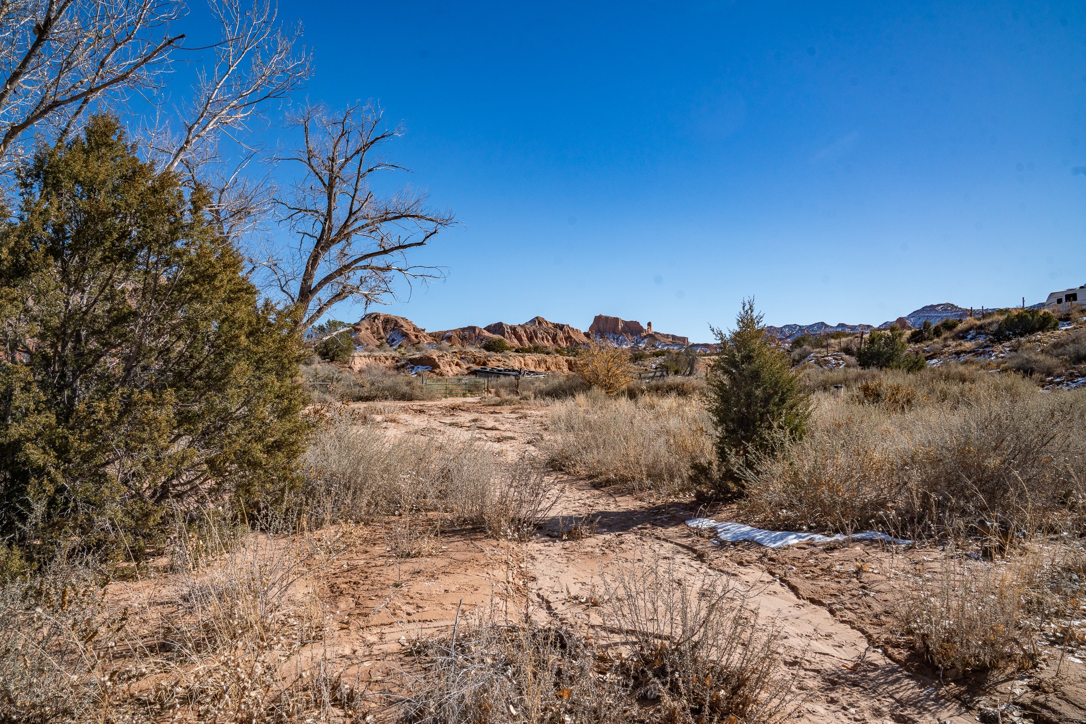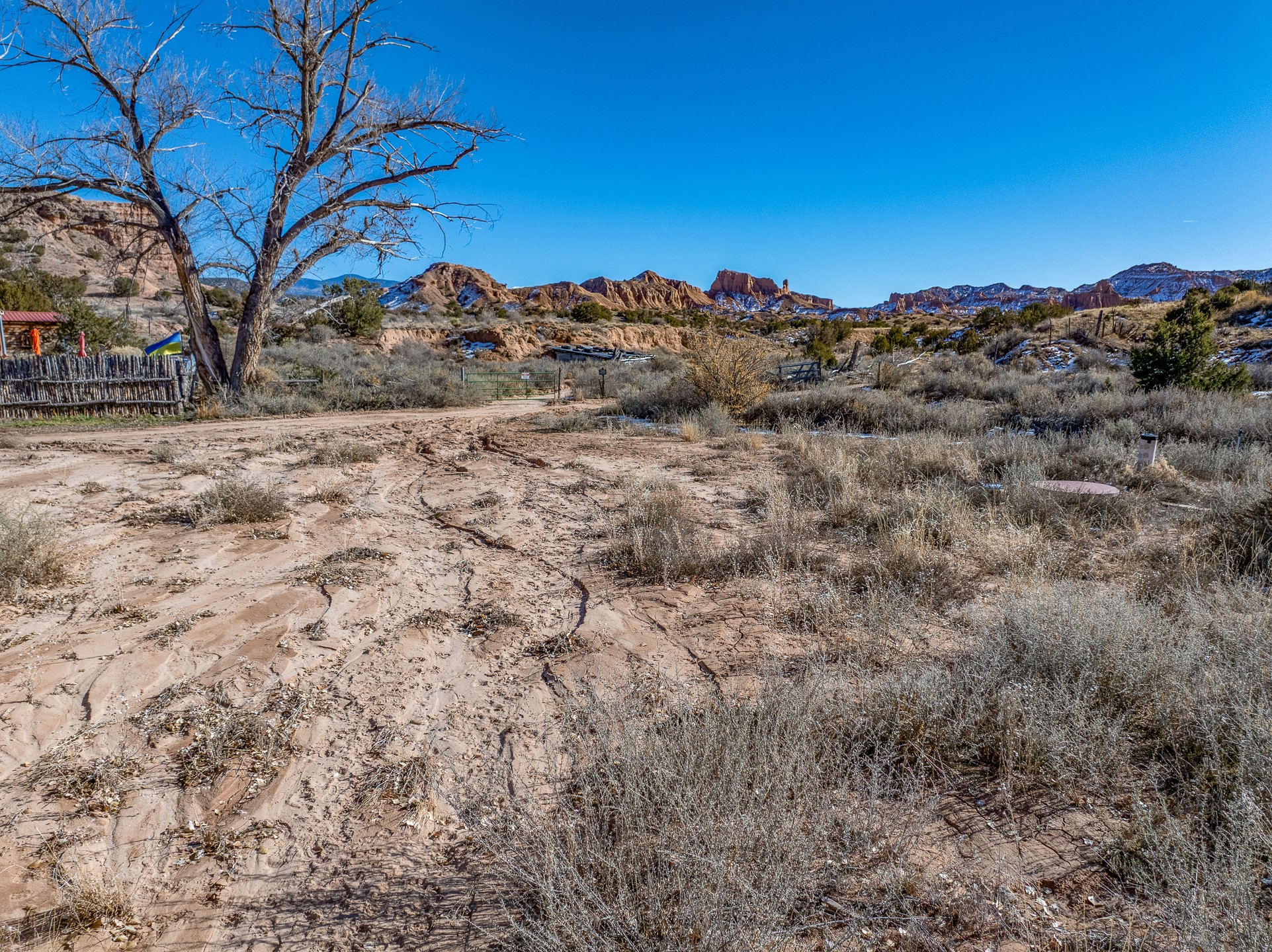 Capture a piece of gorgeous Chimayo land on .95 lush acreage!! Flat land with easy building sites provides for house, guest house and storage buildings! Trees and birds abound! Access to BLM land is available as well. There is a shared well on the property and a gate already provided for access into the property. Water rights also will transfer!! Owner may finance with 20% down.