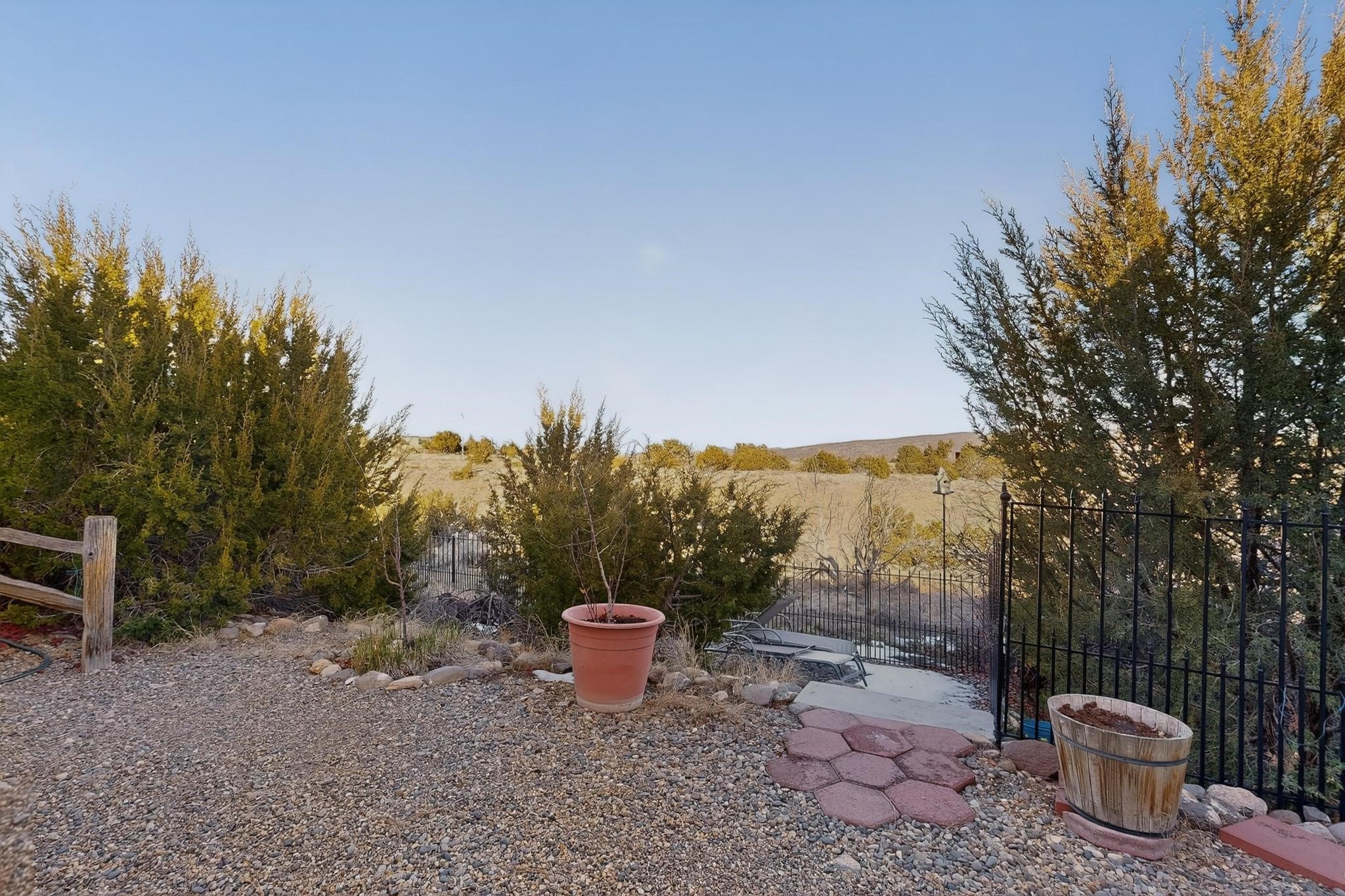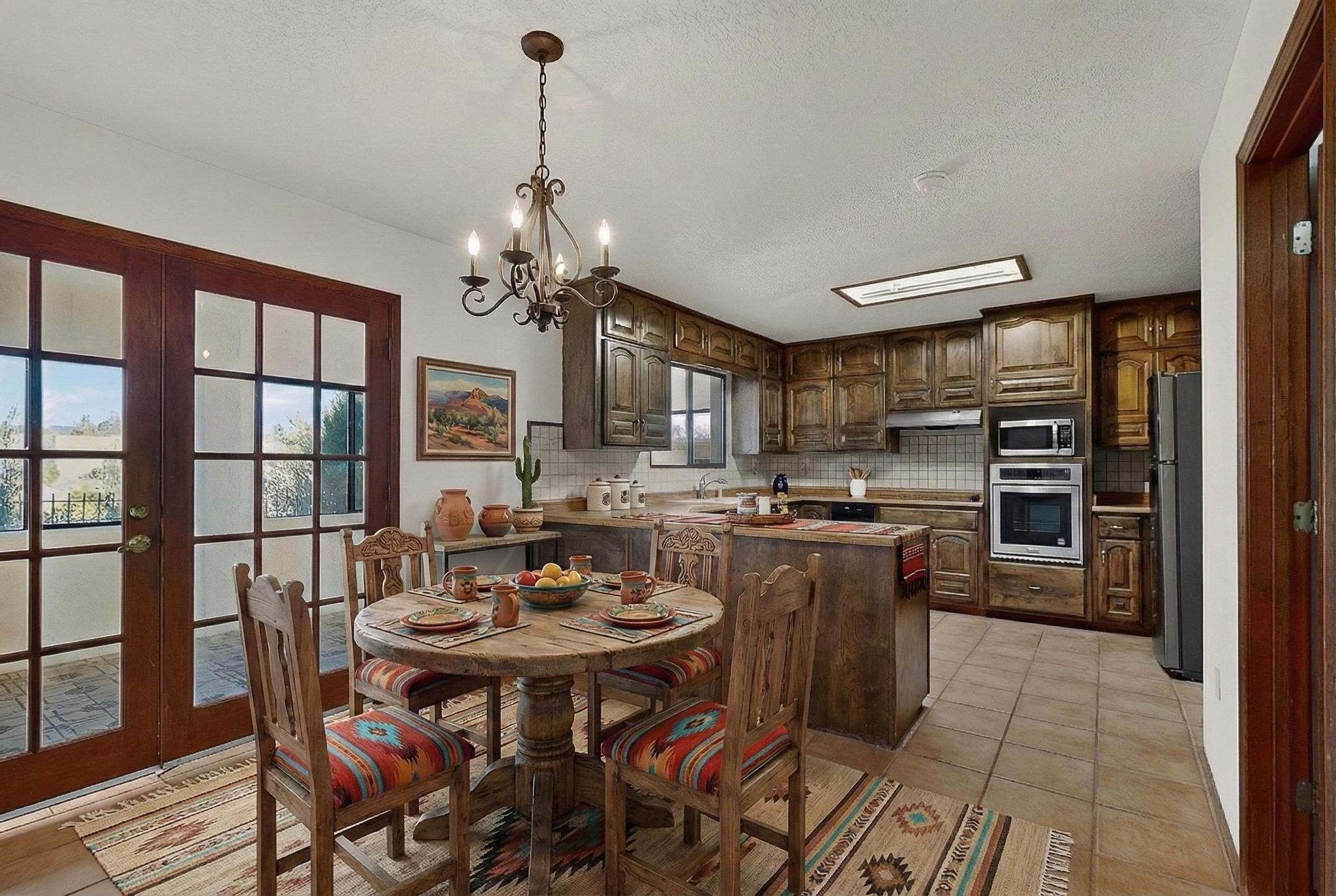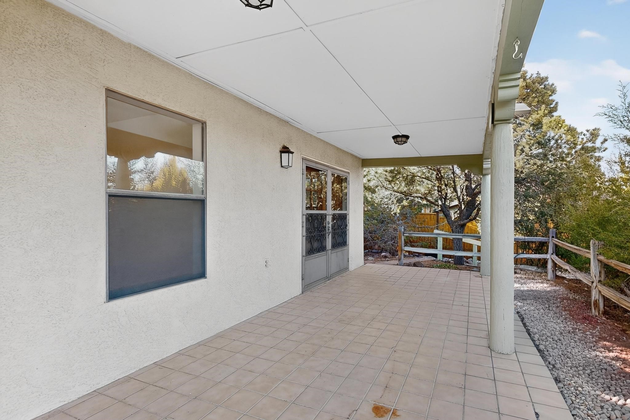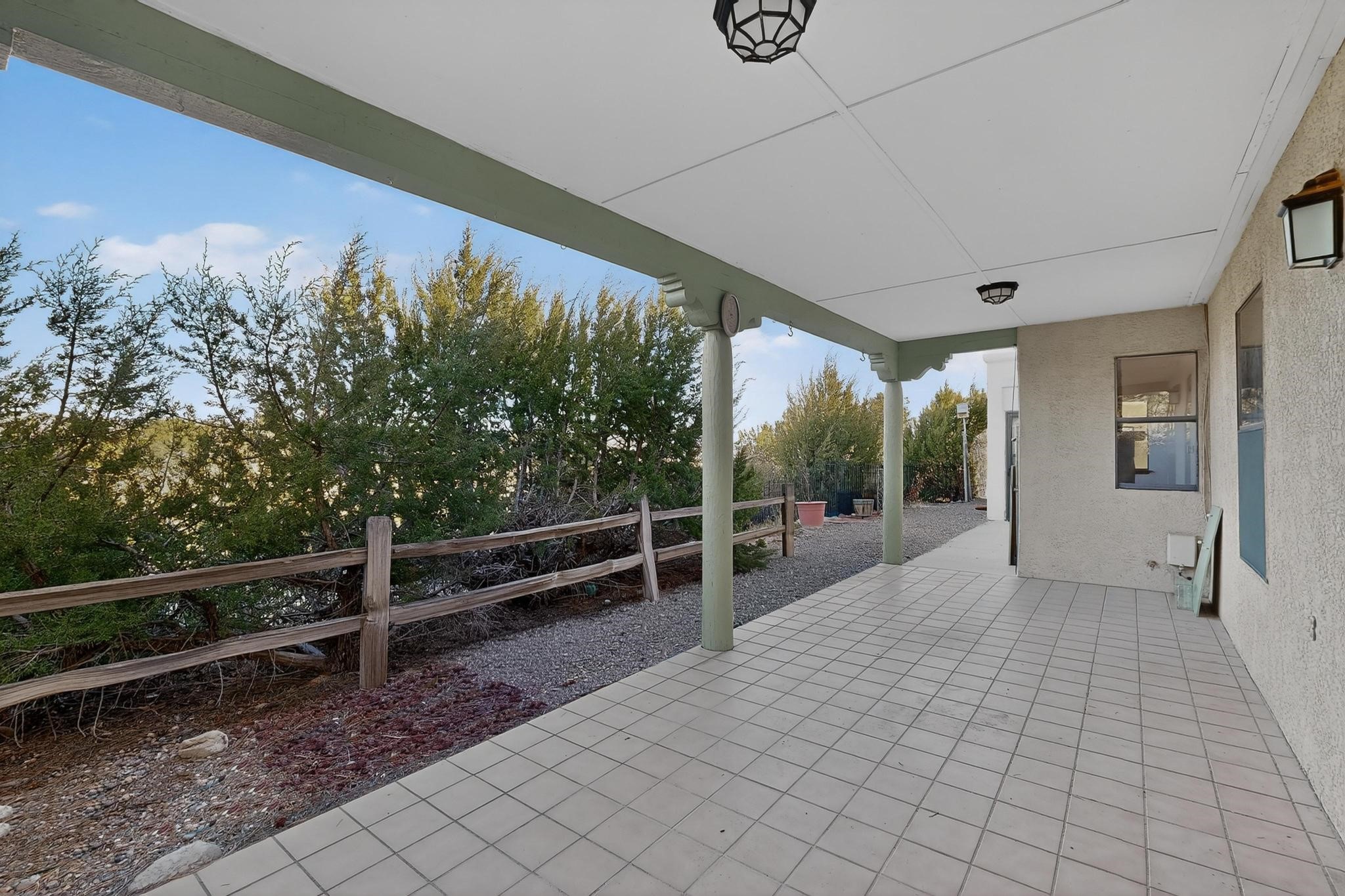 Thoughtfully designed approx. 2,500 sq ft, 3-bedroom plus flex room, 3-bath, 2-car garage home on a desirable double lot backing to open space, offering added privacy and beautiful views. The spacious living area, with room for an office or sitting area, features vaulted wood beam ceilings, a stone gas fireplace updated in 2023, and built-in shelving.The well-planned layout includes two primary bedrooms with en-suite baths, one with a walk-in closet, plus a third bedroom and an additional full bath. Bathrooms have been thoughtfully updated, including a remodeled primary bath with a walk-in shower. A sunroom, small office area off the kitchen, direct-access garage, and dedicated laundry room provide excellent flexibility for daily living.Notable improvements include a new furnace and water heater (2019), updated kitchen appliances and lighting, newer washer and dryer, insulated garage door, updated interior and exterior lighting, ceiling fans, window coverings, replaced window pulleys and screens, UV/heat-filtering window film, and new carpet in the living area and bedrooms. Additional amenities include marble flooring, forced air heating, central evaporative cooling, raised garden beds, fruit trees, and recent exterior updates.A wonderful opportunity to enjoy space, privacy, views, and relaxed Cochiti living. Please see the documents section for a complete list of updates and improvements.