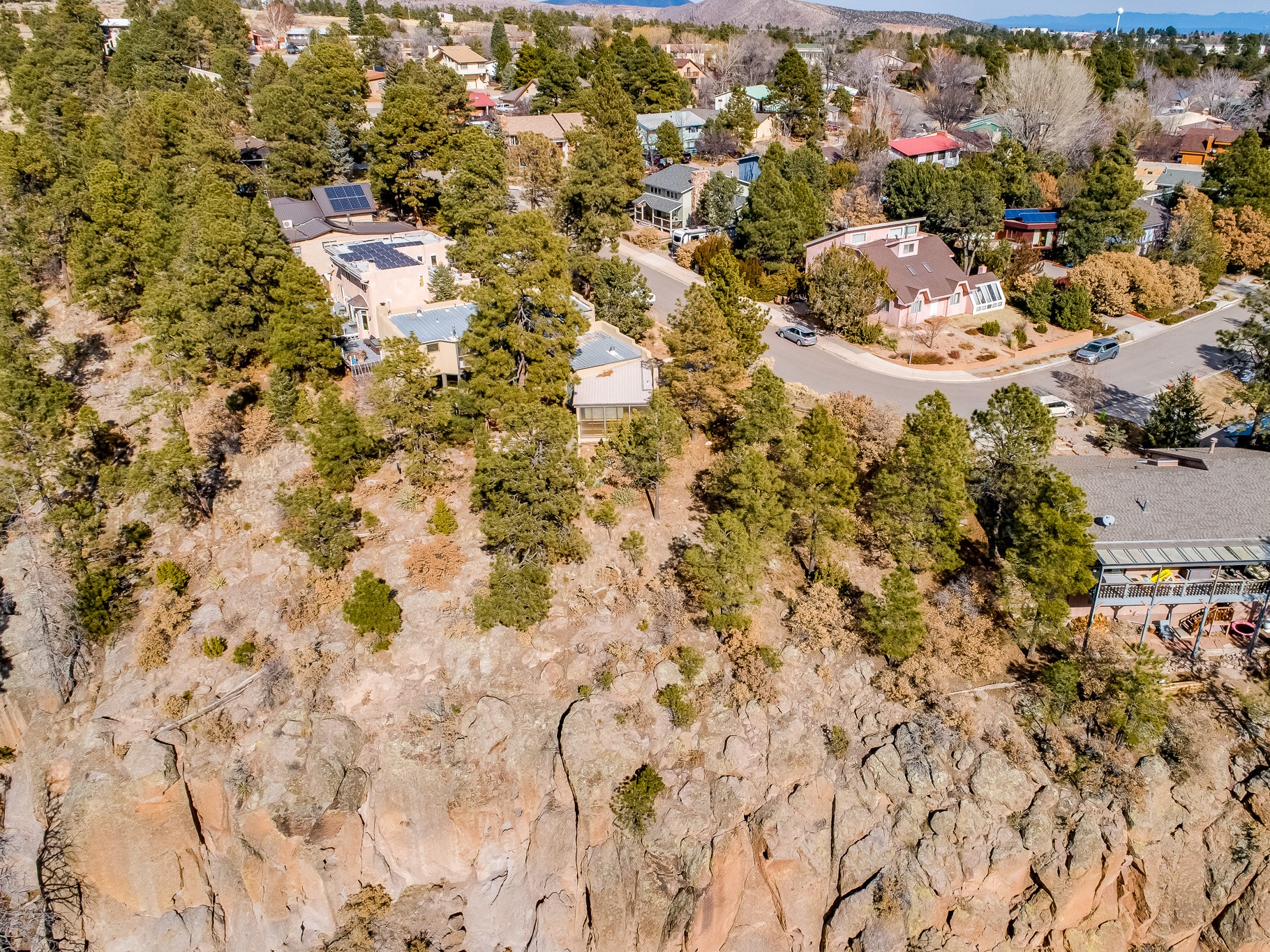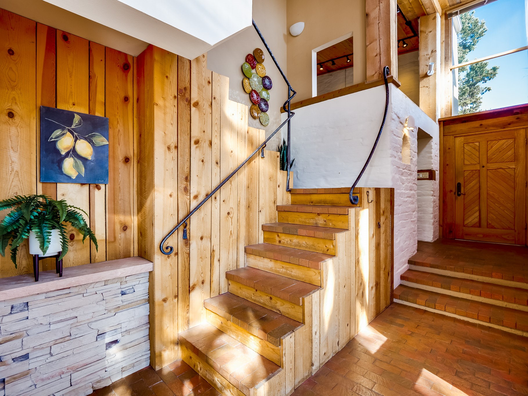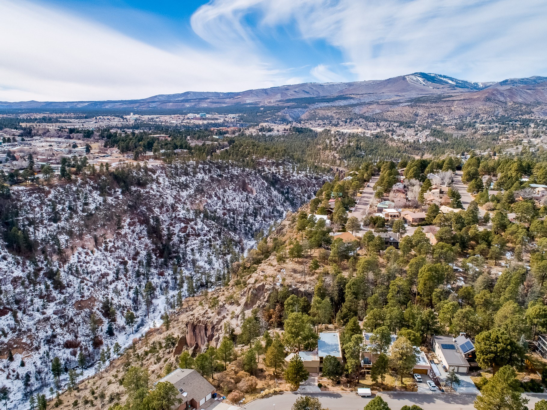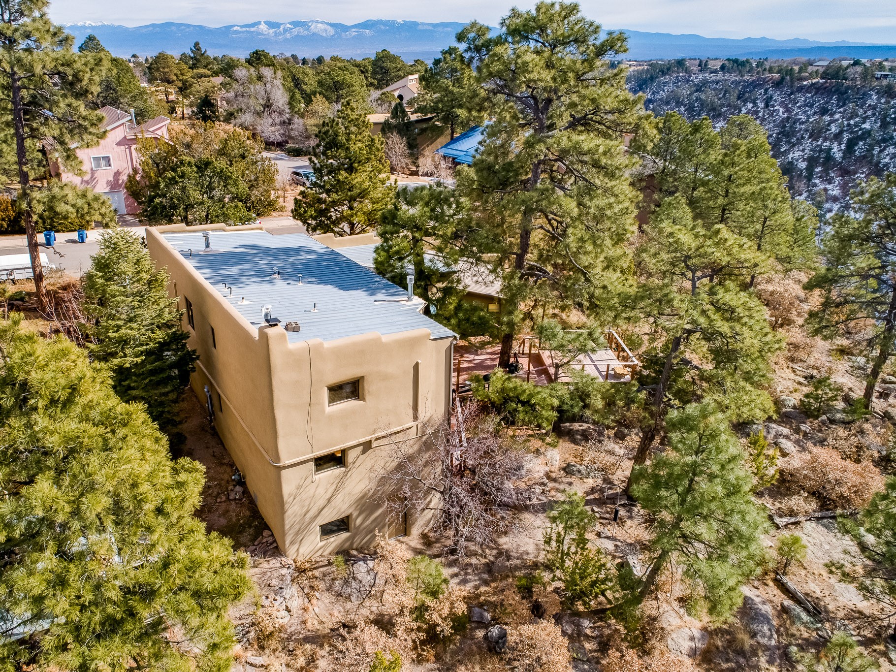 Perched on the canyon in North Mesa, this custom modern adobe home is a rare architectural offering that seamlessly blends natural materials, thoughtful design, and breathtaking surroundings. Character and craftsmanship are evident at every turn, with expansive canyon and treetop views. From the moment you step through the front door your'e greeted with a long, dramatic hallway setting the tone, featuring wood-planked vaulted ceilings, brick flooring, floor to ceiling windows and a rich combination of wood plank and plastered walls that continue throughout the home. The living room carries forward the vaulted ceilings and is anchored by a wood-burning freestanding fireplace that serves as a striking focal point between the living and dining area, thoughtfully tying the spaces together. The kitchen and family room form a bright, open living space with wood-beamed ceilings, abundant windows, and sliding doors that lead directly to the deck. The family room offers a custom wood built-in cabinetry and a gas freestanding fireplace. The kitchen features light-toned wood cabinetry, hard surface counters, and a peninsula island with bar seating, perfect for casual meals or entertaining. Just off the kitchen is a guest bath with a single-sink vanity and a tiled walk-in shower. This level also provides access to the two-car garage, which includes a connected green room. Upstairs, is fully carpeted and offers two bedrooms. A guest bed and the spacious primary suite that feels luxurious and serene, highlighted by a kiva fireplace and a dedicated seating area. There's a large closet and a washer and dryer for added convenience. The generously sized bathroom is shared between the two bedrooms and includes a deep jetted soaking tub, a walk-in shower, and two separate single-sink vanities. Outdoor living is truly exceptional, with a massive composite deck offering multiple areas for entertaining and taking in those canyon views. Book your tour to experience this home for yourself!
