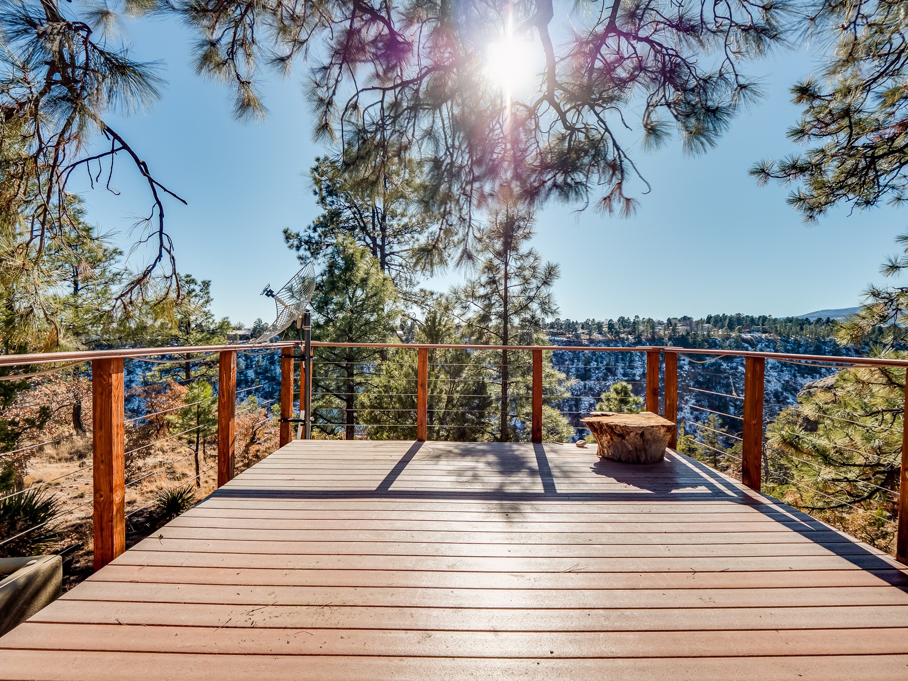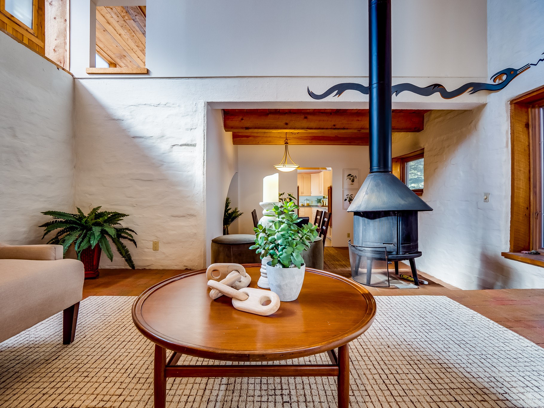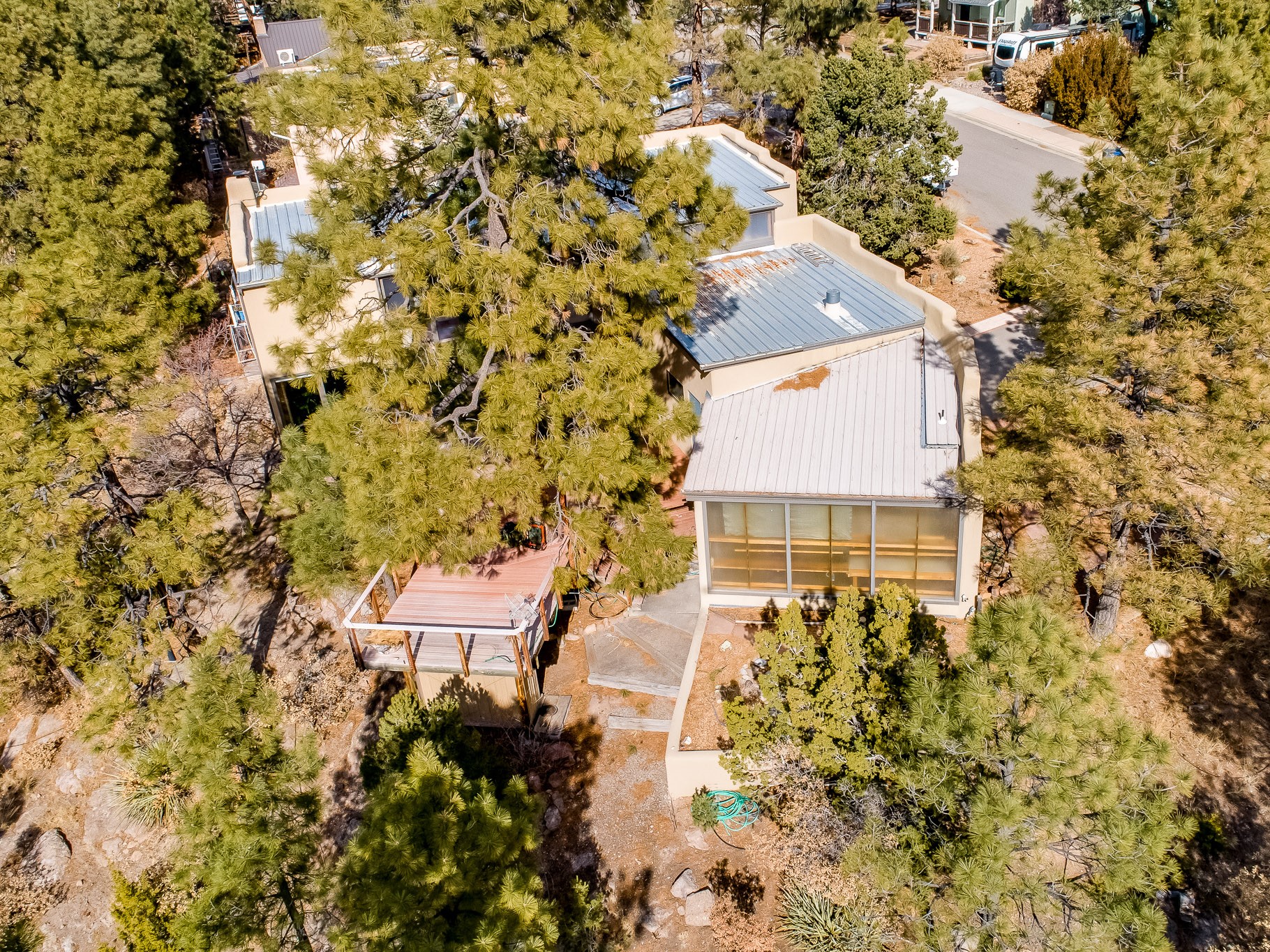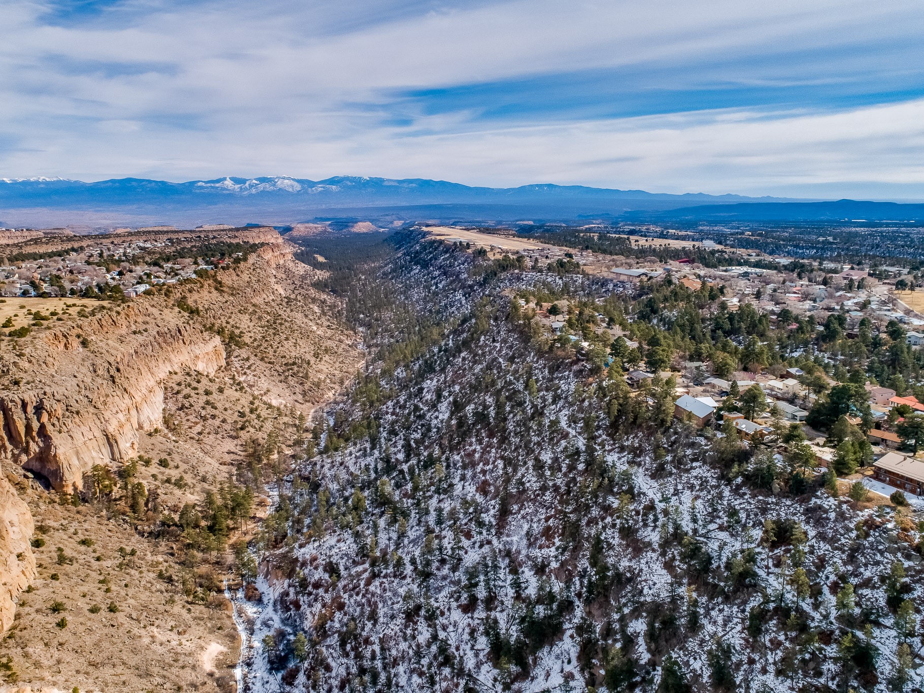 Perched on the canyon in North Mesa, this custom modern adobe home is a rare architectural offering that seamlessly blends natural materials, thoughtful design, and breathtaking surroundings. Character and craftsmanship are evident at every turn, with expansive canyon and treetop views. From the moment you step through the front door your'e greeted with a long, dramatic hallway setting the tone, featuring wood-planked vaulted ceilings, brick flooring, floor to ceiling windows and a rich combination of wood plank and plastered walls that continue throughout the home. The living room carries forward the vaulted ceilings and is anchored by a wood-burning freestanding fireplace that serves as a striking focal point between the living and dining area, thoughtfully tying the spaces together. The kitchen and family room form a bright, open living space with wood-beamed ceilings, abundant windows, and sliding doors that lead directly to the deck. The family room offers a custom wood built-in cabinetry and a gas freestanding fireplace. The kitchen features light-toned wood cabinetry, hard surface counters, and a peninsula island with bar seating, perfect for casual meals or entertaining. Just off the kitchen is a guest bath with a single-sink vanity and a tiled walk-in shower. This level also provides access to the two-car garage, which includes a connected green room. Upstairs, is fully carpeted and offers two bedrooms. A guest bed and the spacious primary suite that feels luxurious and serene, highlighted by a kiva fireplace and a dedicated seating area. There's a large closet and a washer and dryer for added convenience. The generously sized bathroom is shared between the two bedrooms and includes a deep jetted soaking tub, a walk-in shower, and two separate single-sink vanities. Outdoor living is truly exceptional, with a massive composite deck offering multiple areas for entertaining and taking in those canyon views. Book your tour to experience this home for yourself!