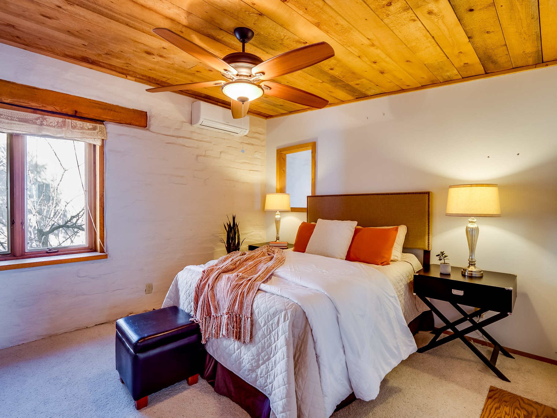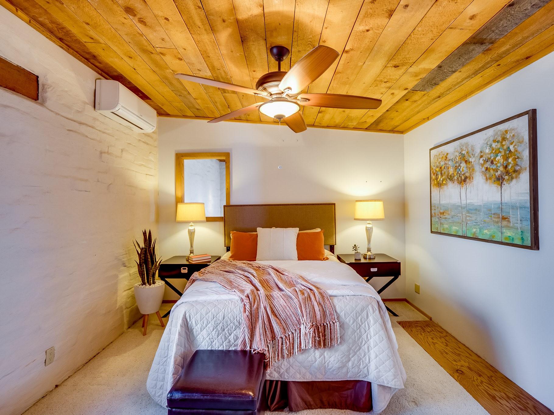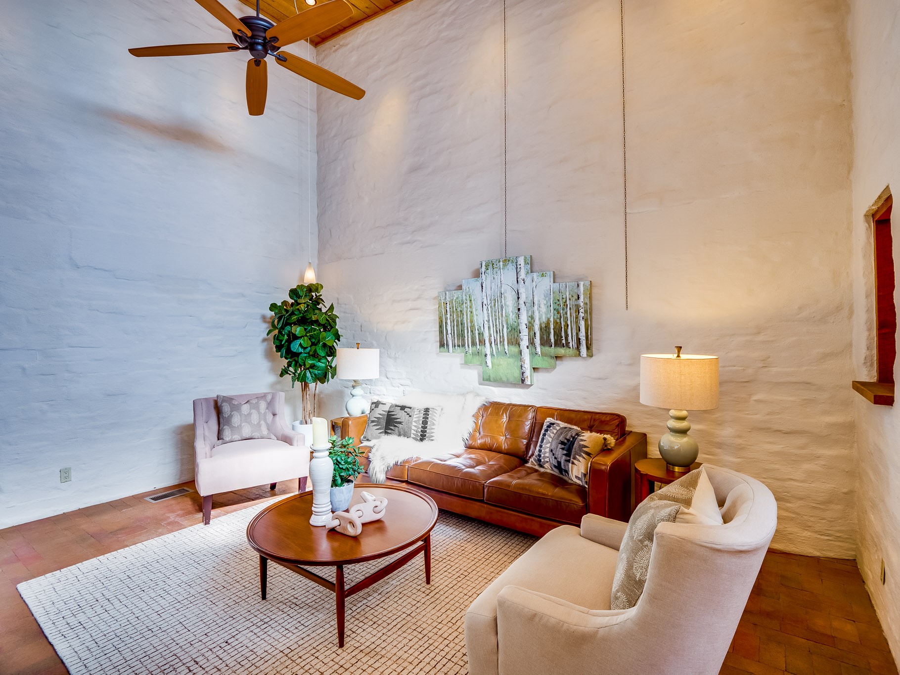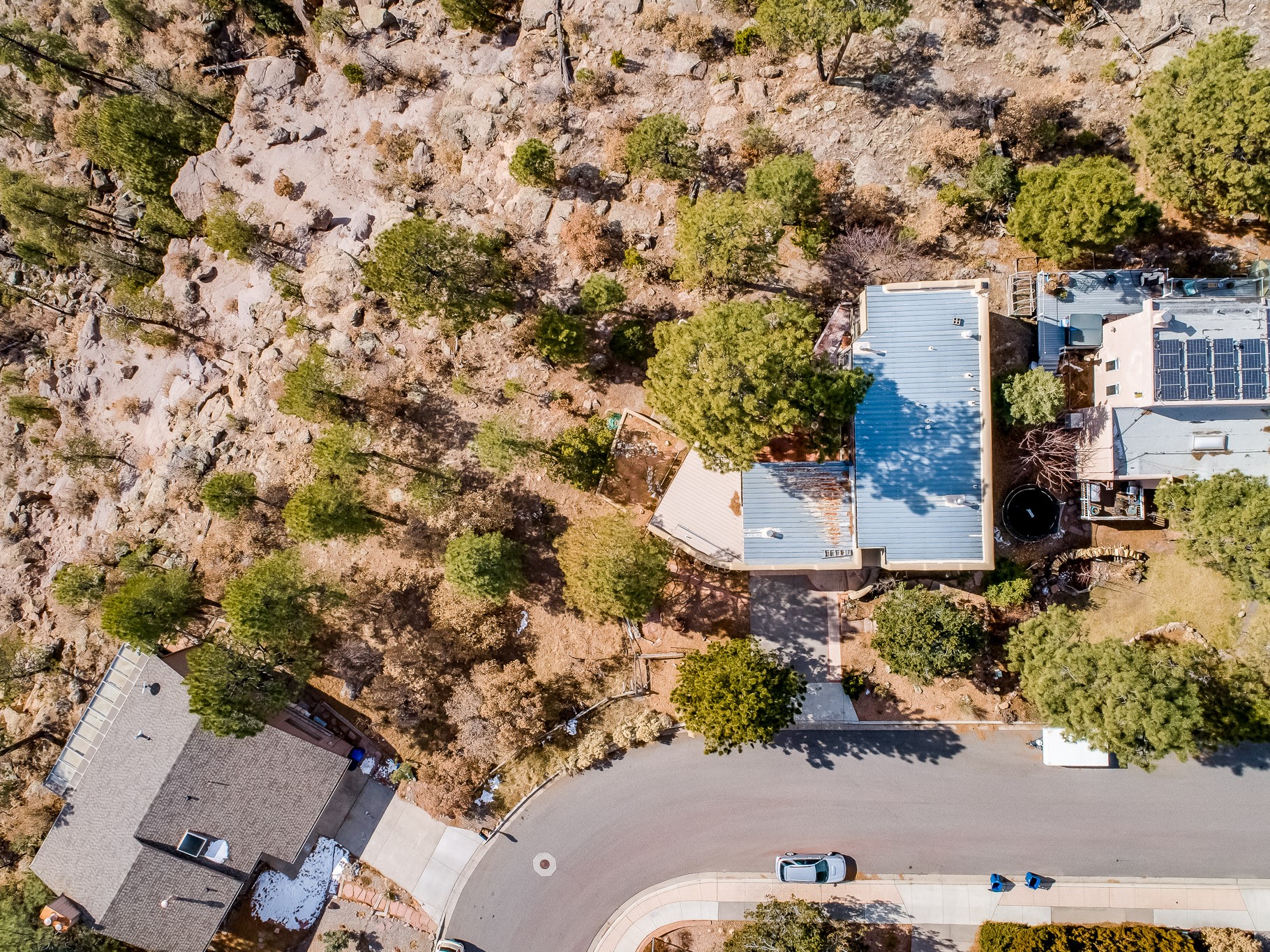 Perched on the canyon in North Mesa, this custom modern adobe home is a rare architectural offering that seamlessly blends natural materials, thoughtful design, and breathtaking surroundings. Character and craftsmanship are evident at every turn, with expansive canyon and treetop views. From the moment you step through the front door your'e greeted with a long, dramatic hallway setting the tone, featuring wood-planked vaulted ceilings, brick flooring, floor to ceiling windows and a rich combination of wood plank and plastered walls that continue throughout the home. The living room carries forward the vaulted ceilings and is anchored by a wood-burning freestanding fireplace that serves as a striking focal point between the living and dining area, thoughtfully tying the spaces together. The kitchen and family room form a bright, open living space with wood-beamed ceilings, abundant windows, and sliding doors that lead directly to the deck. The family room offers a custom wood built-in cabinetry and a gas freestanding fireplace. The kitchen features light-toned wood cabinetry, hard surface counters, and a peninsula island with bar seating, perfect for casual meals or entertaining. Just off the kitchen is a guest bath with a single-sink vanity and a tiled walk-in shower. This level also provides access to the two-car garage, which includes a connected green room. Upstairs, is fully carpeted and offers two bedrooms. A guest bed and the spacious primary suite that feels luxurious and serene, highlighted by a kiva fireplace and a dedicated seating area. There's a large closet and a washer and dryer for added convenience. The generously sized bathroom is shared between the two bedrooms and includes a deep jetted soaking tub, a walk-in shower, and two separate single-sink vanities. Outdoor living is truly exceptional, with a massive composite deck offering multiple areas for entertaining and taking in those canyon views. Book your tour to experience this home for yourself!