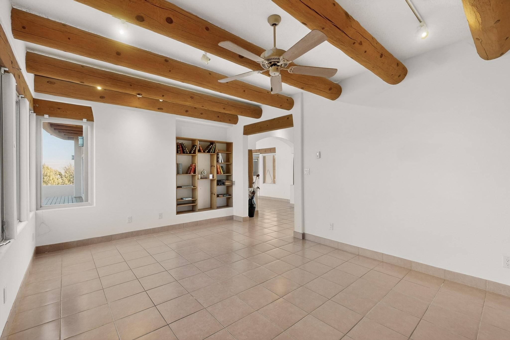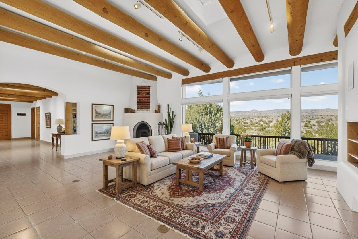 Lovely and bright open concept Santa Fe style 3 bedroom, 4 bathroom 3340 sq ft home plus an additional large walled private courtyard and a second lot to provide preservation of line of sight dramatic views of sunsets and the Jemez Mountains from the living room, dining area and the large exterior patio/deck. This home's spacious kitchen includes a granite island, granite counters, newer appliances, plenty of cabinets and a breakfast nook. In the primary suite, there are two bedrooms and two baths. The main bedroom has a walk-in closet and a bath with a walk-in shower and sauna. The 3rd bedroom is part of a guest suite which includes a full bath and a refrigerator. The guest suite can be accessed without entering the main residence. Other highlights for this exceptional home include kiva fireplace, vigas, skylights, a separate half-bath, 4 ceiling fans, 2 swamp coolers, a two car garage and a fenced area for pets. Enjoy yourself in this home about 30 minutes from Santa Fe or Albuquerque.