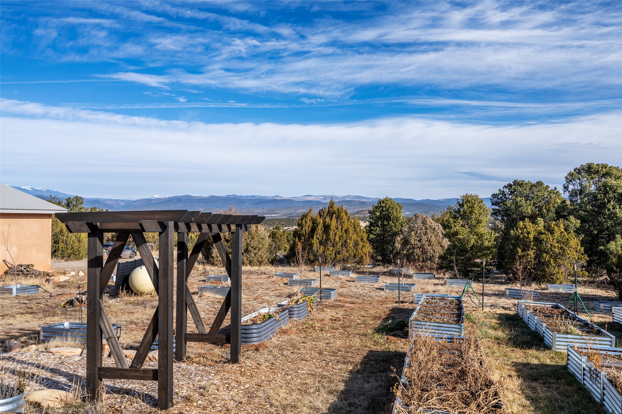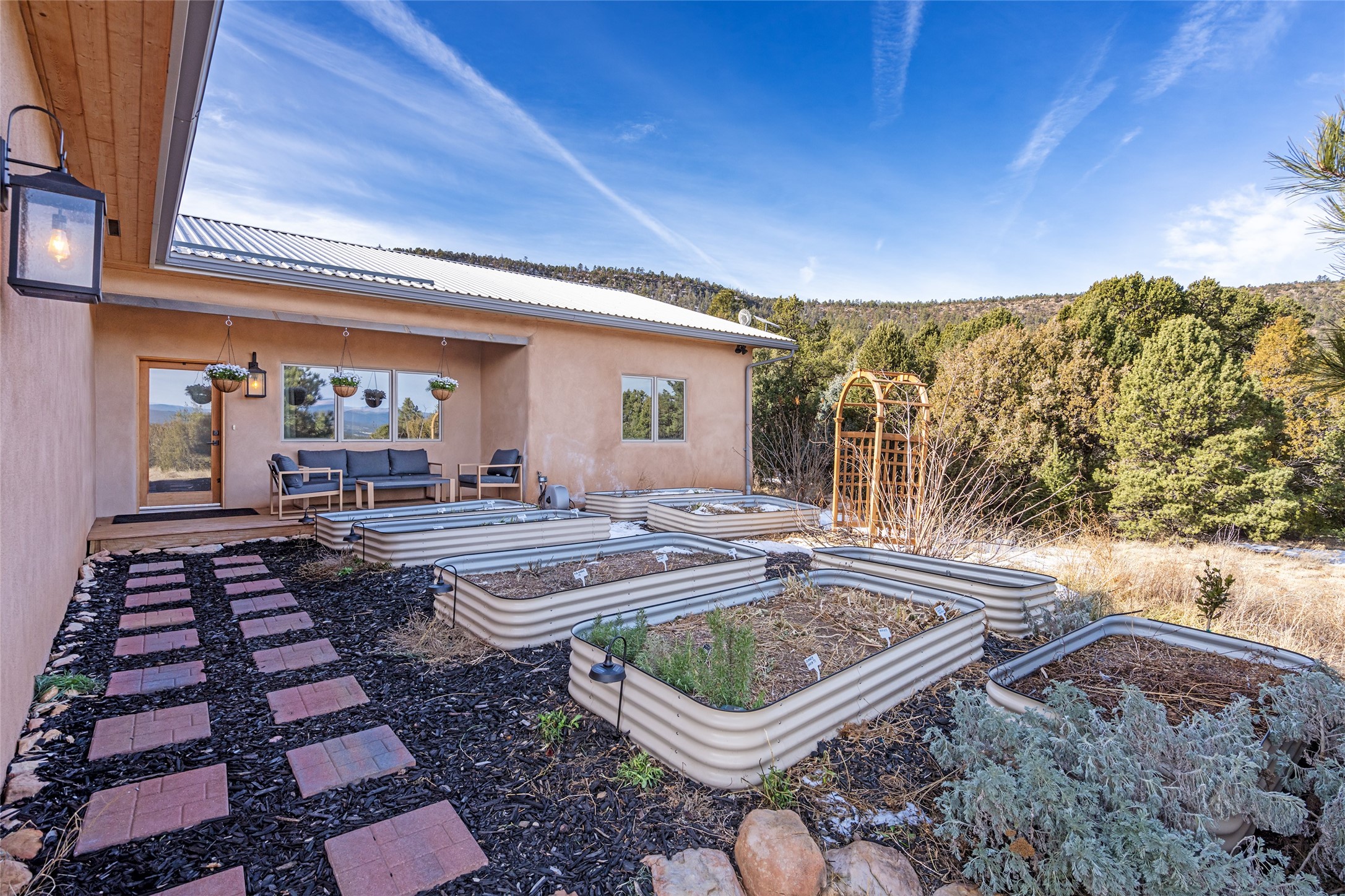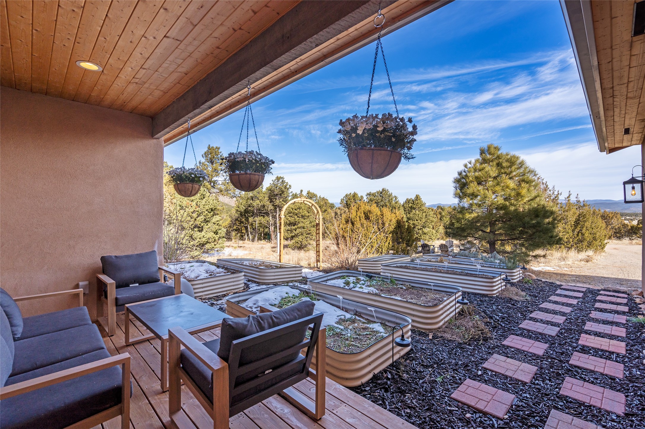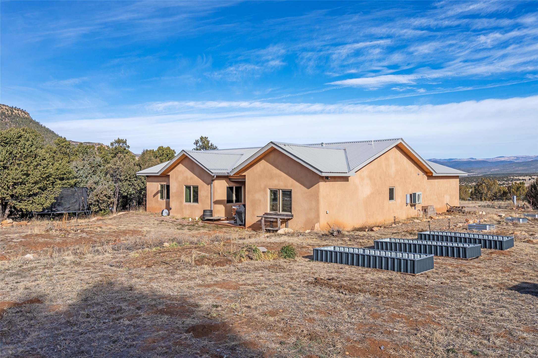 Located at the base of Rowe Mesa, this ranch-style home on nearly 4 Acres of flat useable land, offers wide skies, mountain views, and rural privacy all just 30 minutes from Santa Fe.Built in 2021, the custom residence provides exceptional comfort with a modern ranch style. A pitched propanel roof, classic stucco exterior, and warm natural finishes create an inviting, grounded feel throughout. Inside, the open-concept living and kitchen area is ideal for entertaining, with island seating, a pantry, and easy access to the attached two car garage. Brick floors, wood cabinetry, subway tile accents, and planked wood ceilings add texture and space, while three bedrooms and two baths provide flexible, comfortable living. Radiant heat and mini-splits ensure year-round comfort.Outside, the land truly shines. Mature fruit trees, thoughtfully tended garden beds, and two chicken coops support a slower, more self-sufficient lifestyle. Bordering the Santa Fe National Forest, the property offers direct access to nature, and unbounded recreation.With usable acreage and newer construction in a serene high-desert setting, this is a place to breathe deeply, spread out, and feel at home.