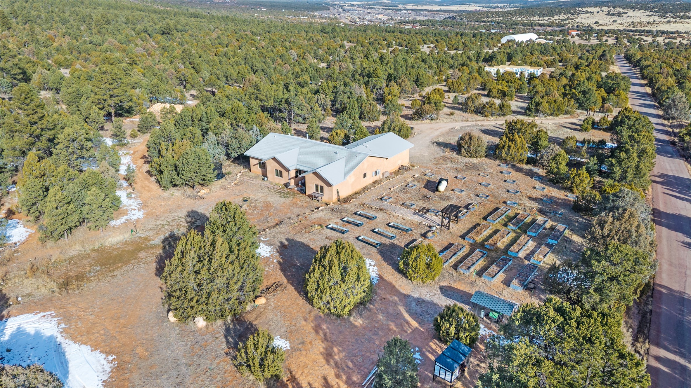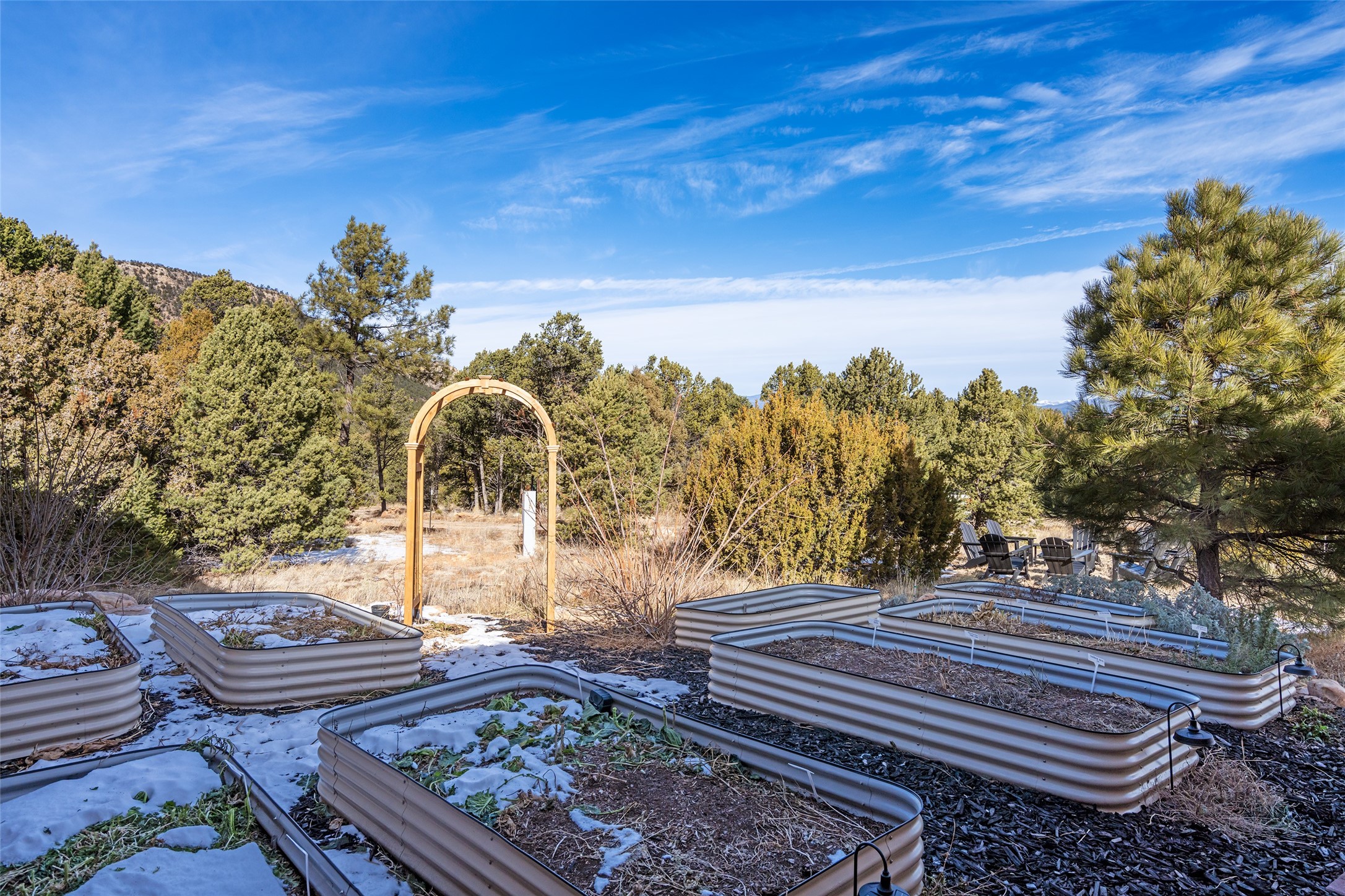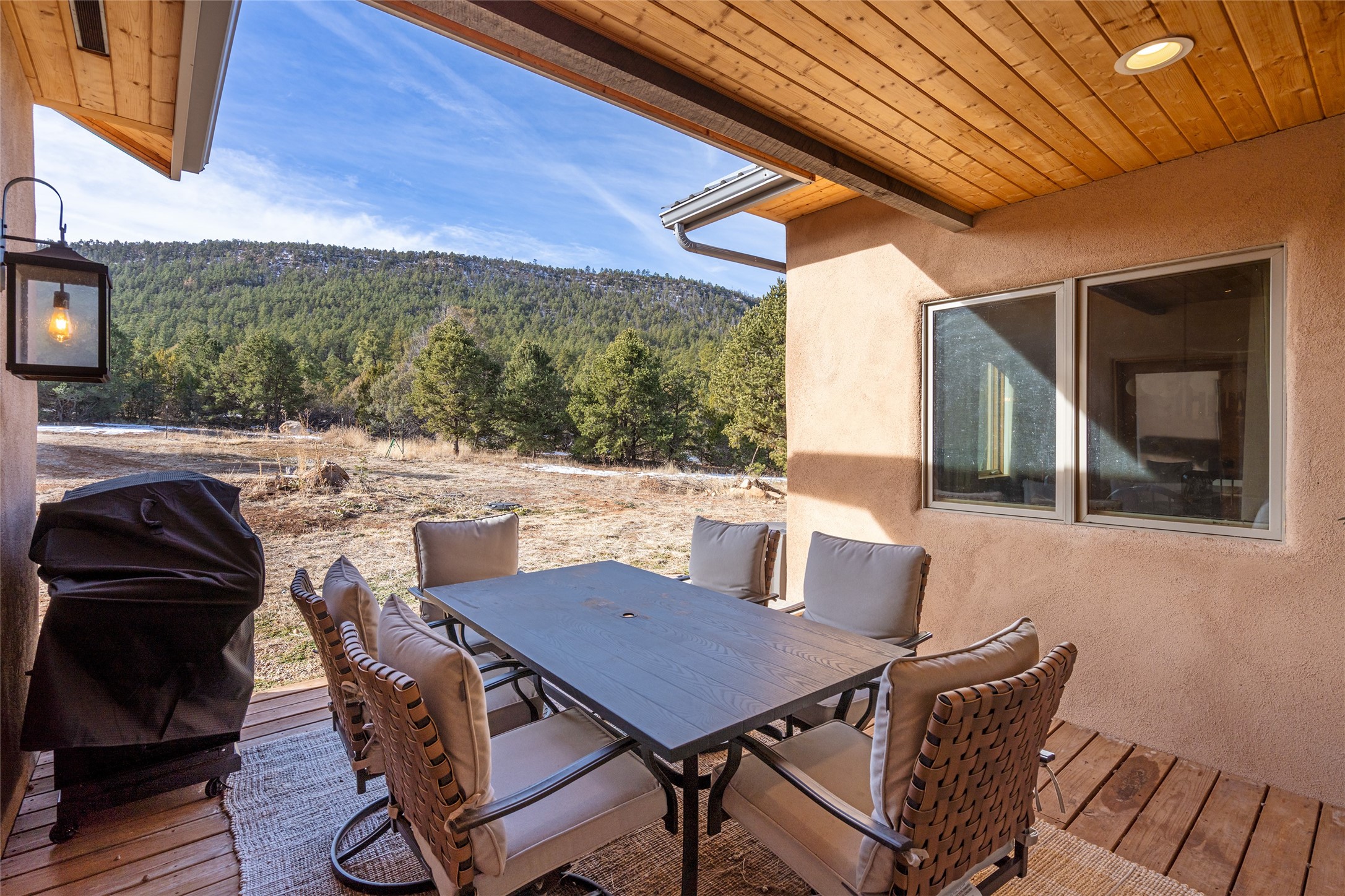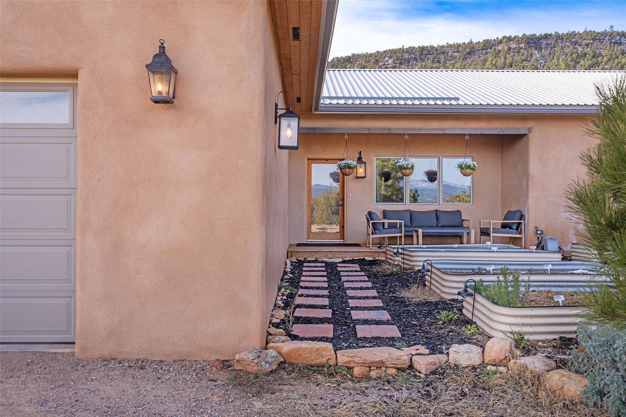 Located at the base of Rowe Mesa, this ranch-style home on nearly 4 Acres of flat useable land, offers wide skies, mountain views, and rural privacy all just 30 minutes from Santa Fe.Built in 2021, the custom residence provides exceptional comfort with a modern ranch style. A pitched propanel roof, classic stucco exterior, and warm natural finishes create an inviting, grounded feel throughout. Inside, the open-concept living and kitchen area is ideal for entertaining, with island seating, a pantry, and easy access to the attached two car garage. Brick floors, wood cabinetry, subway tile accents, and planked wood ceilings add texture and space, while three bedrooms and two baths provide flexible, comfortable living. Radiant heat and mini-splits ensure year-round comfort.Outside, the land truly shines. Mature fruit trees, thoughtfully tended garden beds, and two chicken coops support a slower, more self-sufficient lifestyle. Bordering the Santa Fe National Forest, the property offers direct access to nature, and unbounded recreation.With usable acreage and newer construction in a serene high-desert setting, this is a place to breathe deeply, spread out, and feel at home.