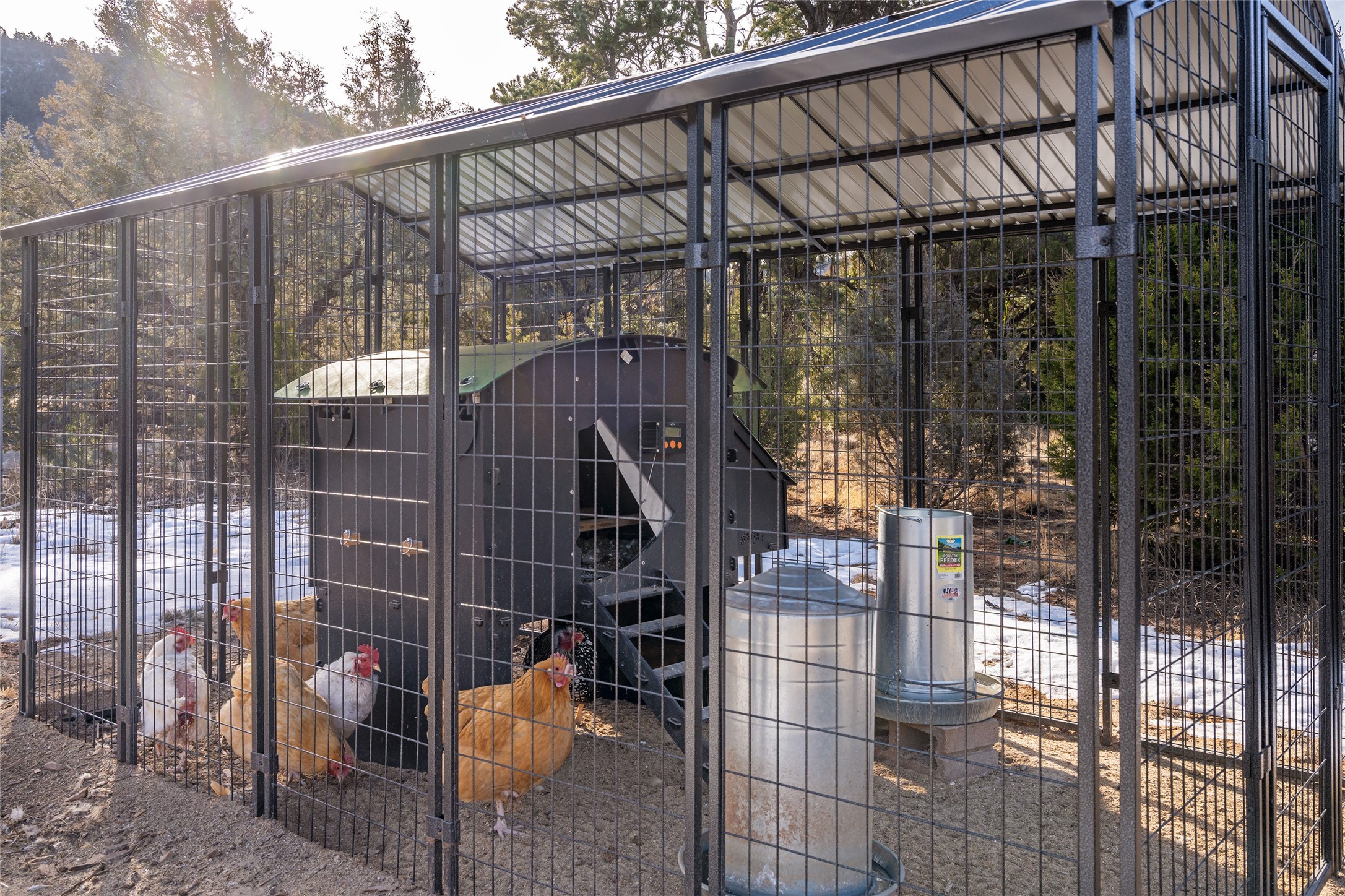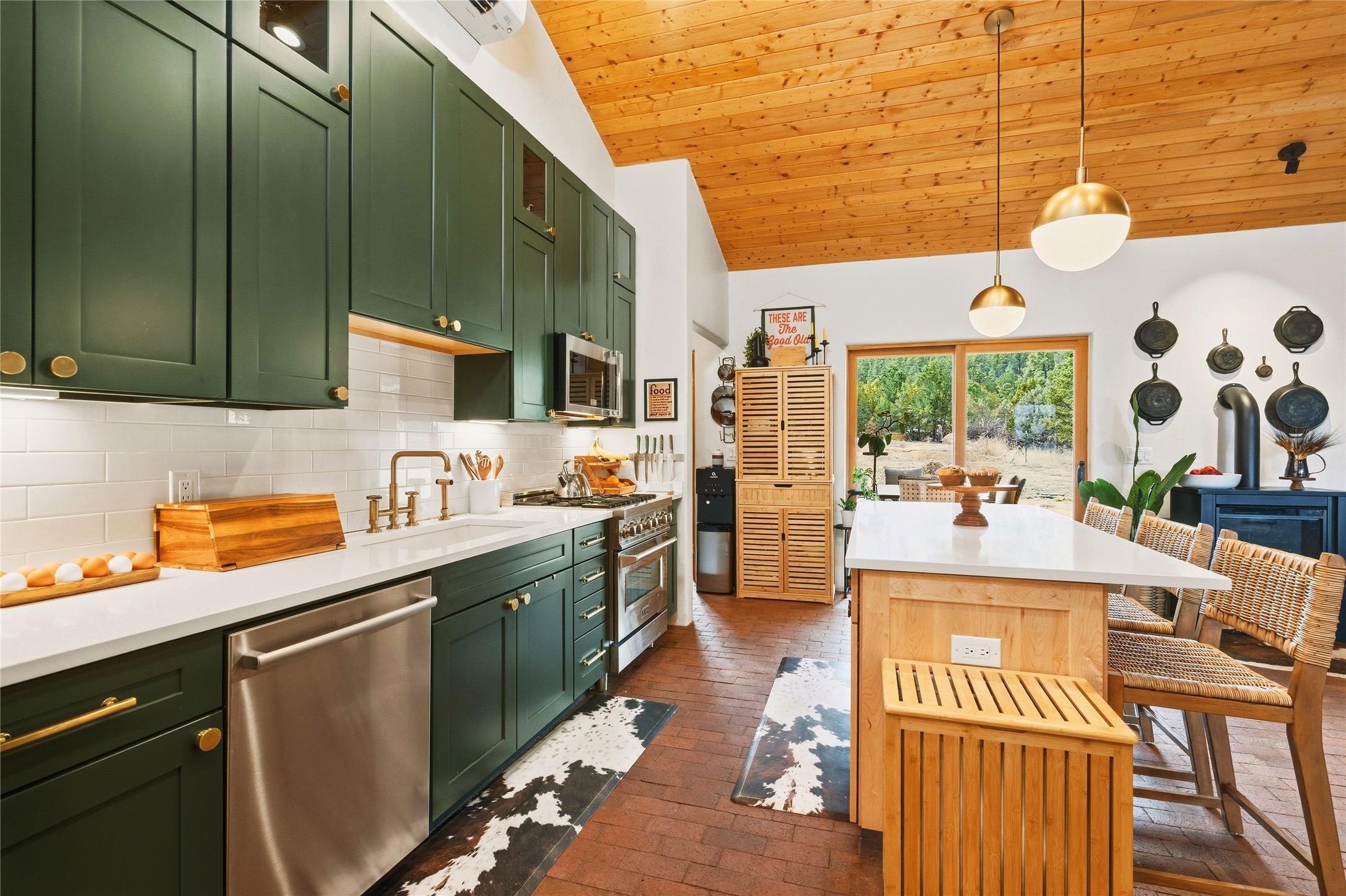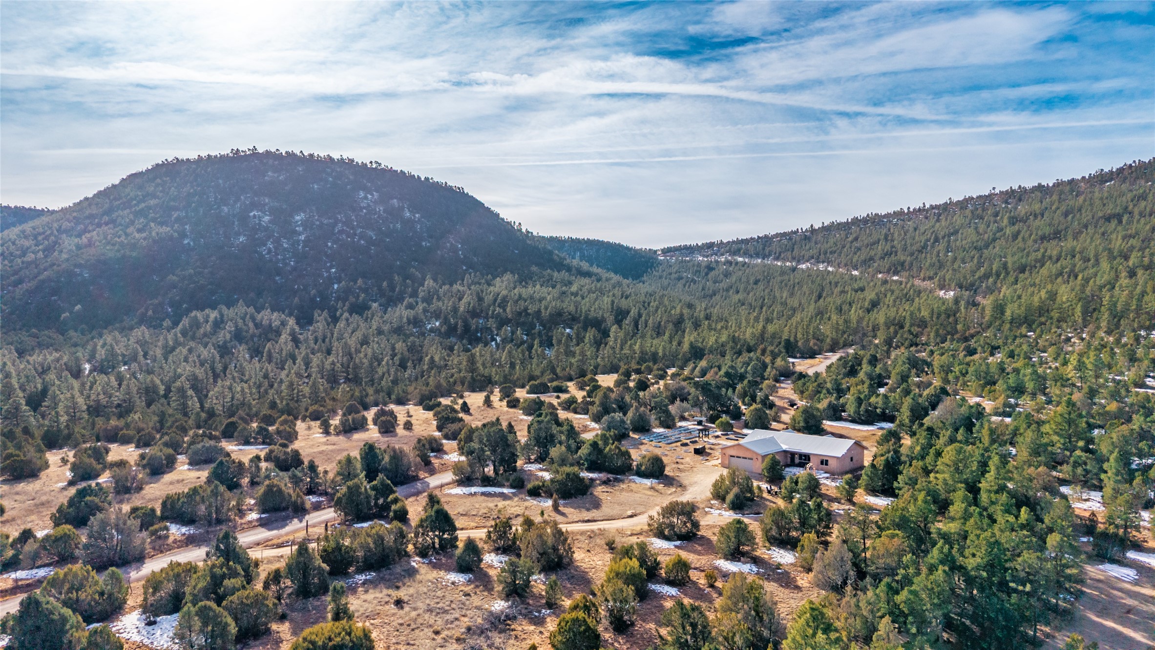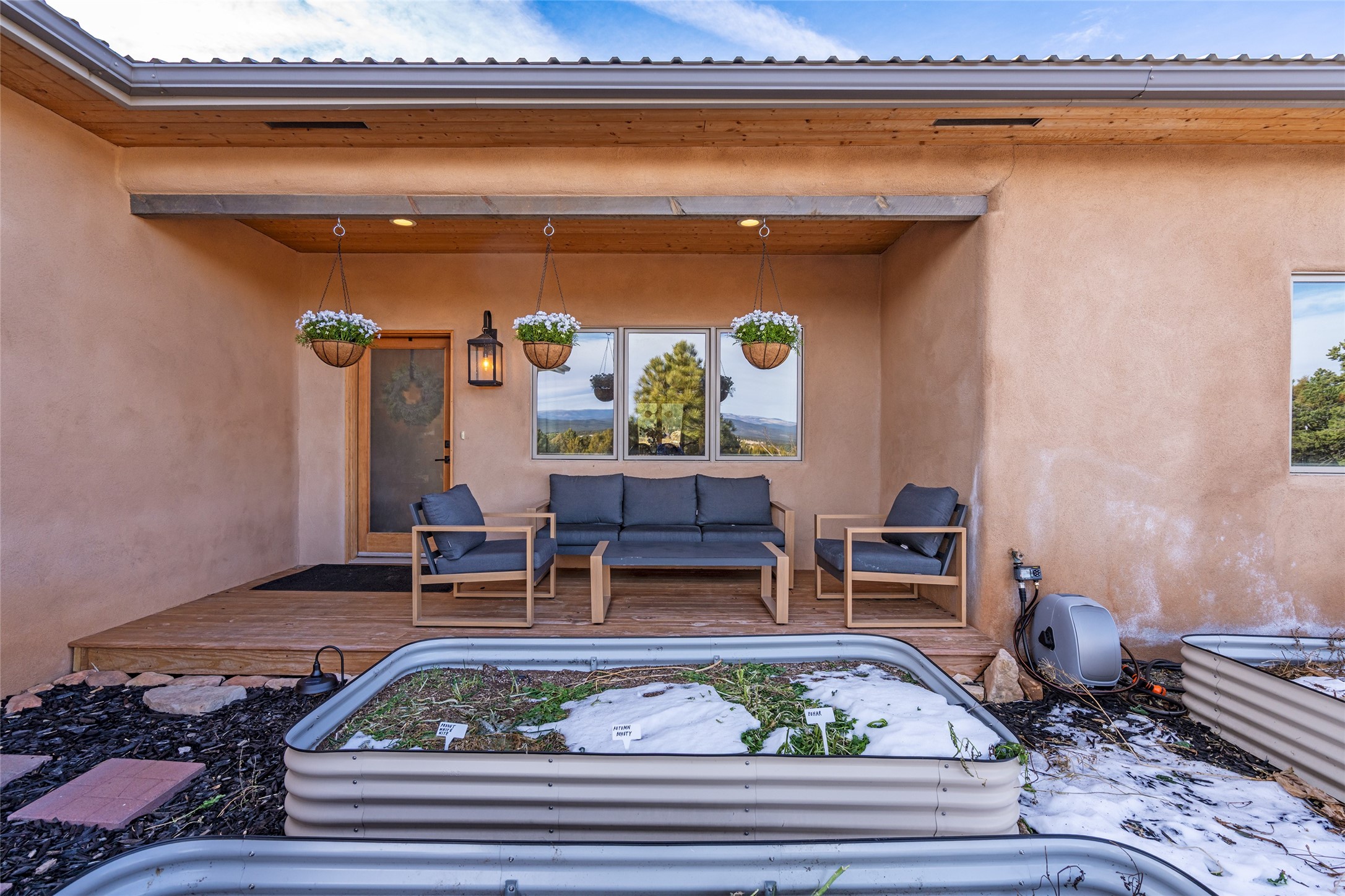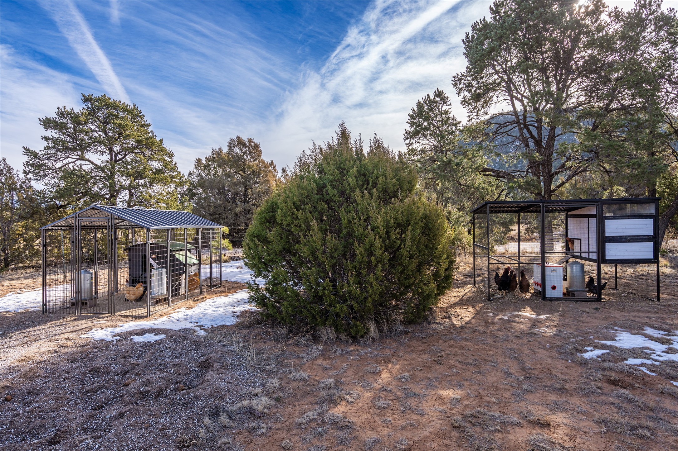 Located at the base of Rowe Mesa, this ranch-style home on nearly 4 Acres of flat useable land, offers wide skies, mountain views, and rural privacy all just 30 minutes from Santa Fe.Built in 2021, the custom residence provides exceptional comfort with a modern ranch style. A pitched propanel roof, classic stucco exterior, and warm natural finishes create an inviting, grounded feel throughout. Inside, the open-concept living and kitchen area is ideal for entertaining, with island seating, a pantry, and easy access to the attached two car garage. Brick floors, wood cabinetry, subway tile accents, and planked wood ceilings add texture and space, while three bedrooms and two baths provide flexible, comfortable living. Radiant heat and mini-splits ensure year-round comfort.Outside, the land truly shines. Mature fruit trees, thoughtfully tended garden beds, and two chicken coops support a slower, more self-sufficient lifestyle. Bordering the Santa Fe National Forest, the property offers direct access to nature, and unbounded recreation.With usable acreage and newer construction in a serene high-desert setting, this is a place to breathe deeply, spread out, and feel at home.