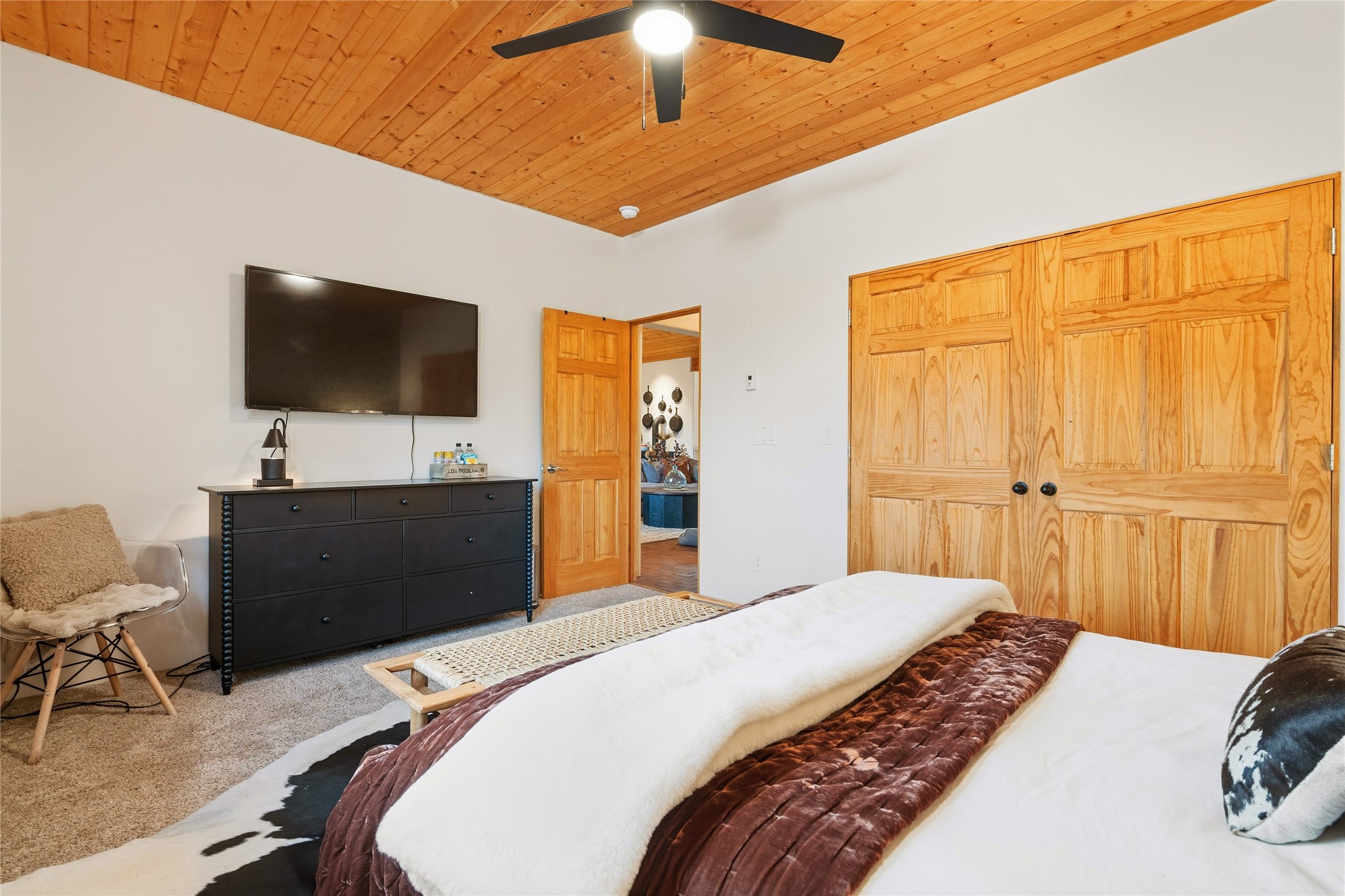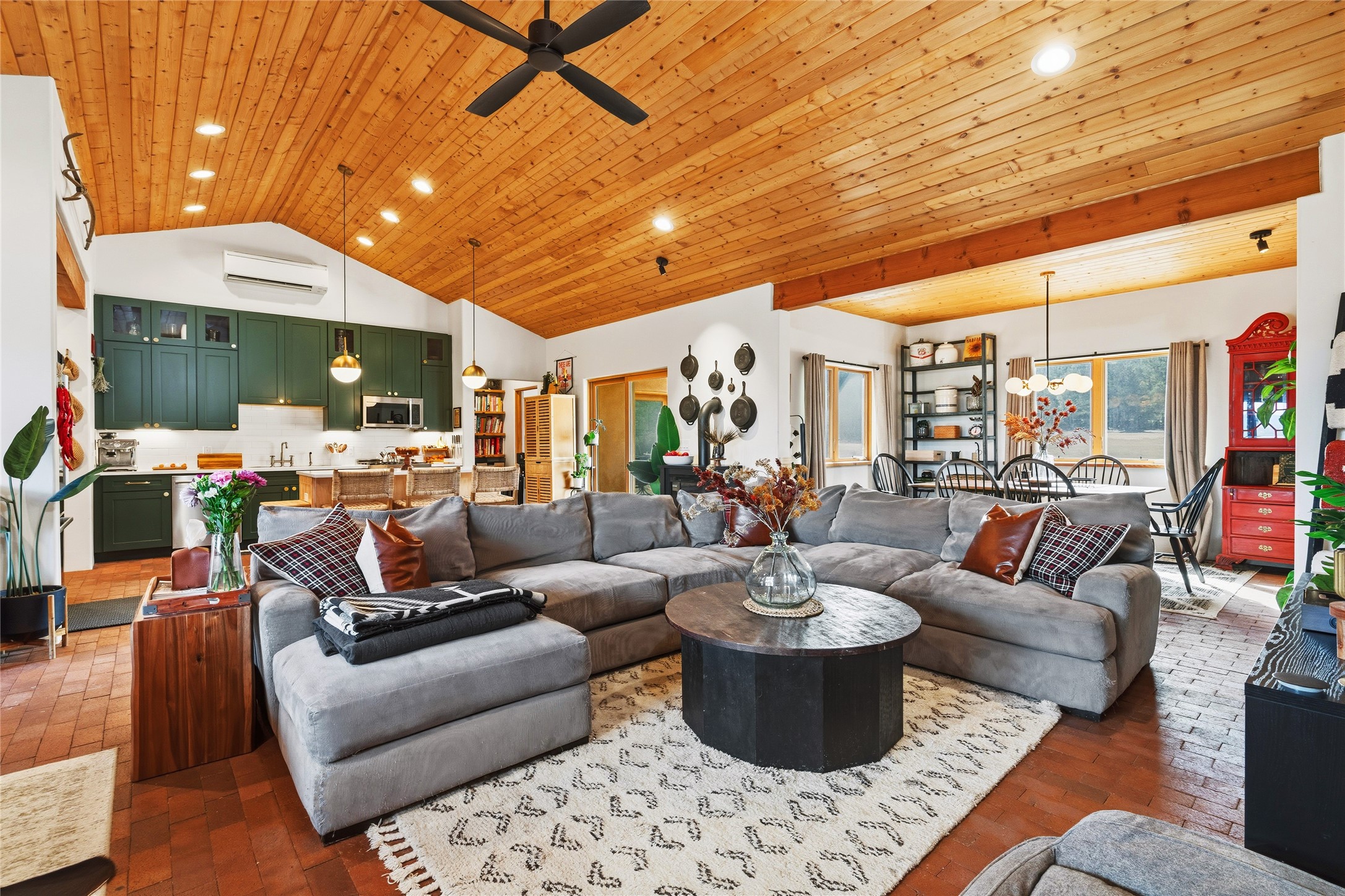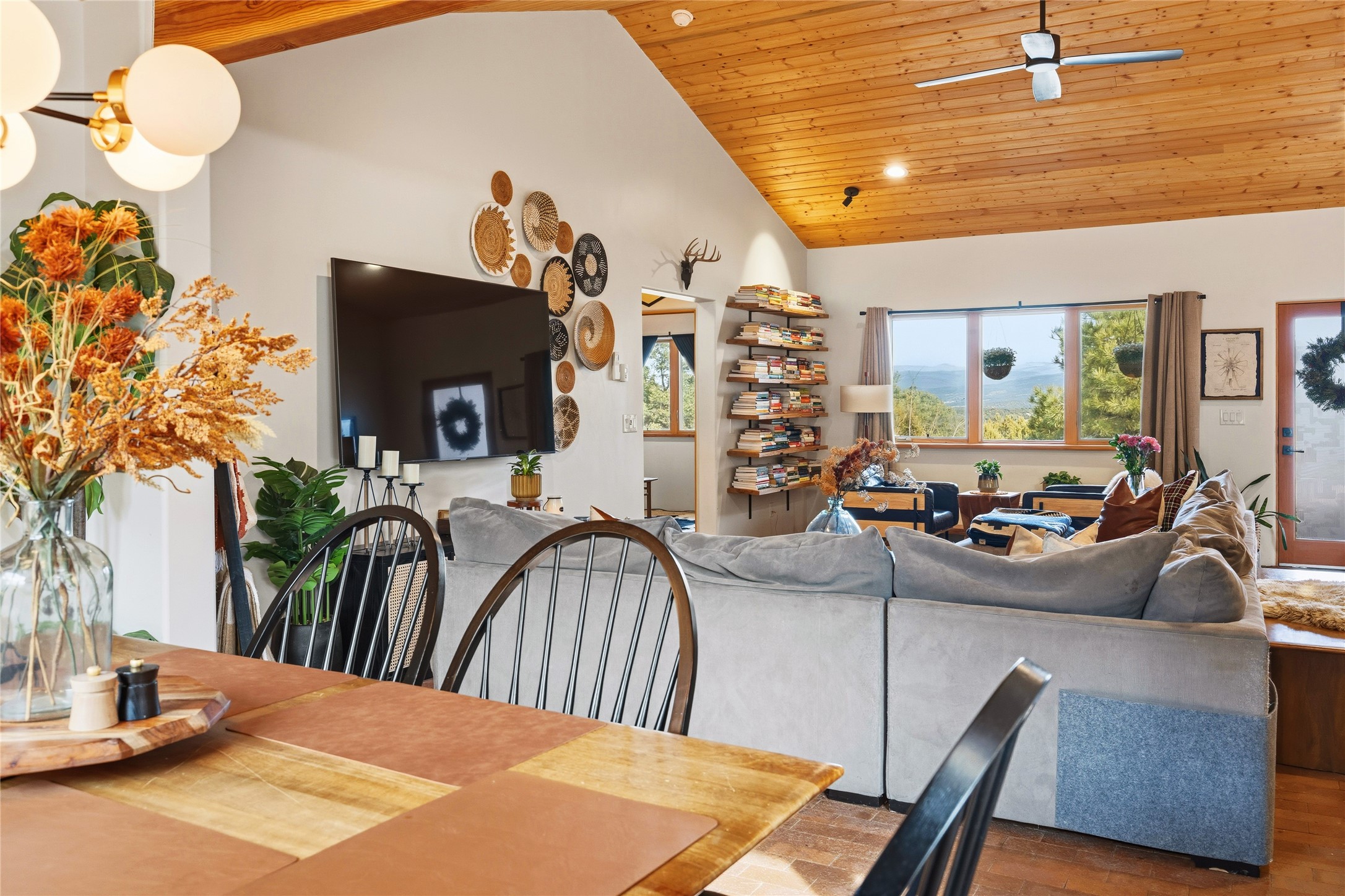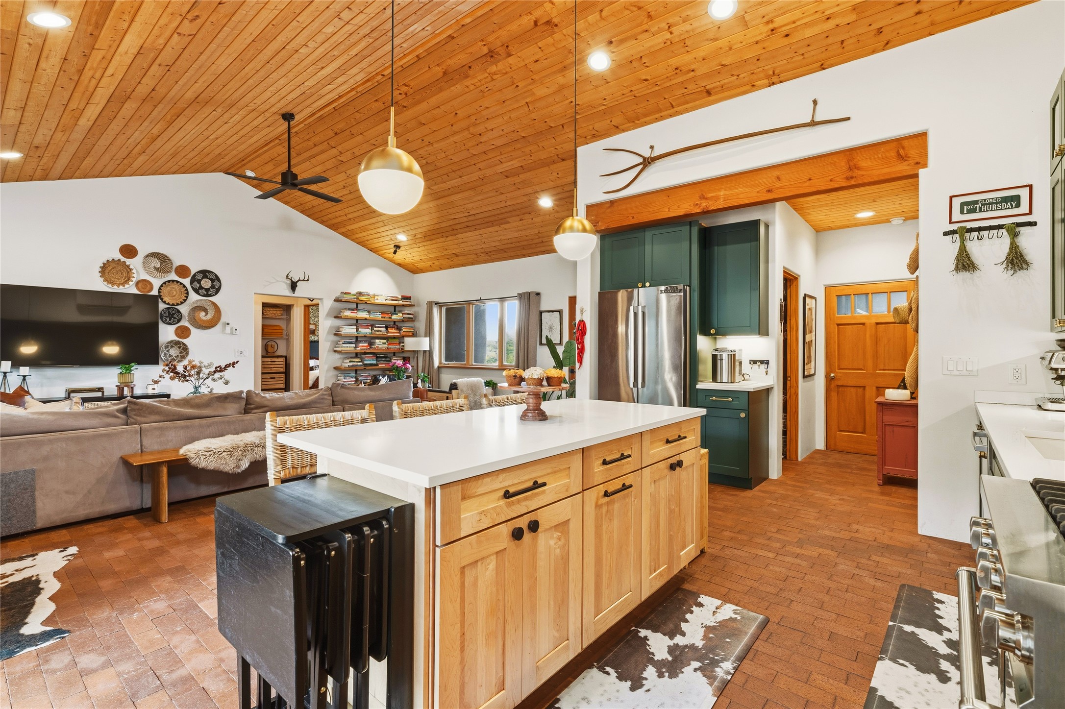Located at the base of Rowe Mesa, this ranch-style home on nearly 4 Acres of flat useable land, offers wide skies, mountain views, and rural privacy all just 30 minutes from Santa Fe.Built in 2021, the custom residence provides exceptional comfort with a modern ranch style. A pitched propanel roof, classic stucco exterior, and warm natural finishes create an inviting, grounded feel throughout. Inside, the open-concept living and kitchen area is ideal for entertaining, with island seating, a pantry, and easy access to the attached two car garage. Brick floors, wood cabinetry, subway tile accents, and planked wood ceilings add texture and space, while three bedrooms and two baths provide flexible, comfortable living. Radiant heat and mini-splits ensure year-round comfort.Outside, the land truly shines. Mature fruit trees, thoughtfully tended garden beds, and two chicken coops support a slower, more self-sufficient lifestyle. Bordering the Santa Fe National Forest, the property offers direct access to nature, and unbounded recreation.With usable acreage and newer construction in a serene high-desert setting, this is a place to breathe deeply, spread out, and feel at home.