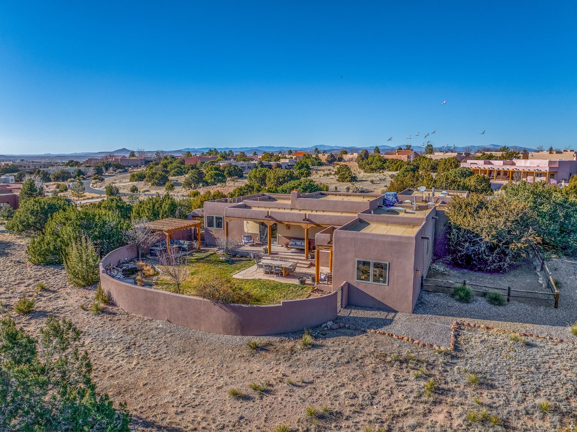 A rare opportunity in Rancho Viejo! This beautifully renovated single-level 4-bedroom, 3-bathroom home was built in 2002 and sits on 1.2 acres with sweeping views of the Sangre de Cristo foothills. Thoughtfully updated from top to bottom, every surface has been touched with care and high-quality craftsmanship.The open-concept floor plan offers effortless flow and versatility. A spacious living room with beautiful viga ceilings and a wood-burning kiva fireplace provides the perfect setting for entertaining. The fully reimagined kitchen features stone countertops, brand-new stainless steel appliances, and two islands--each with bar seating--while the adjacent dining area connects seamlessly to a cozy den with a gas fireplace, creating a warm and inviting gathering space.Step into the backyard and discover a private oasis: a large koi pond with water feature, covered portal with built-in grill, and a separate pergola with a gas firepit--perfect for relaxing or stargazing. The Rancho Viejo trail system is directly accessible from the yard.The primary suite enjoys stunning foothill views, a gas fireplace, direct access to the backyard portal, and the soothing sound of the water feature. The spa-like primary bath includes double vanities, a large walk-in shower, natural light, and garden views. Two guest bedrooms share a full bath in the South wing, while a third guest suite--located privately at the North end--shares a full bath that also serves as the guest powder room. A flexible bonus room near the living area functions beautifully as an office, hobby room, or reading nook.The show-stopper garage can be a 2-car garage with a very large storage area/workshop or a 3-car garage with storage/workshop! On the market for the first time, this home was custom built in 2002 for the current owners, who have lovingly maintained and recently renovated it with exceptional care. This is a rare find and a true Rancho Viejo treasure.