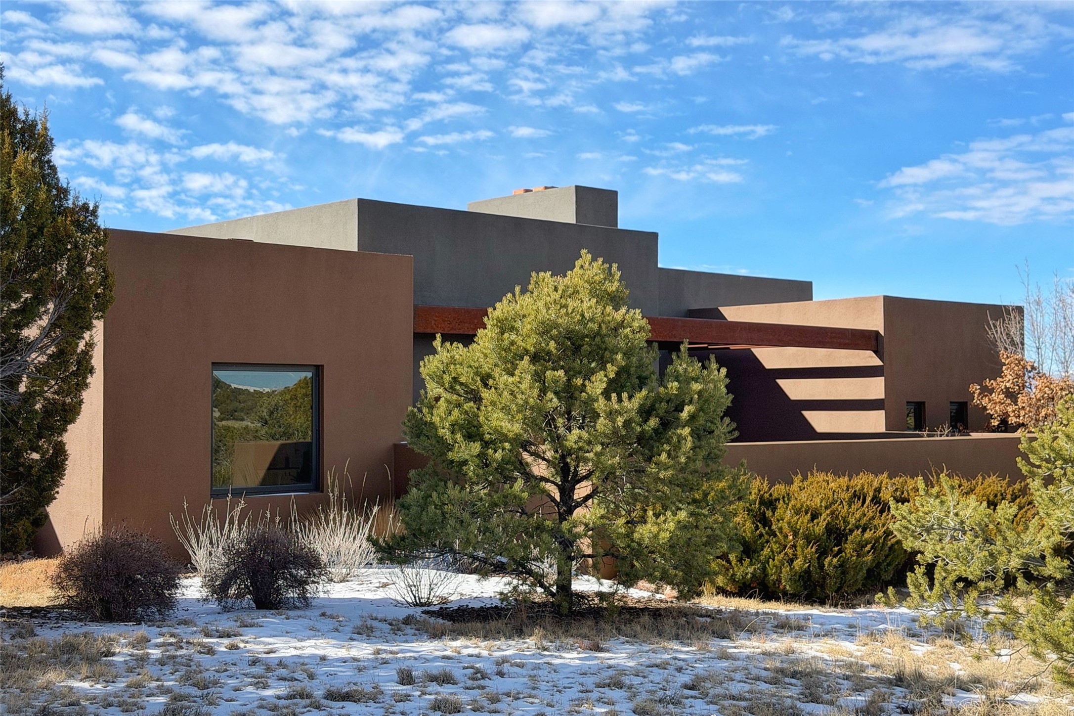 Designed by Robert Zachary and built using Rastra construction, this striking contemporary residence is a masterclass in modern design. The 2,149-square-foot main house offers two bedrooms, one and a half baths, and a thoughtfully designed office/den with custom built-ins just off the living area. An open-concept kitchen, living, and dining space anchors the home, showcasing a six-burner Wolf range and Sub-Zero refrigerator. Diamond plaster walls, polished concrete floors, and radiant in-floor heating run throughout. Expansive windows capture stunning northeast views from the living room. A detached 777-square-foot casita provides exceptional flexibility, featuring a kitchenette, living room, bedroom, and full bathroom. Outdoor living is refined with a southwest-facing patio for sunset enjoyment and a dedicated stargazing deck that highlights Santa Fe's renowned night skies. Completing the property is a three-car garage, offering ample space for vehicles and storage. Brand new septic and leach field (2026)