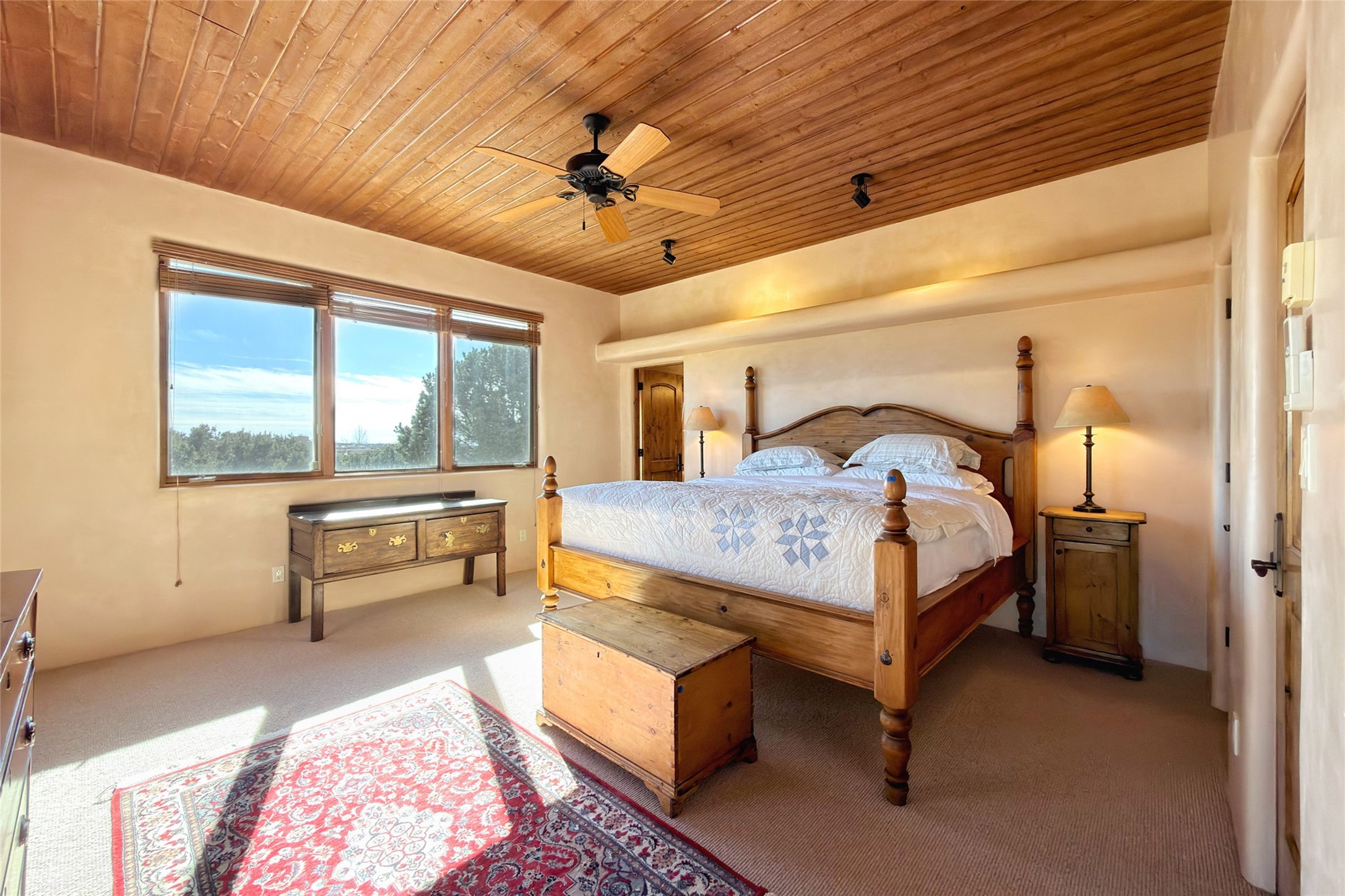 Welcome to this Pueblo Revival design home, where a beautifully landscaped courtyard featuring mature trees and a water feature usher you into a dramatic entry with immediate mountain vistas. The living room features a large wood-burning fireplace, oversized windows, and glass doors opening to a portal, perfectly positioned to capture breathtaking sunrise views. The dining room offers additional mountain views and opens to outdoor dining with a wood fireplace, brick floors, and vigas for timeless character. A gourmet kitchen showcases granite countertops, large center island with seating, full-size wine fridge, and a walk-in pantry. The kitchen opens up to a spacious family area, perfect as a breakfast nook or sitting area for casual gatherings. Retreat to a thoughtfully designed primary suite, in its own wing. Stay cozy with a fireplace, and direct access to the back portal. The spa-like primary bath includes a soaking tub surrounded by windows with views, stone tile finishes, a large walk-in shower, built-in wood cabinetry, and generous storage. A flexible adjoining room is ideal as a media space, private sitting room, or office. This room offers abundant natural light and direct, private exterior access. The home's layout provides excellent separation of spaces, with guest bedrooms on the opposite side for privacy. Both guest rooms open up to a secluded portal for peaceful mornings and relaxing evenings. Additional features include diamond plaster walls, exceptional natural light throughout, multiple fireplaces, vigas, and a prime setting that captures panoramic views. A rare opportunity to own a beautifully designed home that blends warmth, functionality, and breathtaking surroundings in coveted Las Campanas. The Club at Las Campanas offers two Jack Nicklaus Signature Golf Courses, tennis pickleball, world-class equestrian center, and spa & fitness center. Memberships to the Club at Las Campanas are available for purchase upon approval.
