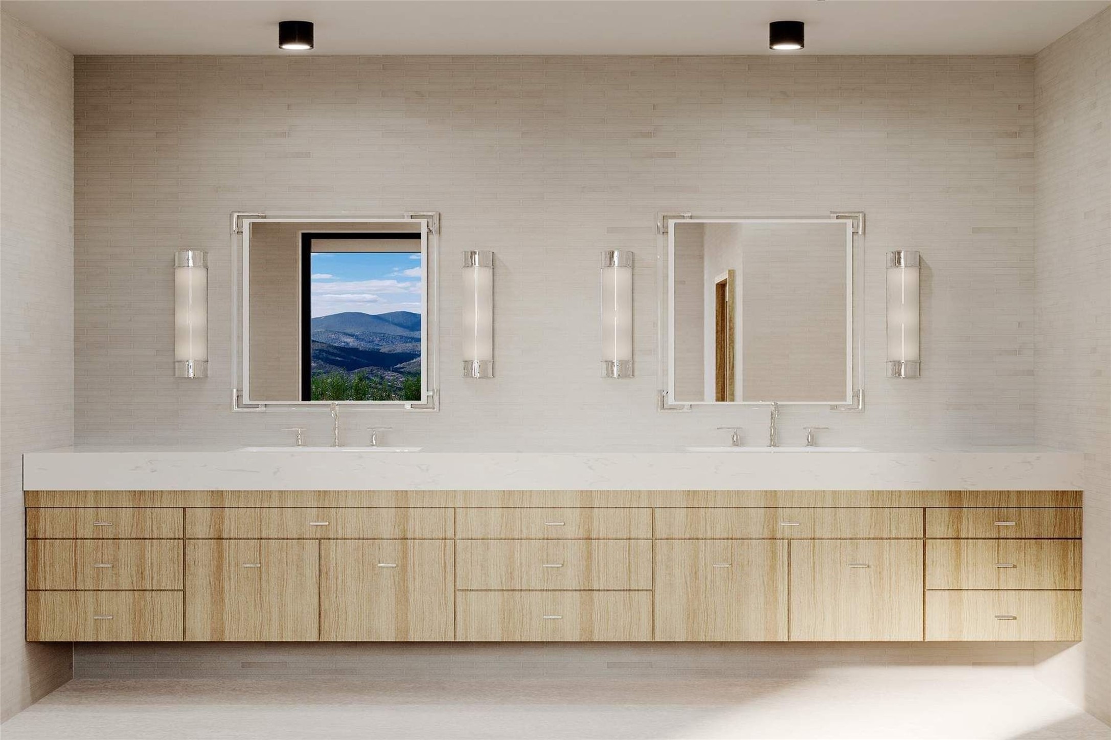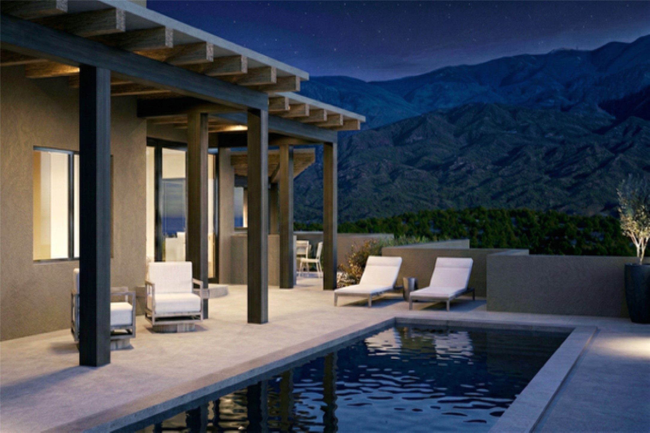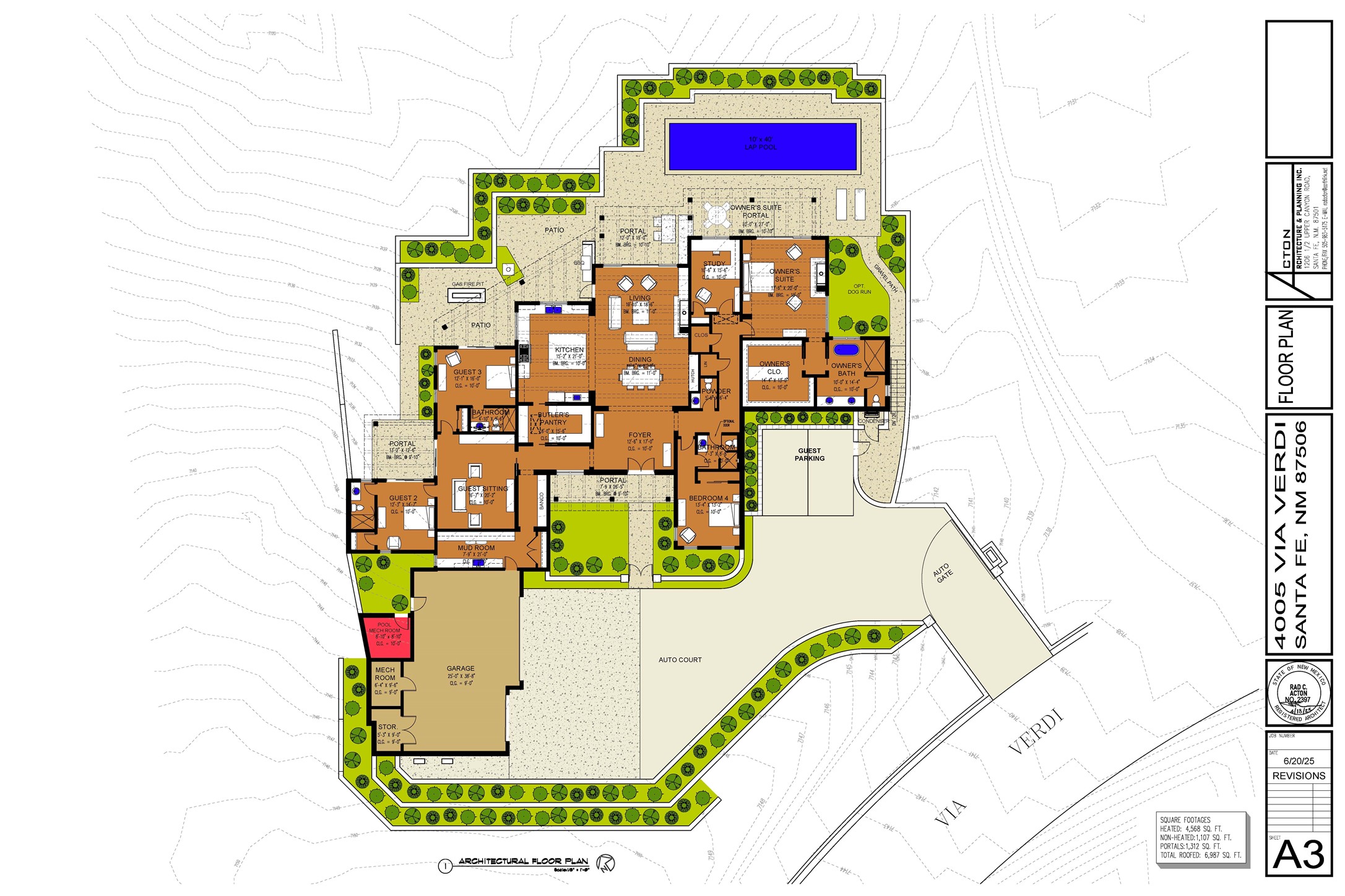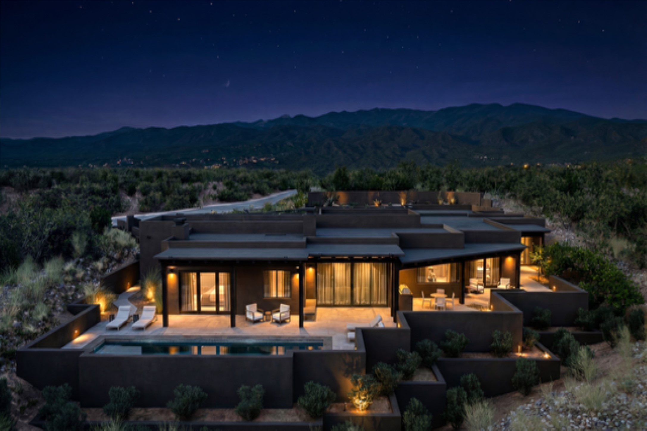 Experience the Ultimate Santa Fe lifestyle. Ready to build, with permit in hand, this To-Be-Built custom masterpiece by the award-winning Acacia Builders, excites with front row stunning views of the Sangre De Cristo Mountain. Located within the famed community of Monte Sereno, minutes to the Santa Fe Plaza and the world-renown Santa Fe Opera, this Monte Sereno home is one of the most captivating future residences in all of Santa Fe. Designed by renowned Santa Fe architect, Rad Acton, this stunning one-level home on a one-acre lot, offers an exquisite and rare four-bedroom floor plan tailored for indoor and outdoor living. The thoughtful design seamlessly flows and opens to over 1300 square feet of covered portals with a grilling station and an OPTIONAL pool, for both relaxation and the ultimate outdoor living experience. The walls of glass allow for the daily viewing of seasonal colors of the Aspen trees on the mountainside, the legendary sunsets and moonrises or step outside for stargazing under the dark skies of New Mexico. The smart design features a grand entertaining space with open dining and kitchen, a three-car garage, an office, four spacious bedroom suites and a second living room in the guest wing. The heart of the home is a gourmet kitchen with a corner window that Wows with a view! The chef in the household will be proud to host with a Wolf/Sub-Zero appliance package, a large island and full butler's pantry. The private primary retreat delights with expansive mountain views, a modern gas fireplace with concrete surround seating, and a sun-filled spa bathroom with a spacious walk-in closet. Additional exceptional features of this transitional style home with Santa Fe touches, include wood flooring, creamy plaster walls, wood beamed ceilings and multiple cozy fireplaces. With a building permit in place, the new owner can start construction quickly and save valuable time to focus on the fun of choosing colors & finishes on their dream home. All renderings are shown with furniture, art, lighting and rugs that can be purchased or modified for your lifestyle with the interior design team at Reverie3D who can offer a turn key move-in ready experience. The pool is not included in the listing price, though possible as an additional upgrade.