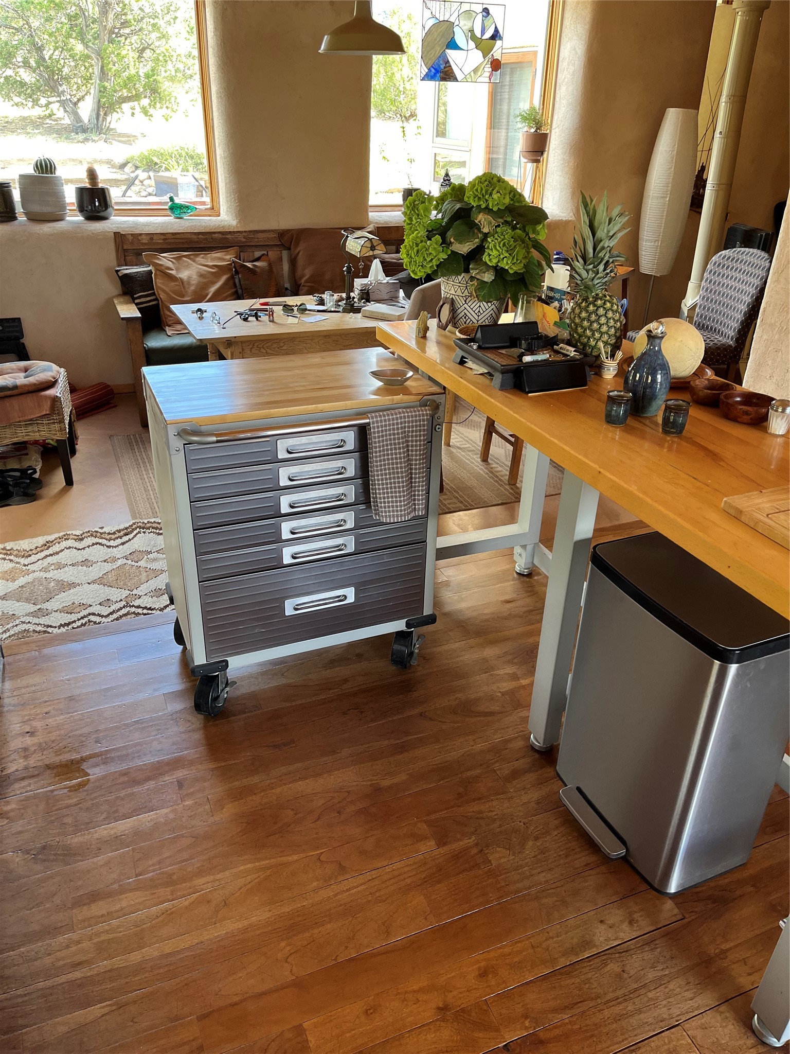 Thoughtfully designed and consciously placed, this off-grid straw bale home sits on approximately 10 acres in the Cerrillos/Madrid area, positioned to take full advantage of sweeping mountain views, privacy, and easy access. Located less than a quarter mile from Highway 14, the property offers a rare combination of seclusion and convenience. The main residence offers two bedrooms and a sunroom, high ceilings, abundant natural light, and an open, inviting layout. Interior details include teak and concrete flooring, an open kitchen, generous storage, and a large, well-lit bathroom. The home is served by a private well and septic system and is powered by its own PV solar system, designed for efficient off-grid living. A separate 800+/- sq ft artist's studio/barn adds exceptional versatility. The structure includes a full loft, a large sauna, brick flooring, oversized double doors opening to a secluded brick patio, and a viewing deck. This building offers flexible studio, workshop, or storage space and significant potential for future enhancement. The land is partially fenced and extends across Camino Cerro Chato, providing added privacy and multiple view corridors. Additional features include a horse pen and run-in shed, multiple outdoor seating areas that take in the surrounding landscape, and select furnishings, carpets, and tools that may convey with the sale. This is a distinctive property well-suited for buyers seeking privacy, creative space, and a sustainable lifestyle in one of Santa Fe County's most compelling high-desert settings.