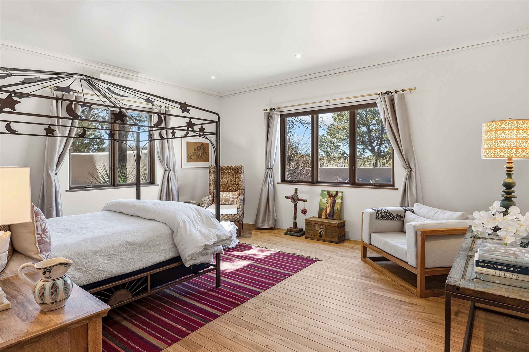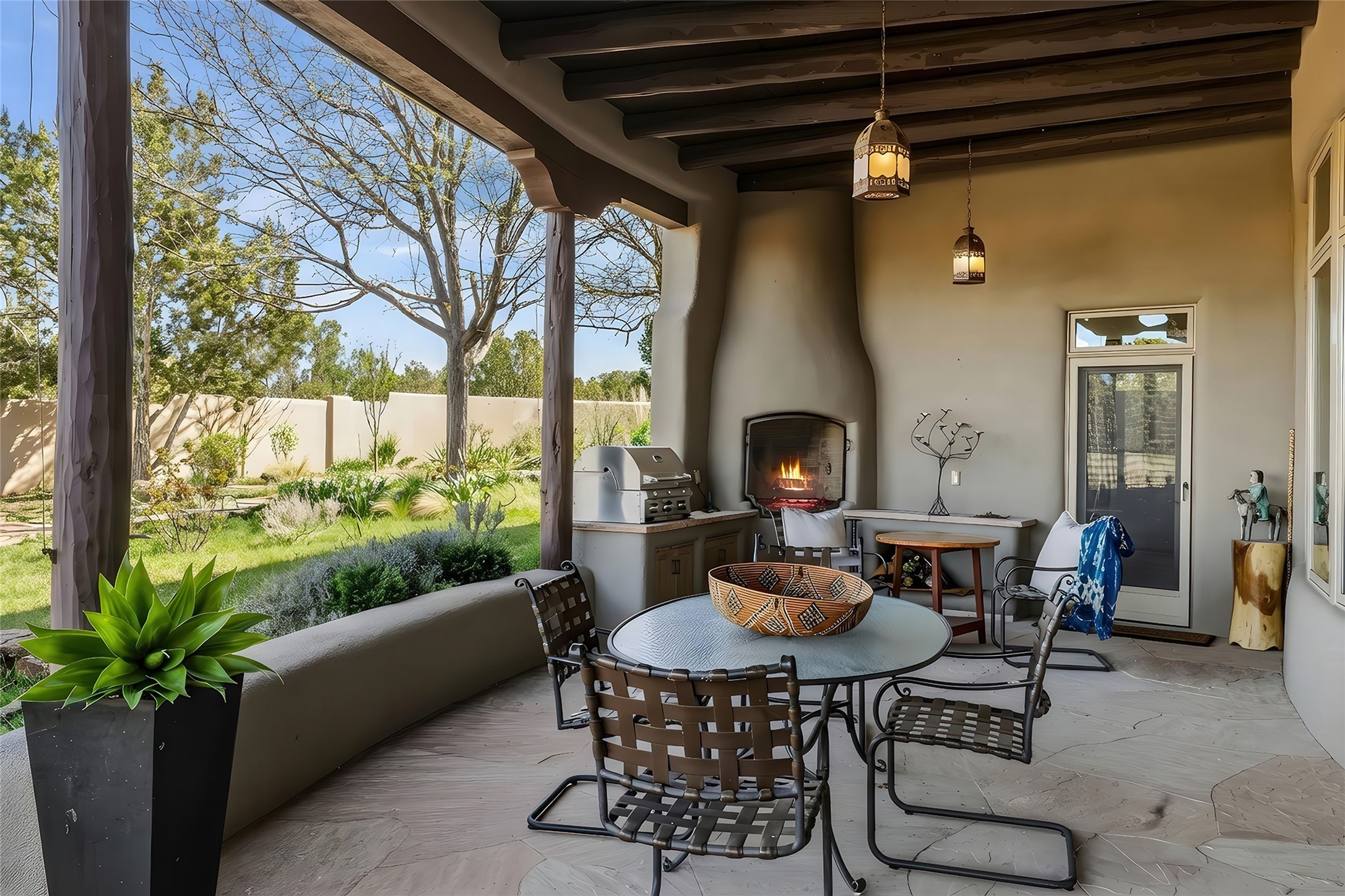 Welcome to 19 Falling Star, wherehigh desert luxury and sophistication is celebrated with this reimagined estate, where the quintessential Santa Fe lifestyle is realized through a seamless blend of soft contemporary design and Pueblo Revival elegance. Positioned at the end of a private cul-de-sac, this exceptional home offers an elevated living experience which excites with front row stunning views of the Sangre De Cristo and Jemez Mountain. Located within the famed communityofLas Campanas, this beautifully updated home impressesin scale with an intimate feel. The dramatic great room--characterized by architectural vigas, a centered fireplace, grand proportions, and a curve wall of view windows--serves as both a sophisticated art gallery and a tranquil retreat. The spacious chef's kitchen and grand dining area cater to the art of gracious entertaining, complete with high end appliances and a massive walk-in pantry. The owner's suite offers the ultimate luxury experience withprivate access to both the east sunrise patio and enclosed west gardens, a cozy kiva fireplace with a seating area, dual walk-in closets and a glamorous spa-like bath. Adjacent to the owner's suite is an ideal media room, grand office or guest bedroom with western, sunset views. Located off the main entrance is a generous, ensuite bedroom with a well-appointed full bath. An additional bonus room located off the main living area, offers a ideal over-flow guest room or exercise room option complete with an adjacent bathBeyond the interior, the home transitions into the ultimate outdoor retreat; a gated front courtyard with a granite water feature provides a serene arrival, while the expansive west portal frames thelegendary sunsets and mountain vistas. Complete with a versatile studio/workshop, this move-in-ready estate with new stucco in 2025, captures the soul of the Southwest with a modern, sophisticated edge.