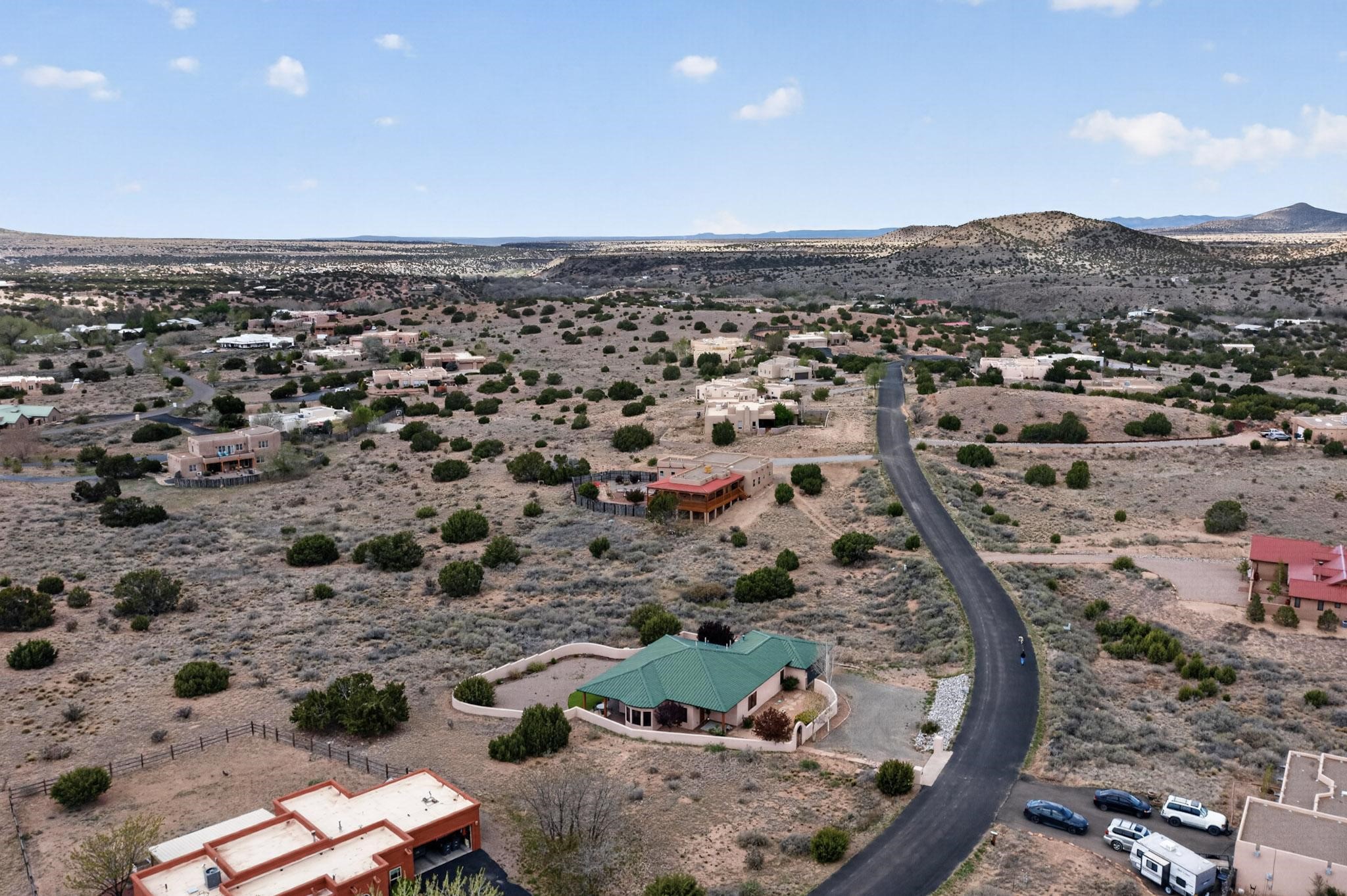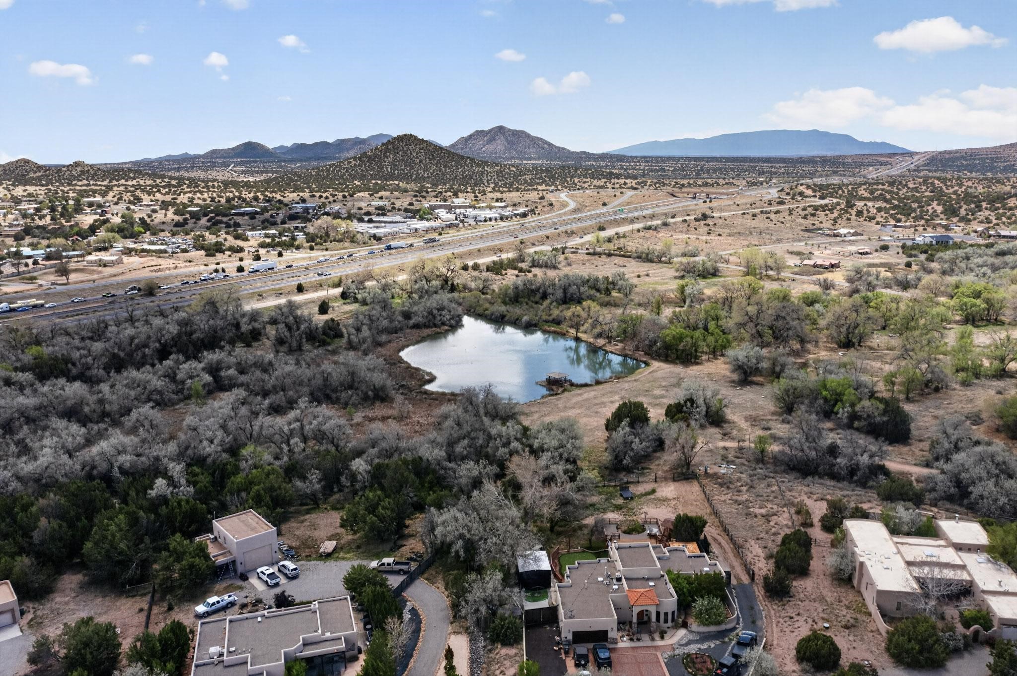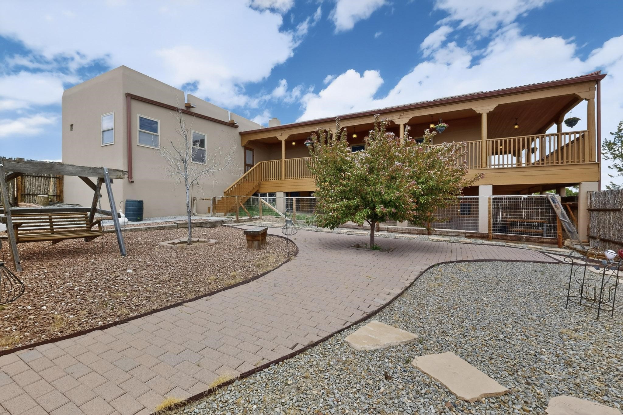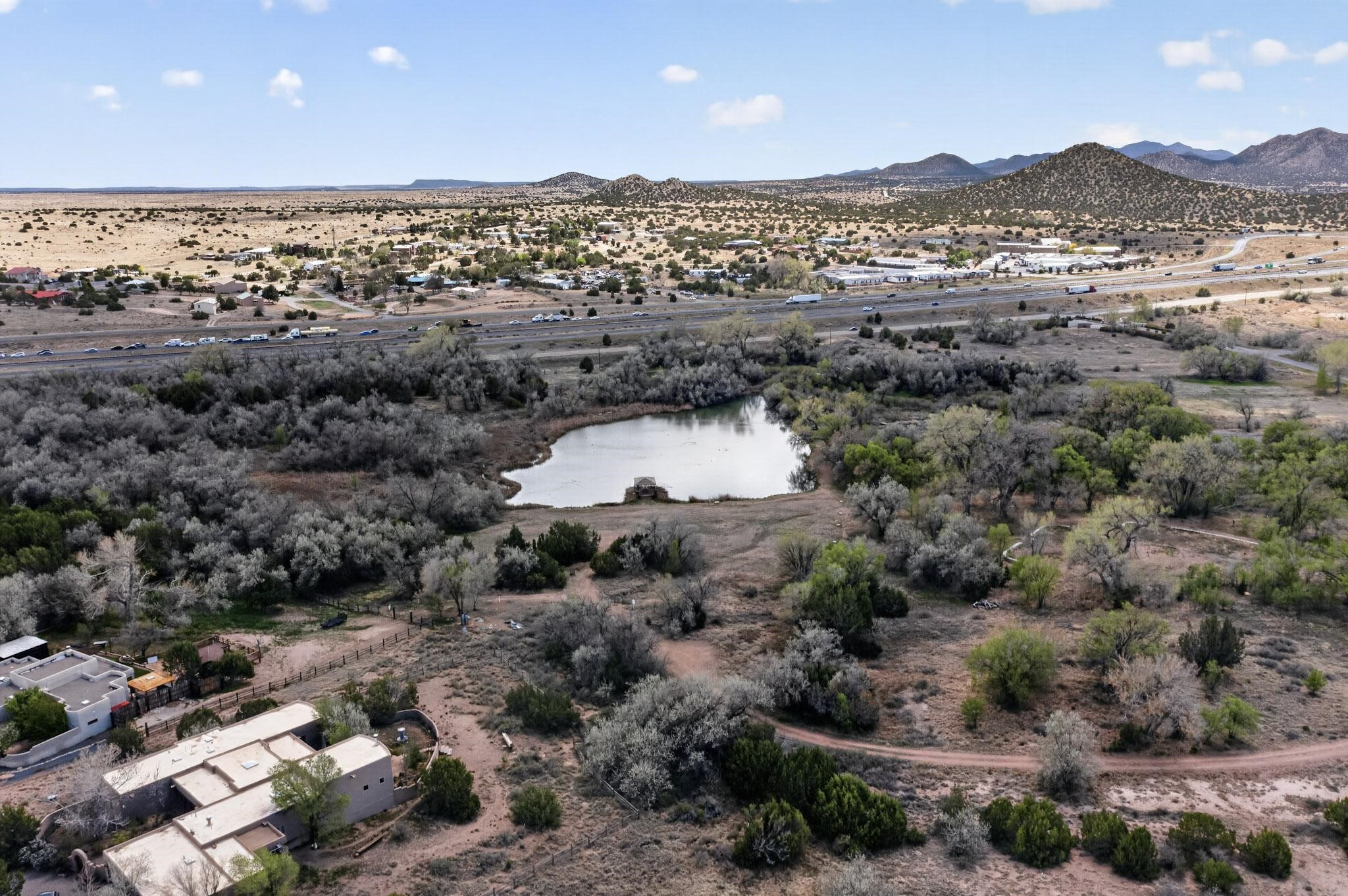 Nestled within the highly sought after gated community of Las Lagunitas with spacious lot sizes, this exceptional three bedroom two bath custom home on 1.36 acres embodies the perfect blend of refined Santa Fe comfort and elegance. Thoughtfully designed with a oversized two car garage and open concept layout, the spacious kitchen flows seamlessly into the dining and living room area and is ideal for both entertaining and everyday comfort. This single level residence features three oversized bedrooms and two bathrooms the Primary bedroom has a large jetted tub large walk in closet and a snail shower served up with instant hot water. This home features a stunning wraparound porch that captures the most picturesque elevated clear scenic views from all sides, both sunrise and sunset views are spectacular. Inside you will find a refined diamond plaster finish throughout the entire home, a water softener and large tile flooring that creates a clean and sophisticated look. The inviting living room features a charming kiva fireplace, tall ceilings and vigas that add warmth and authentic Santa Fe character to the space and has been well kept and loved by one family since being built! A large well maintained back yard with a beautifully built coyote fence made for privacy and ready for your entertainment. This home features a large crawlspace under the home that can be used for storage. Enjoy beautifully maintained common areas and landscaped grounds of Las Lagunitas, perfect for peaceful tranquil walks with your dog alongside serene ponds where fishing is also allowed offering a true connection to nature. Easy access to I-25