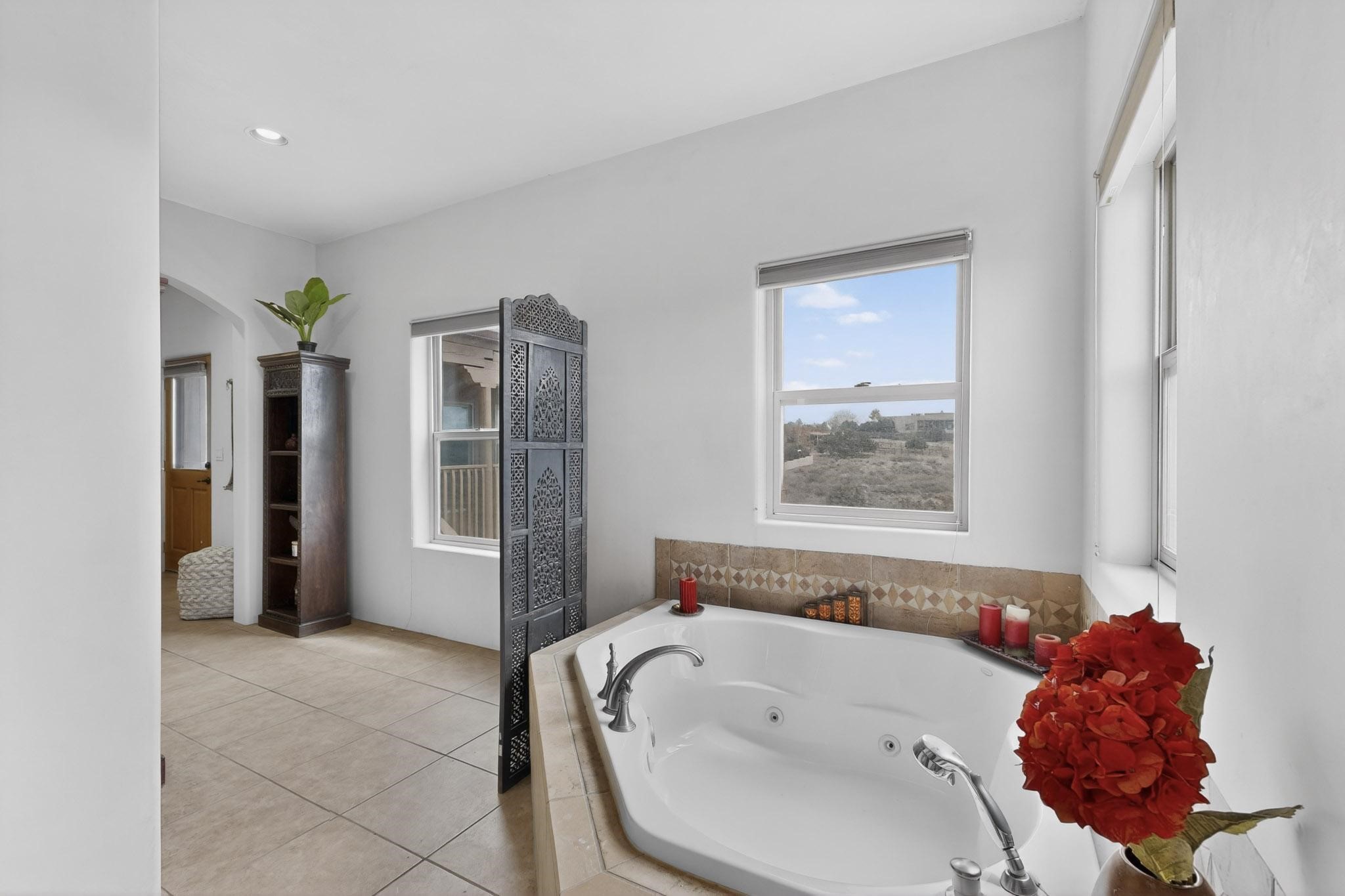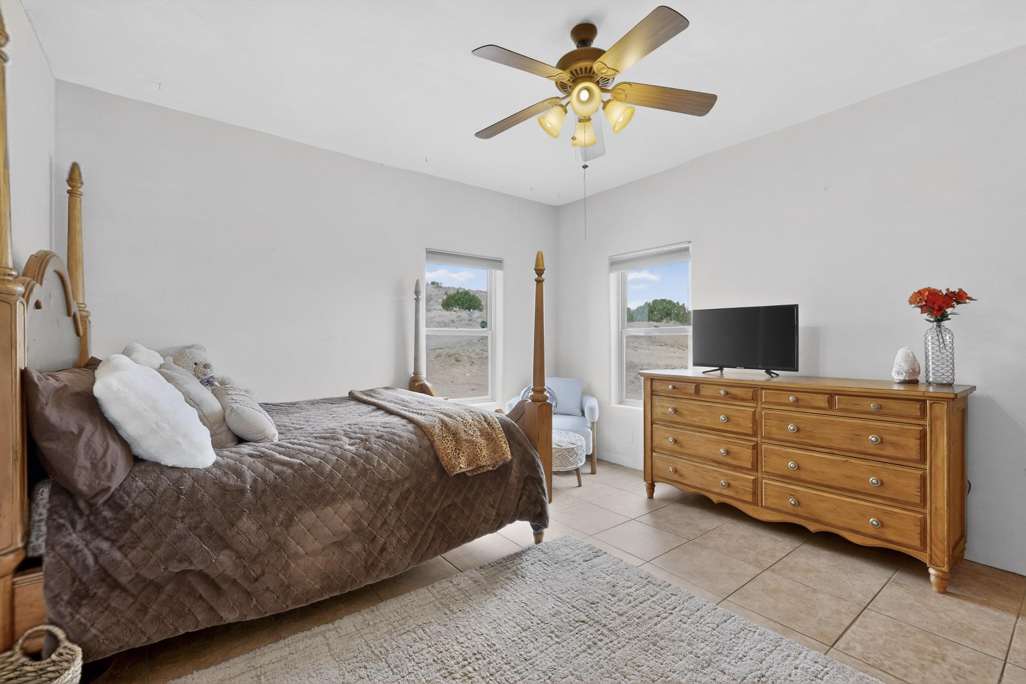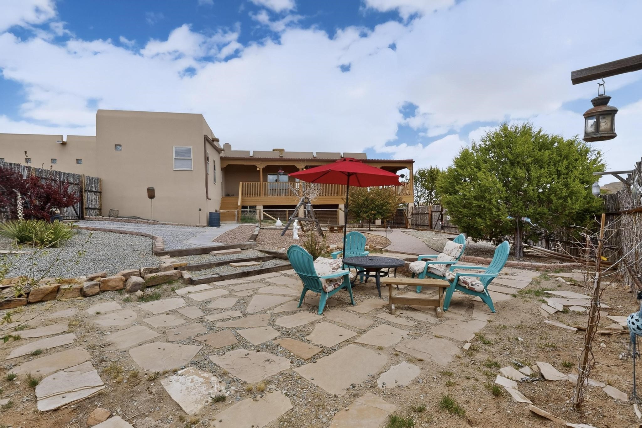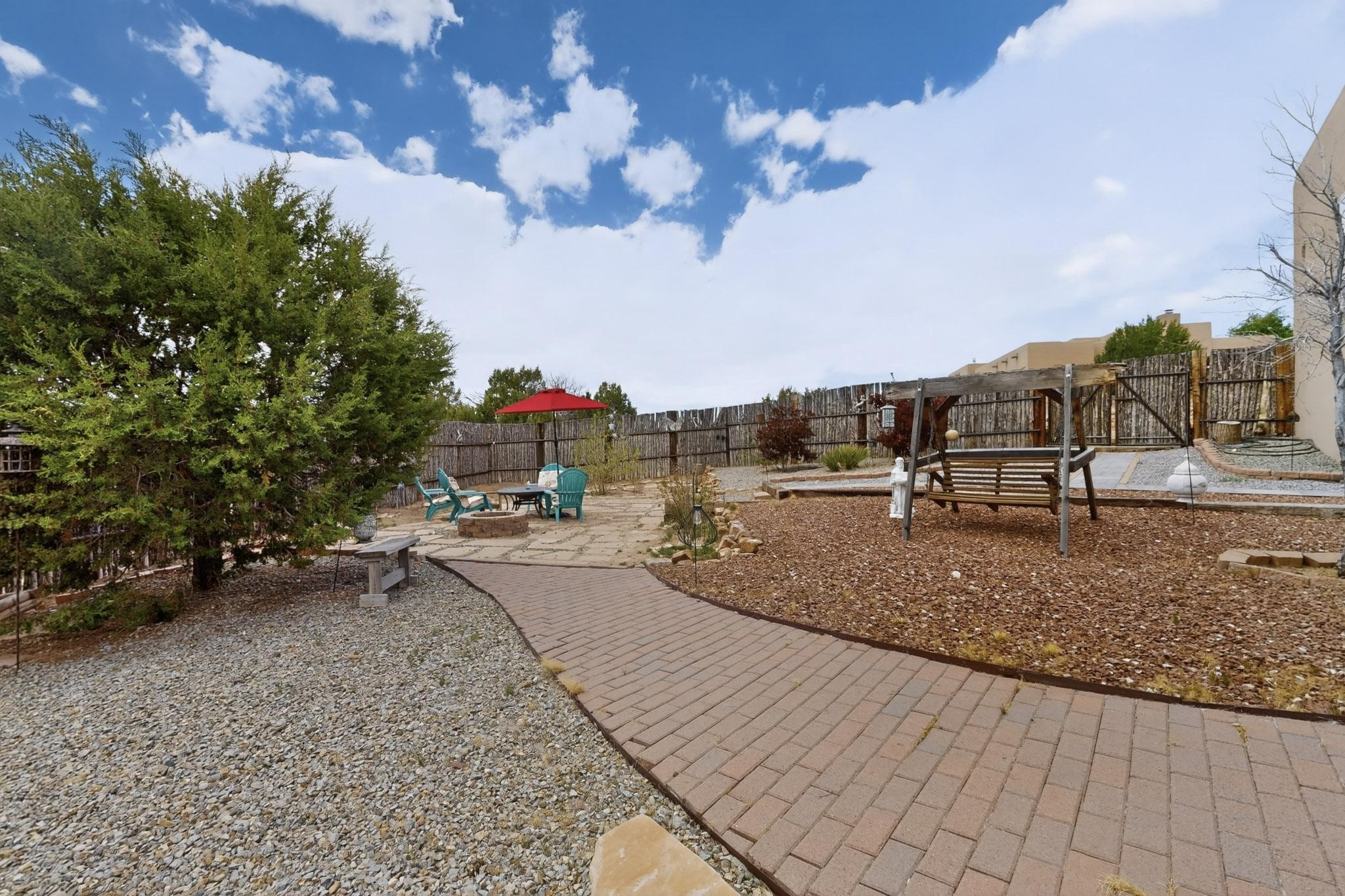 Nestled within the highly sought after gated community of Las Lagunitas with spacious lot sizes, this exceptional three bedroom two bath custom home on 1.36 acres embodies the perfect blend of refined Santa Fe comfort and elegance. Thoughtfully designed with a oversized two car garage and open concept layout, the spacious kitchen flows seamlessly into the dining and living room area and is ideal for both entertaining and everyday comfort. This single level residence features three oversized bedrooms and two bathrooms the Primary bedroom has a large jetted tub large walk in closet and a snail shower served up with instant hot water. This home features a stunning wraparound porch that captures the most picturesque elevated clear scenic views from all sides, both sunrise and sunset views are spectacular. Inside you will find a refined diamond plaster finish throughout the entire home, a water softener and large tile flooring that creates a clean and sophisticated look. The inviting living room features a charming kiva fireplace, tall ceilings and vigas that add warmth and authentic Santa Fe character to the space and has been well kept and loved by one family since being built! A large well maintained back yard with a beautifully built coyote fence made for privacy and ready for your entertainment. This home features a large crawlspace under the home that can be used for storage. Enjoy beautifully maintained common areas and landscaped grounds of Las Lagunitas, perfect for peaceful tranquil walks with your dog alongside serene ponds where fishing is also allowed offering a true connection to nature. Easy access to I-25