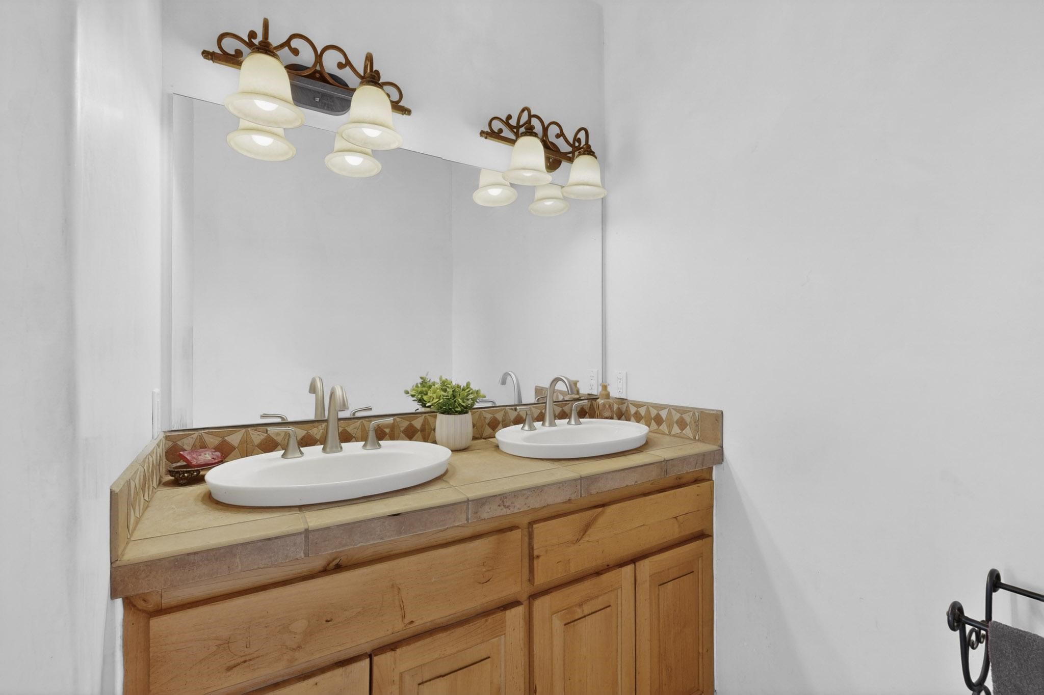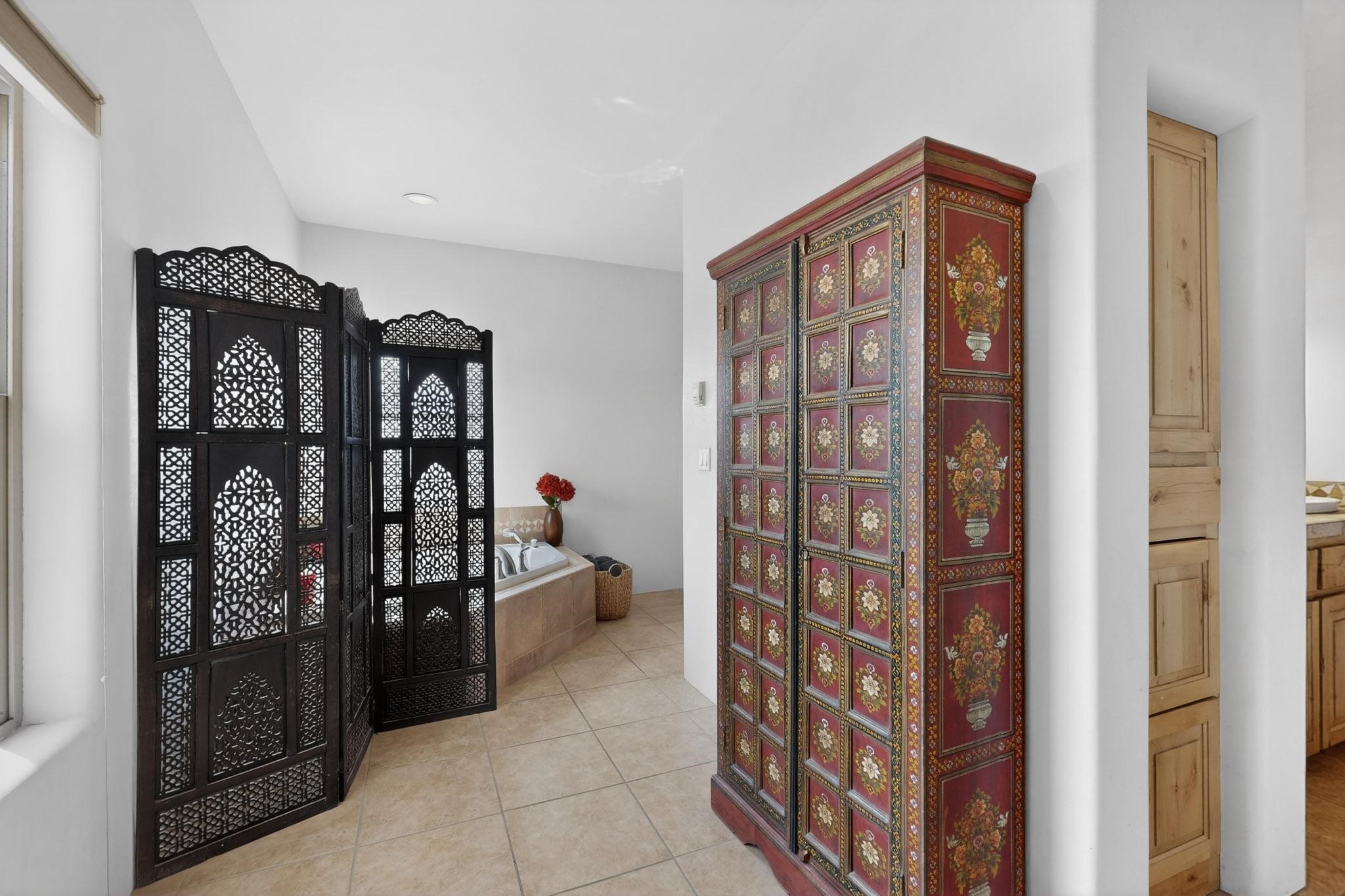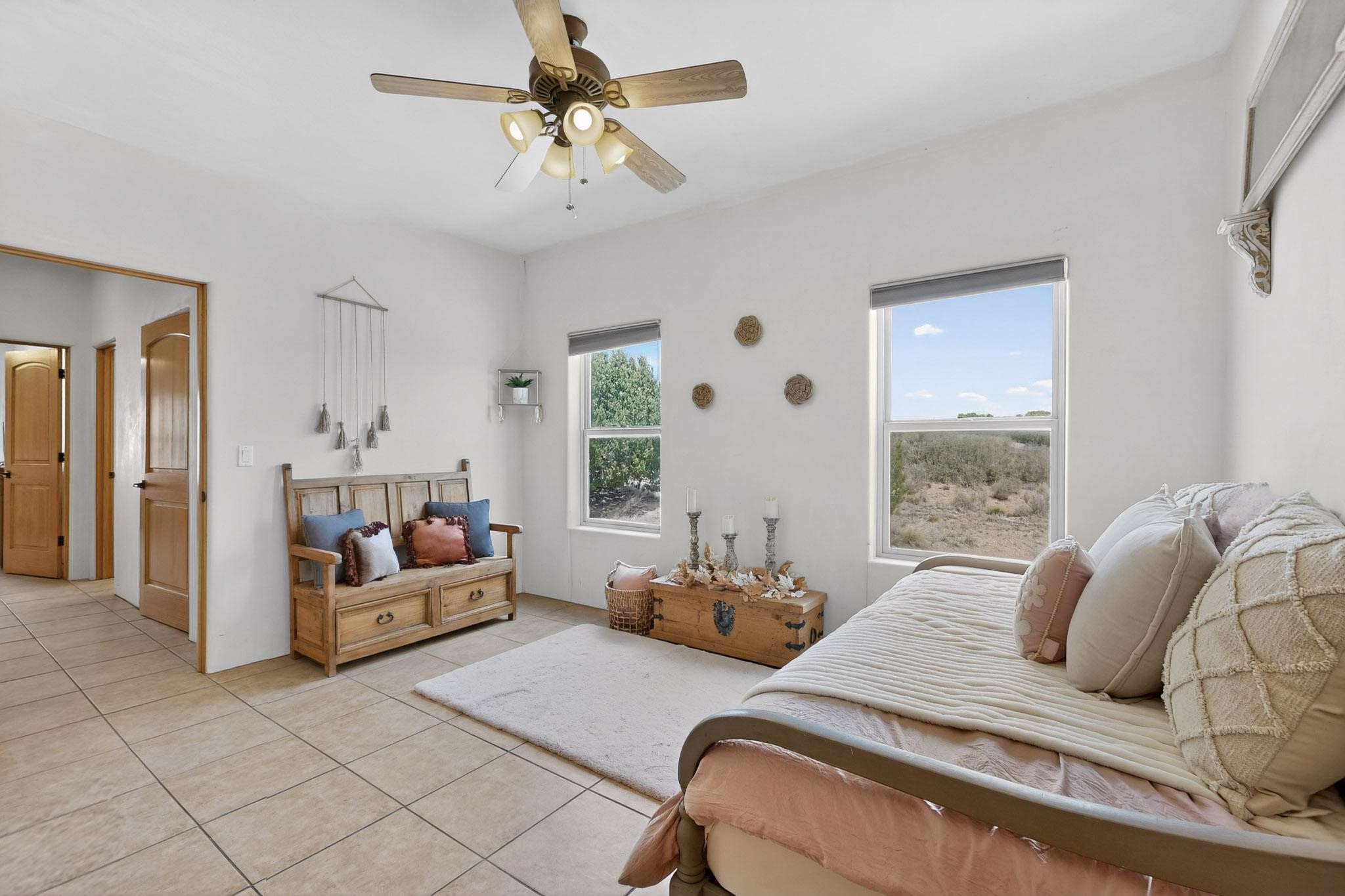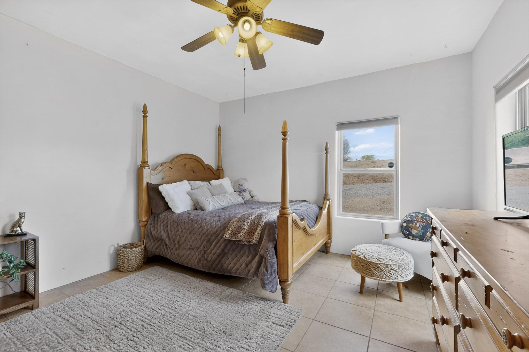 Nestled within the highly sought after gated community of Las Lagunitas with spacious lot sizes, this exceptional three bedroom two bath custom home on 1.36 acres embodies the perfect blend of refined Santa Fe comfort and elegance. Thoughtfully designed with a oversized two car garage and open concept layout, the spacious kitchen flows seamlessly into the dining and living room area and is ideal for both entertaining and everyday comfort. This single level residence features three oversized bedrooms and two bathrooms the Primary bedroom has a large jetted tub large walk in closet and a snail shower served up with instant hot water. This home features a stunning wraparound porch that captures the most picturesque elevated clear scenic views from all sides, both sunrise and sunset views are spectacular. Inside you will find a refined diamond plaster finish throughout the entire home, a water softener and large tile flooring that creates a clean and sophisticated look. The inviting living room features a charming kiva fireplace, tall ceilings and vigas that add warmth and authentic Santa Fe character to the space and has been well kept and loved by one family since being built! A large well maintained back yard with a beautifully built coyote fence made for privacy and ready for your entertainment. This home features a large crawlspace under the home that can be used for storage. Enjoy beautifully maintained common areas and landscaped grounds of Las Lagunitas, perfect for peaceful tranquil walks with your dog alongside serene ponds where fishing is also allowed offering a true connection to nature. Easy access to I-25