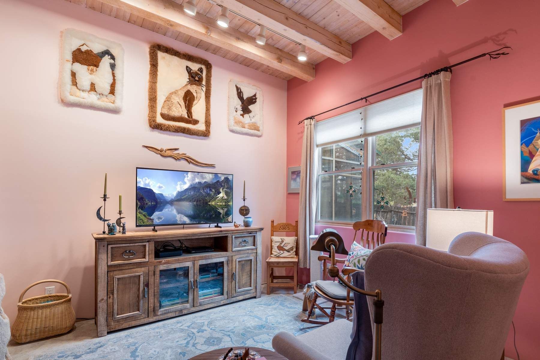 Tucked within the quiet gates of Belicia Estates, this Pueblo-style home feels like a peaceful retreat, deeply connected to the natural beauty of Santa Fe. The one-owner home holds a warmth and authenticity with a thoughtful layout that includes 3 bedrooms, 2 bathrooms and an array of additional living spaces throughout. This single-level floor plan is both flexible and inviting. Soft natural light filters through multiple skylights, brightening the living areas and creating a gentle, uplifting glow throughout the day. Vigas and beams draw the eye upward, tile floors stay warm with radiant heat, and a traditional kiva fireplace anchors the heart of the home with a comforting presence. Two welcoming sunrooms offer year-round enjoyment - perfect for morning moments, quiet reading afternoons, or simply watching the sky shift across the high desert. Step outside, and the true magic of Belicia Estates reveals itself. One sunroom opens to a coyote-fenced back yard, providing a secure outdoor space. The other leads to a stone pathway that connects to the natural open area surrounding the property. Located in a serene part of the neighborhood, the home offers privacy, calmness, and a daily connection to the land - one of the most treasured aspects of living in this community. Additional comforts include a 2-car garage and newer appliances - dishwasher, refrigerator, washer, and dryer - all replaced within the last five years. This home is more than its features. It's a place where sunlight pours in from above, nature is ever-present, and time seems to slow just enough to savor the simple moments. A sanctuary indeed in the Land of Enchantment.
