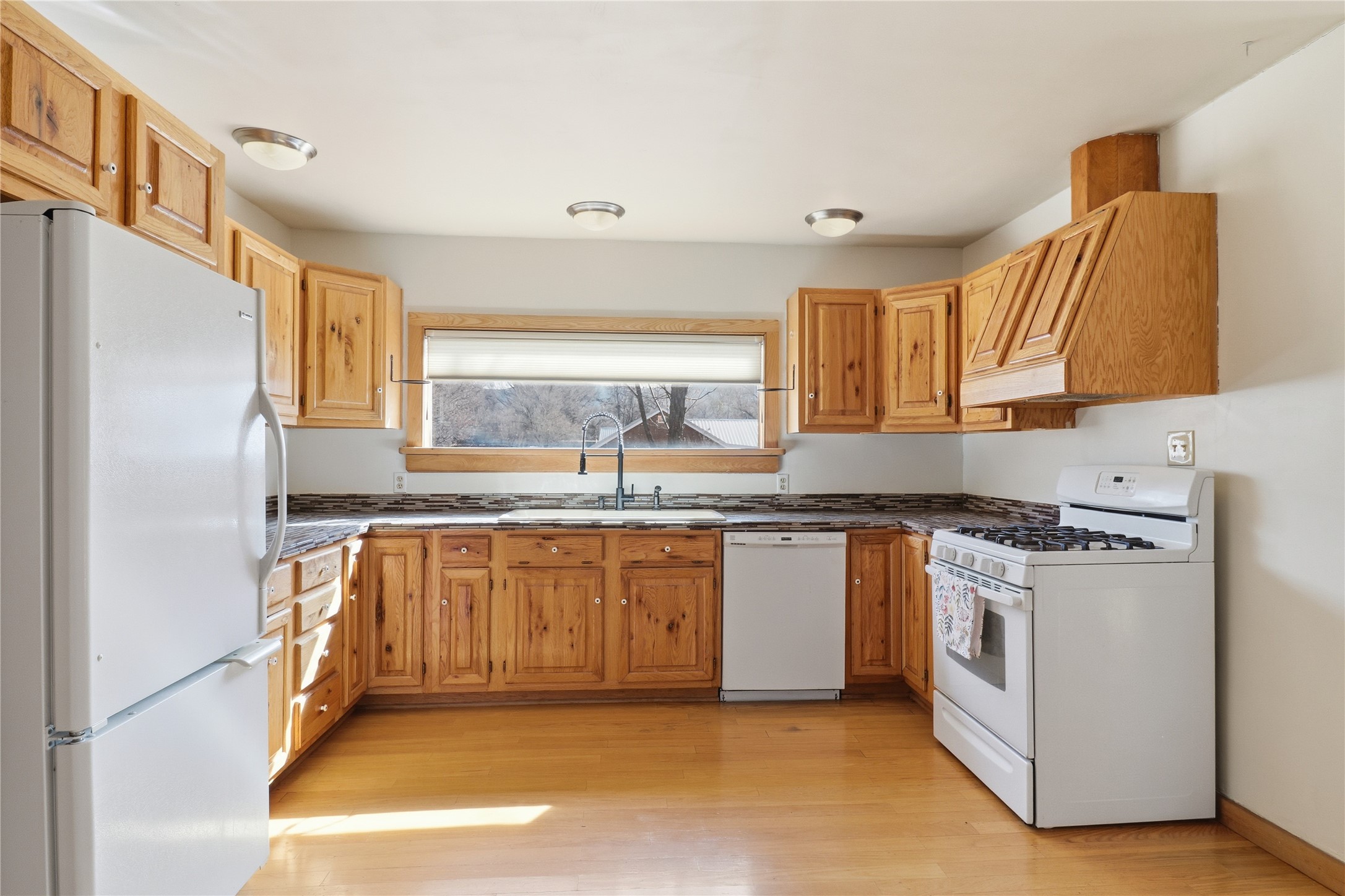 This charming DUPLEX at 104 Guthrie Lane #A & B, Taos, NM 87571 offers an exceptional opportunity for comfortable living with strong income-producing potential in a prime location just minutes from the center of Taos.The main house (#B) features a spacious eat-in kitchen with a separate pantry, lovely tile countertops, and serene garden views. The primary bedroom features cork flooring and an ensuite bathroom with beautiful tile accents. A second bedroom provides easy backyard access via a sliding glass door, a generous closet, and shares a full hall bath. The expansive living room showcases gorgeous wood floors and a cozy kiva fireplace, opening directly onto a large back deck perfect for relaxing or entertaining. An additional flexible living/multi-purpose room includes the washer/dryer and abundant space for a home office or studio.The attached guest house (#A) has proven itself as a reliable rental unit for years, delivering steady income. It features beautiful natural light, tile flooring, a fireplace, 2 bedrooms, a delightful 4-season sunroom, a fenced private courtyard, and its own storage shed--ideal for guests, long-term tenants, or vacation rentals.Outside, enjoy a large, fully fenced backyard--a gardener's dream with ample space for planting, outdoor activities, or pets. A large detached oversized 2-car garage provides plenty of room for vehicles, workshops, projects, or extra storage.Sited on a generous corner lot (approximately half a acre) in a peaceful cul-de-sac, this property offers tranquility while being conveniently close to Taos' shops, restaurants, galleries, and cultural attractions.Whether you're seeking a primary residence with guest/income suite, a multi-generational setup, or an investment property with built-in rental history, this property has it covered. Don't miss this rare combination of space, charm, and location!