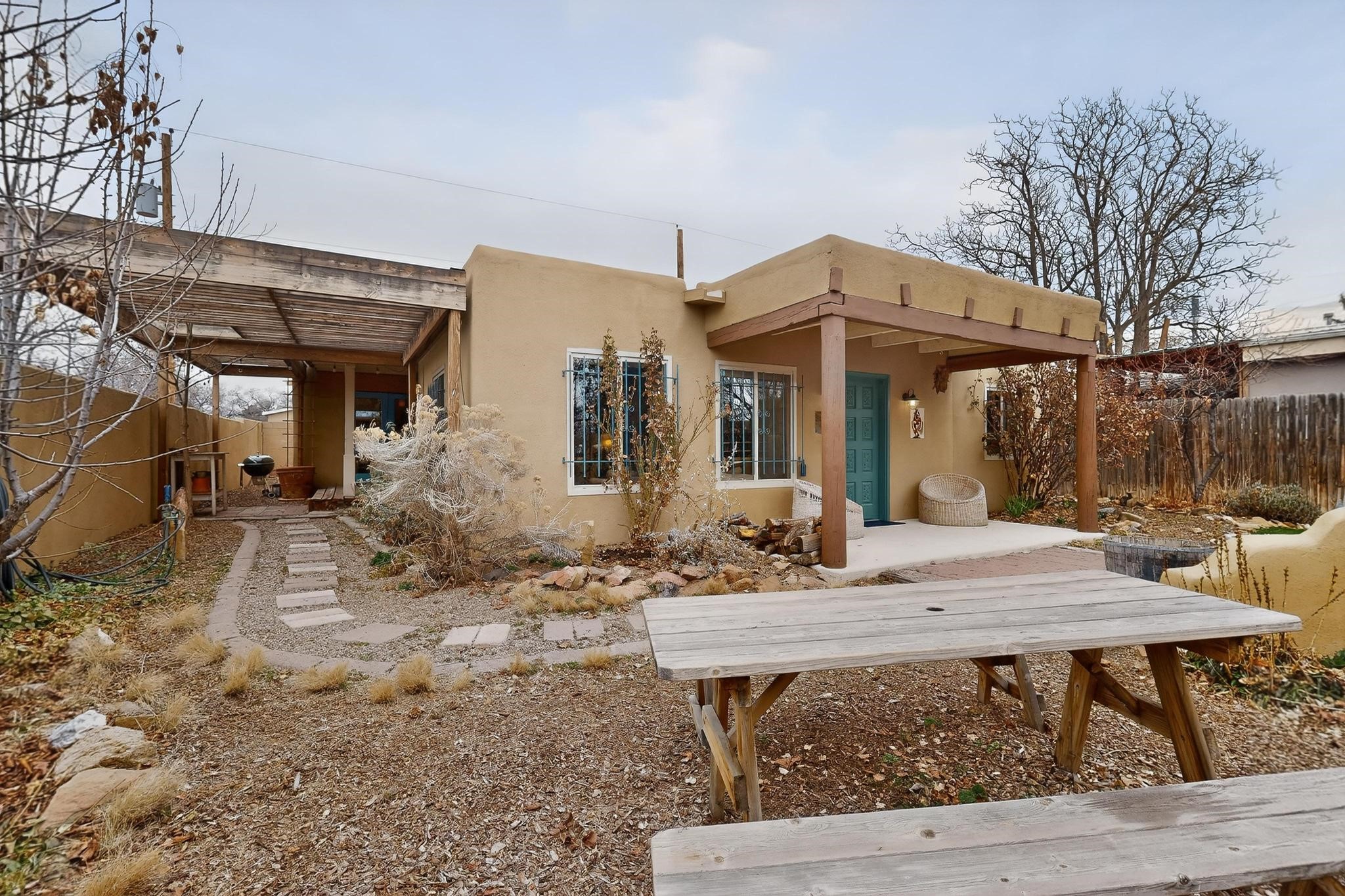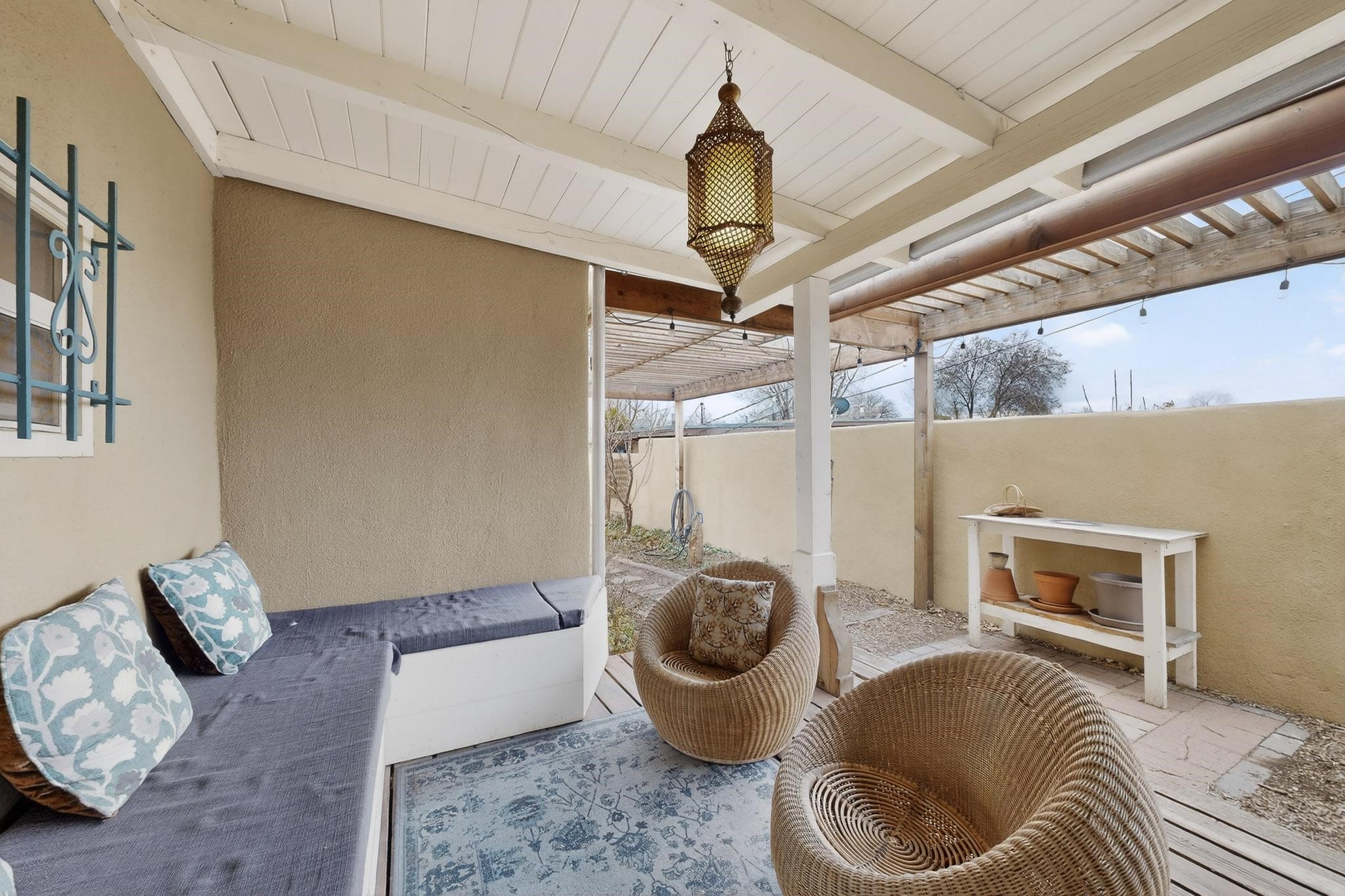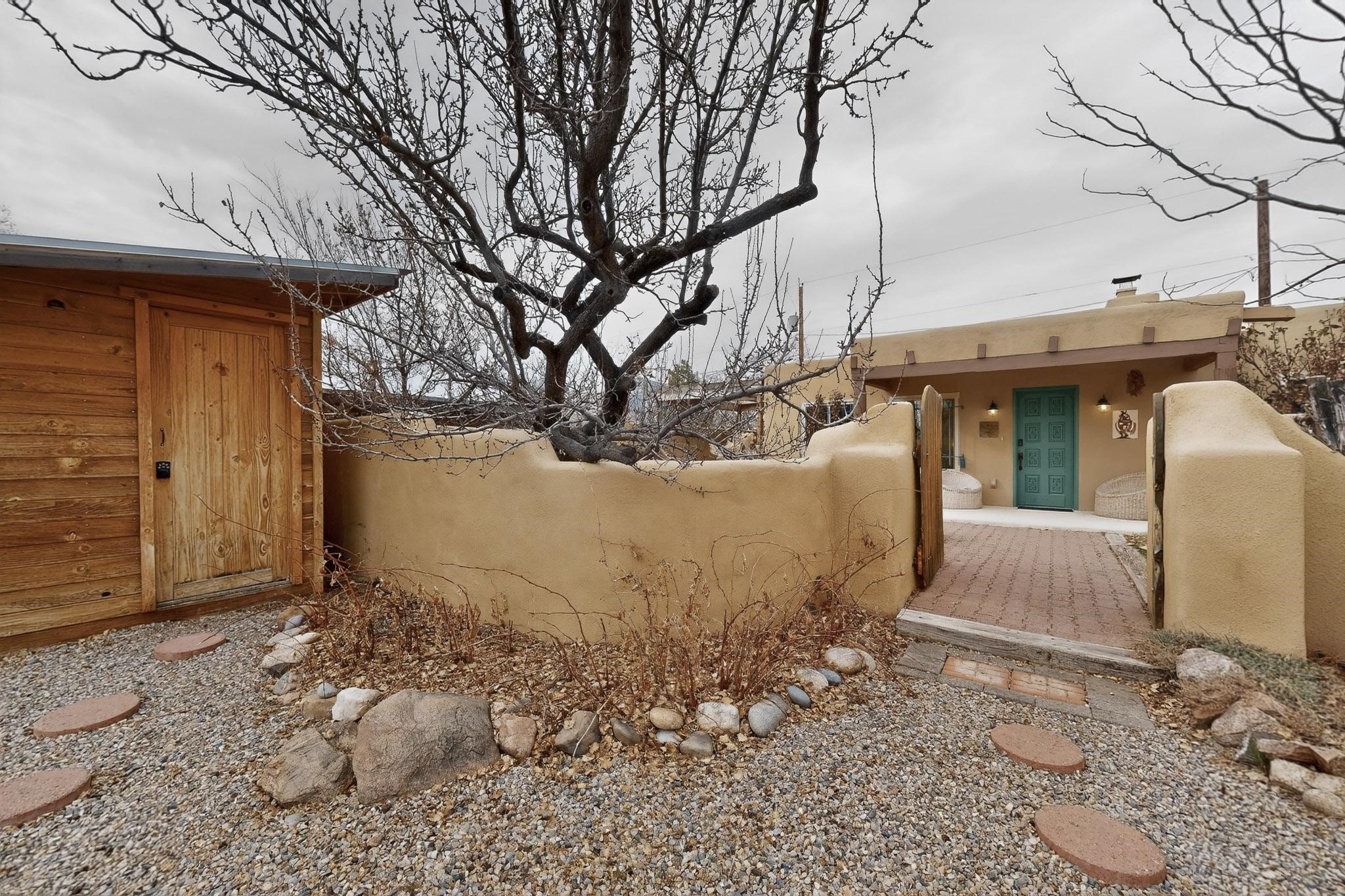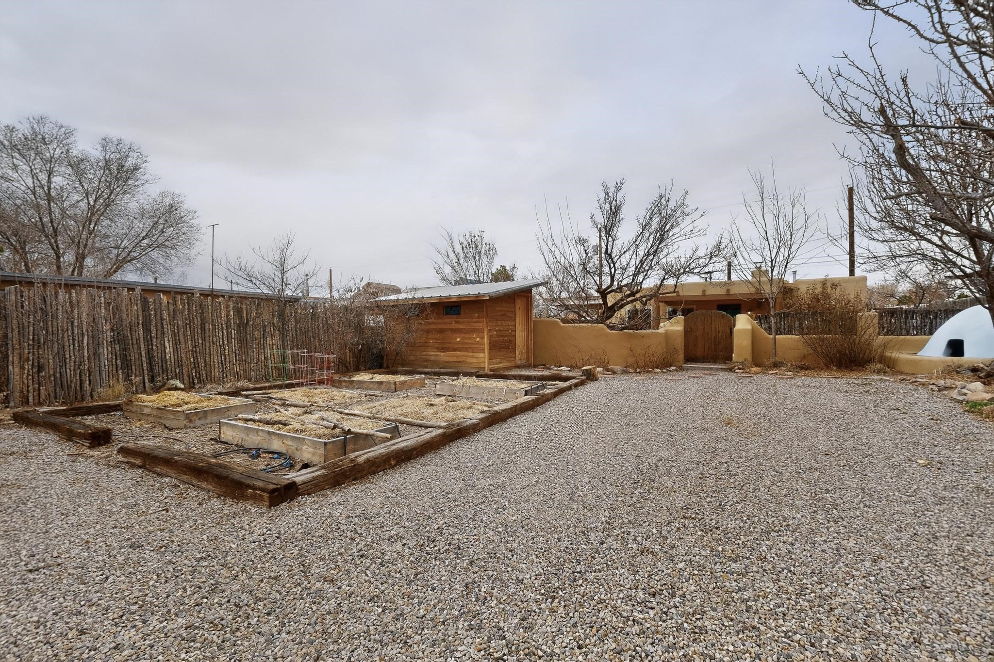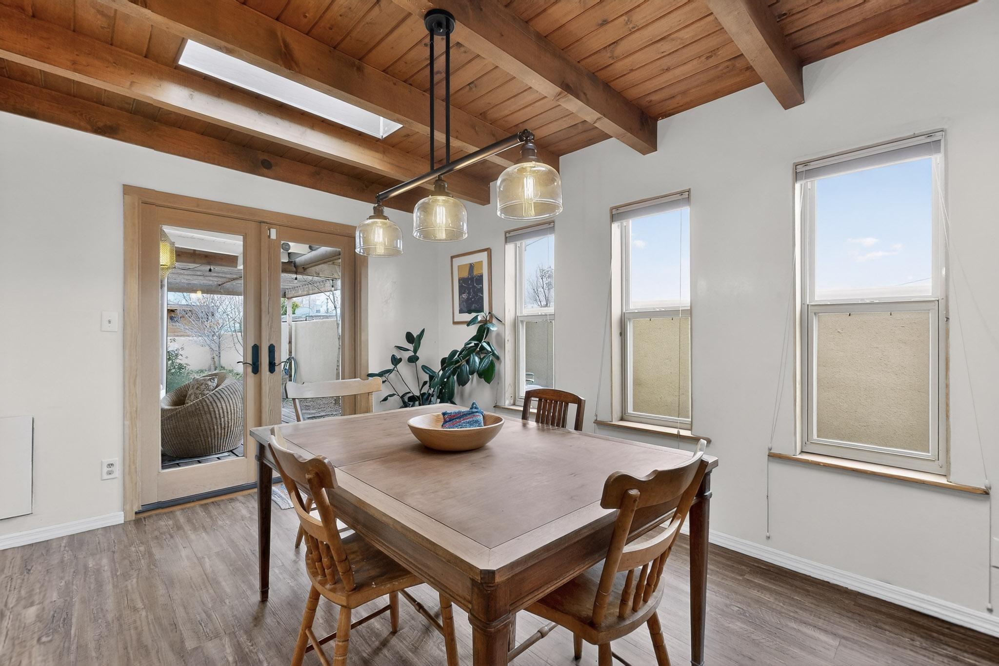 Beautifully updated, authentic Southwest home in the heart of midtown, blending timeless character with thoughtful modern upgrades. The charming 1950s original dwelling was expanded to include a light-filled dining room, creating the perfect space for gatherings. French doors open to a covered outdoor living area--ideal for slow mornings with coffee and a good book.The spacious kitchen, tastefully remodeled by the previous owners, features an eat-in bar and a dedicated wine and cold drink fridge. High ceilings with wood beams and tongue-and-groove detailing enhance the sense of openness, while luxury vinyl plank flooring runs seamlessly throughout the home.A welcoming front gate opens to your own private sanctuary. The generous lot provides ample off-street parking, multiple garden beds with drip irrigation, a well-built storage shed, and a traditional horno--perfect for wood-fired pizza nights. Lush landscaping makes this property a gardener's dream, complete with fruit trees, flowering shrubs, and fragrant herbs (see the owner's plant diagram in the photos).Ideally located near the redeveloping Midtown District--formerly the College of Santa Fe--this vibrant area is undergoing major transformation, including the newest Sky Cinema location and Tender Fire Pizza's new brick-and-mortar restaurant. This home truly offers the best of character, comfort, and convenience.