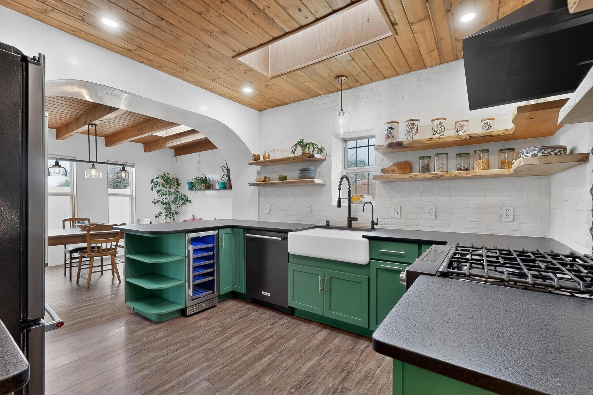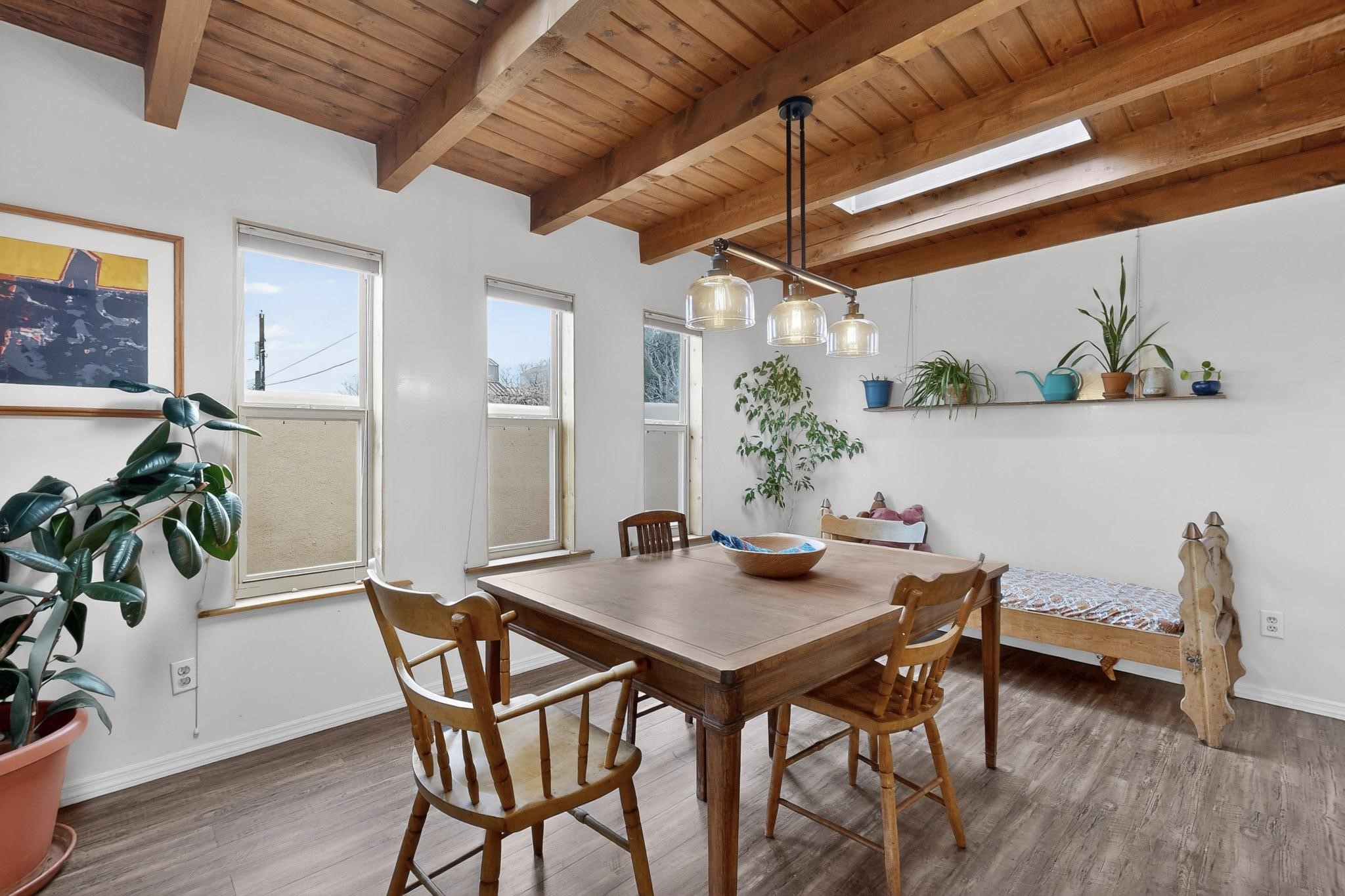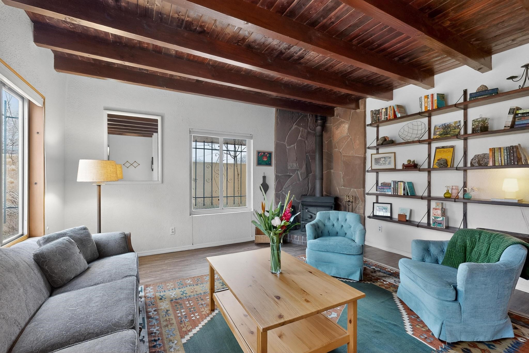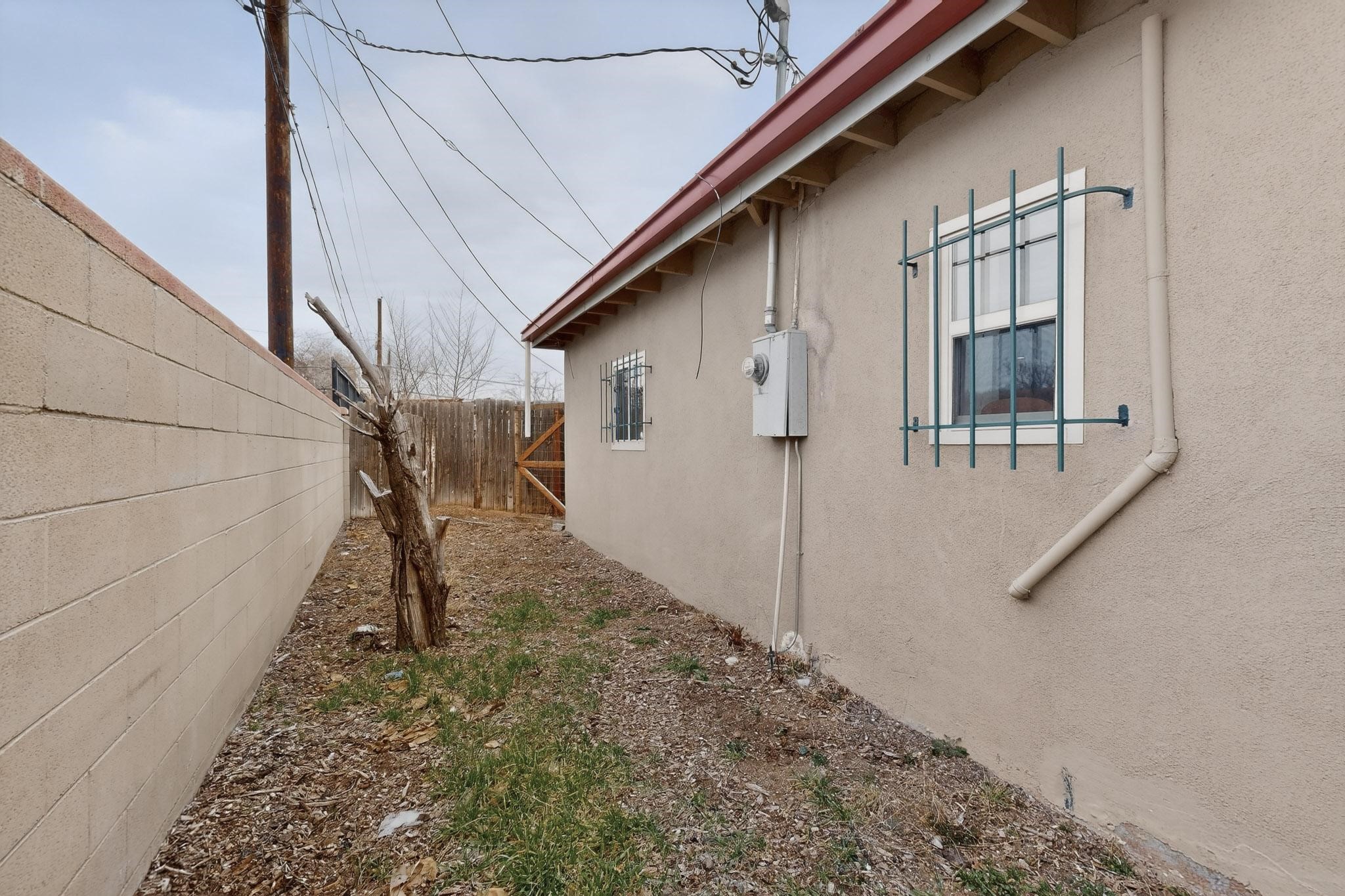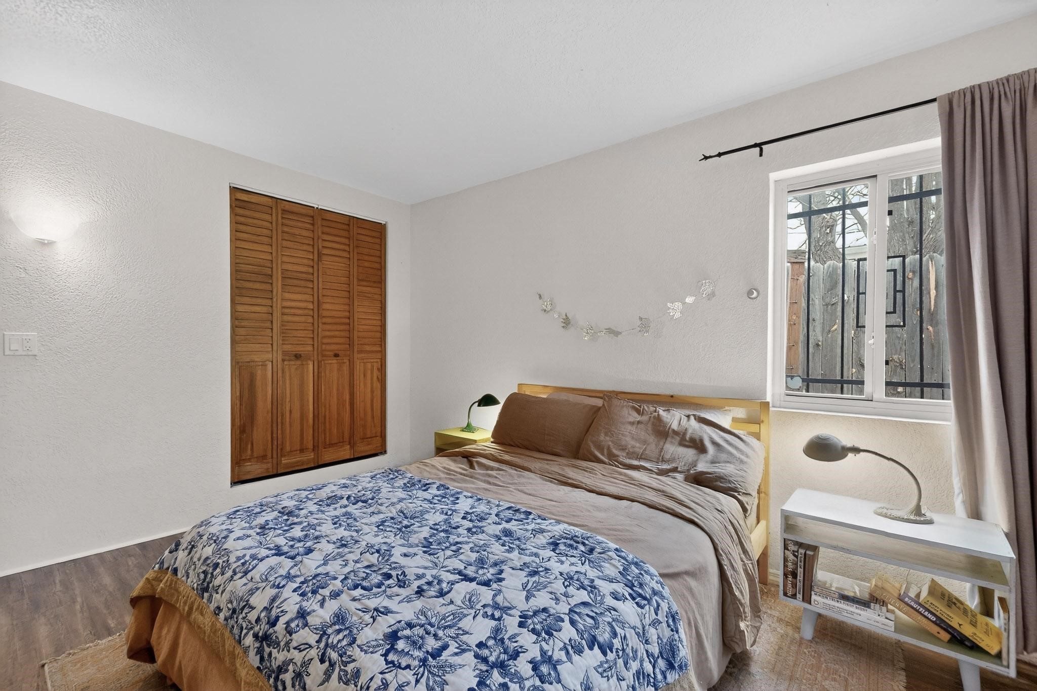 Beautifully updated, authentic Southwest home in the heart of midtown, blending timeless character with thoughtful modern upgrades. The charming 1950s original dwelling was expanded to include a light-filled dining room, creating the perfect space for gatherings. French doors open to a covered outdoor living area--ideal for slow mornings with coffee and a good book.The spacious kitchen, tastefully remodeled by the previous owners, features an eat-in bar and a dedicated wine and cold drink fridge. High ceilings with wood beams and tongue-and-groove detailing enhance the sense of openness, while luxury vinyl plank flooring runs seamlessly throughout the home.A welcoming front gate opens to your own private sanctuary. The generous lot provides ample off-street parking, multiple garden beds with drip irrigation, a well-built storage shed, and a traditional horno--perfect for wood-fired pizza nights. Lush landscaping makes this property a gardener's dream, complete with fruit trees, flowering shrubs, and fragrant herbs (see the owner's plant diagram in the photos).Ideally located near the redeveloping Midtown District--formerly the College of Santa Fe--this vibrant area is undergoing major transformation, including the newest Sky Cinema location and Tender Fire Pizza's new brick-and-mortar restaurant. This home truly offers the best of character, comfort, and convenience.