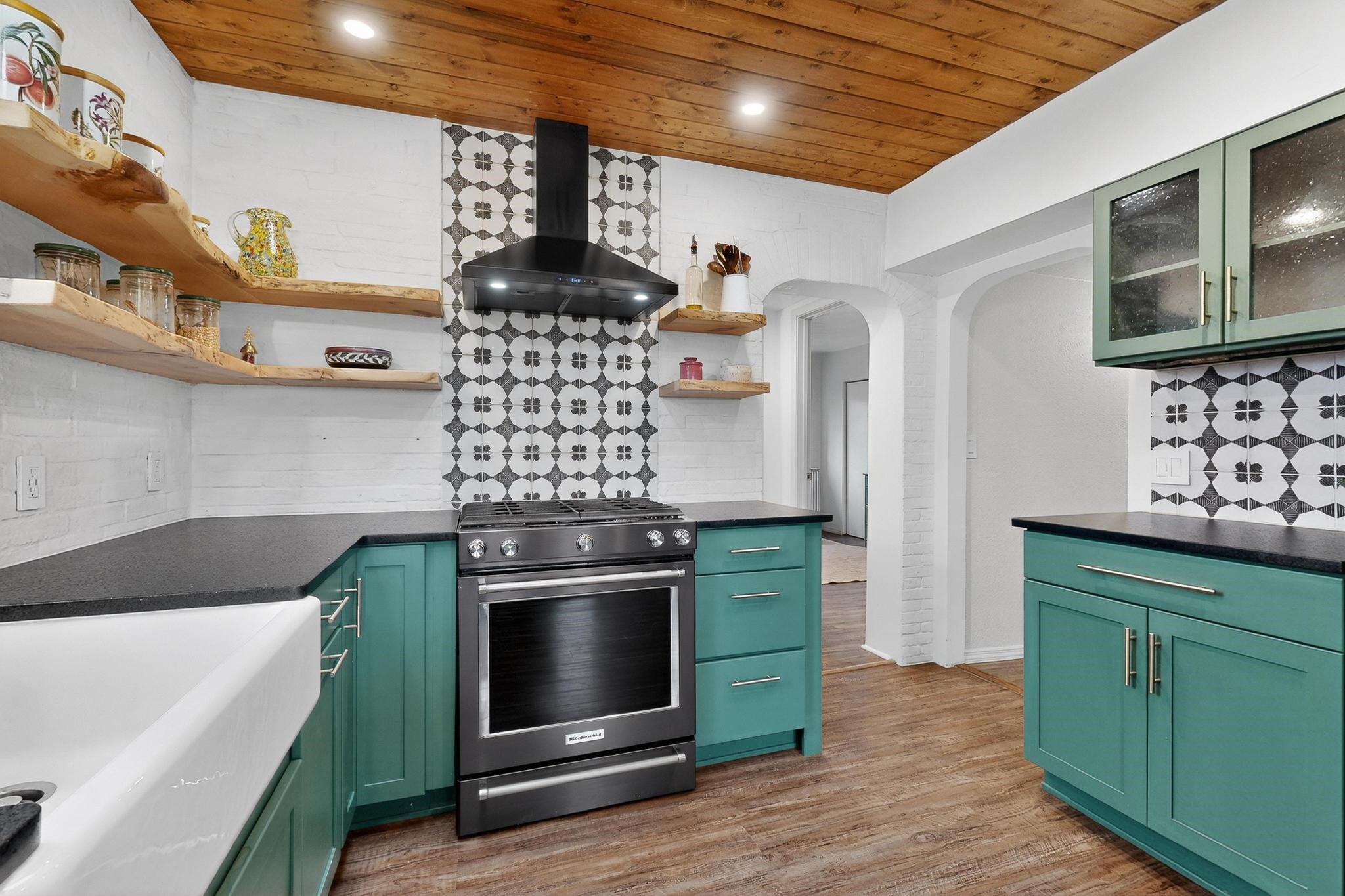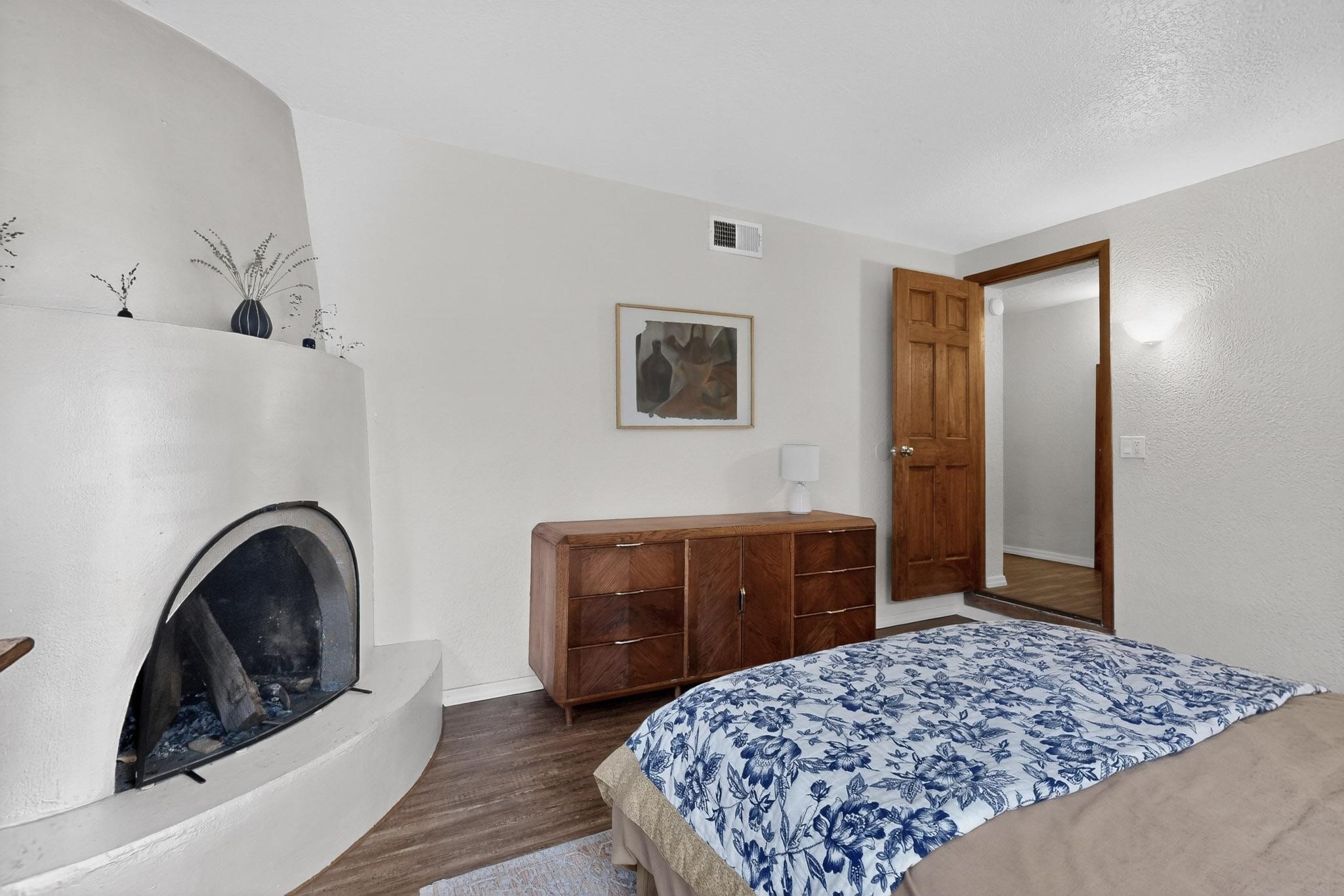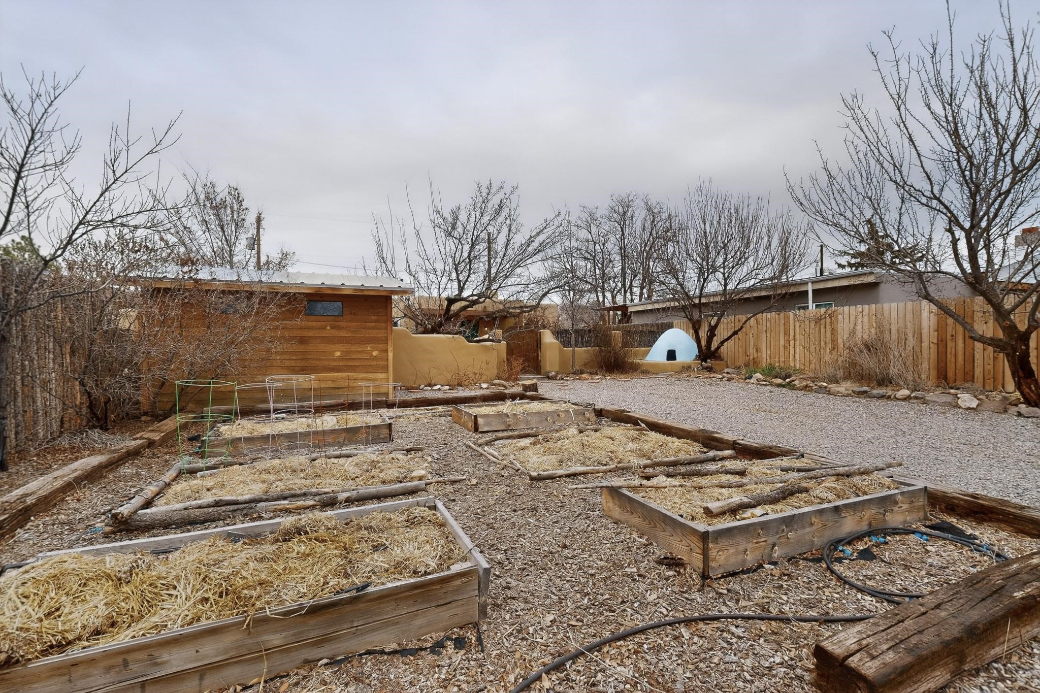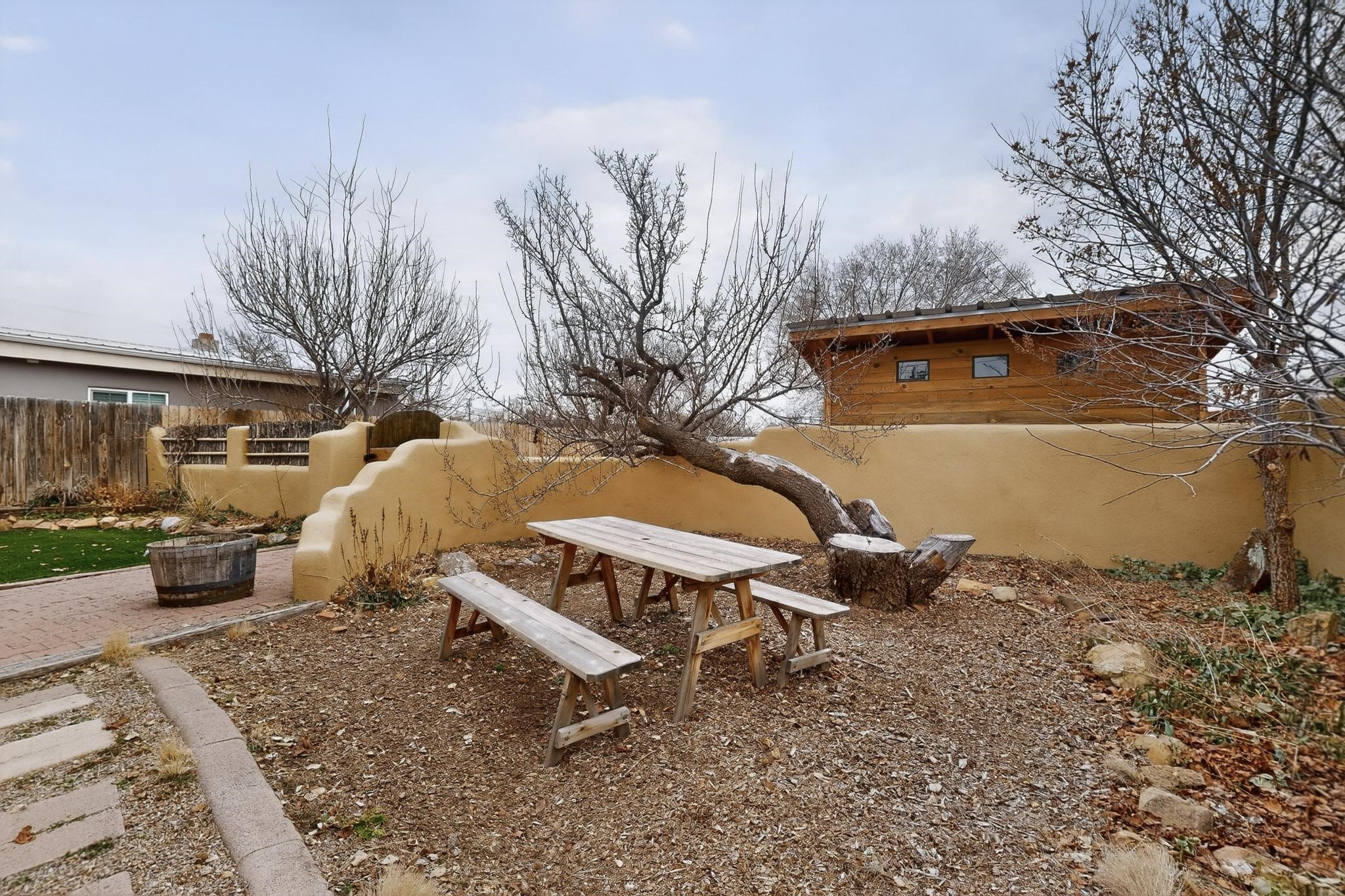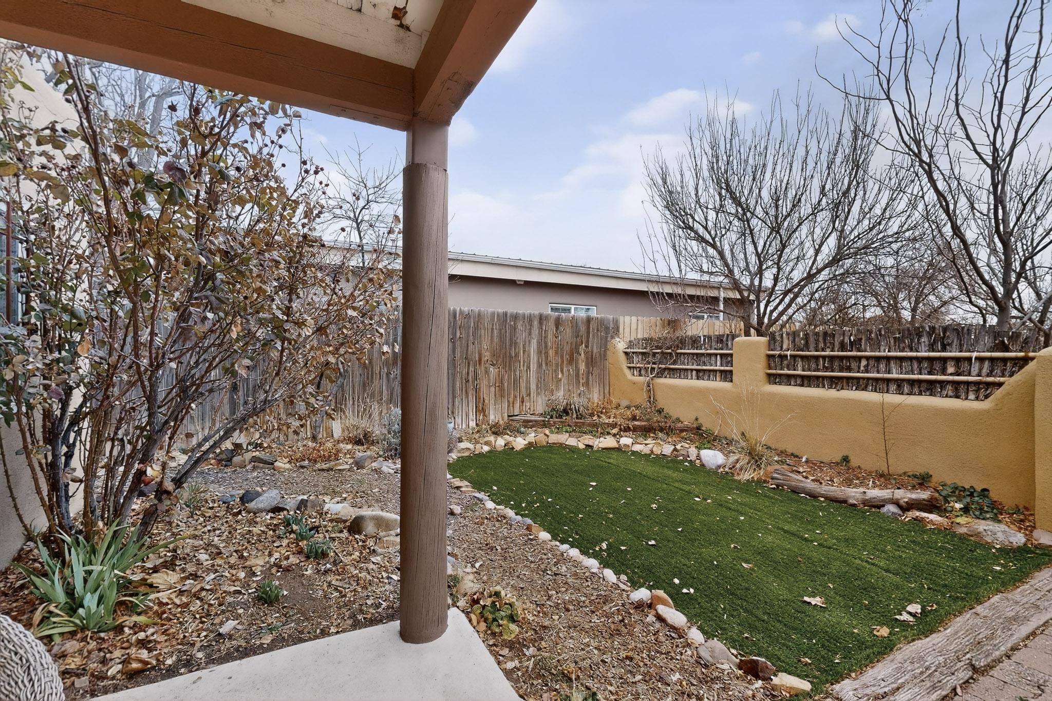 Beautifully updated, authentic Southwest home in the heart of midtown, blending timeless character with thoughtful modern upgrades. The charming 1950s original dwelling was expanded to include a light-filled dining room, creating the perfect space for gatherings. French doors open to a covered outdoor living area--ideal for slow mornings with coffee and a good book.The spacious kitchen, tastefully remodeled by the previous owners, features an eat-in bar and a dedicated wine and cold drink fridge. High ceilings with wood beams and tongue-and-groove detailing enhance the sense of openness, while luxury vinyl plank flooring runs seamlessly throughout the home.A welcoming front gate opens to your own private sanctuary. The generous lot provides ample off-street parking, multiple garden beds with drip irrigation, a well-built storage shed, and a traditional horno--perfect for wood-fired pizza nights. Lush landscaping makes this property a gardener's dream, complete with fruit trees, flowering shrubs, and fragrant herbs (see the owner's plant diagram in the photos).Ideally located near the redeveloping Midtown District--formerly the College of Santa Fe--this vibrant area is undergoing major transformation, including the newest Sky Cinema location and Tender Fire Pizza's new brick-and-mortar restaurant. This home truly offers the best of character, comfort, and convenience.