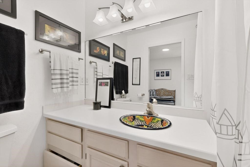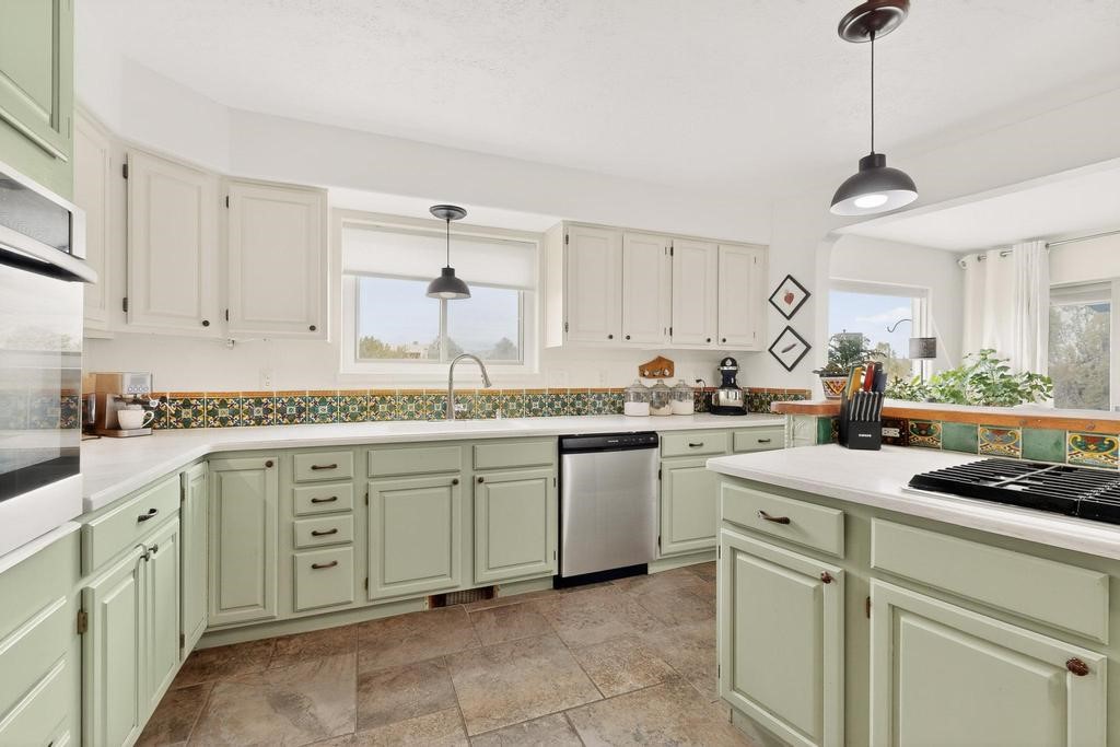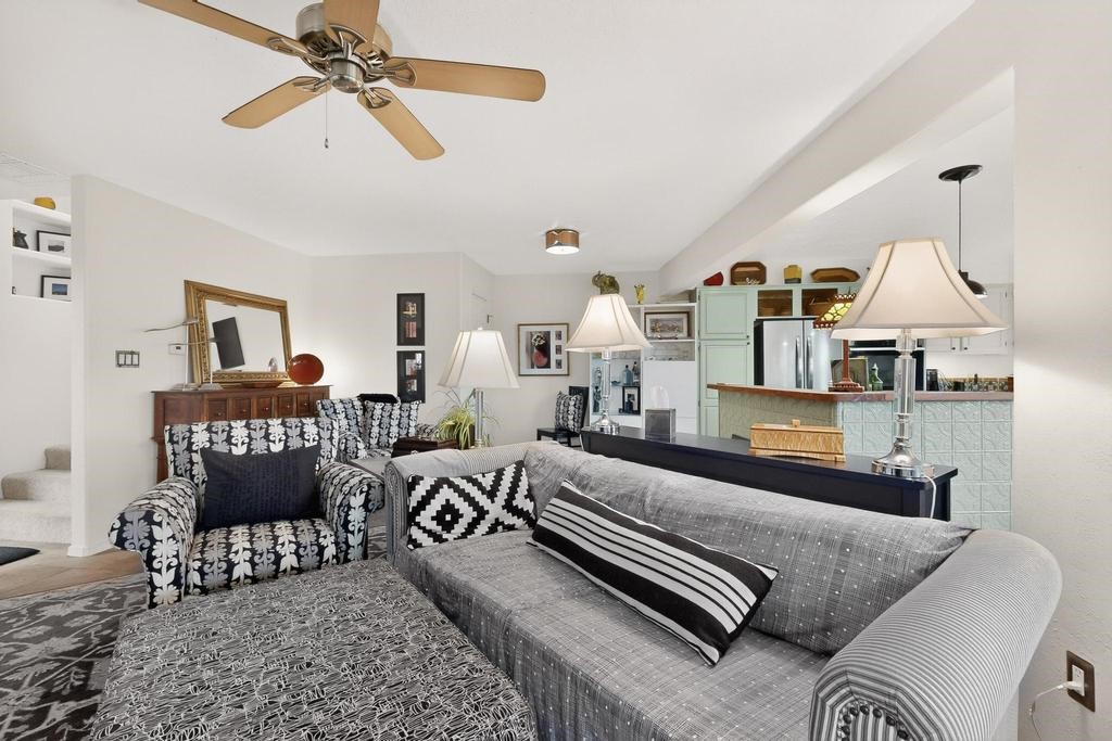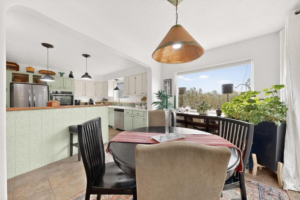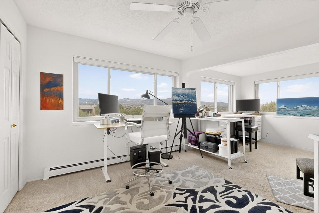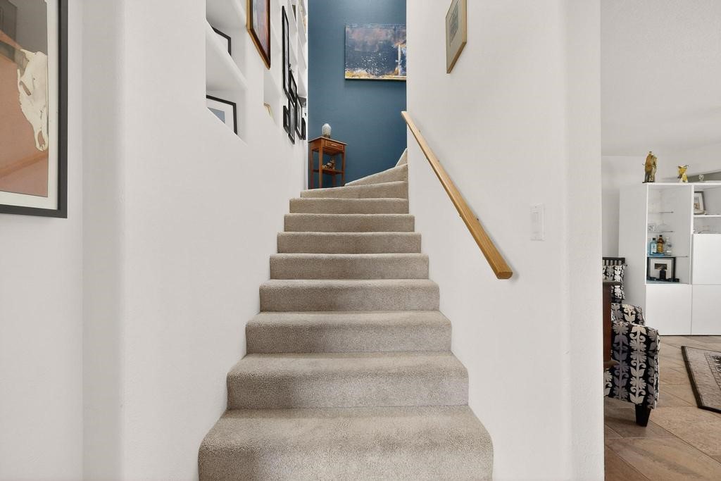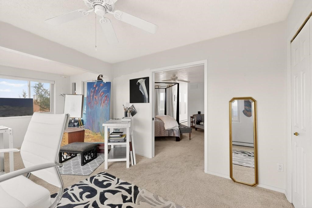 Welcome to a peaceful oasis with incredible views! This updated 2 bedroom, 2 bathroom townhome is full of light & character. A kiva fireplace warms the living space where you can still talk to folks in the kitchen, and enjoy the outdoor views. Downstairs you'll find 1 bedroom & bathroom, and when you go upstairs, notice the nichos along the wall for art. Off of the main bedroom upstairs is a bonus room that the seller is currently using as an art studio. Its could be so many things and with views like that, who wouldn't want to spend time in there?! The laundry is also upstairs along with a bathroom suite. There is plenty of storage with closets, an attached garage & a big storage room. Enjoy nature & sunsets on the flagstone patio w/ retractable awning. Located between Santa Fe & ABQ.