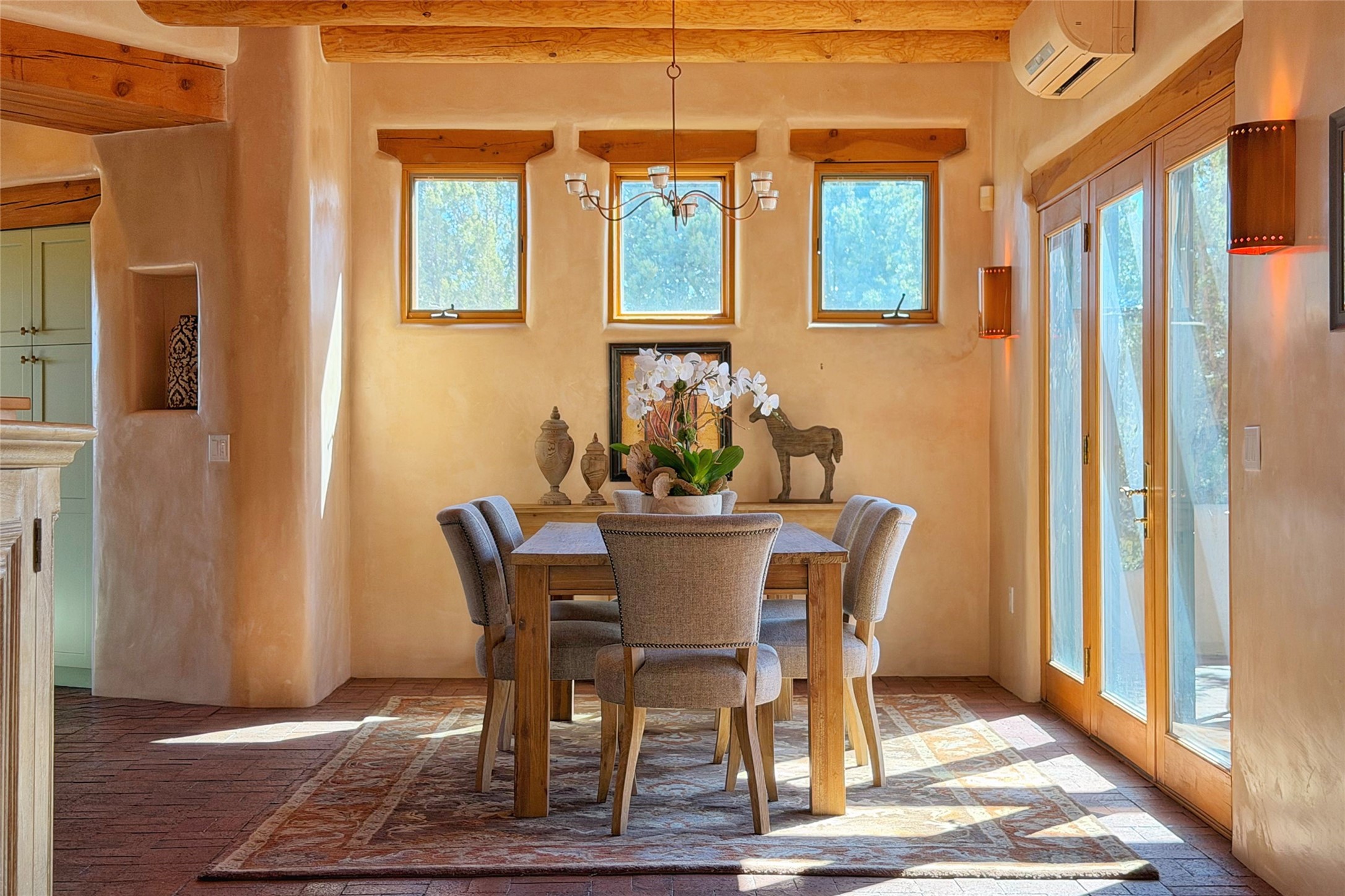 Tucked into the storied enclave of Estates II at Las Campanas, 103 Sunflower Drive is the kind of home that makes you exhale the moment you step inside. Spanning a generous 3,267 sq. ft., this retreat is thoughtfully split between worlds: a dreamy primary suite -- with a sumptuous full bath, walk-in closet worthy of a wardrobe envy spiral, and a private patio where morning coffee tastes better -- nestled apart from two welcoming guest rooms sharing their own full bath. Your visitors will never want to leave. (Consider yourself warned.) The heart of the home unfolds in a sun-drenched open plan where living room, dining room, breakfast nook, and kitchen flow together like a well-loved conversation. A cozy office/den sidles up to the living room for those days when inspiration strikes close to home. Stay perfectly comfortable year-round with four mini-split heating/cooling zones plus radiant floor heating -- warmth that rises from the earth itself, very Santa Fe. Soaring ceilings, generous windows, and natural materials let the land speak indoors, while plaster wall finishes, brick floors, and kiva fireplaces whisper centuries of New Mexican soul. It's contemporary living with deep roots and excellent taste. Oh -- and there's a 220V outlet in the garage for your EV. Even the future feels at home here.